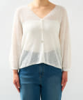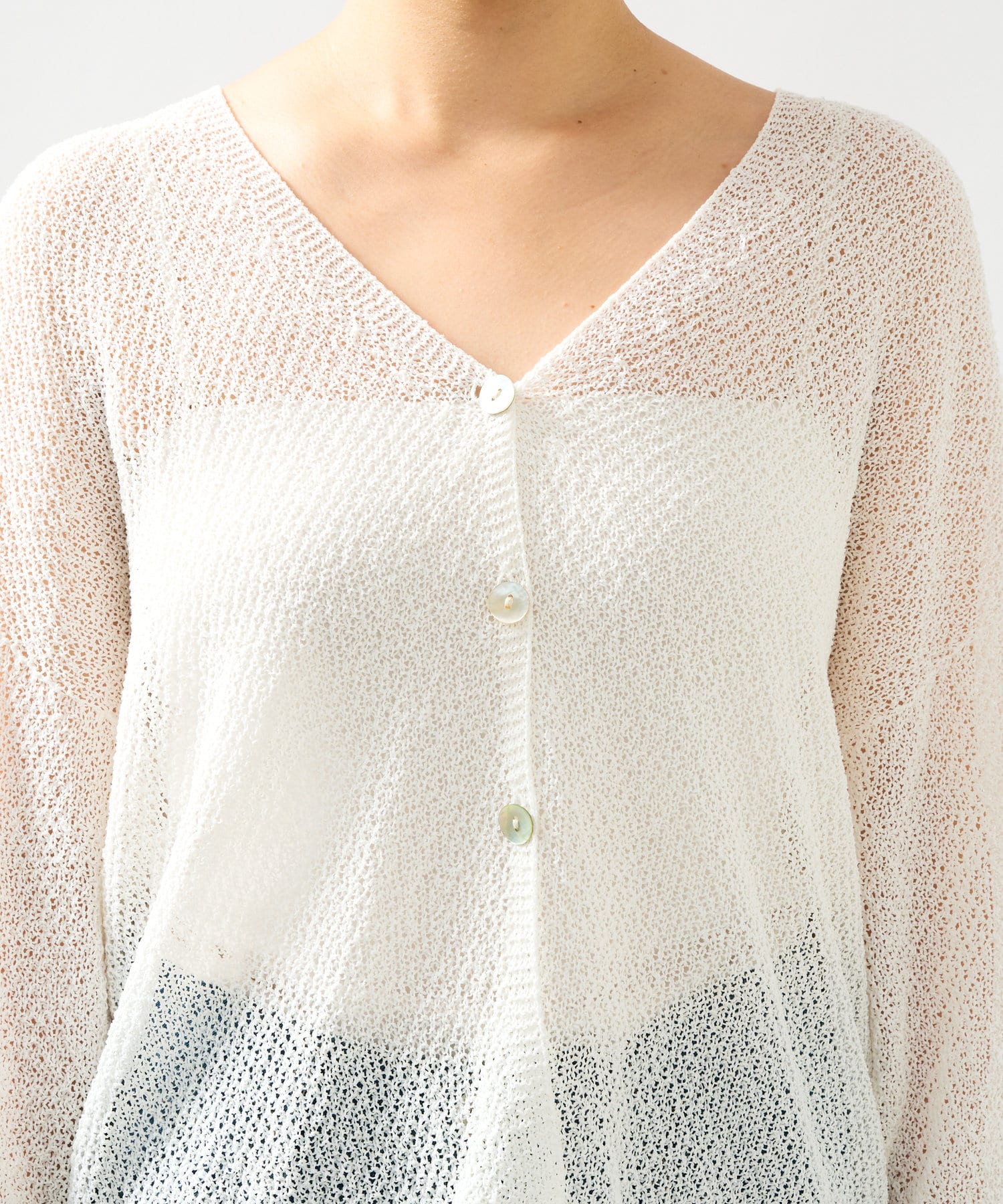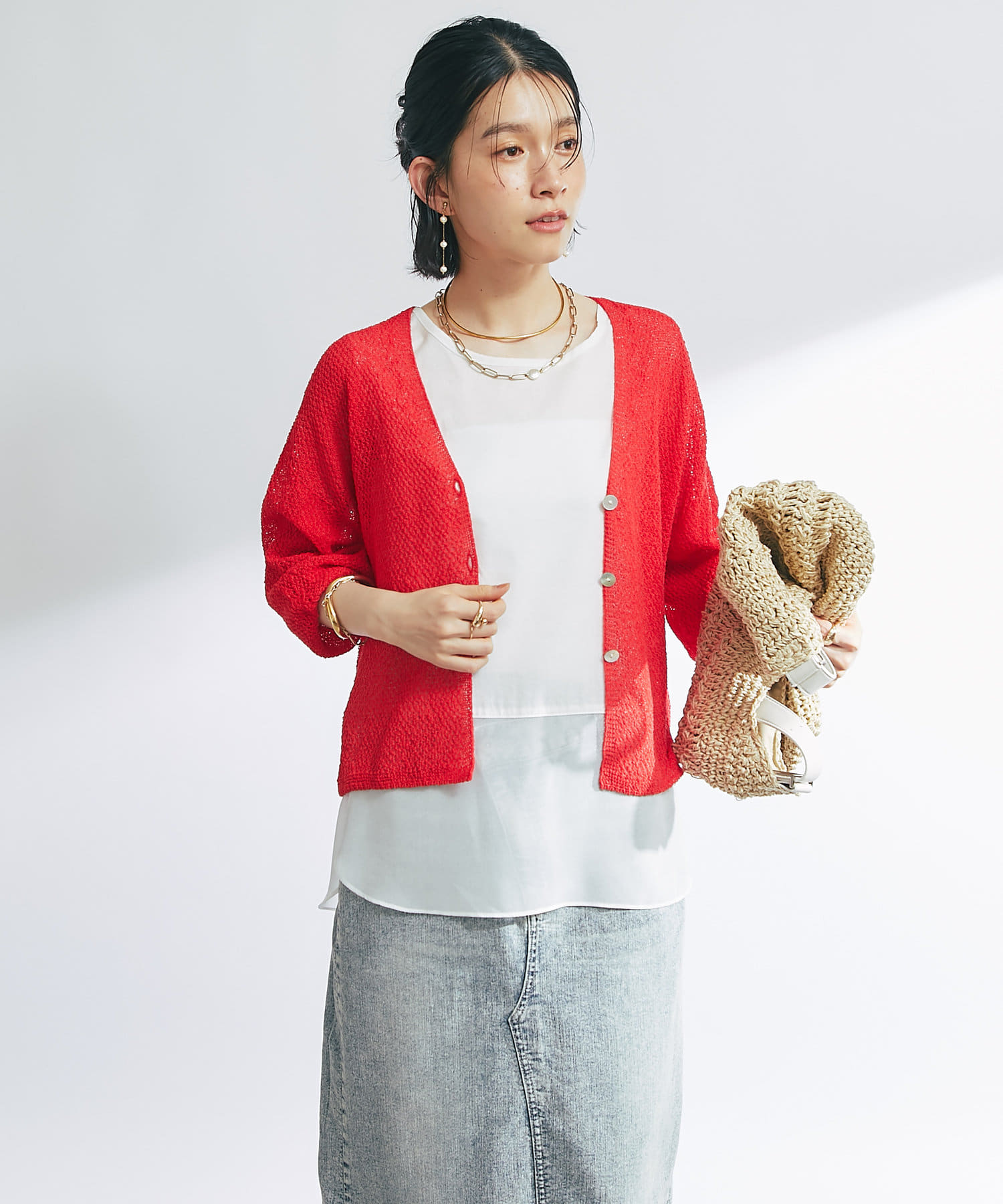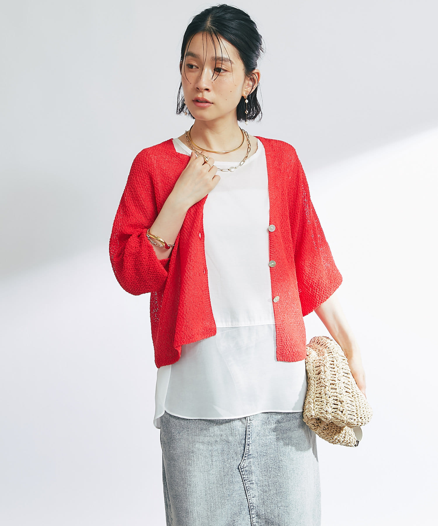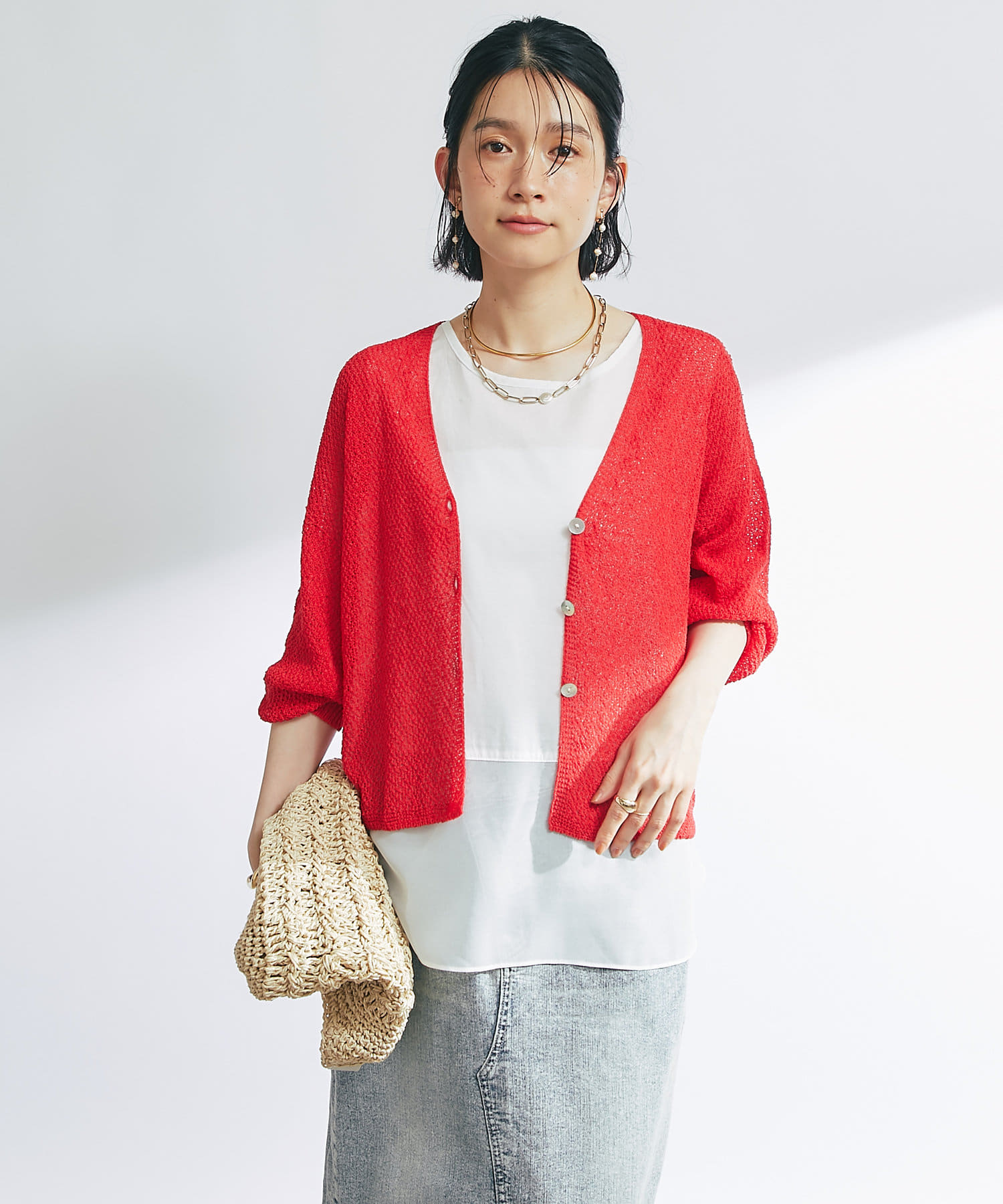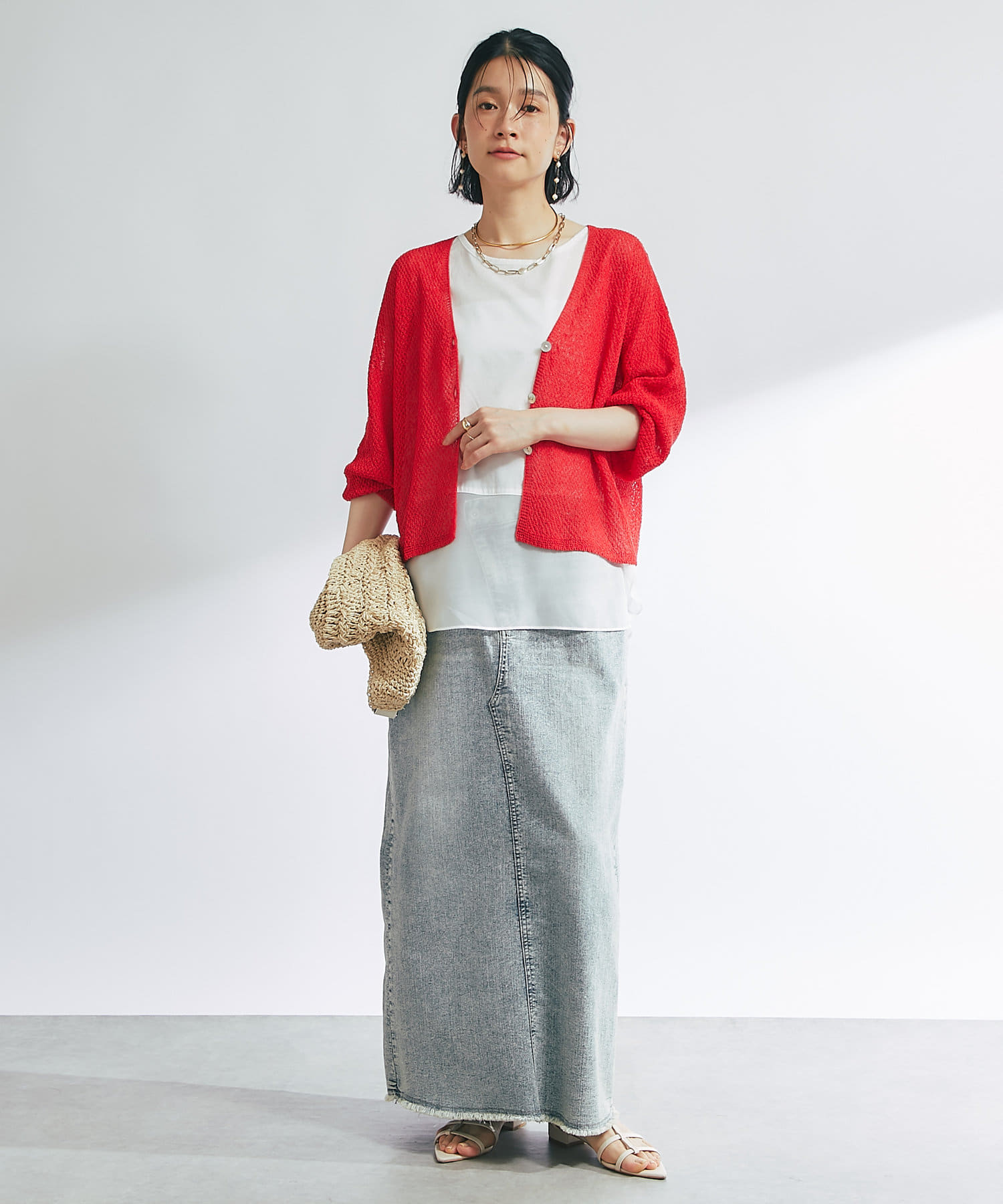 タンクトップインナーと合わせて、カーディガンの透け感をアクセントにしたスタイリングもおすすめです。