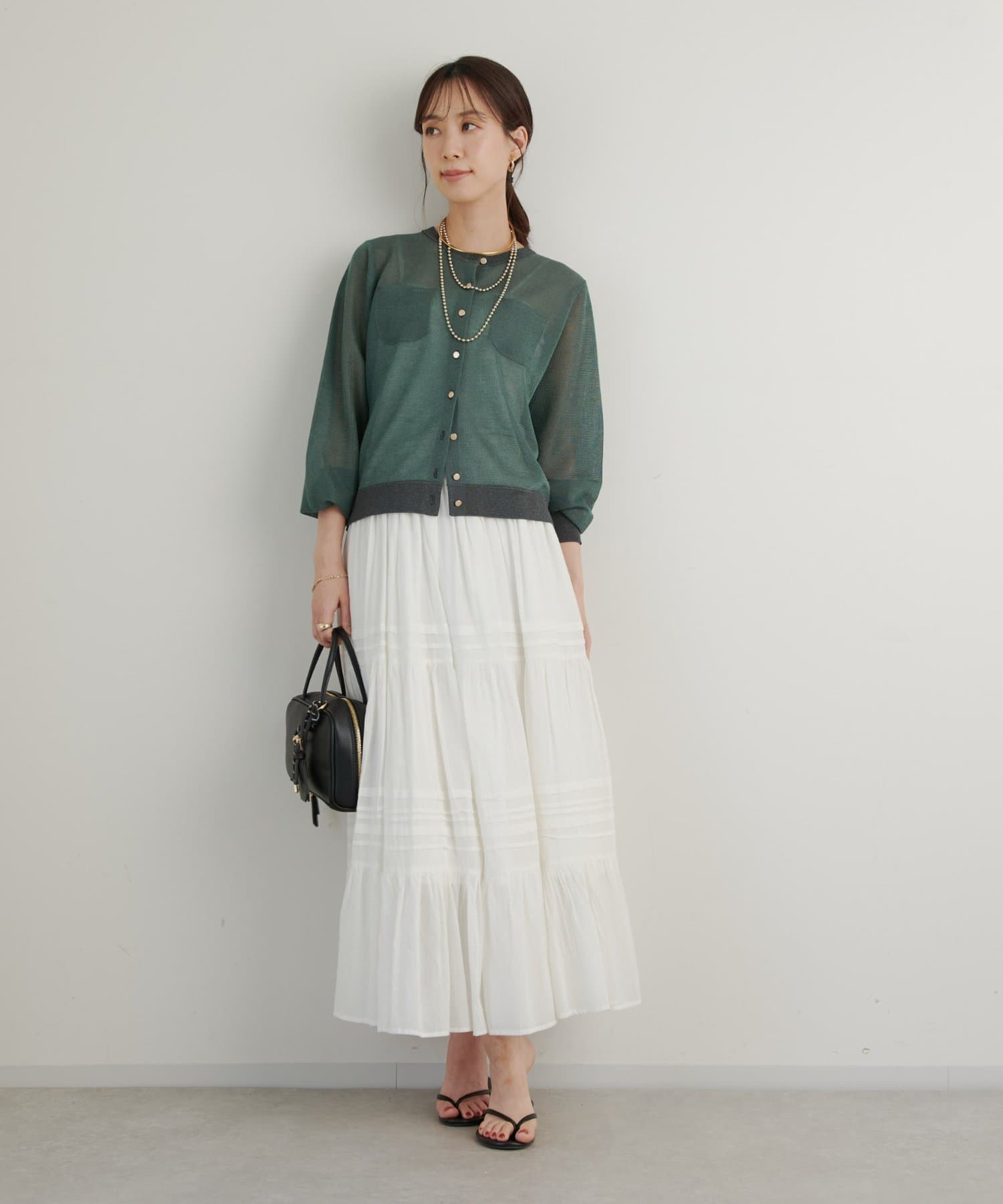 スキッパーデザインのブラウスと合わせて、インナー見せのスタイリングを楽しむのもおすすめです◎