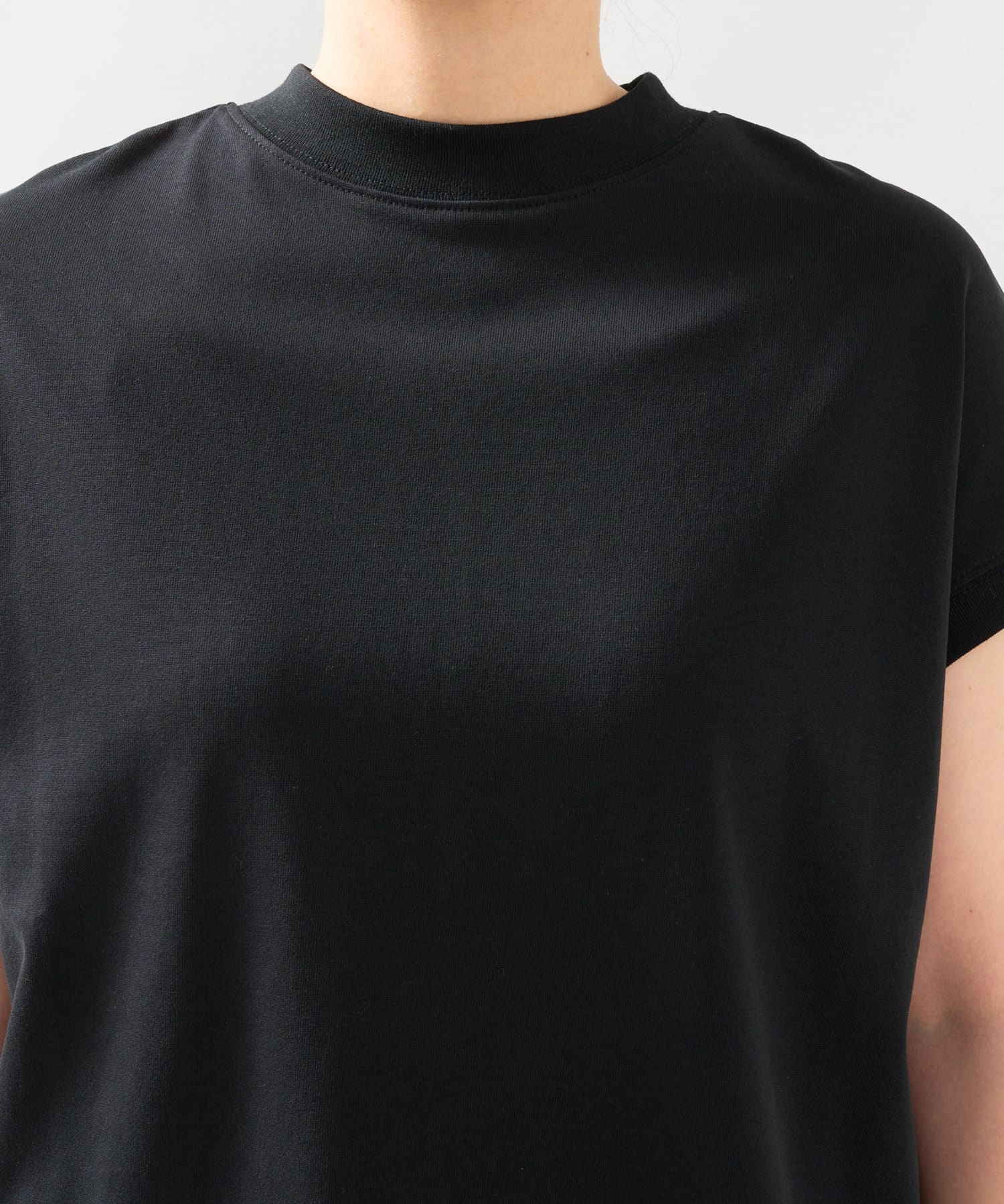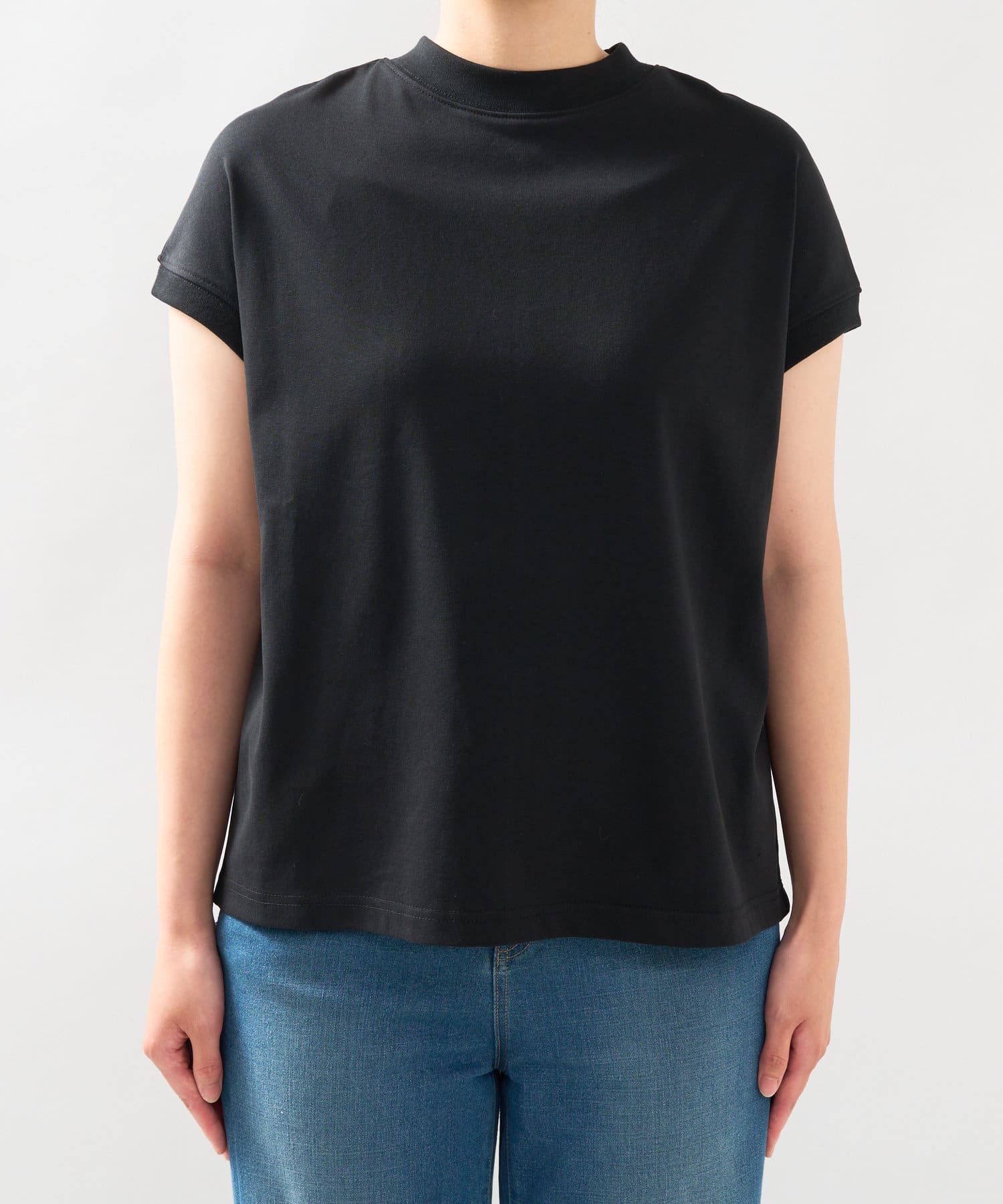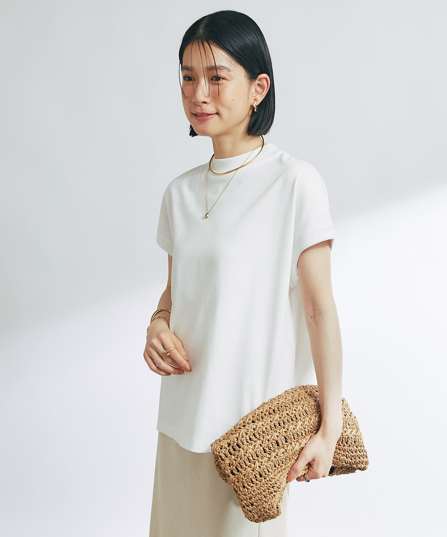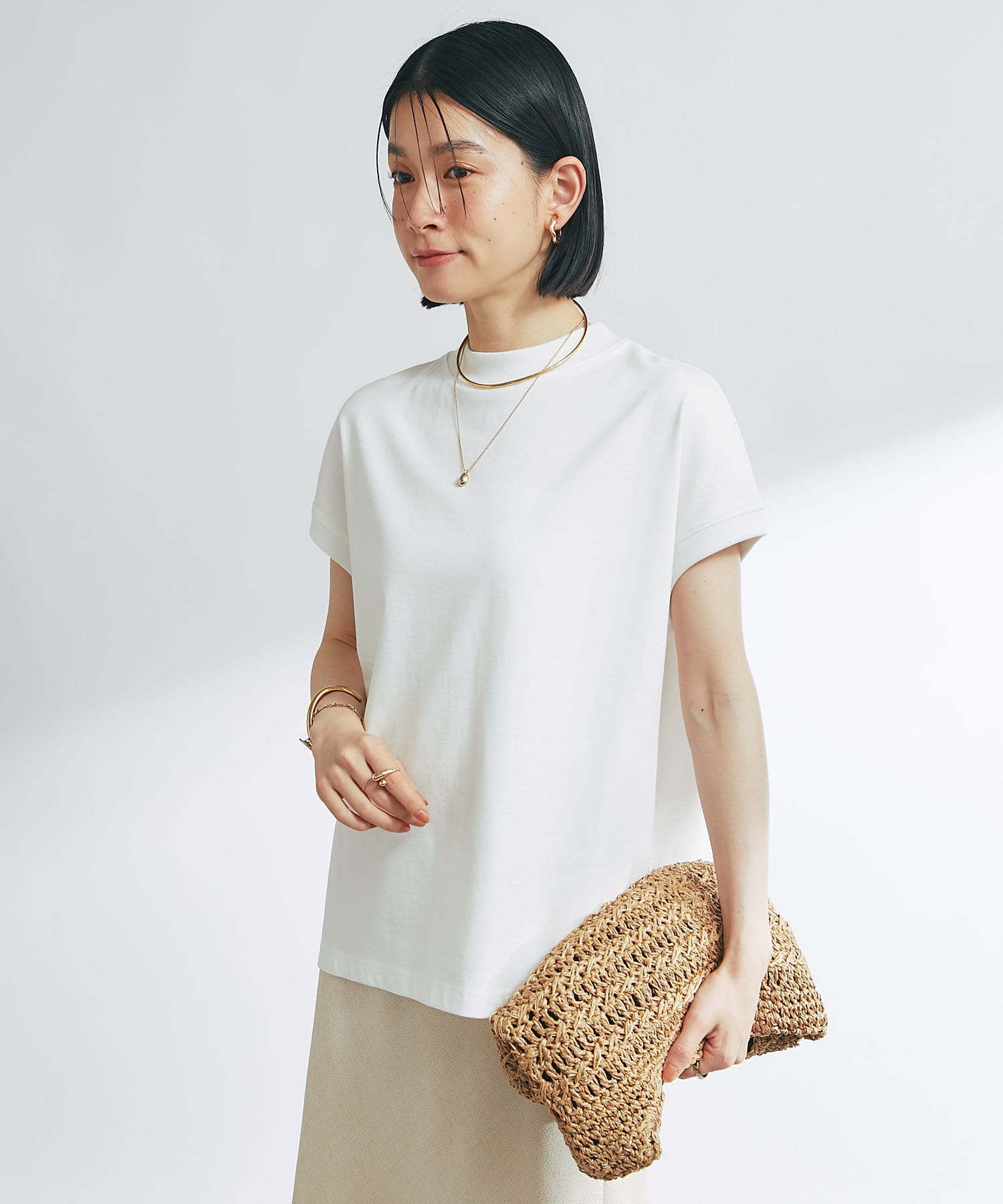 一見シンプルなTシャツデザインですが、モックネックがアクセントになってカジュアル過ぎない印象に。