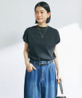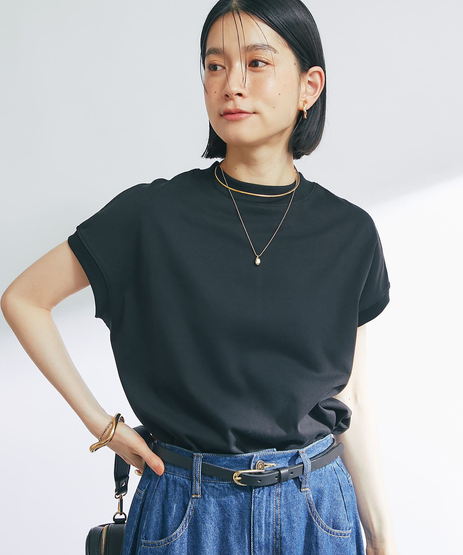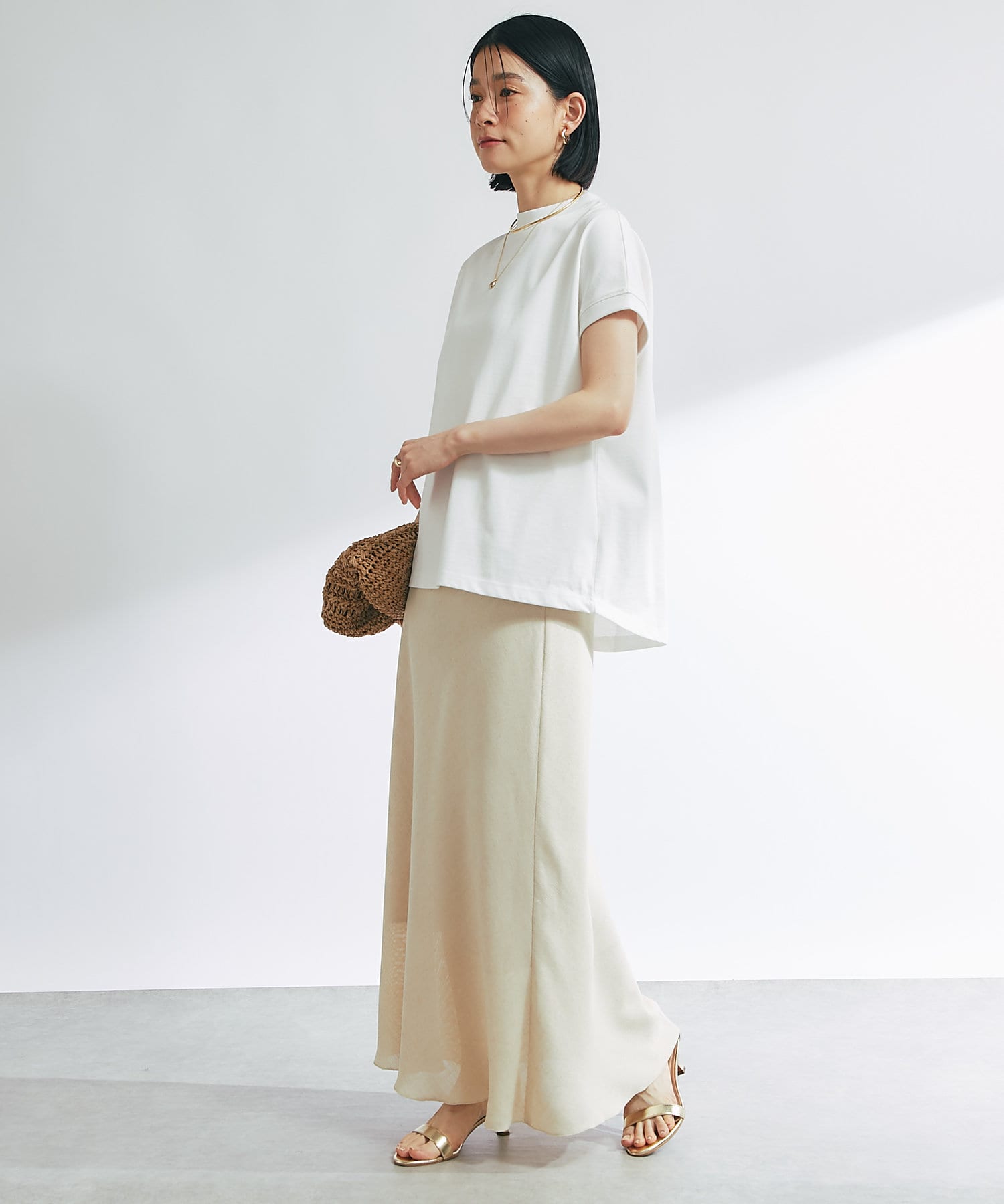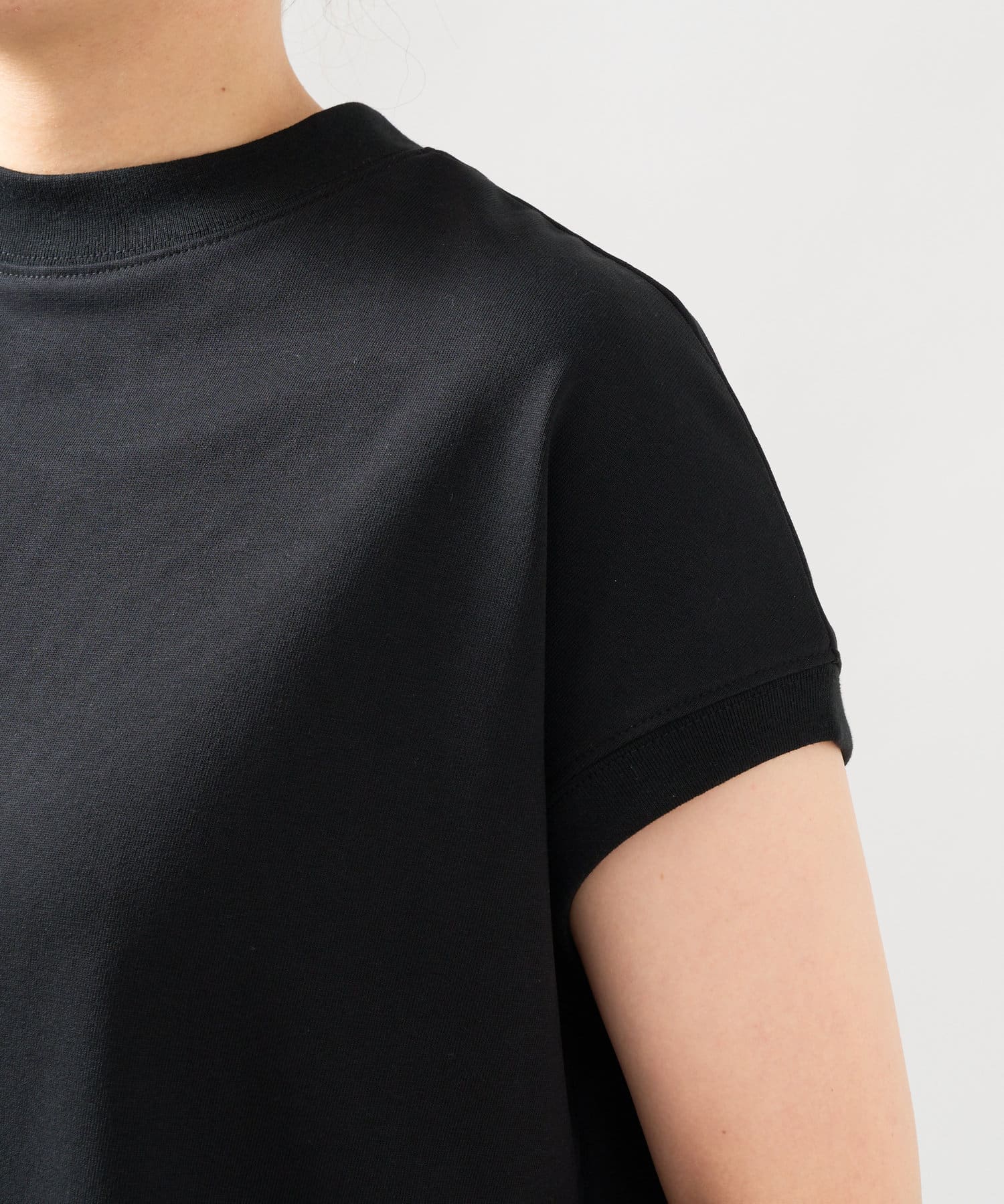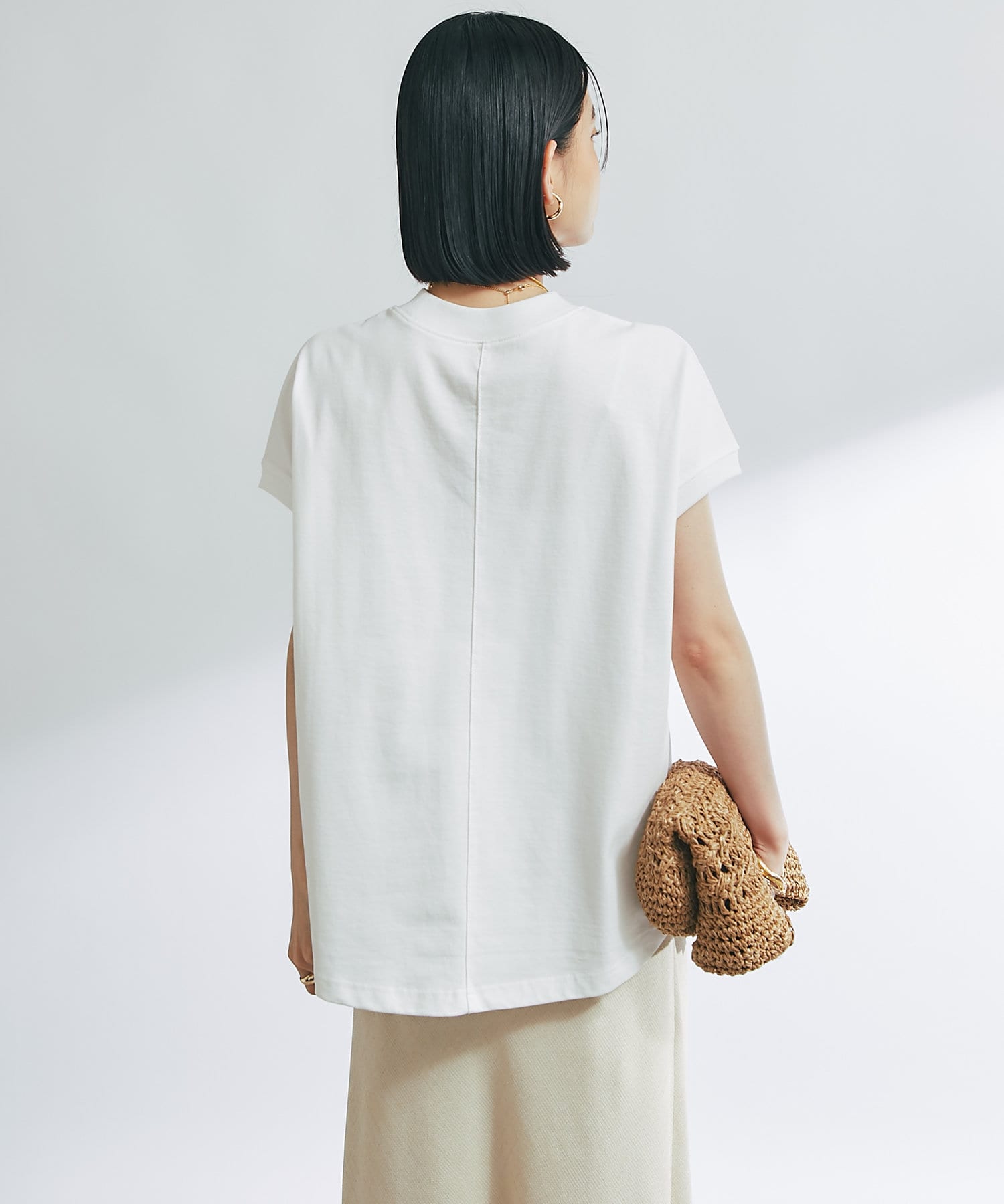 一見シンプルなTシャツデザインですが、モックネックがアクセントになってカジュアル過ぎない印象に。