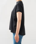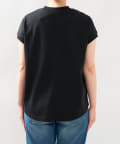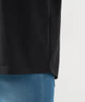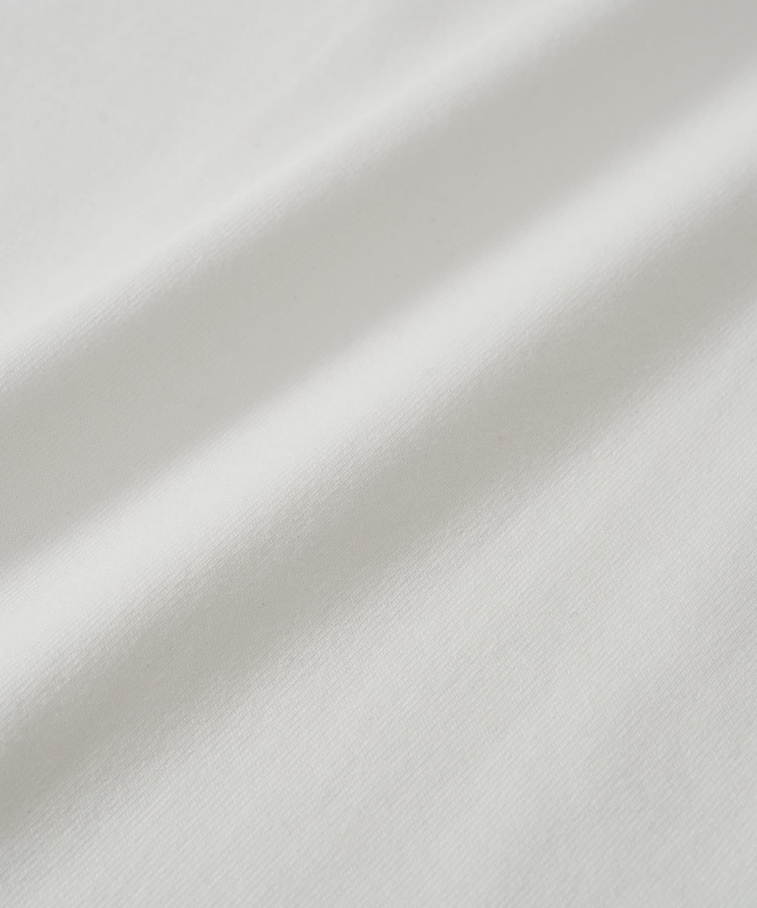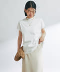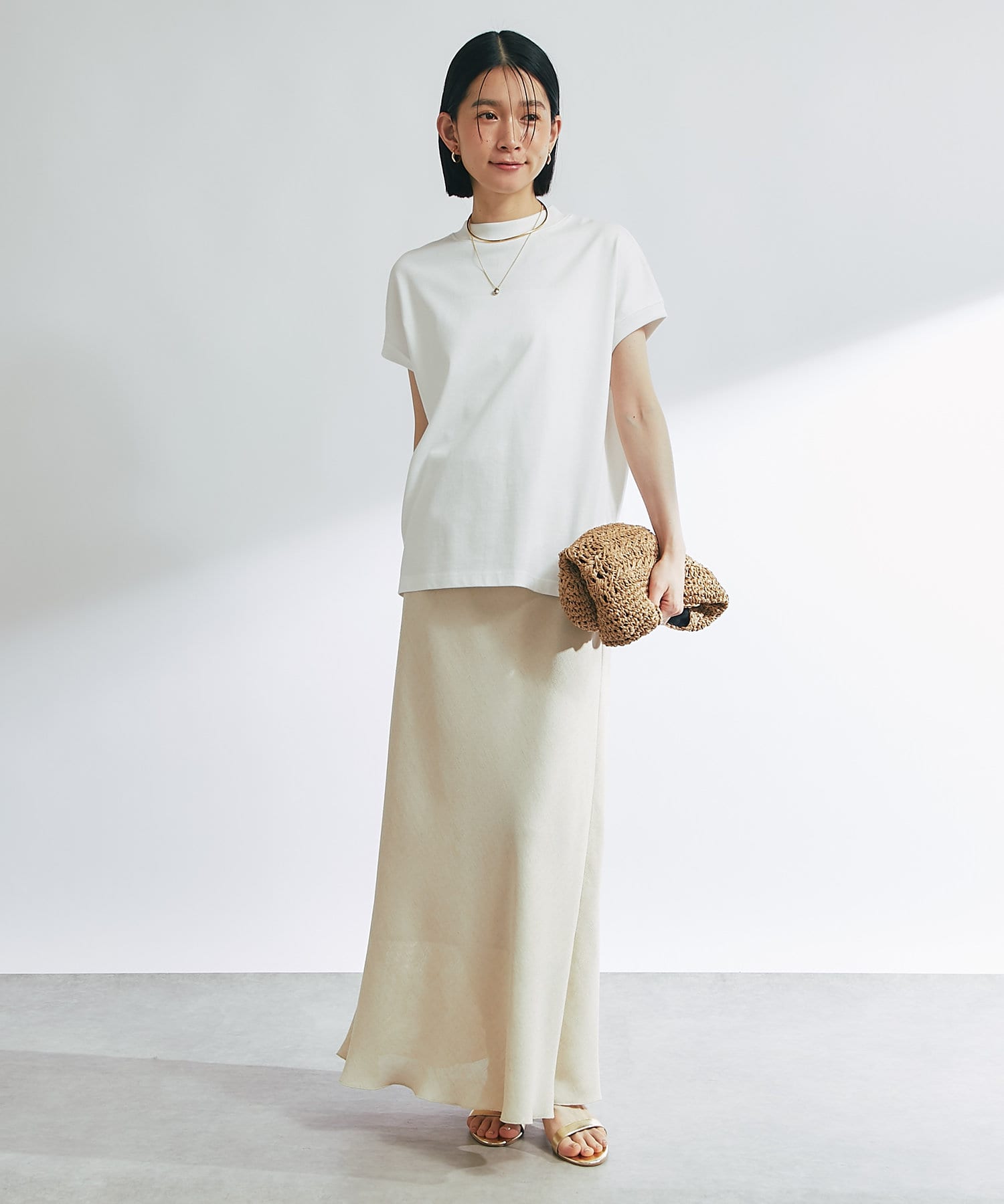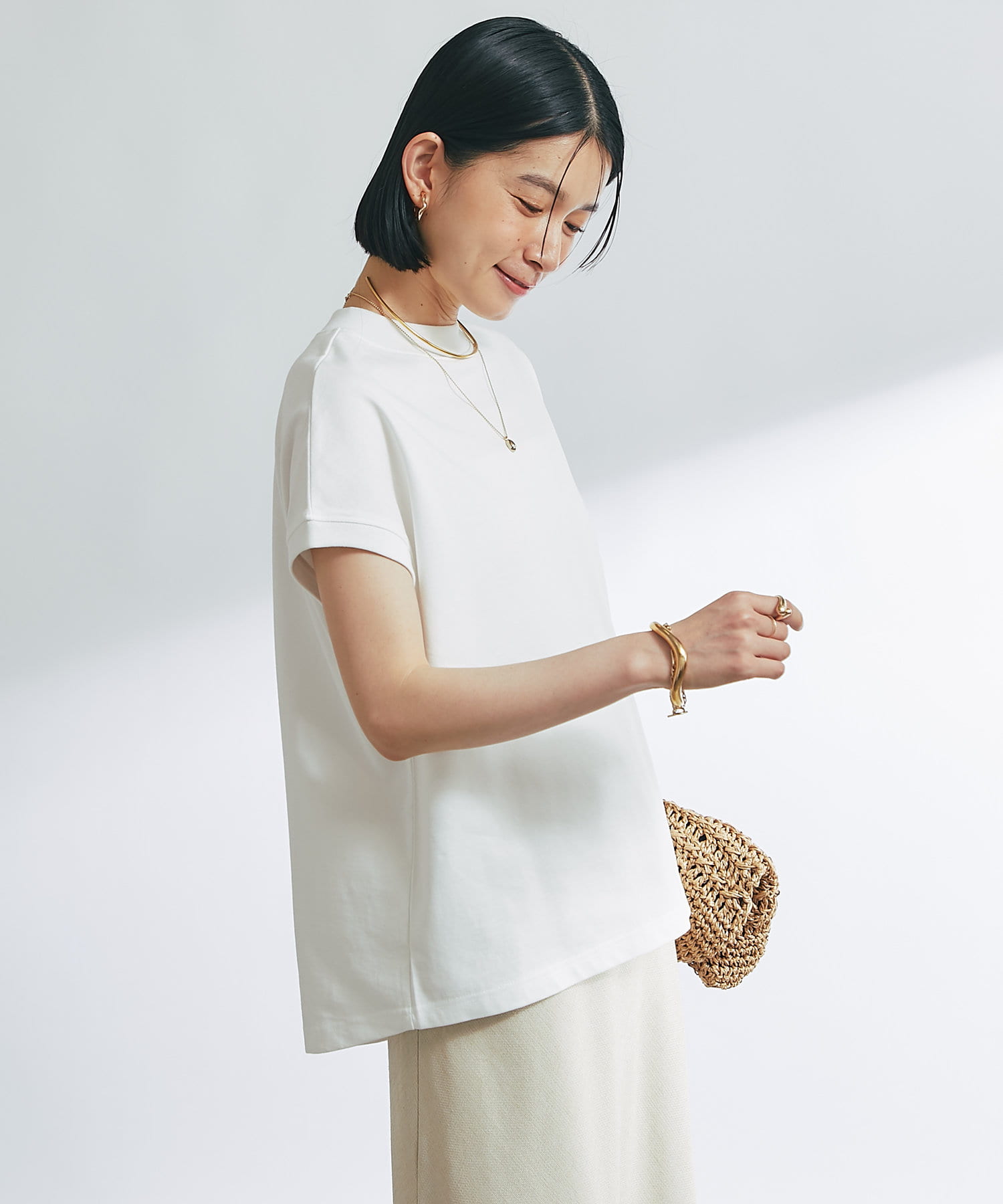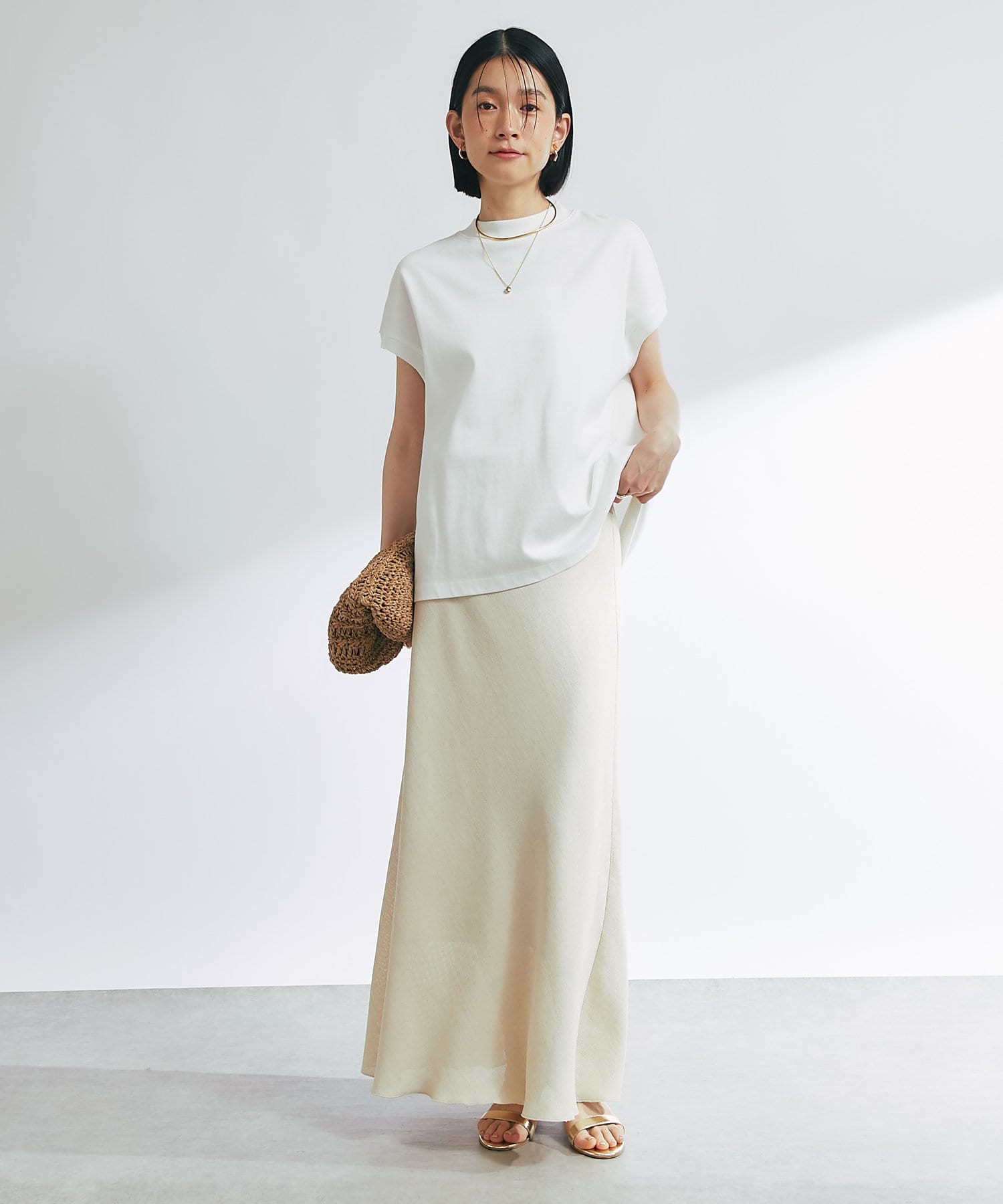 一見シンプルなTシャツデザインですが、モックネックがアクセントになってカジュアル過ぎない印象に。