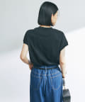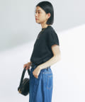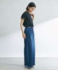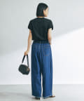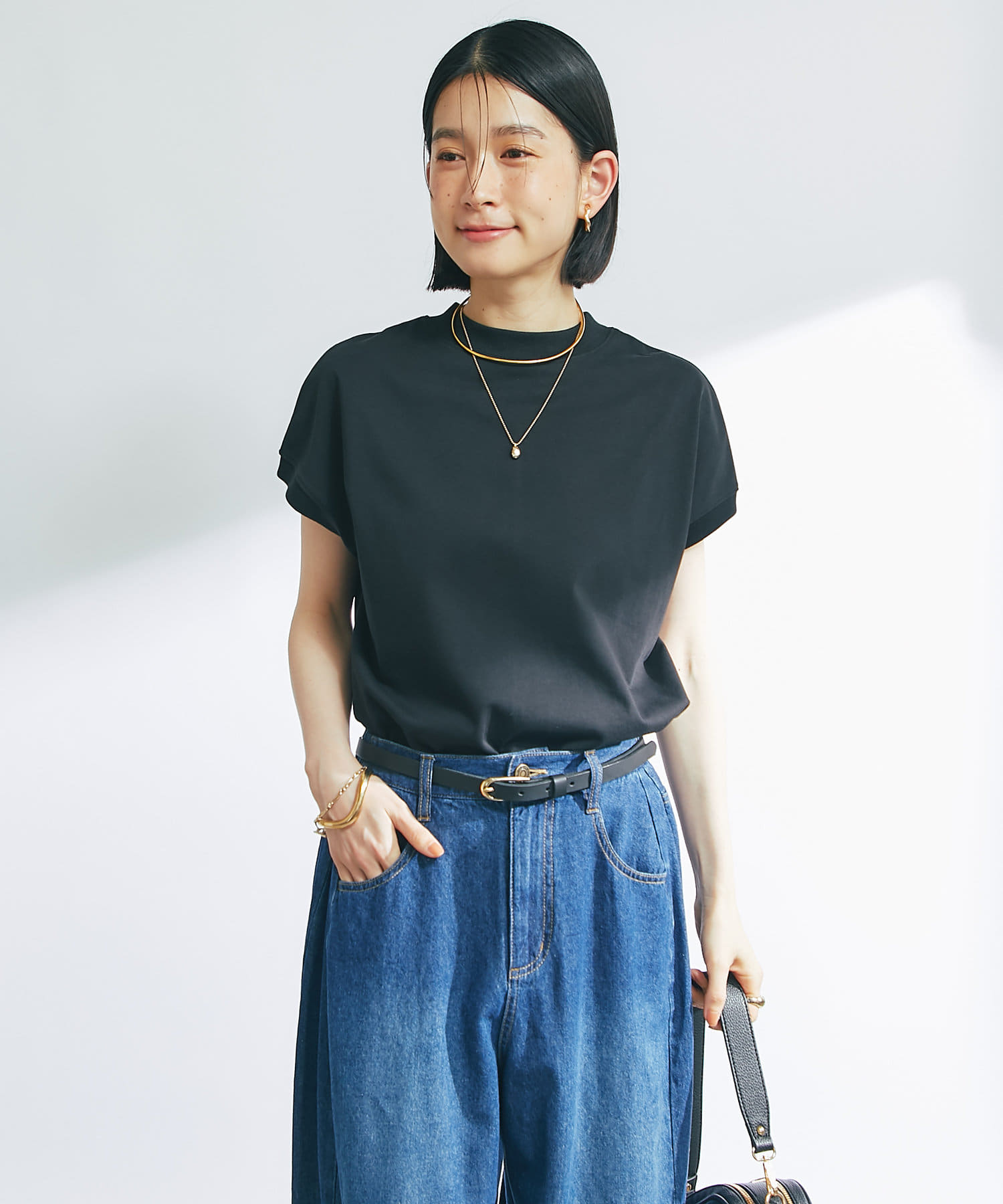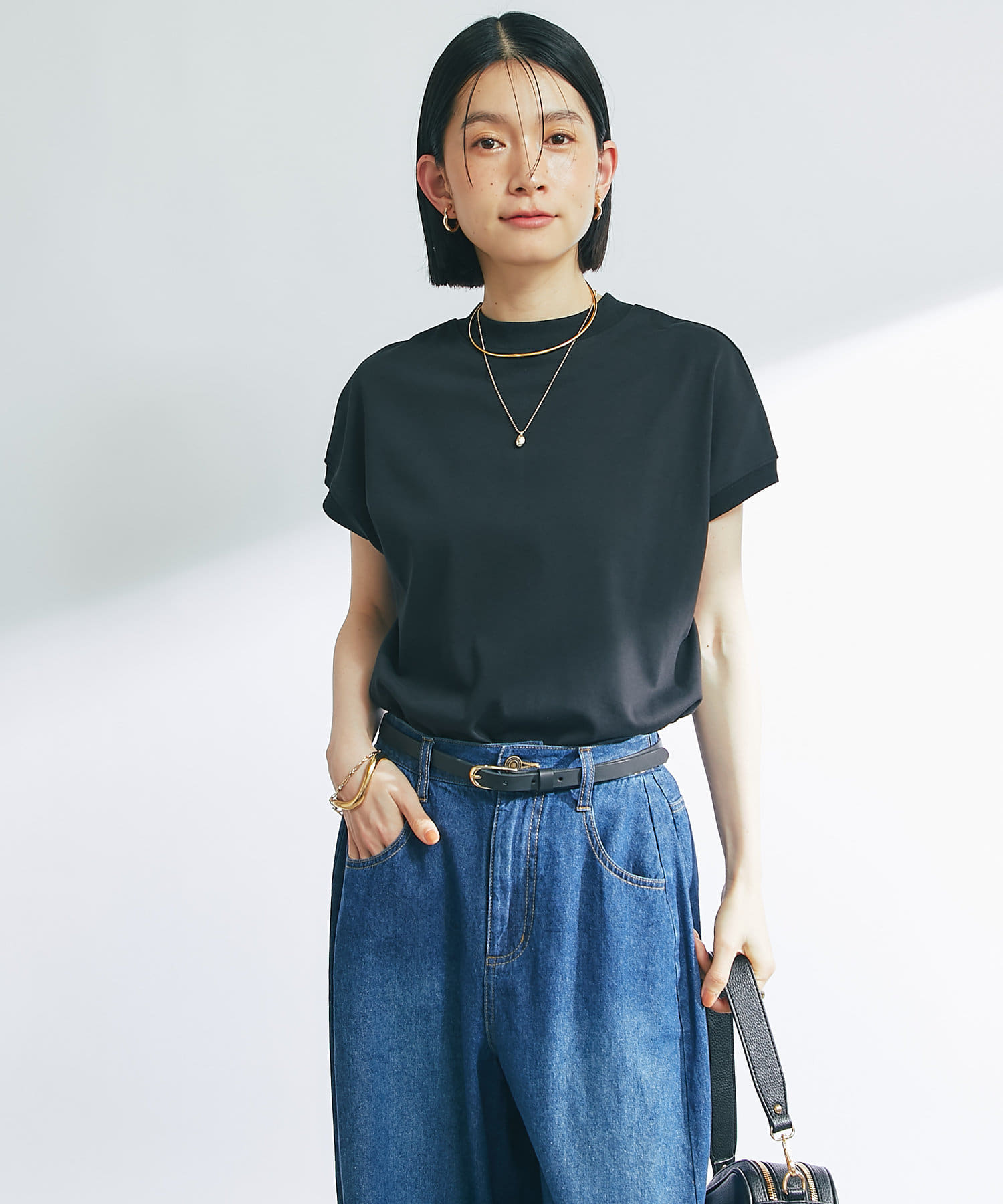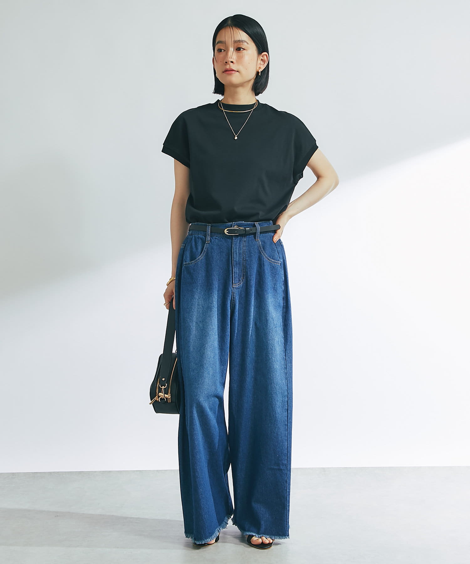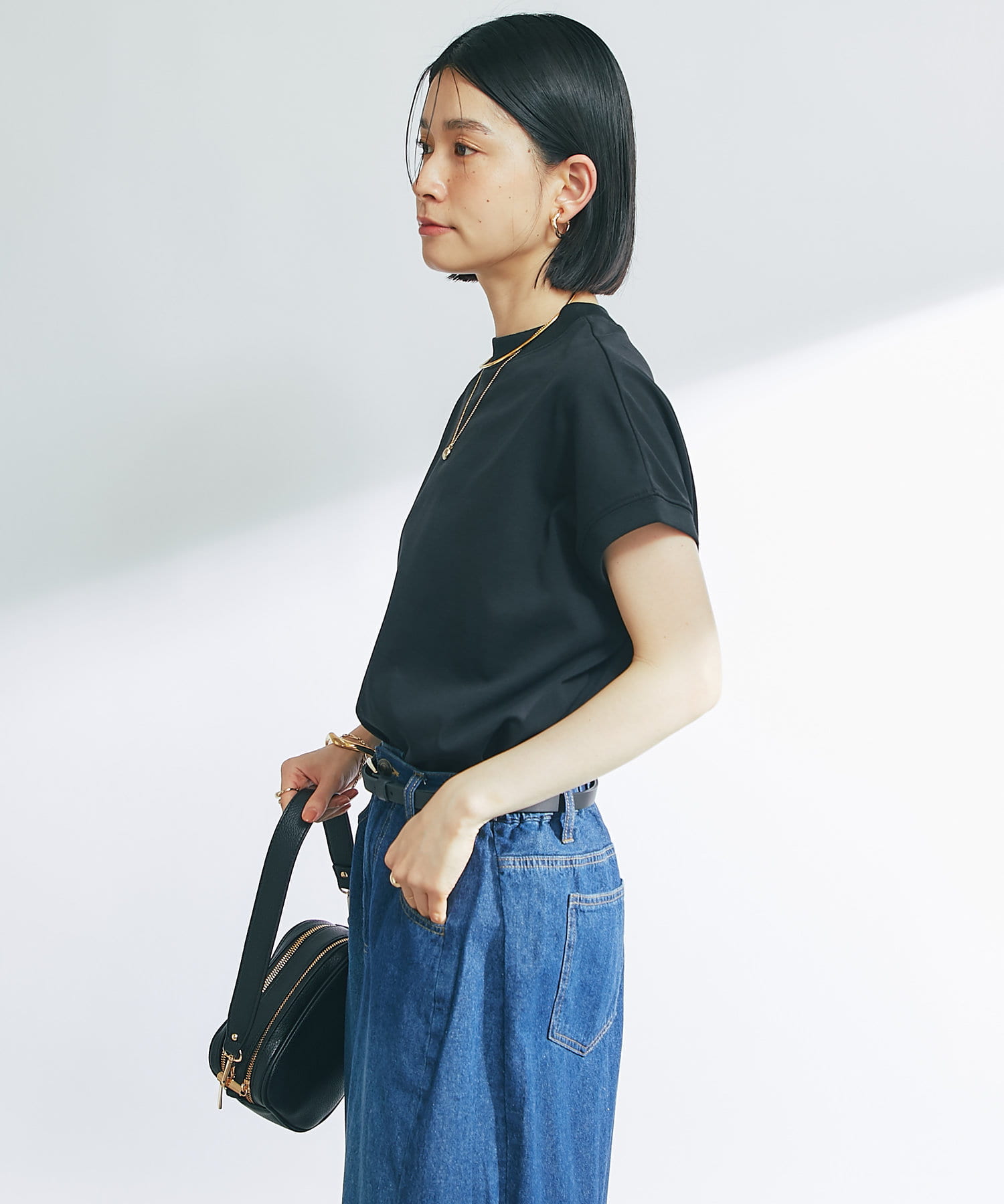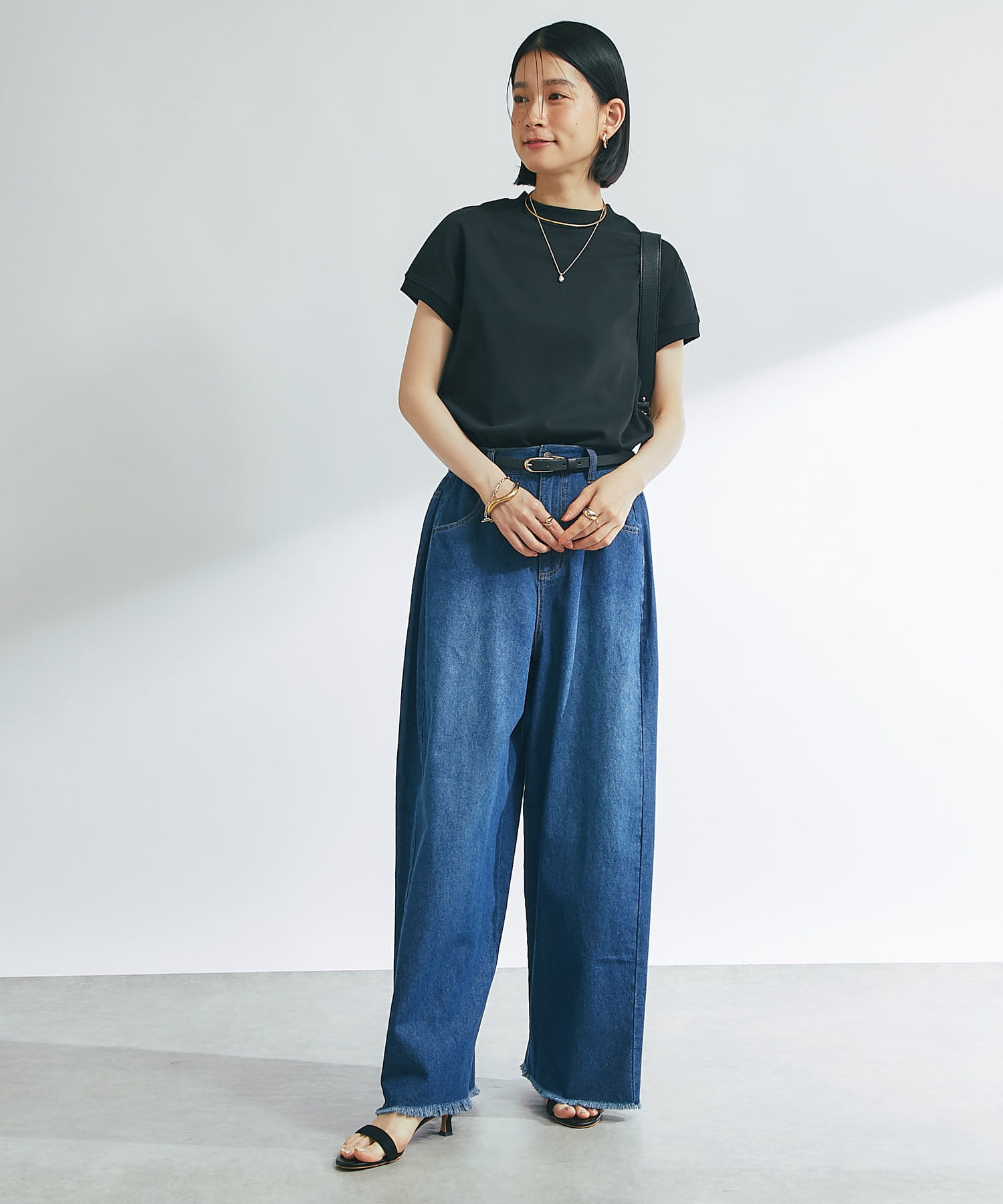 デニムワイドパンツと合わせることで、Tシャツのモックネックが引き立つ大人カジュアルなコーデに。