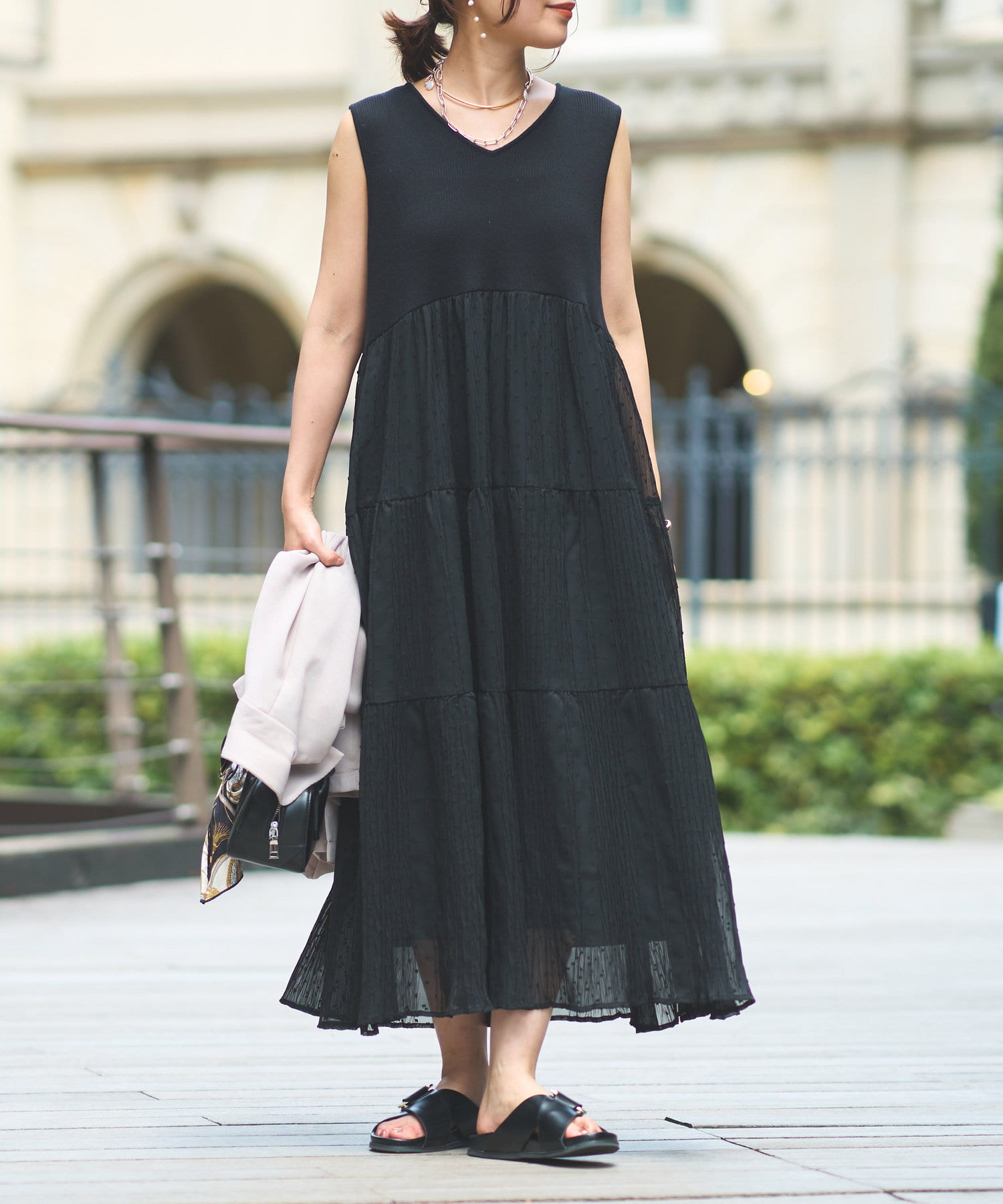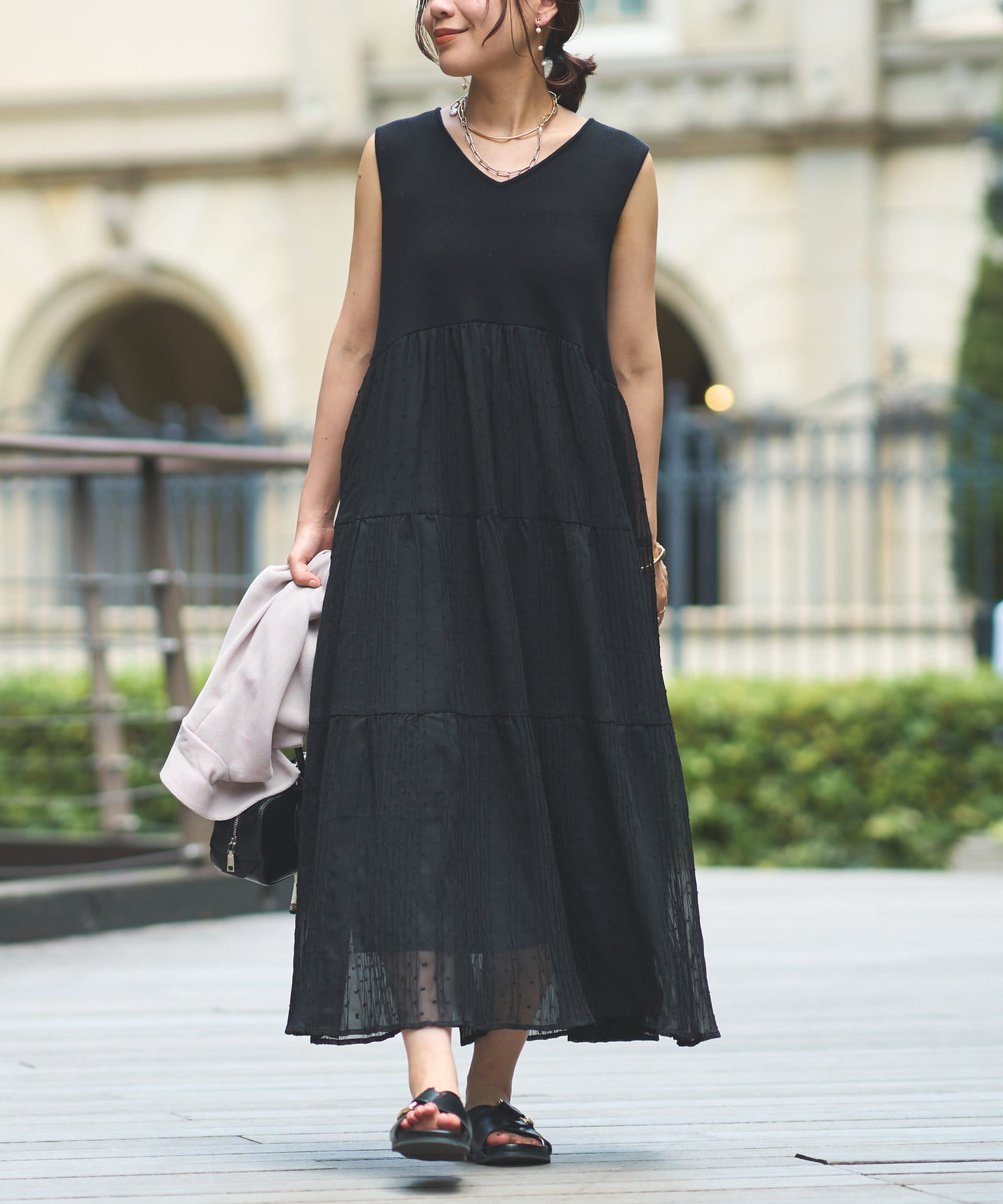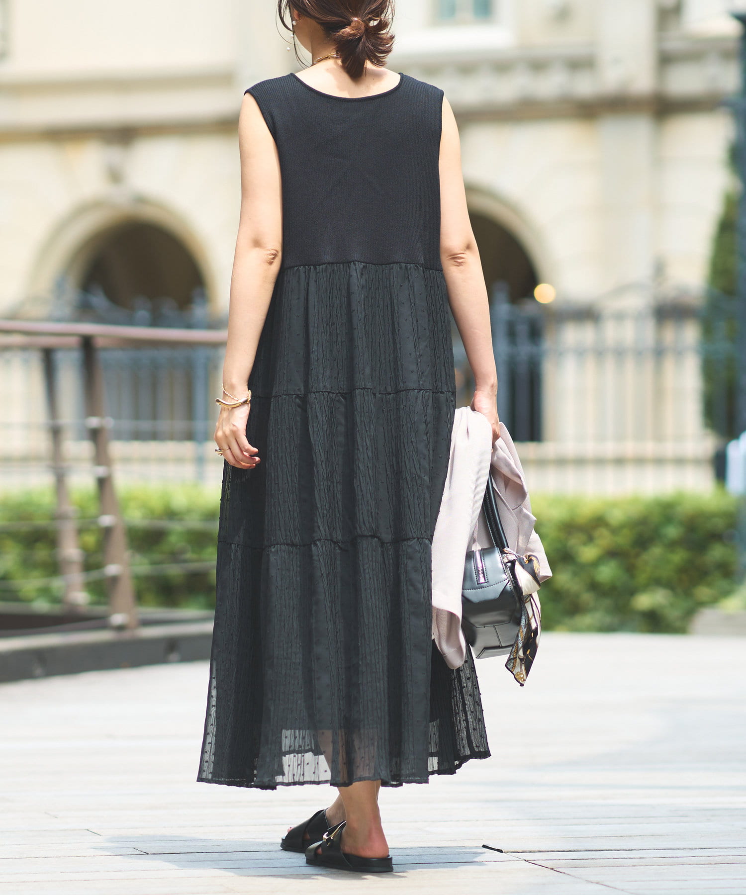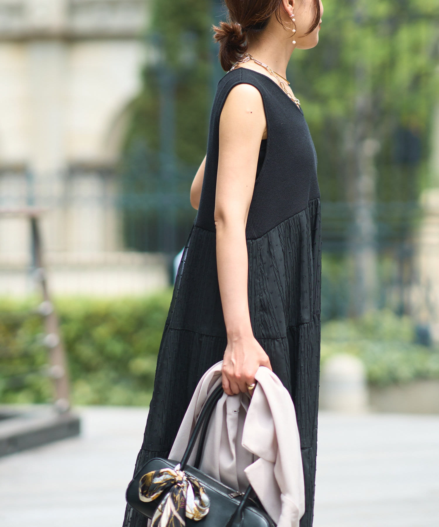 ・ドットプリーツ生地がアクセントになっている大人可愛い雰囲気のワンピース。