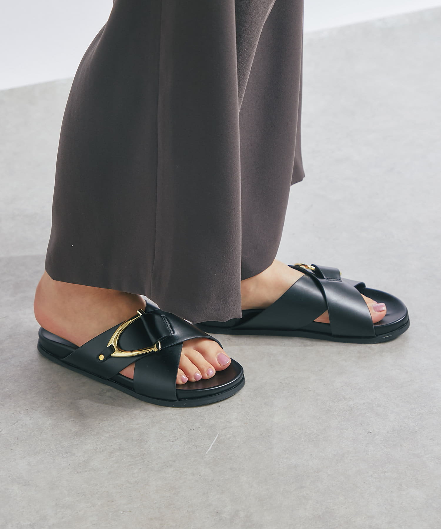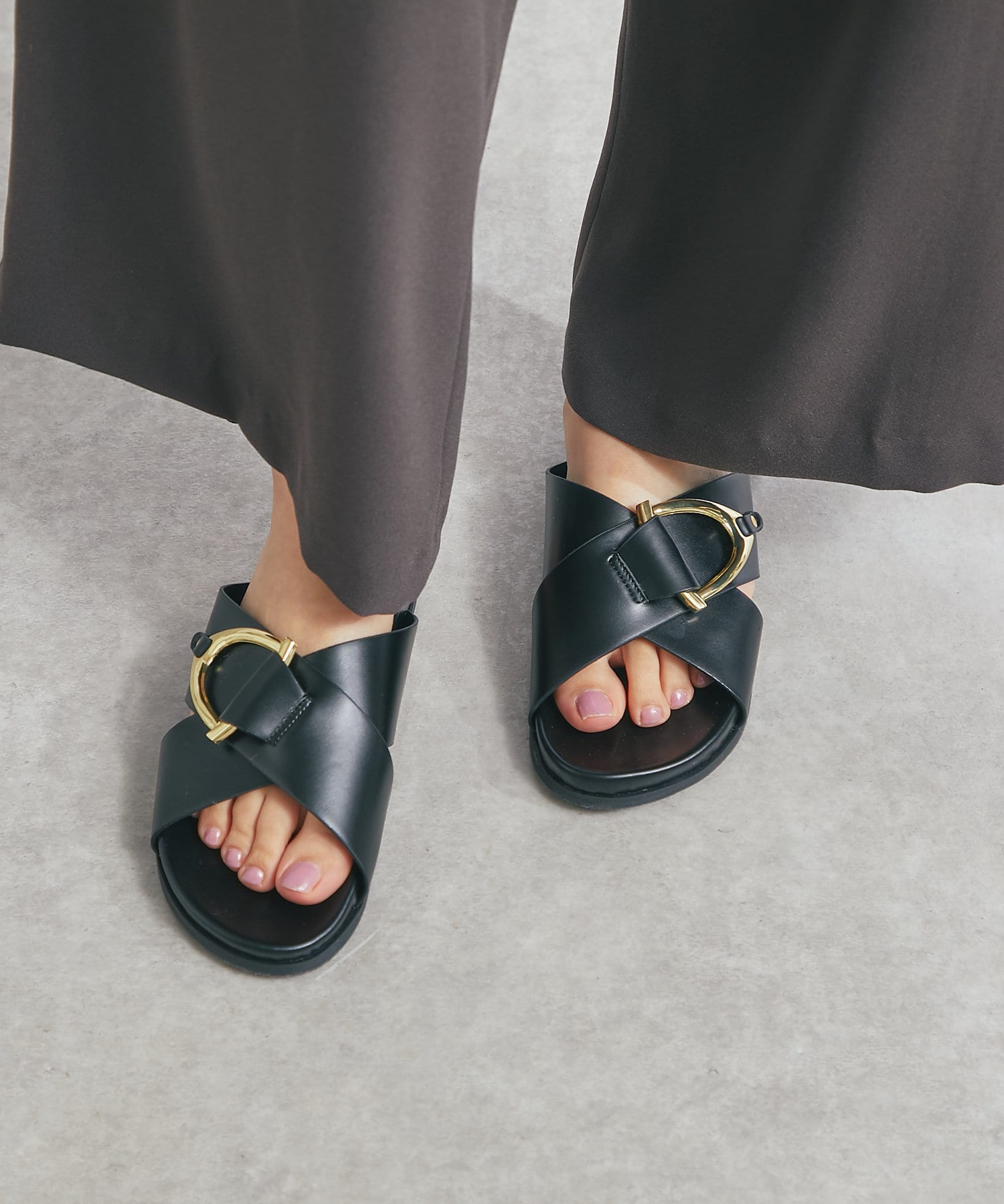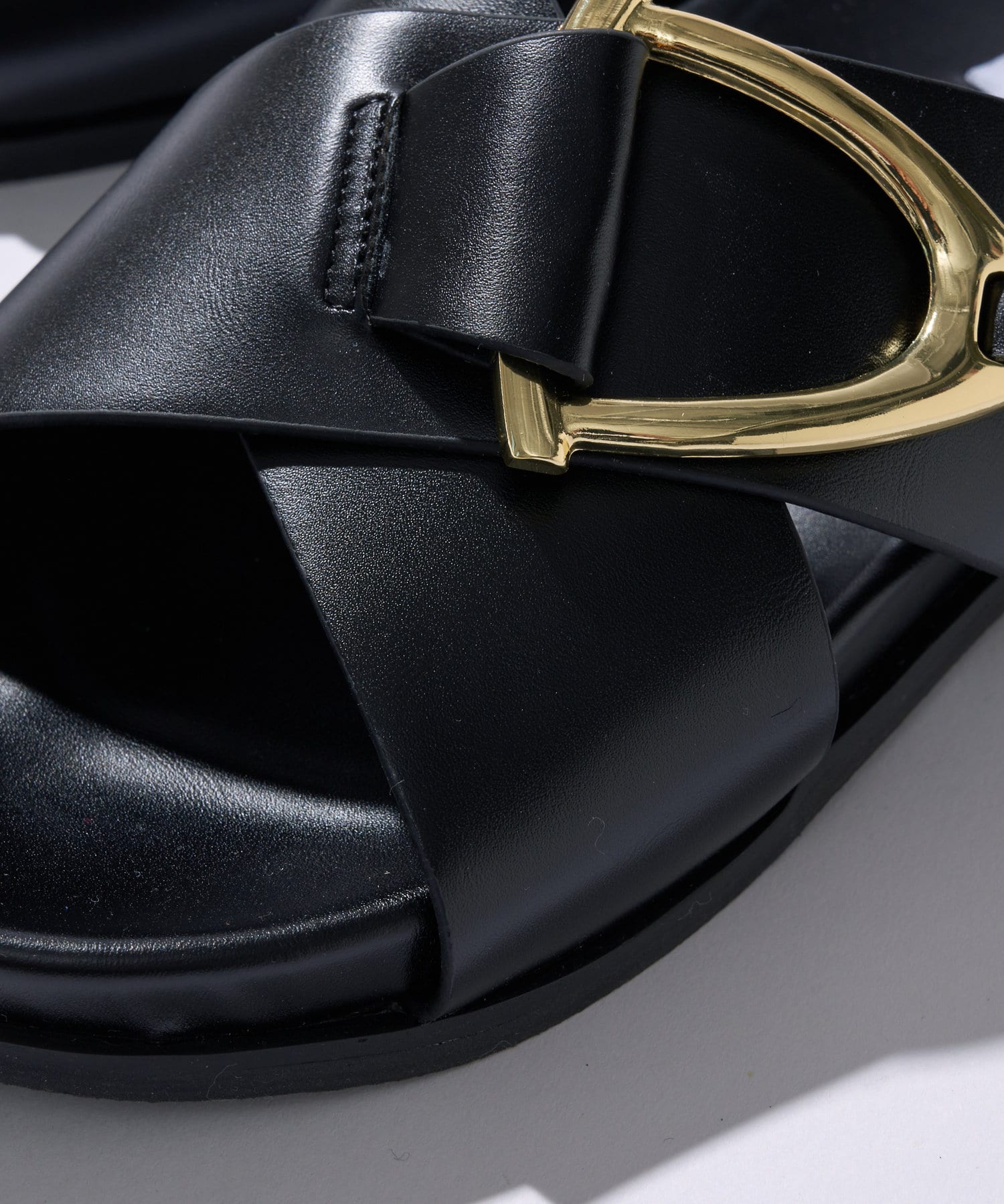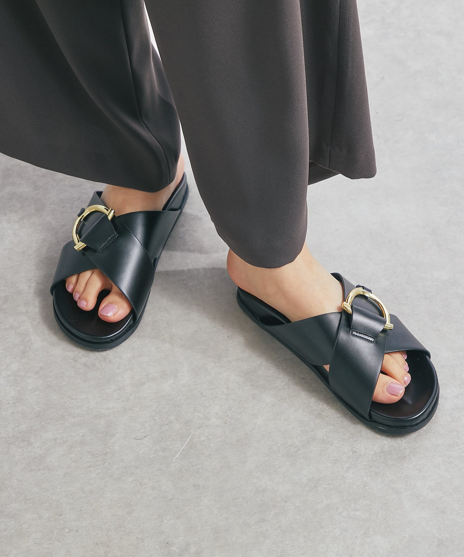 ・クロスしたベルトに光るバックルがカジュアルすぎず上品なサンダル。