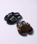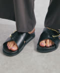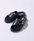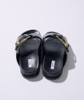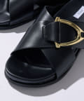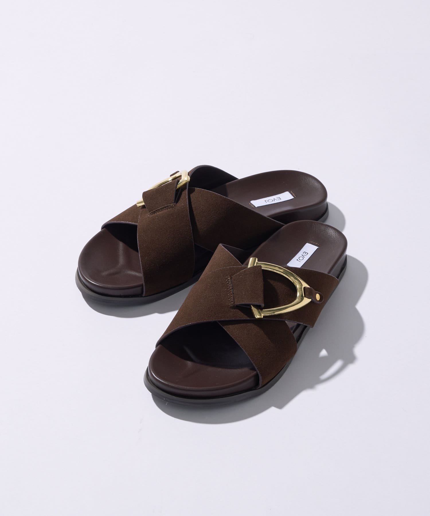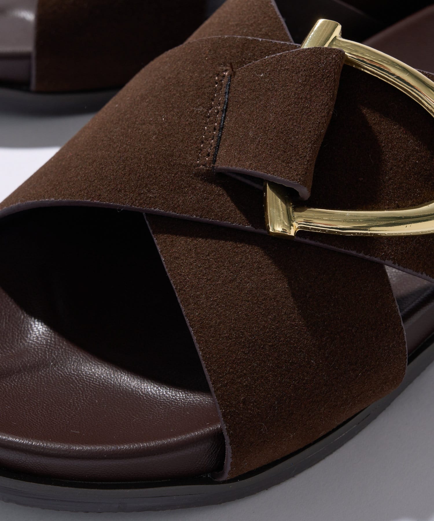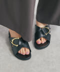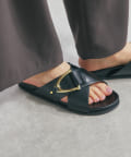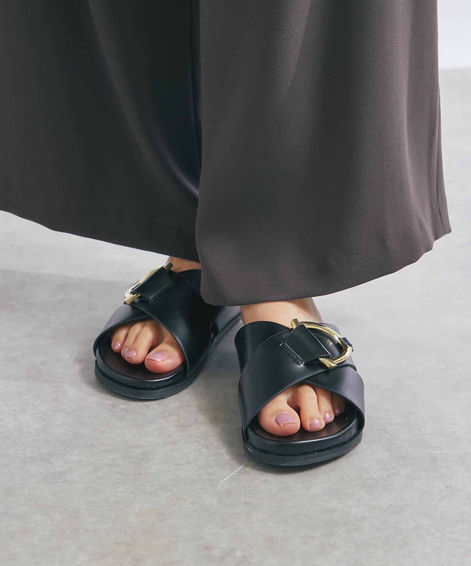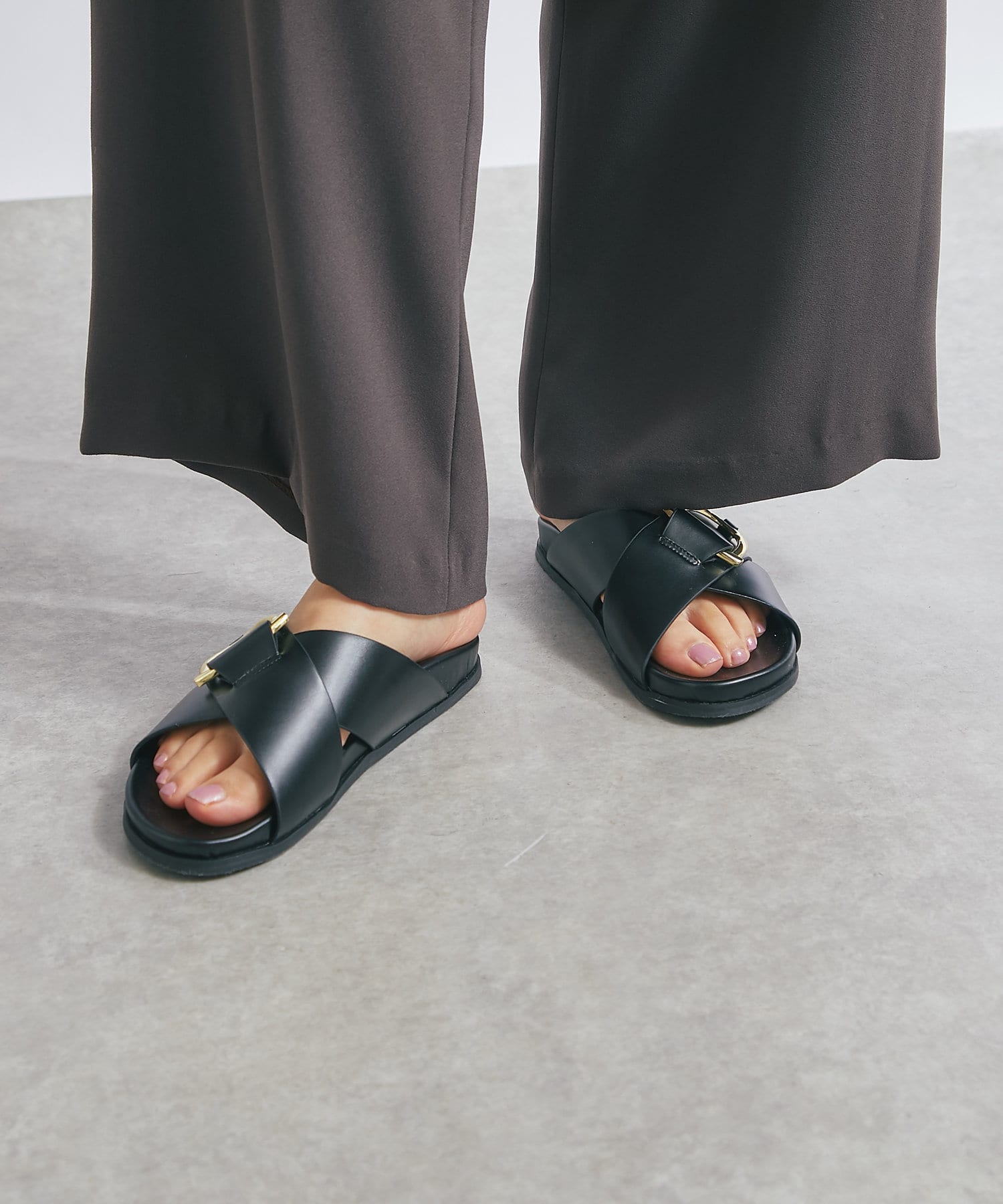 ・クロスしたベルトに光るバックルがカジュアルすぎず上品なサンダル。