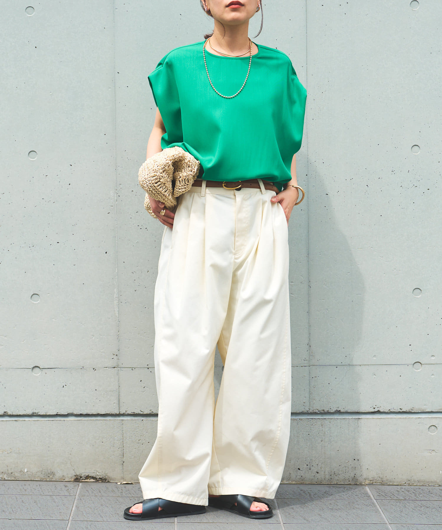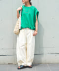 センタープレスパンツやワイドパンツなど、綺麗めボトムと合わせるとオフィスコーデに◎