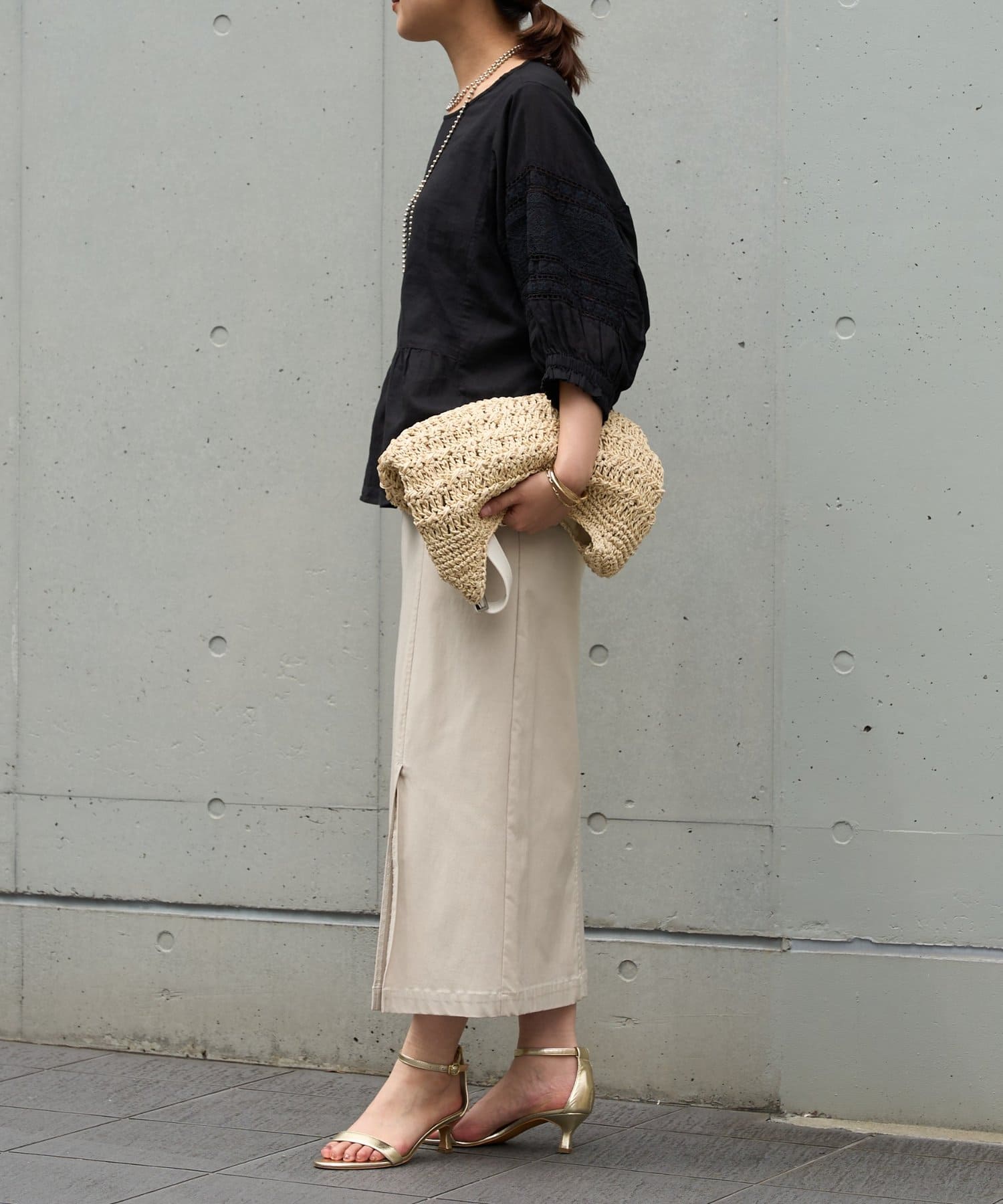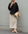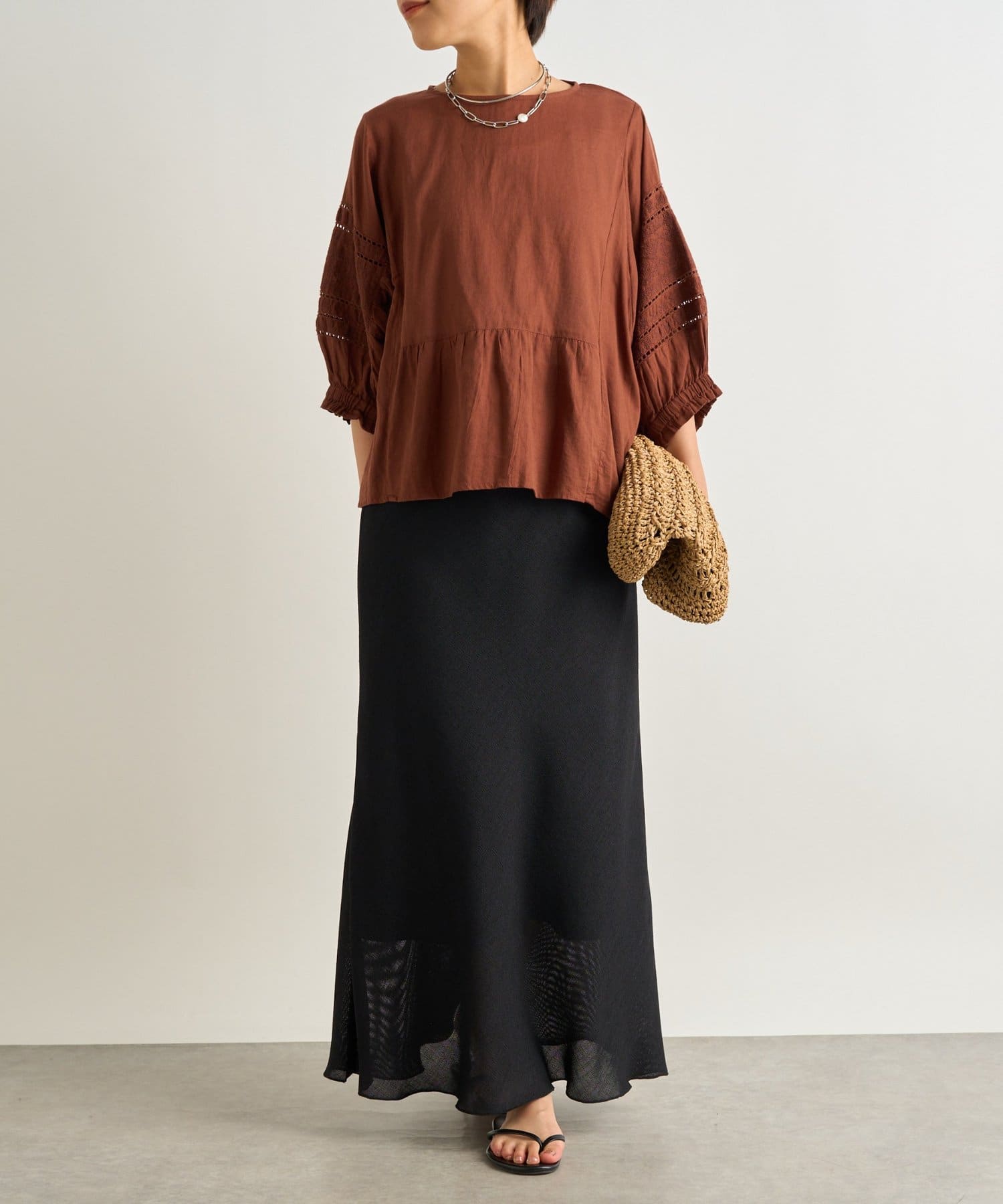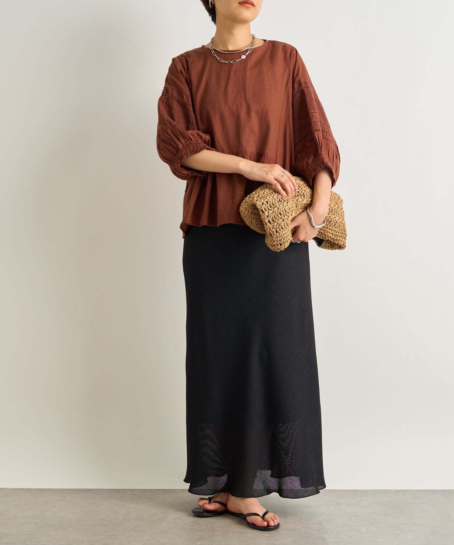 Iラインシルエットのスカートなどを合わせて、ブラウスのふんわりとしたシルエットを活かすのがおすすめ。