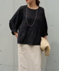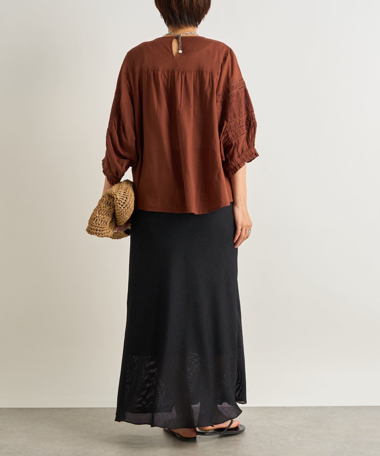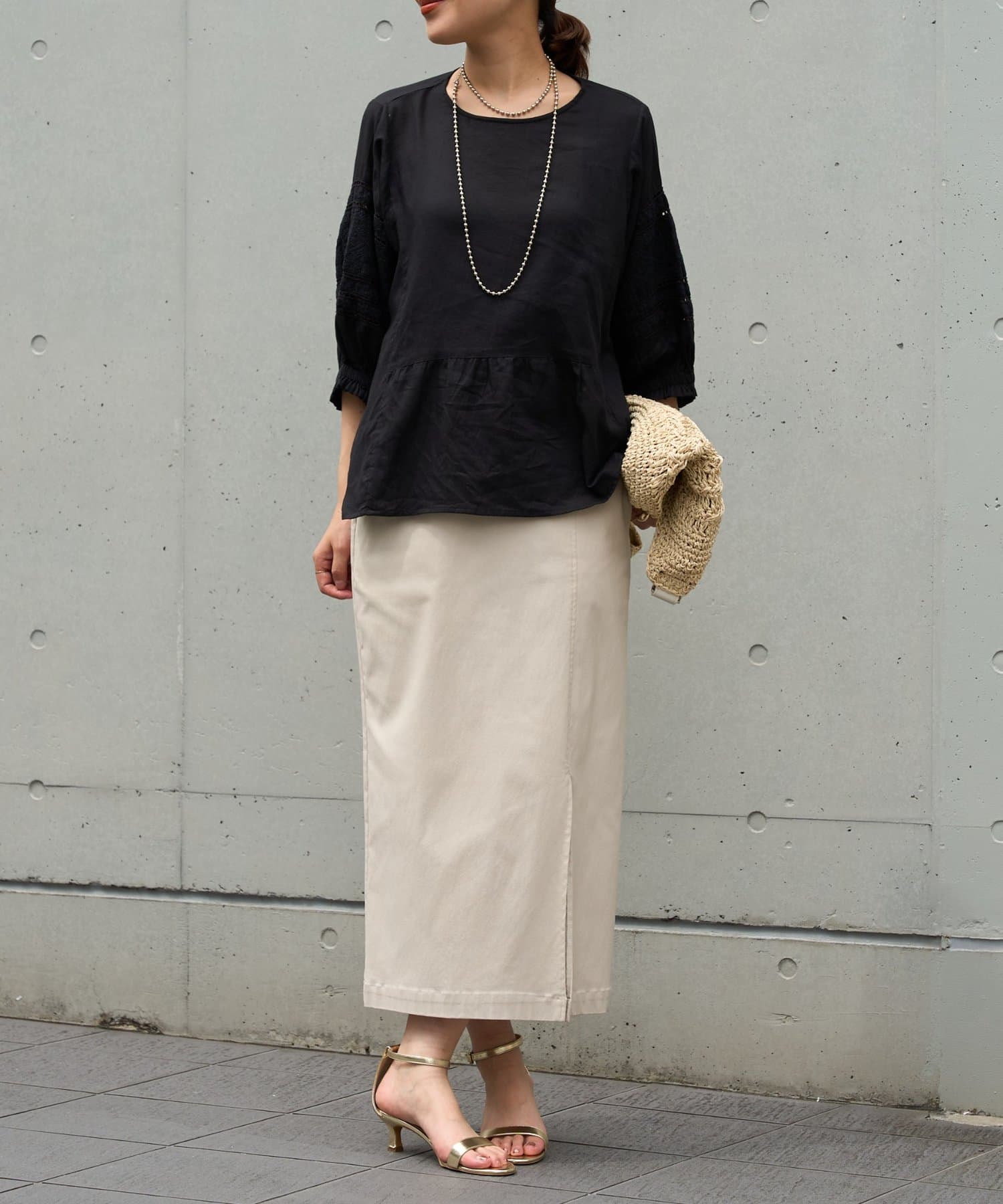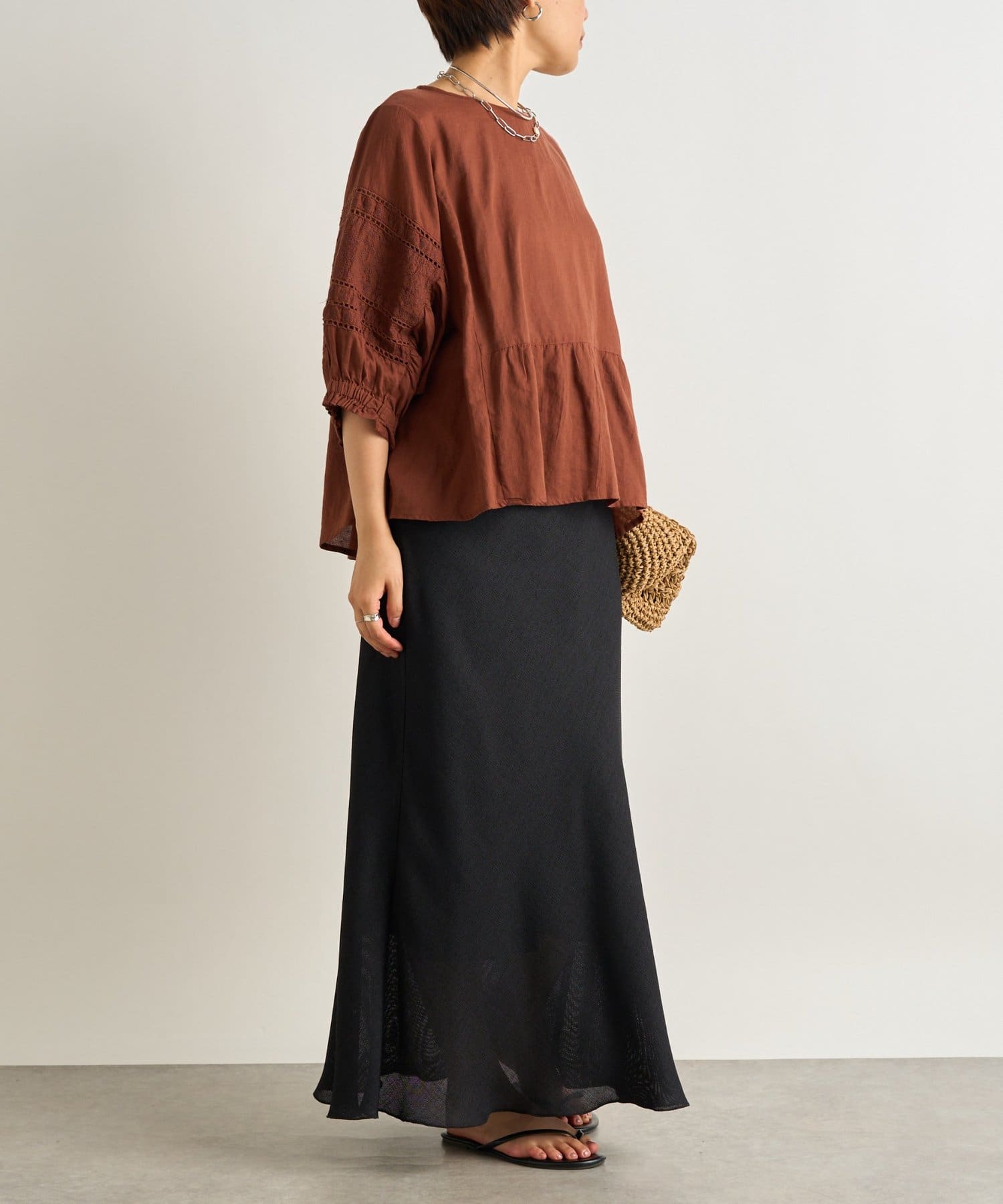 Iラインシルエットのスカートなどを合わせて、ブラウスのふんわりとしたシルエットを活かすのがおすすめ。