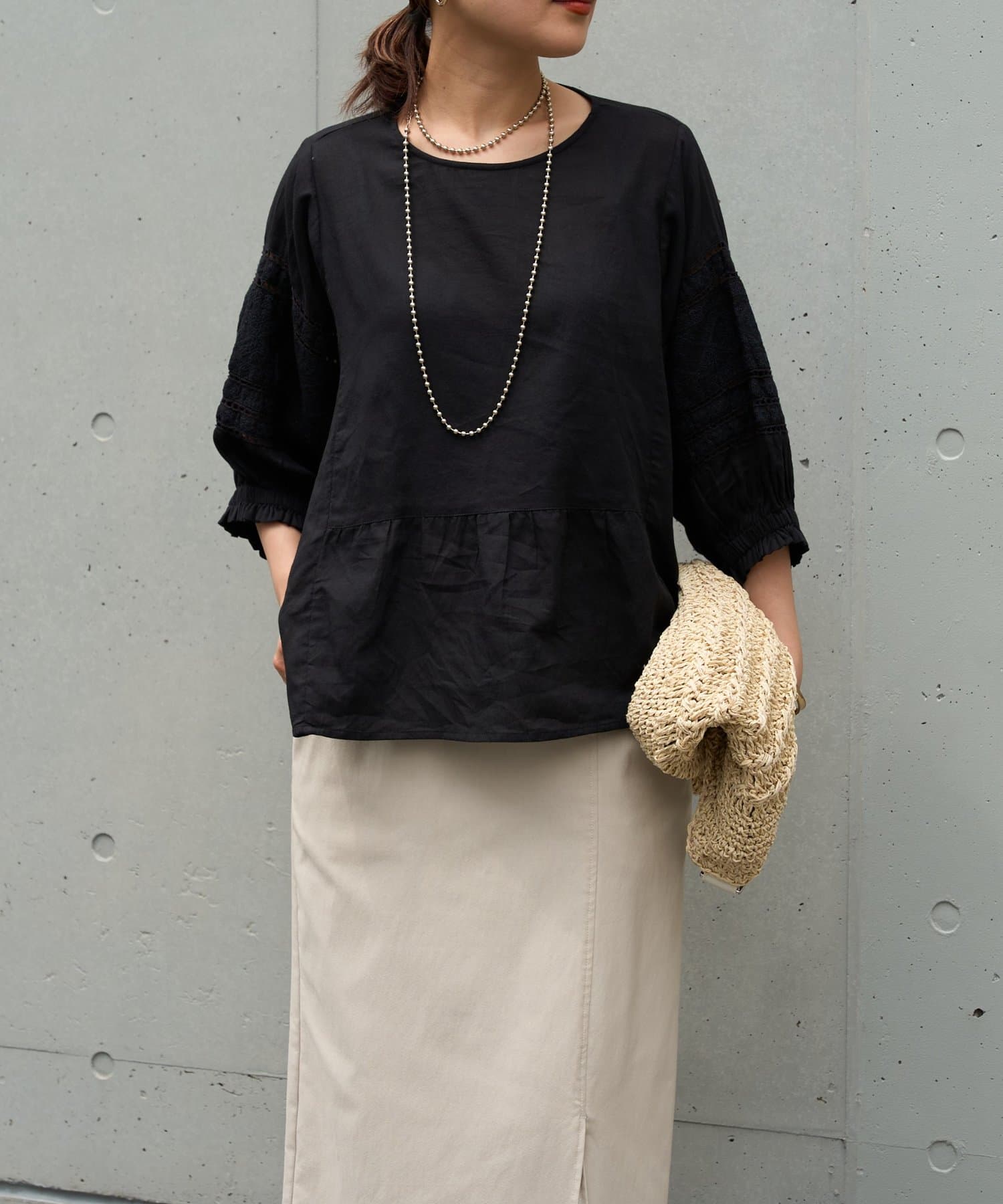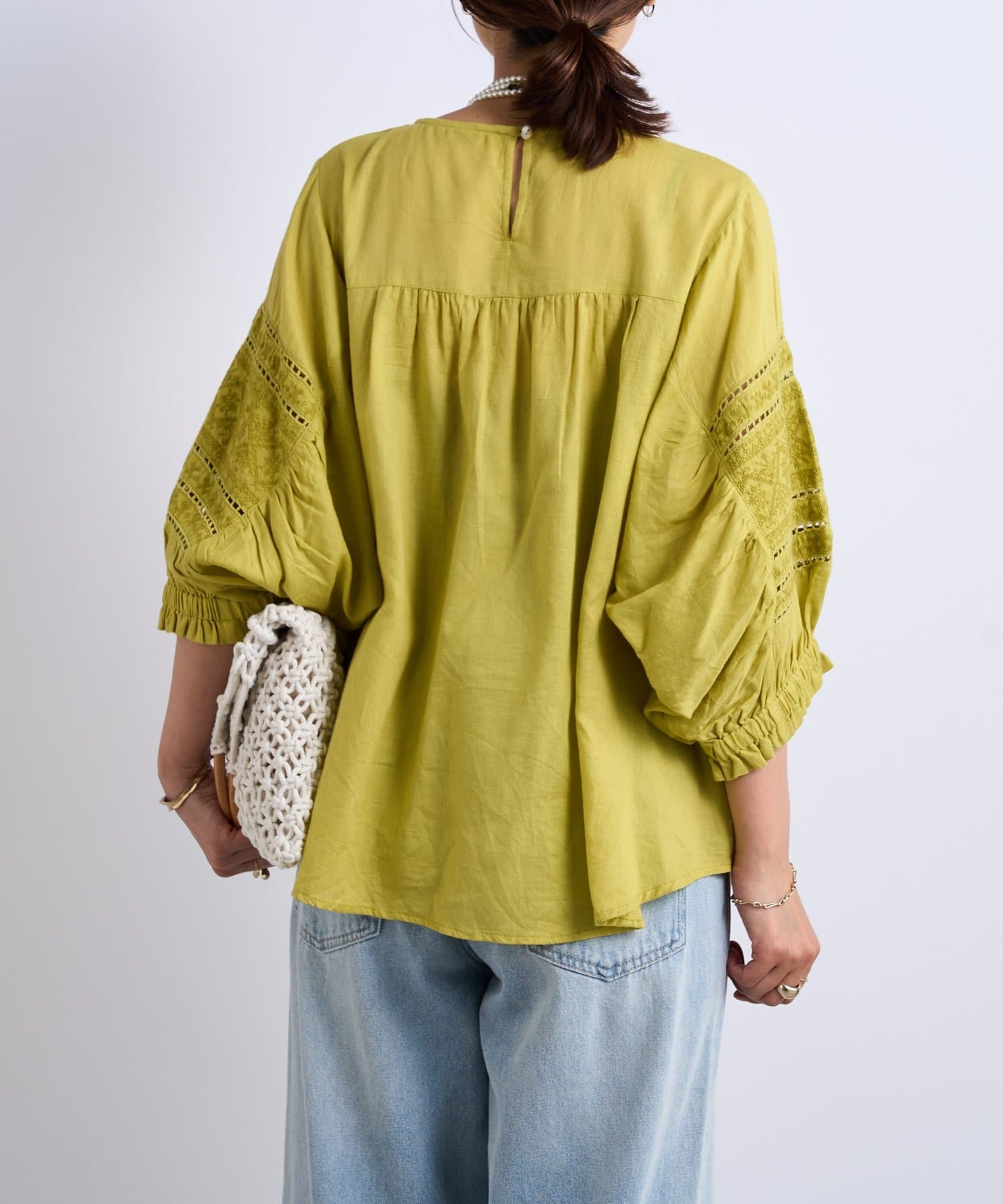 ・贅沢な生地刺繍をほどこした袖のデザインがポイントになり、大人フェミニンな雰囲気に◎