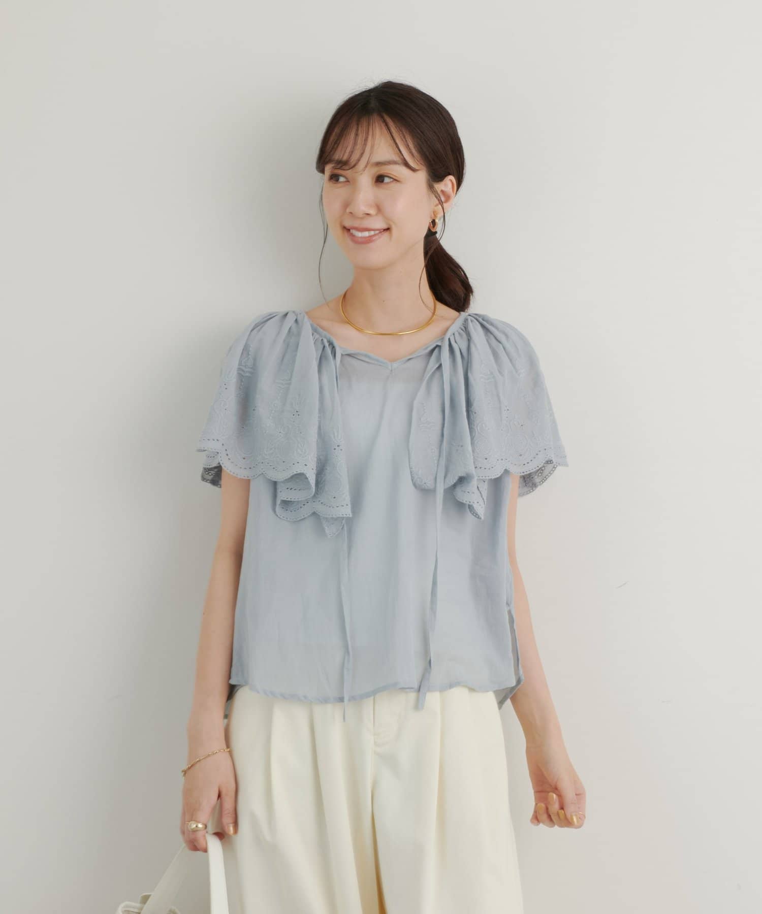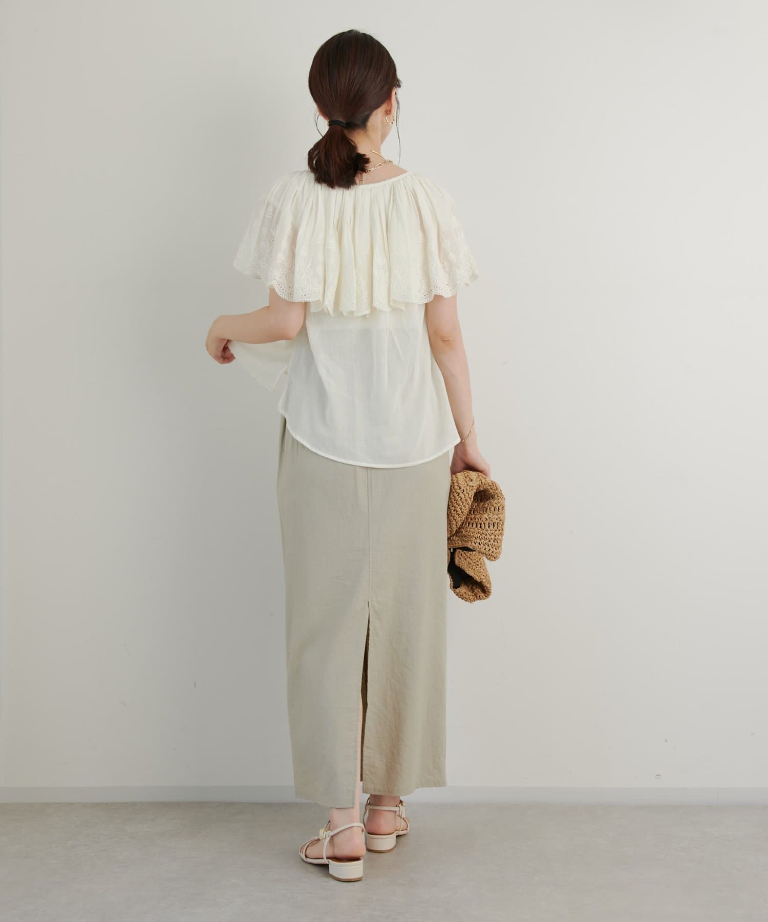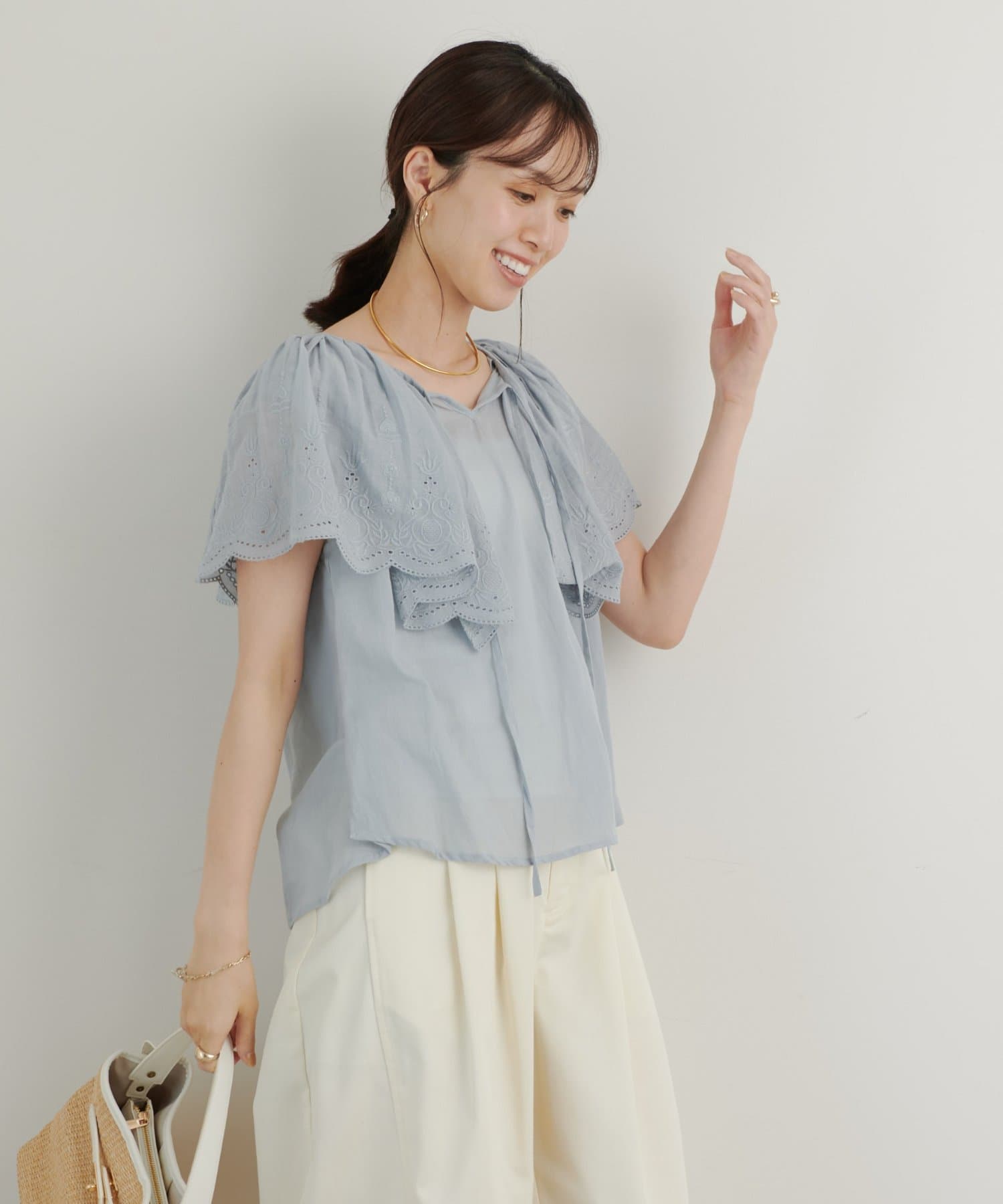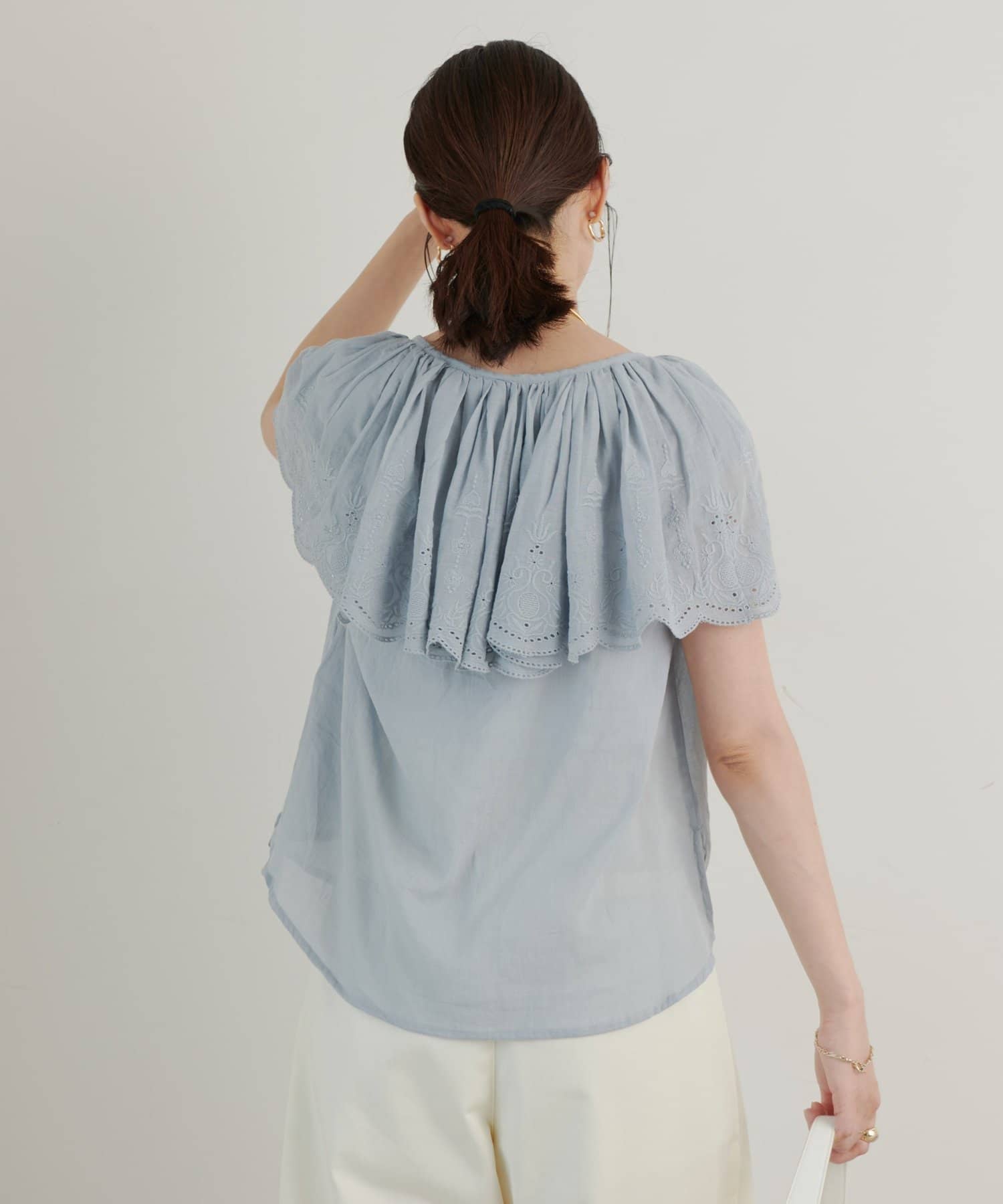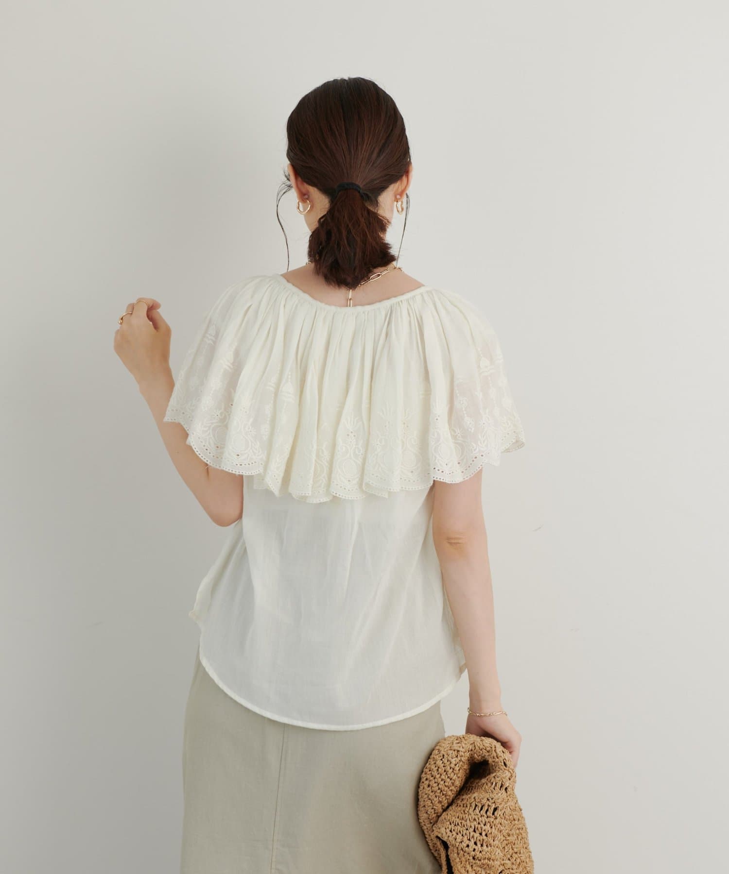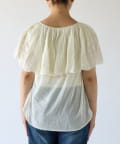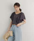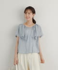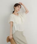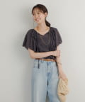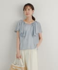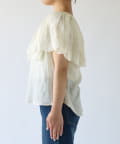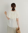 ・襟元が大きめにあいていて抜け感があり、フリルで華やかな女性らしさを演出。