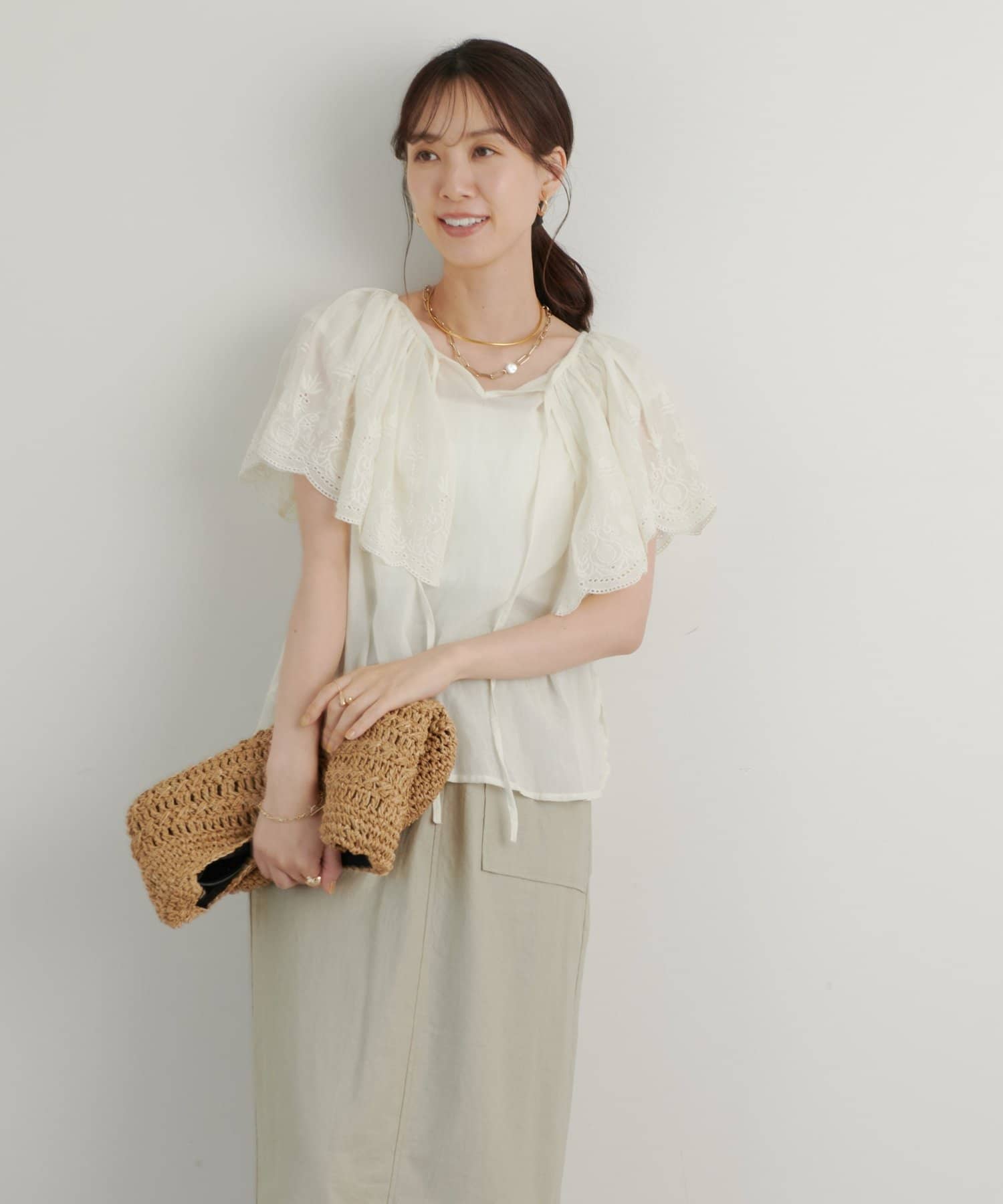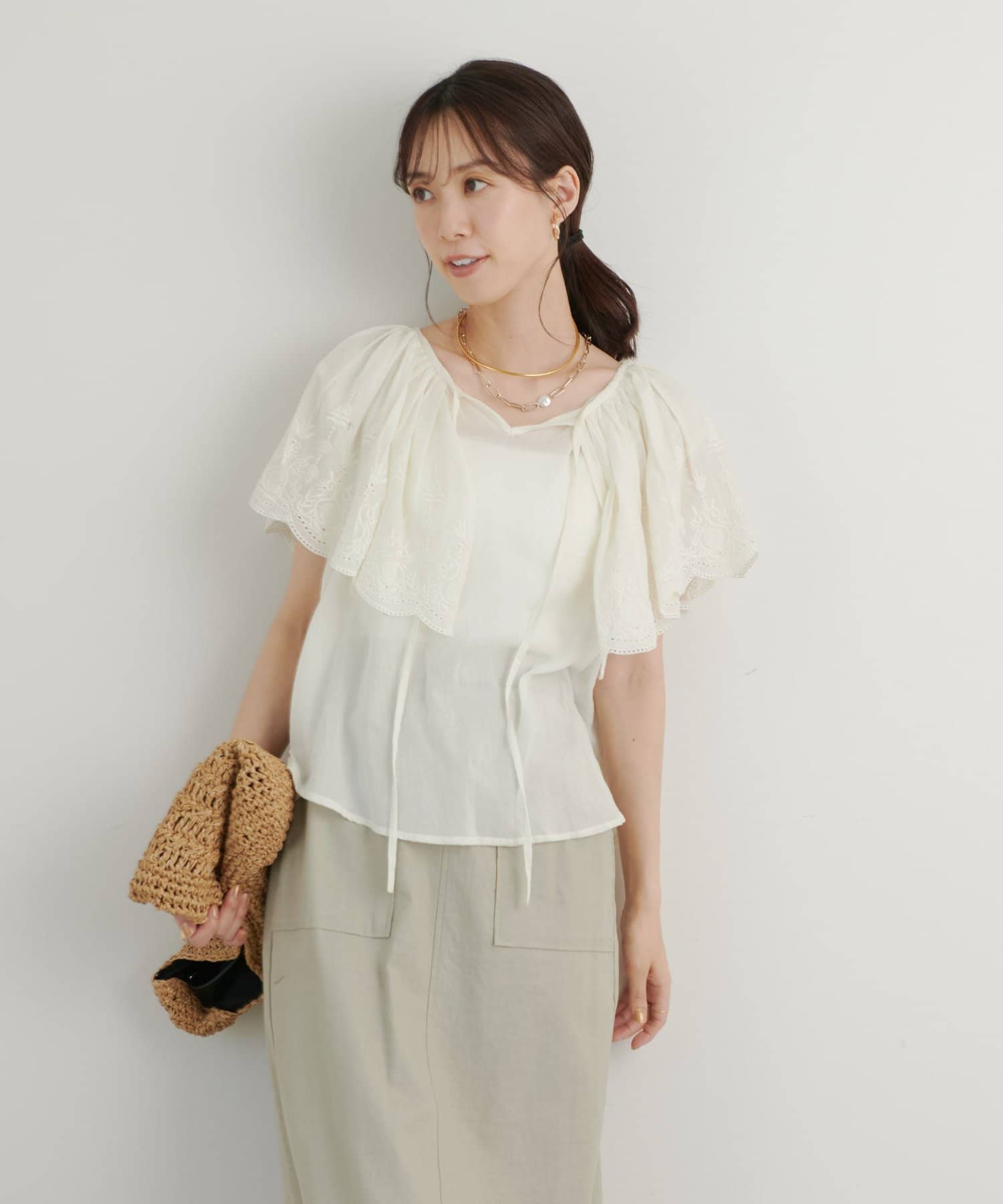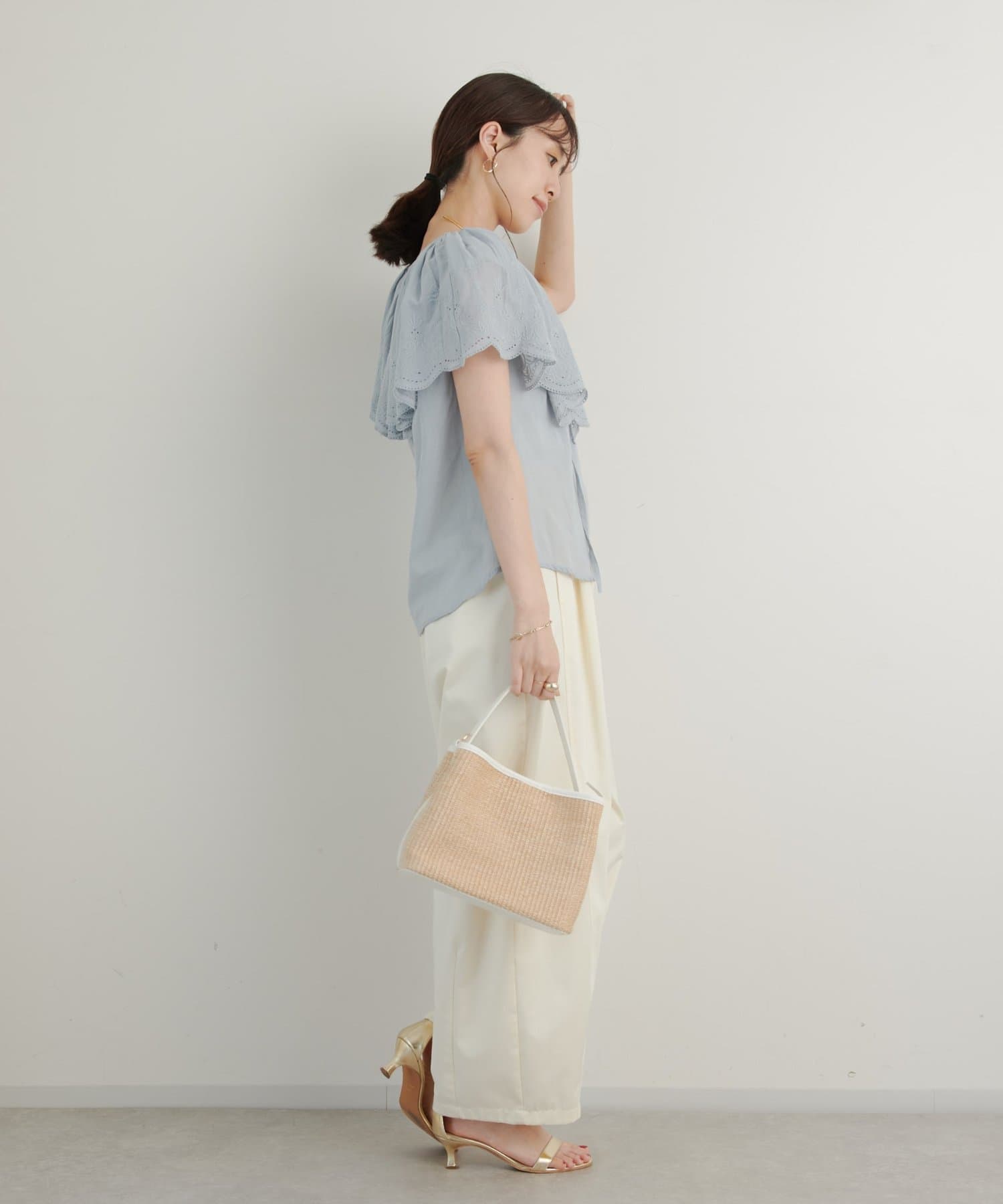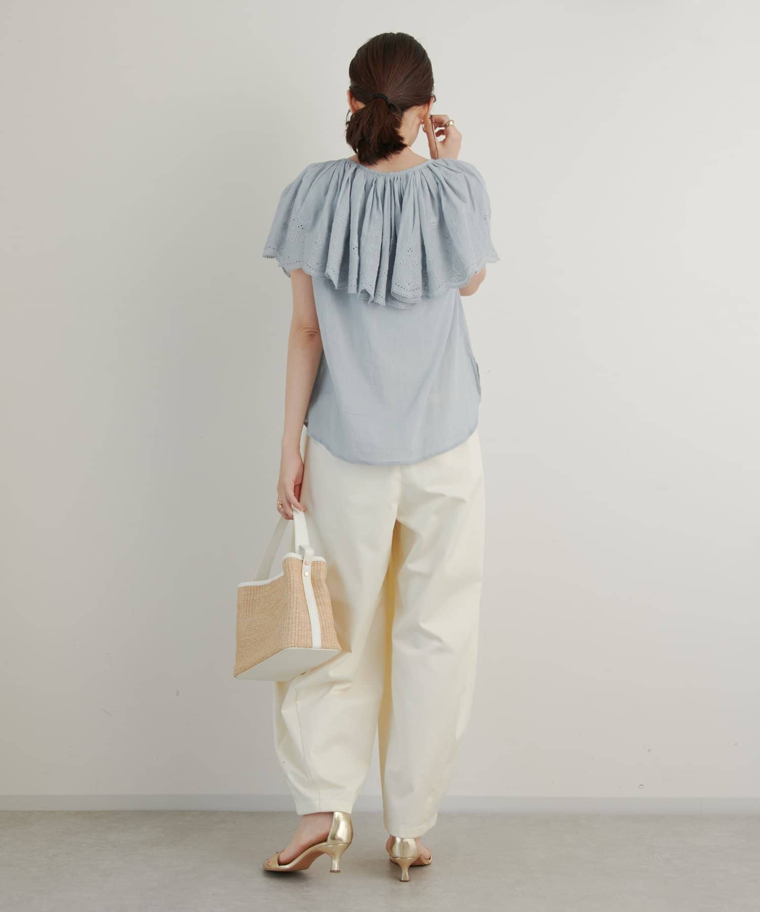 ・襟元が大きめにあいていて抜け感があり、フリルで華やかな女性らしさを演出。