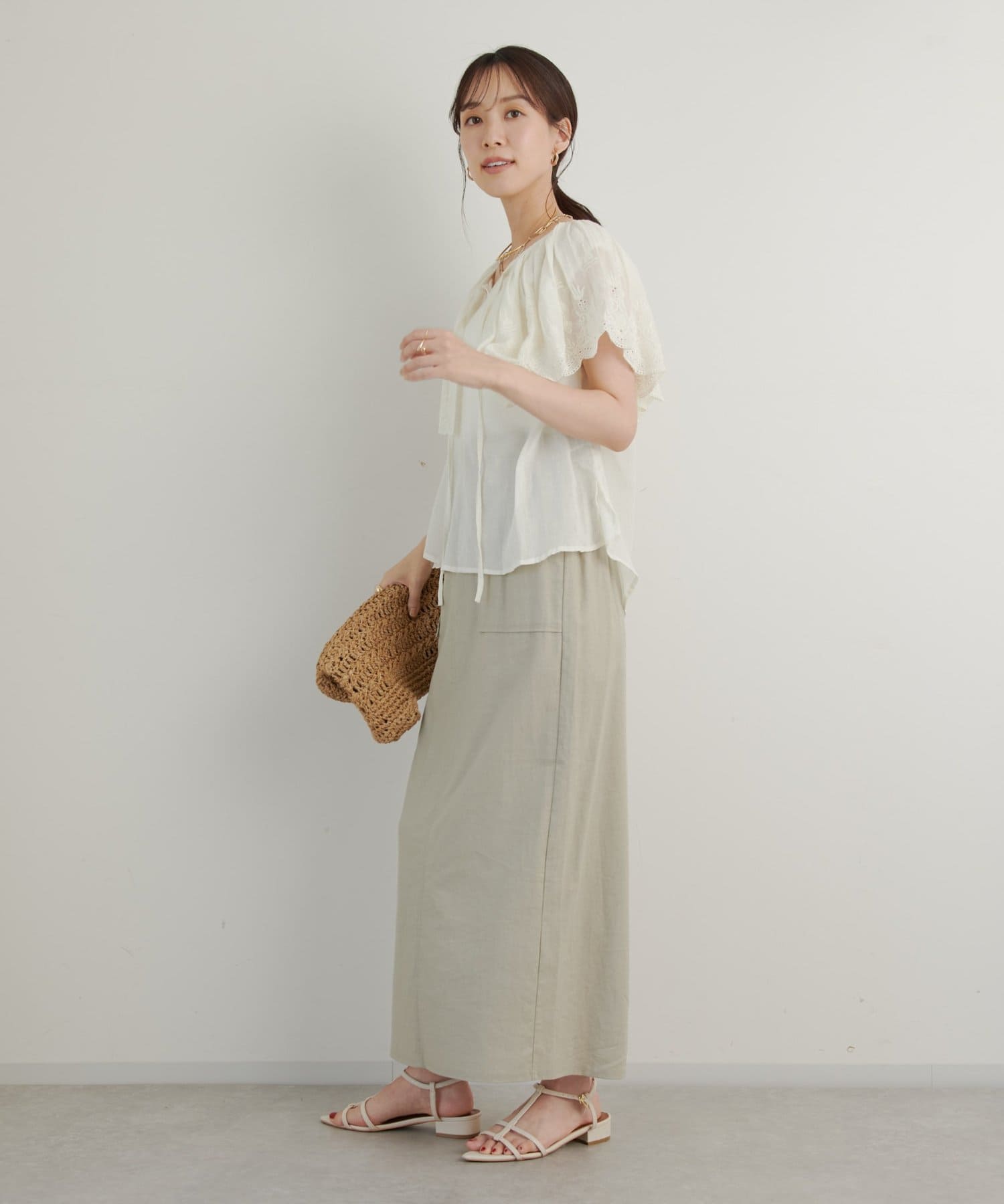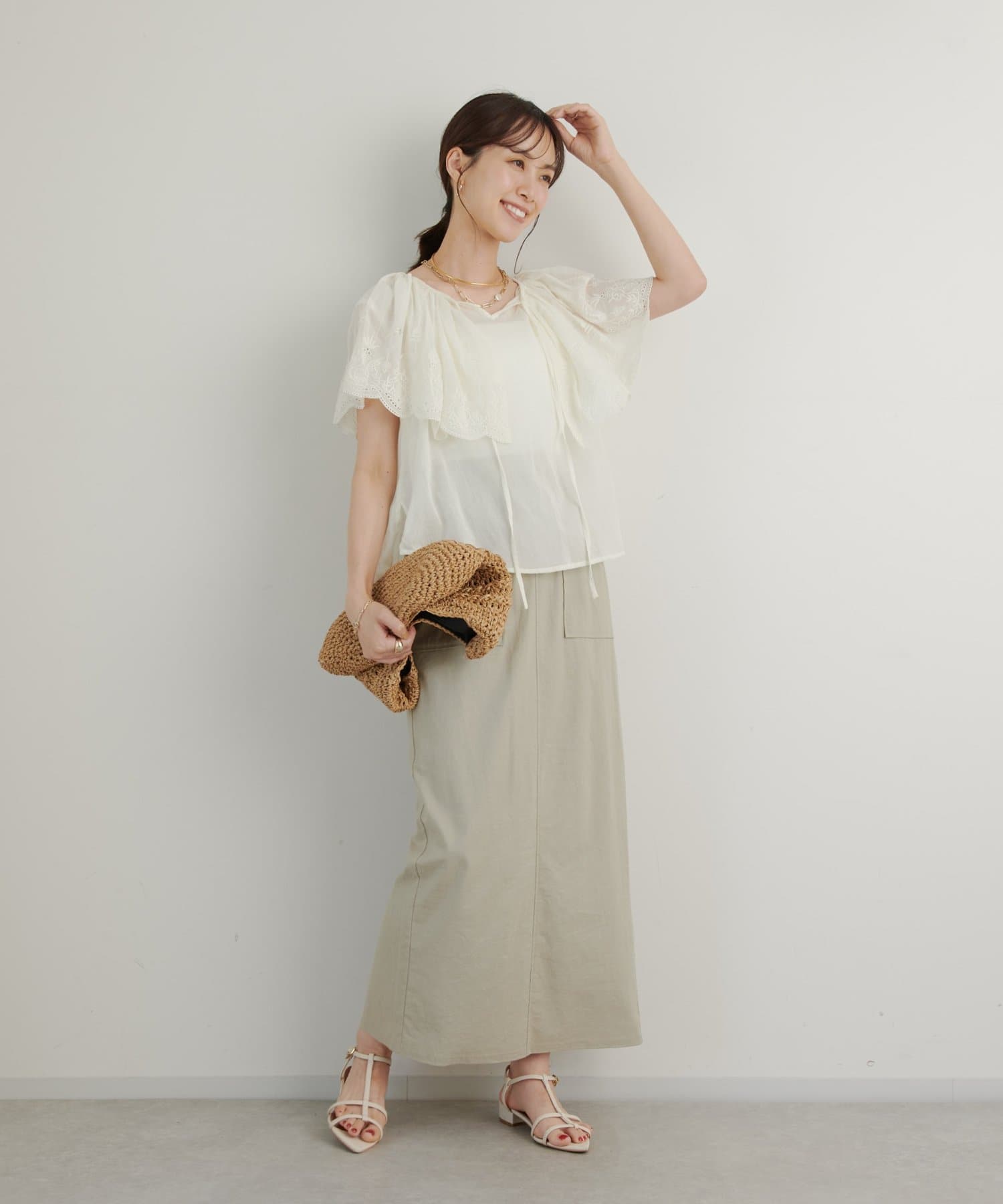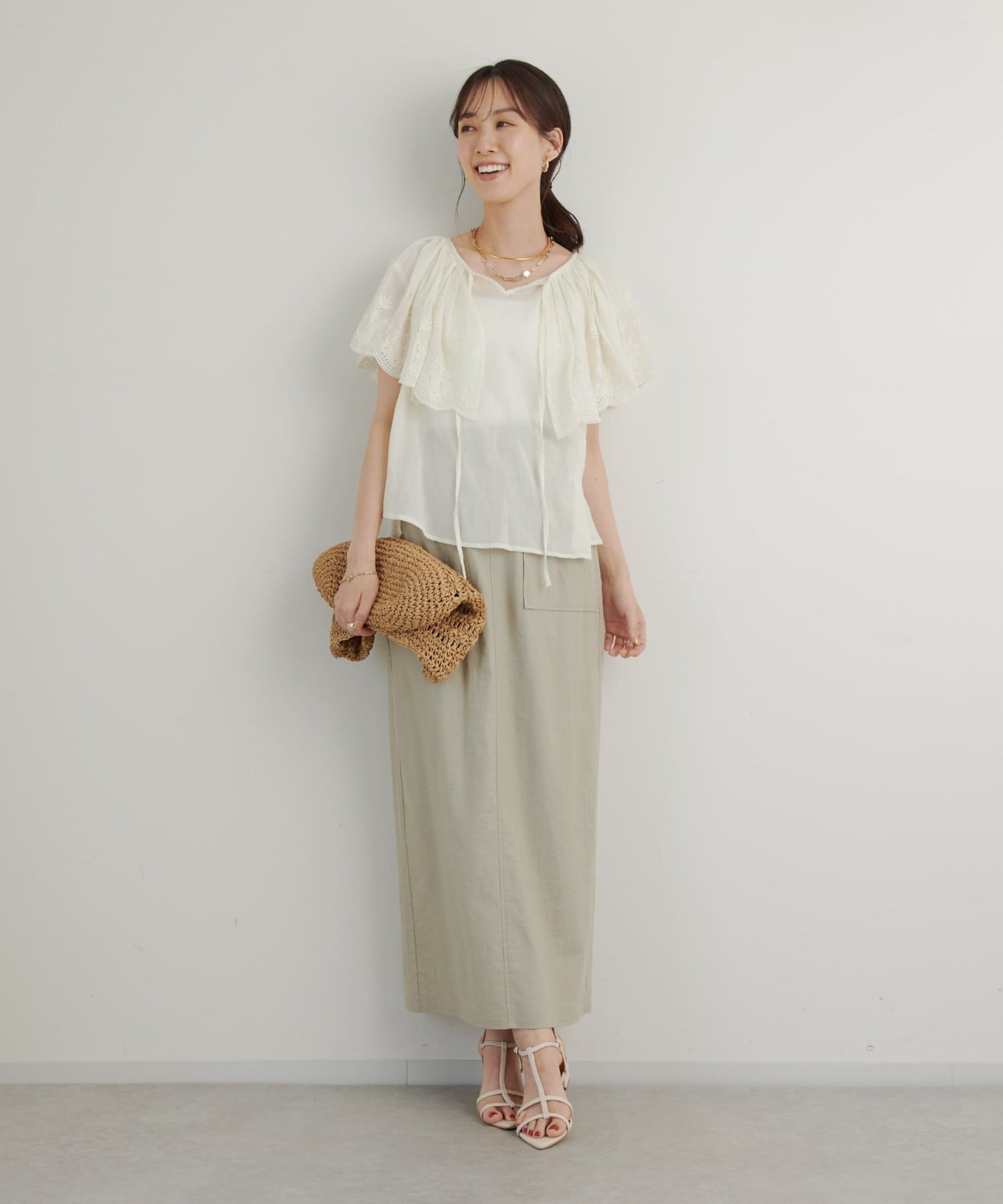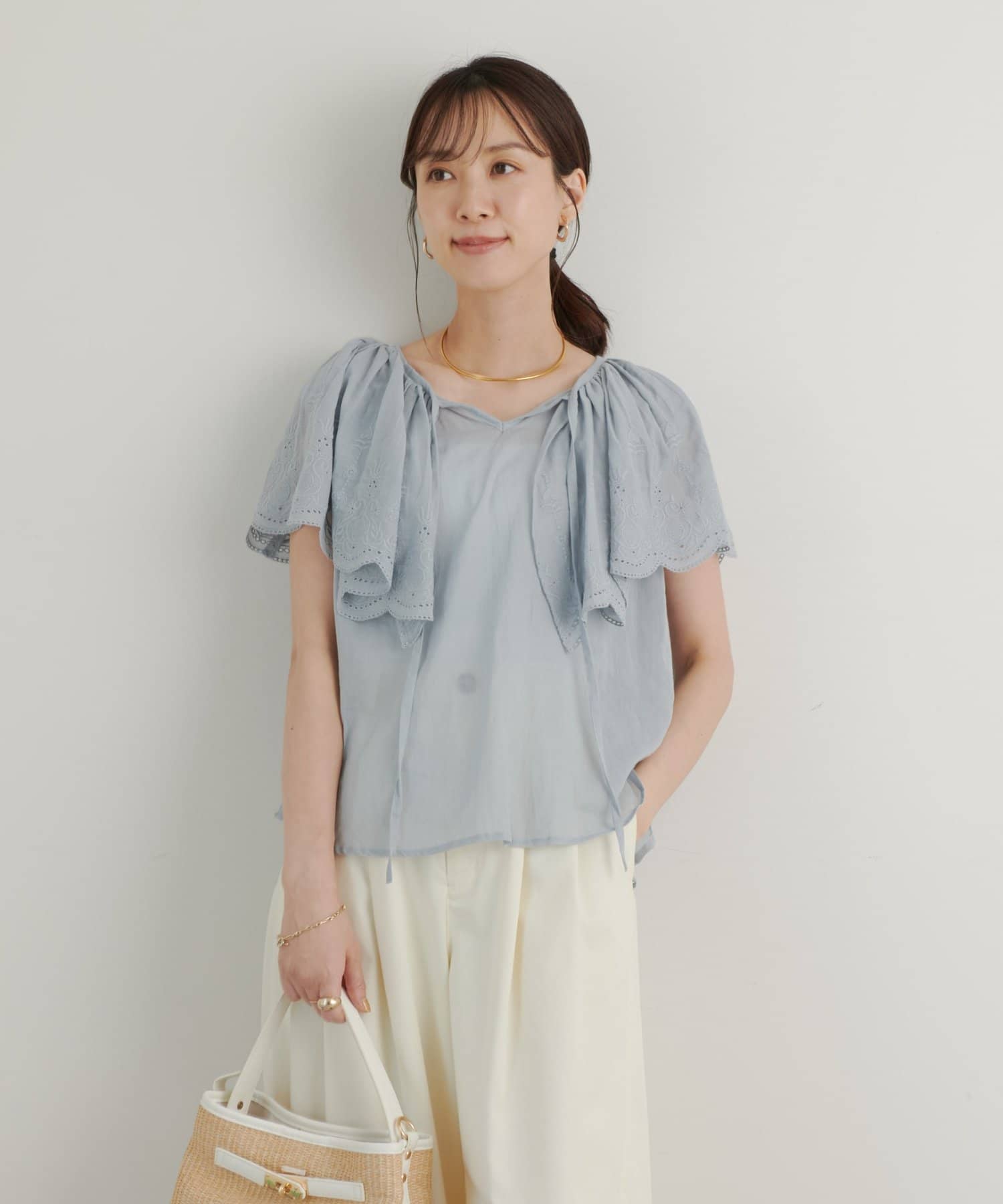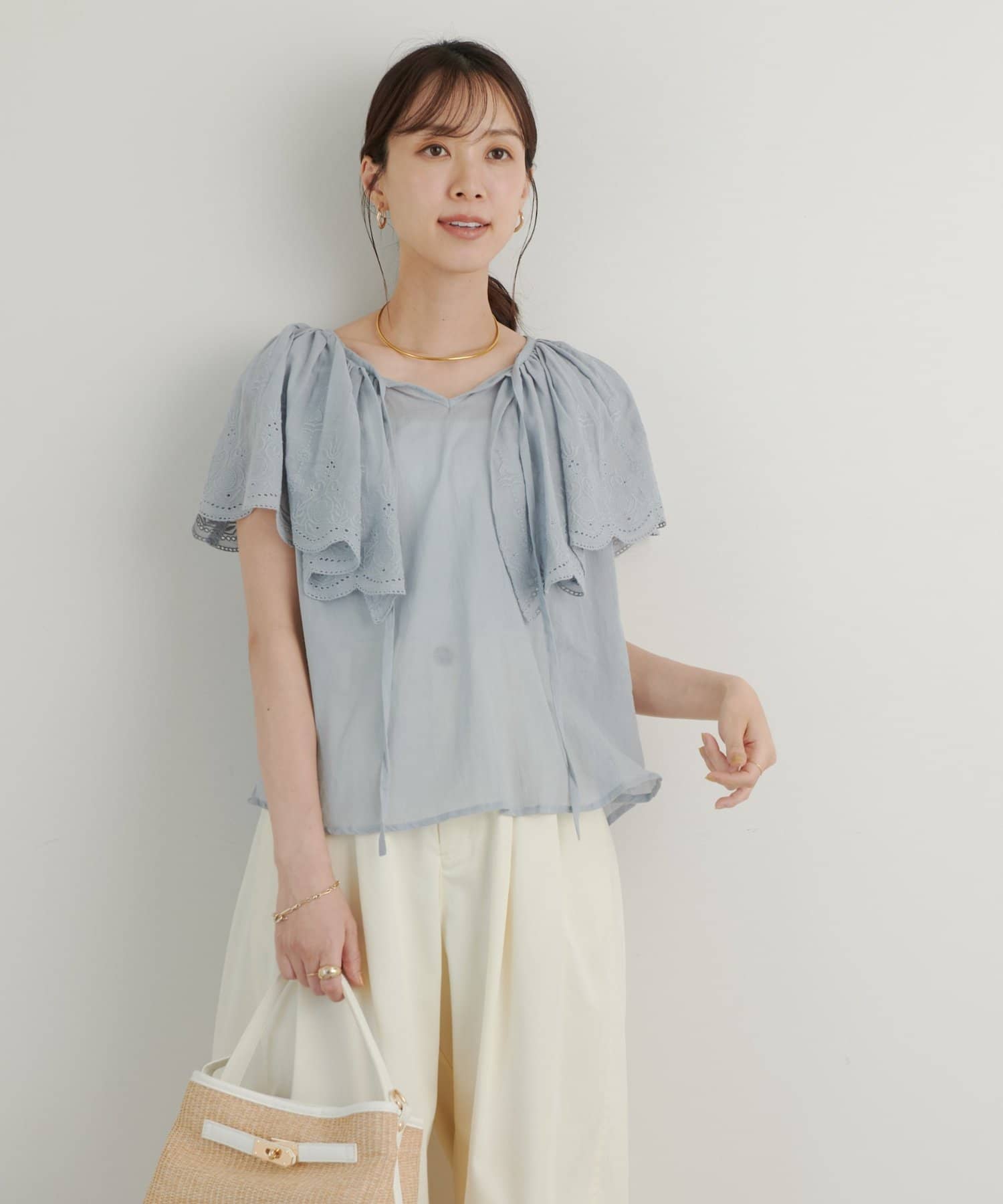 ・襟元が大きめにあいていて抜け感があり、フリルで華やかな女性らしさを演出。