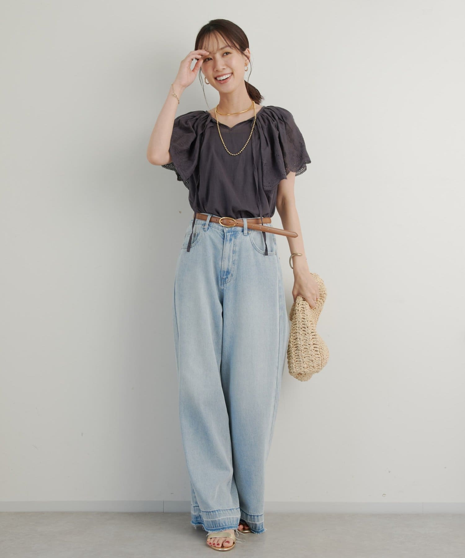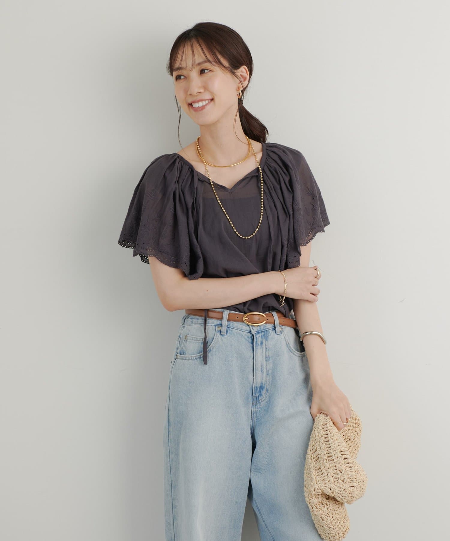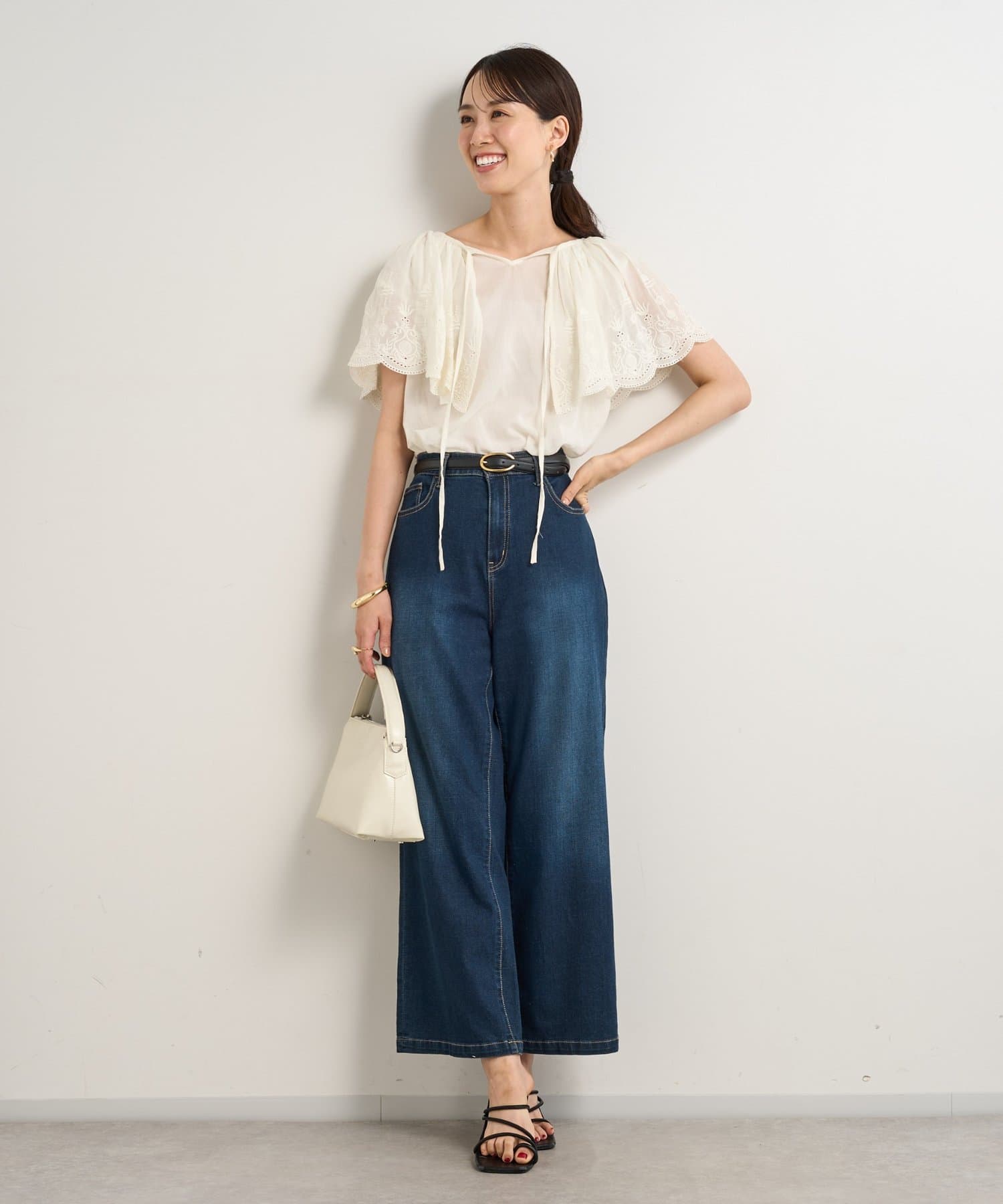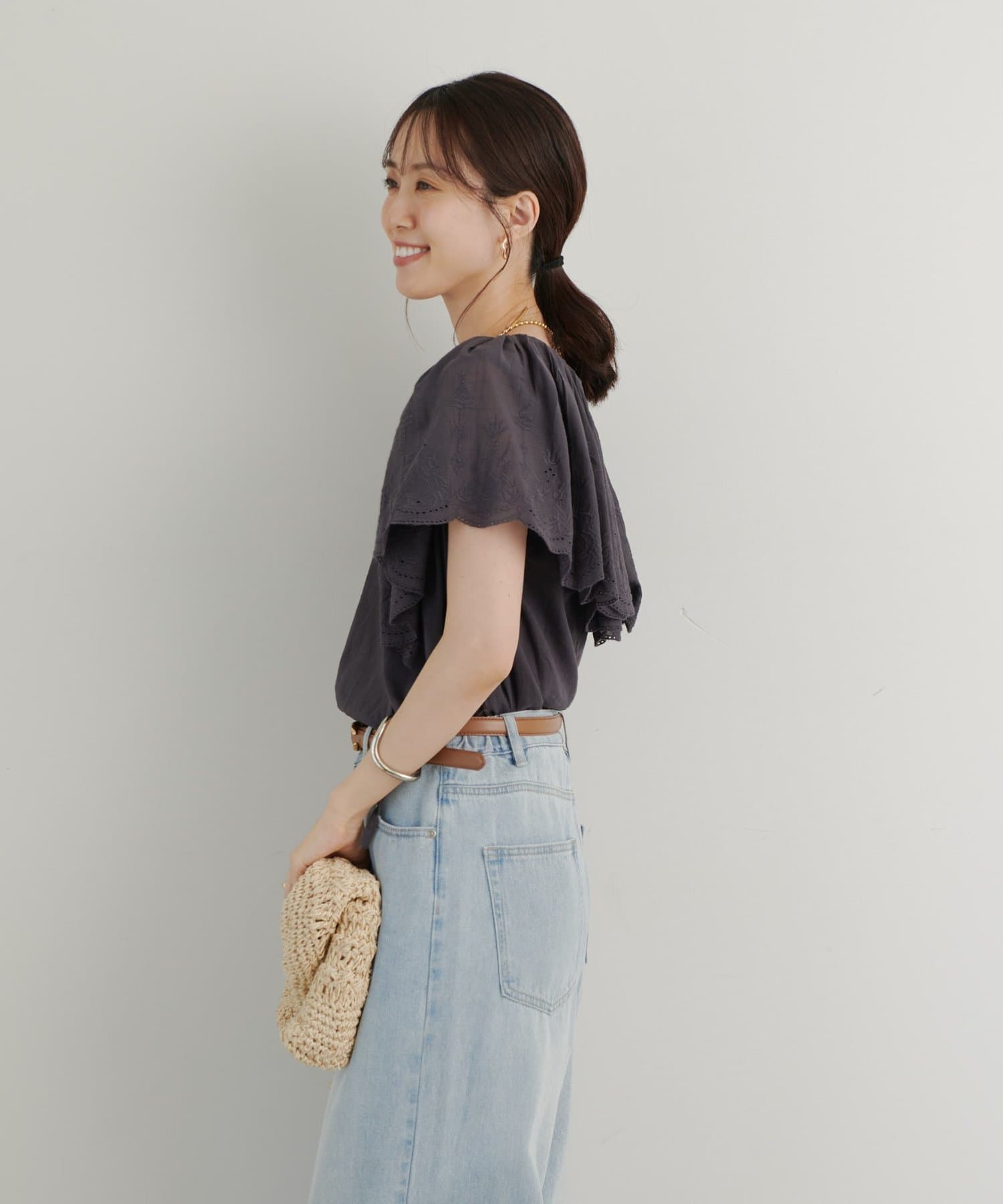 デニムやパンツと合わせても大人可愛く着られます。