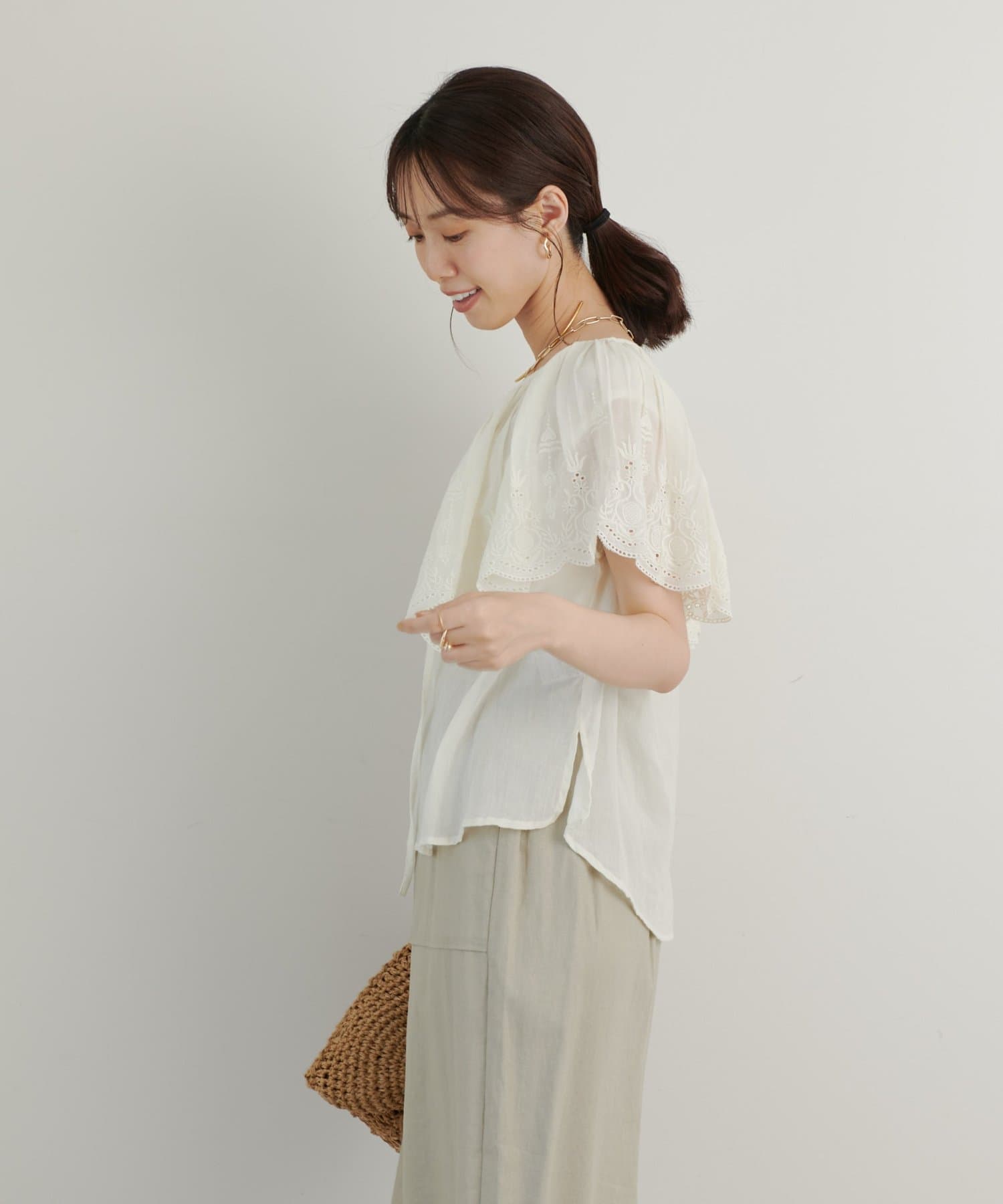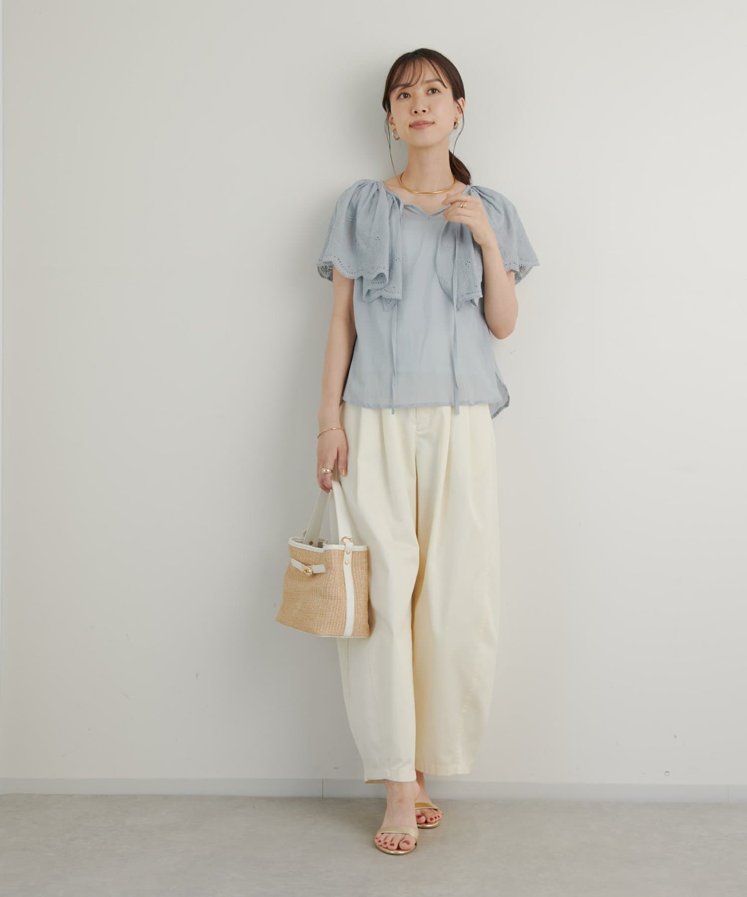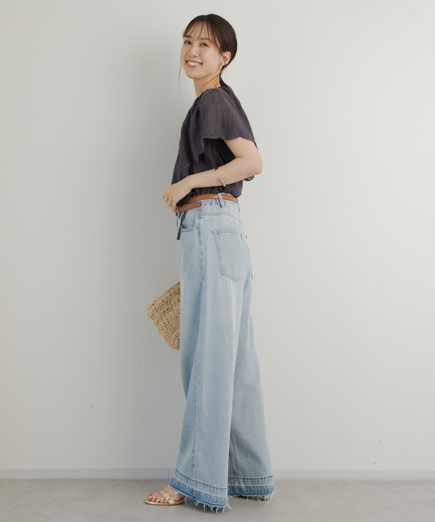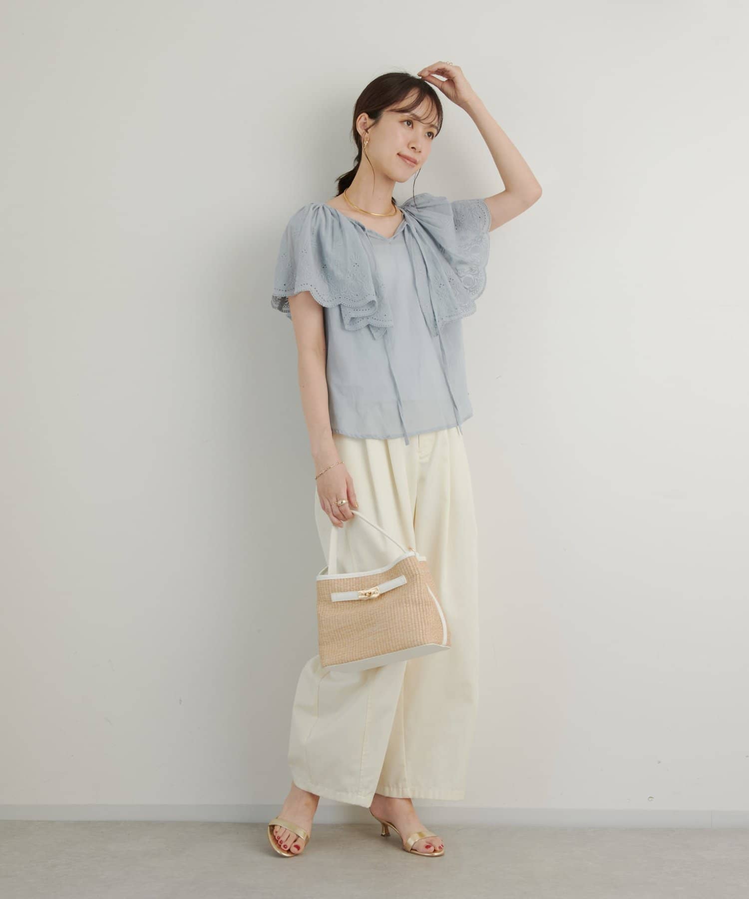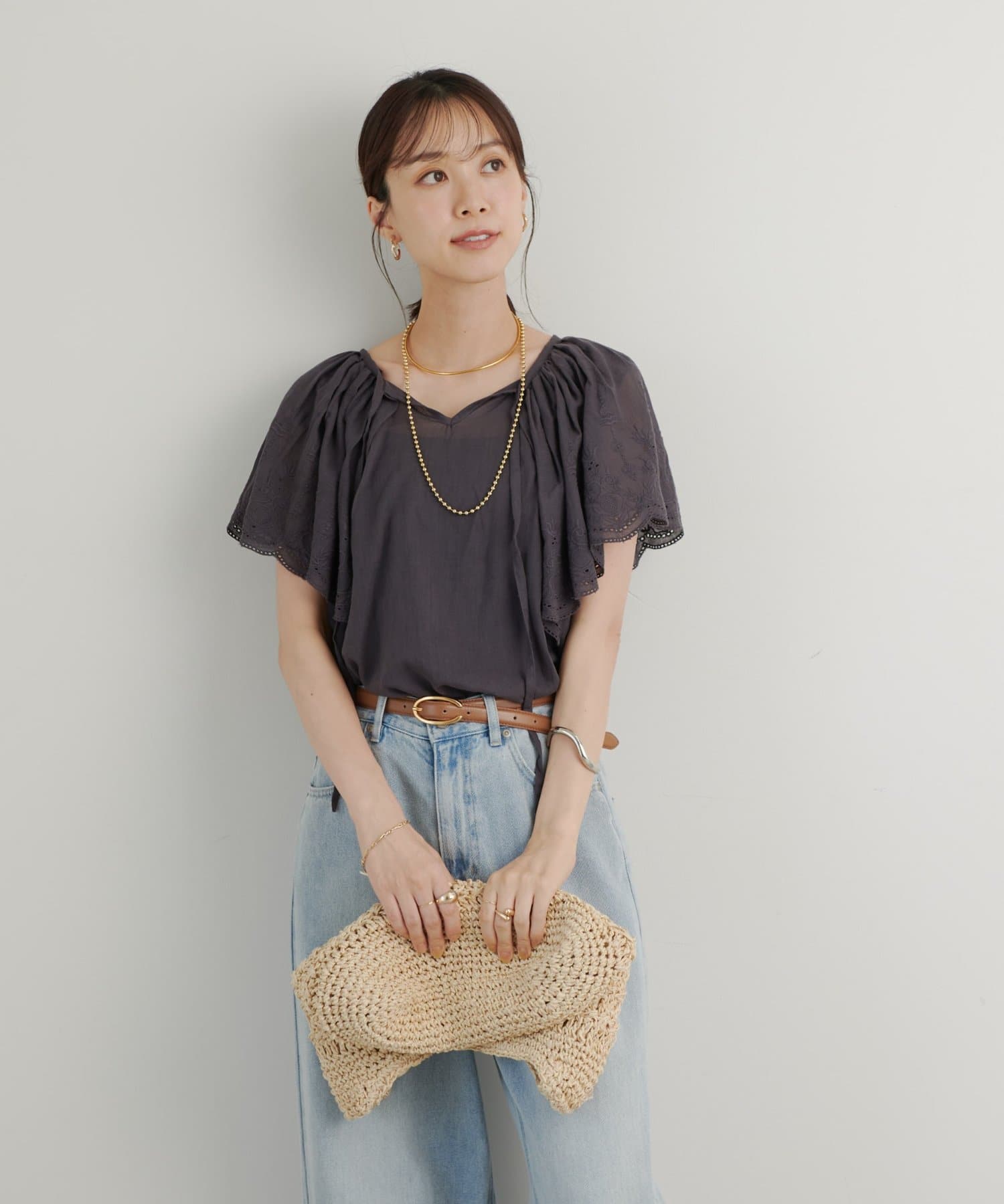 デニムやパンツと合わせても大人可愛く着られます。
