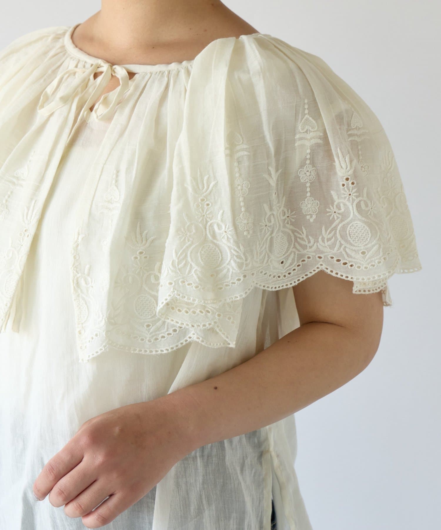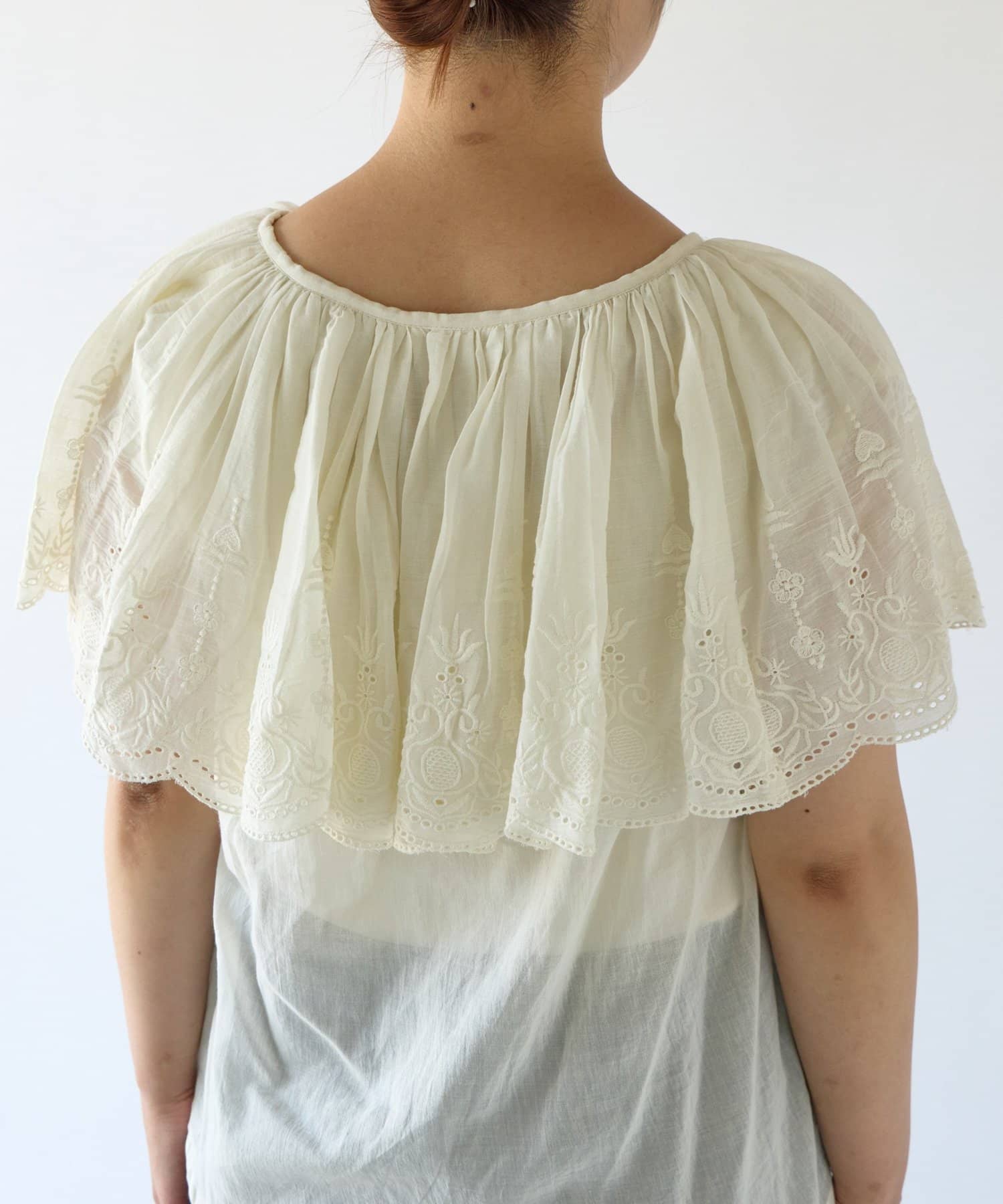 ・ふんわりとしたフリルがケープのようになっているデザイン。