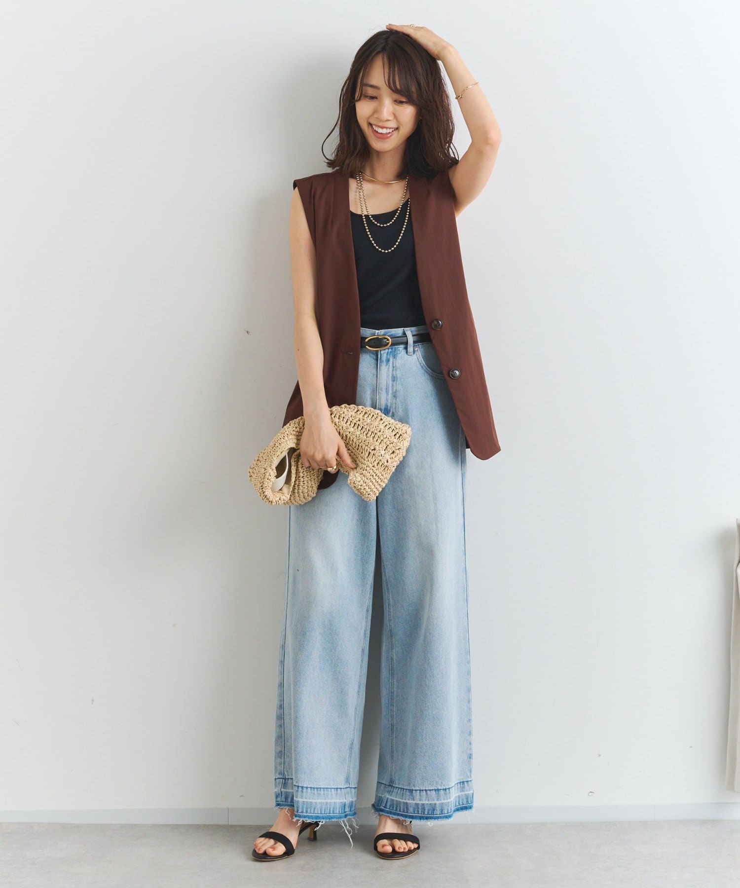 Tシャツとデニムスカートのコーデにプラスすると、こなれ感のある大人カジュアルな印象に。