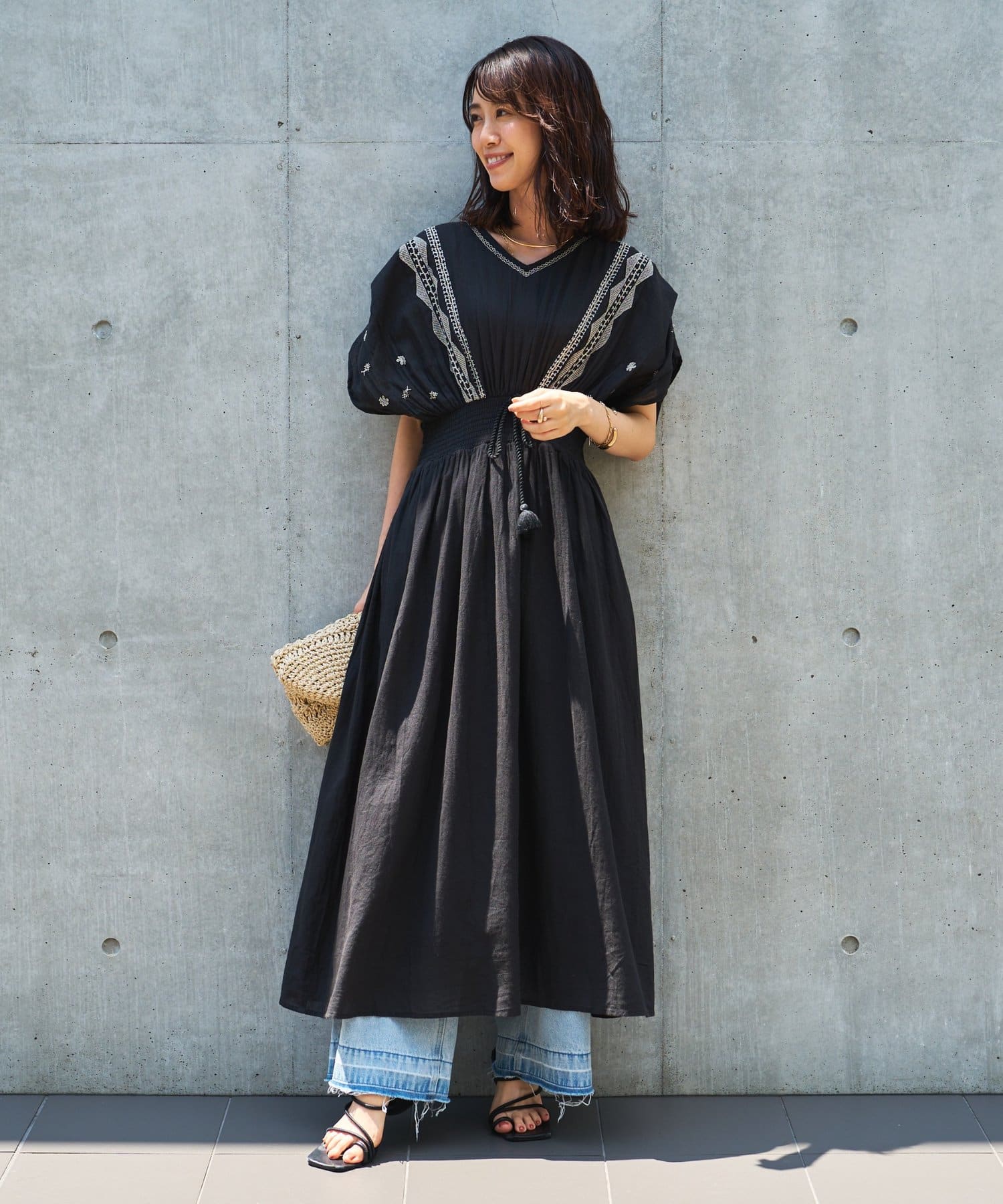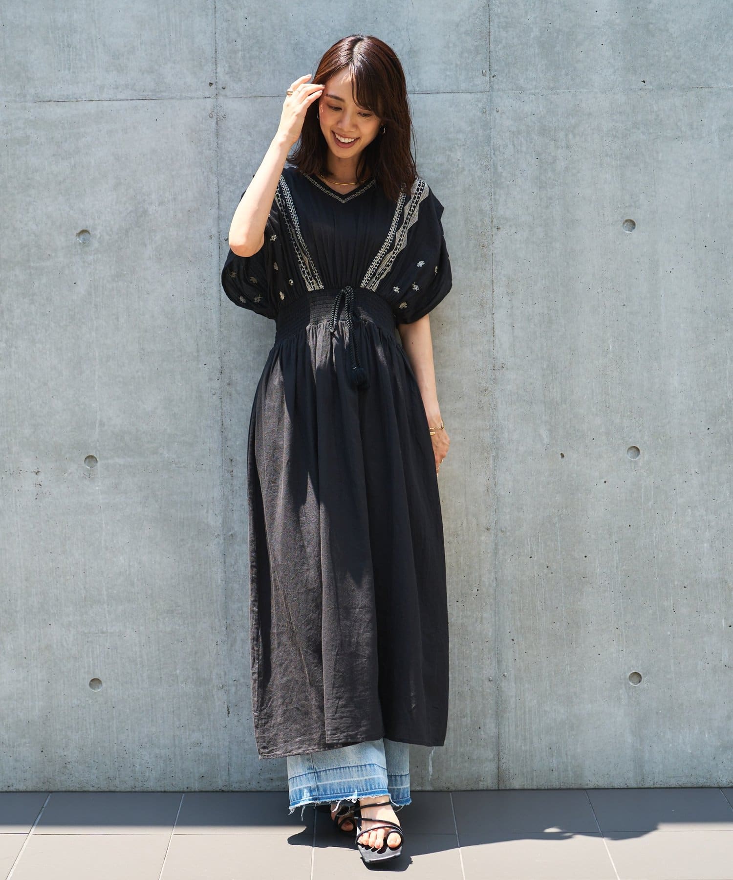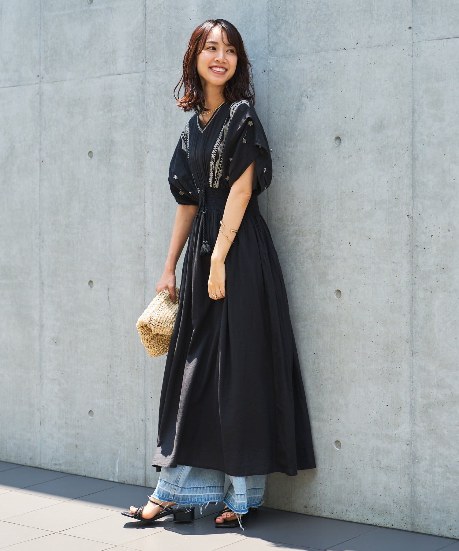 存在感のあるワンピースなので、これ1枚でおしゃれなスタイリングに決まります◎