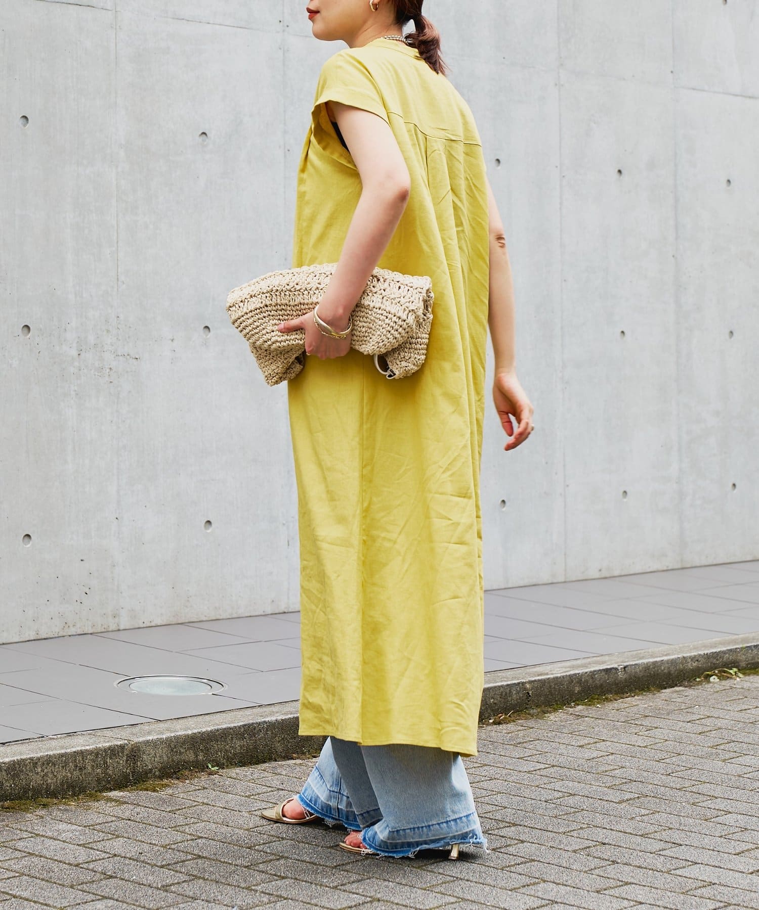 イエローはトレンド感のあるカラーリングで、これ1枚で目を惹くコーディネイトに。こちらも生地の素材感によって奇抜すぎない風合いになっているのでおすすめです◎