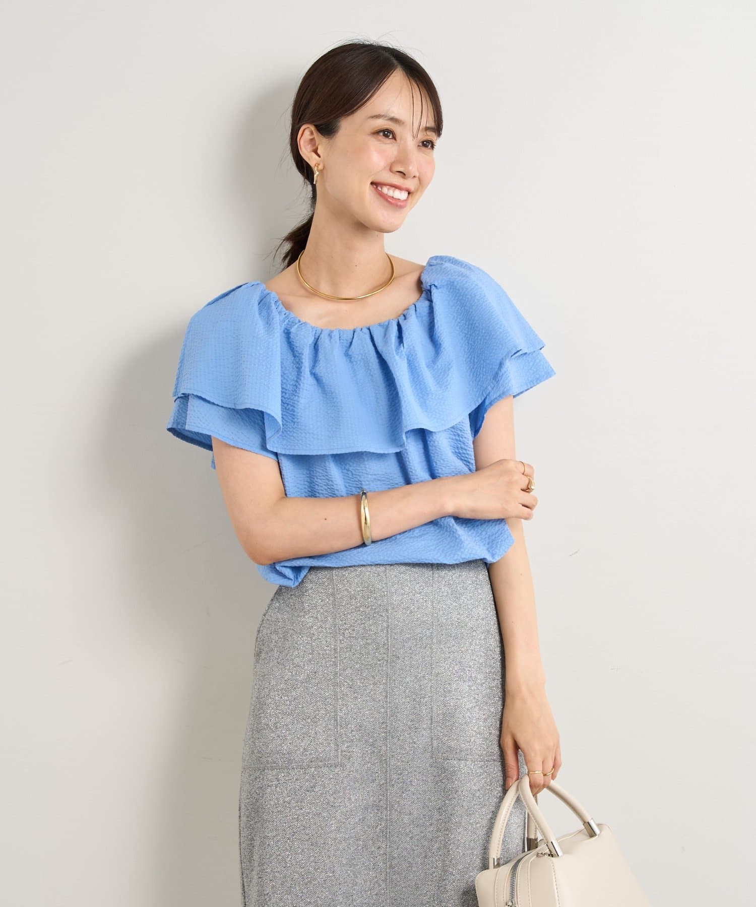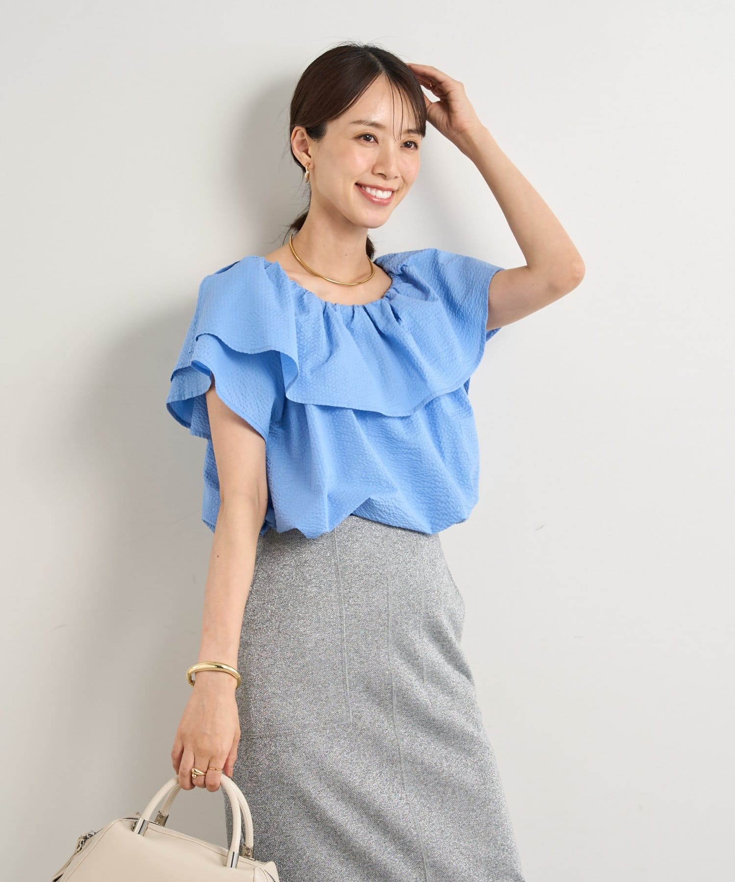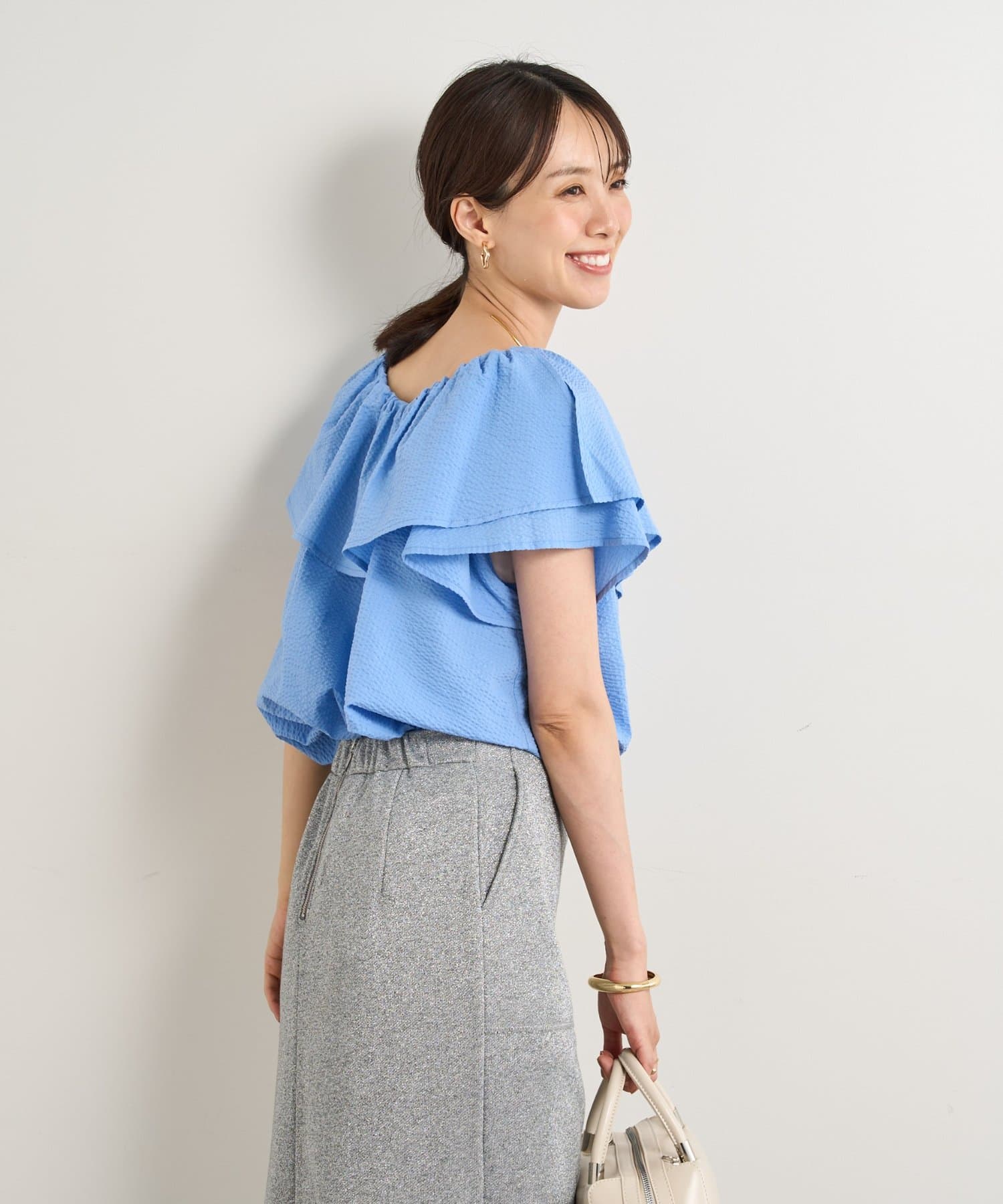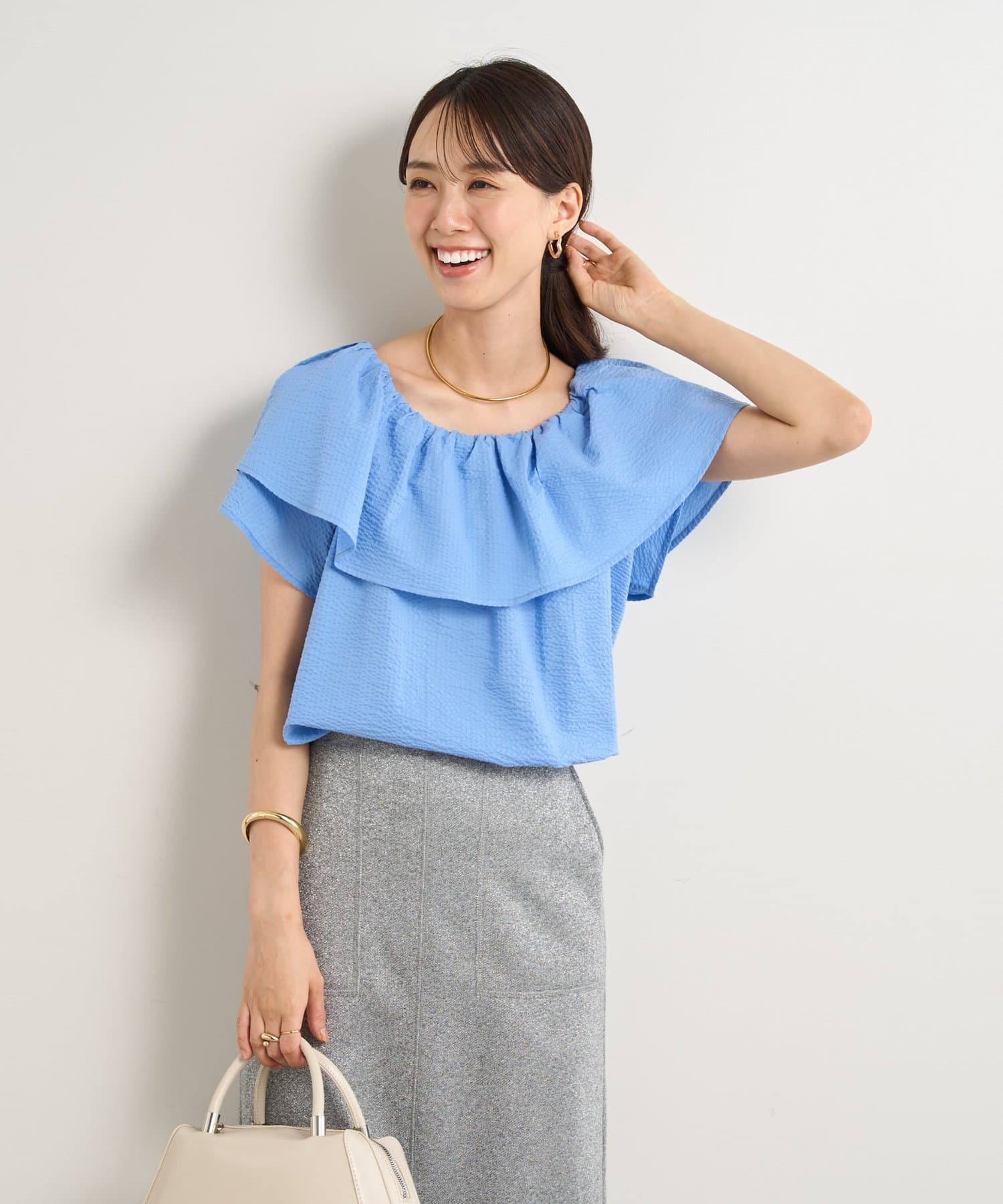 通常に着用するときも、オフショルとして着用するときも、フリルデザインによってさりげなく二の腕カバーが叶います。
