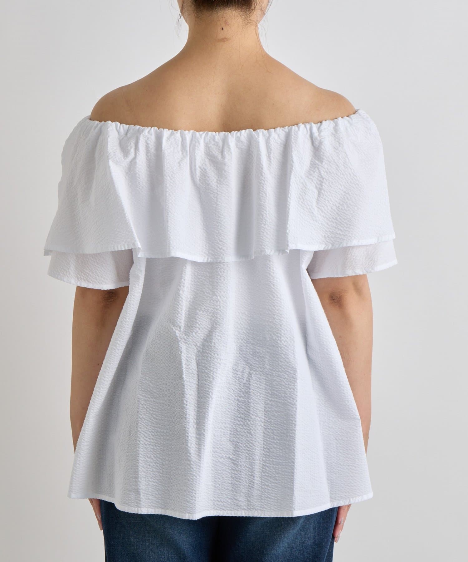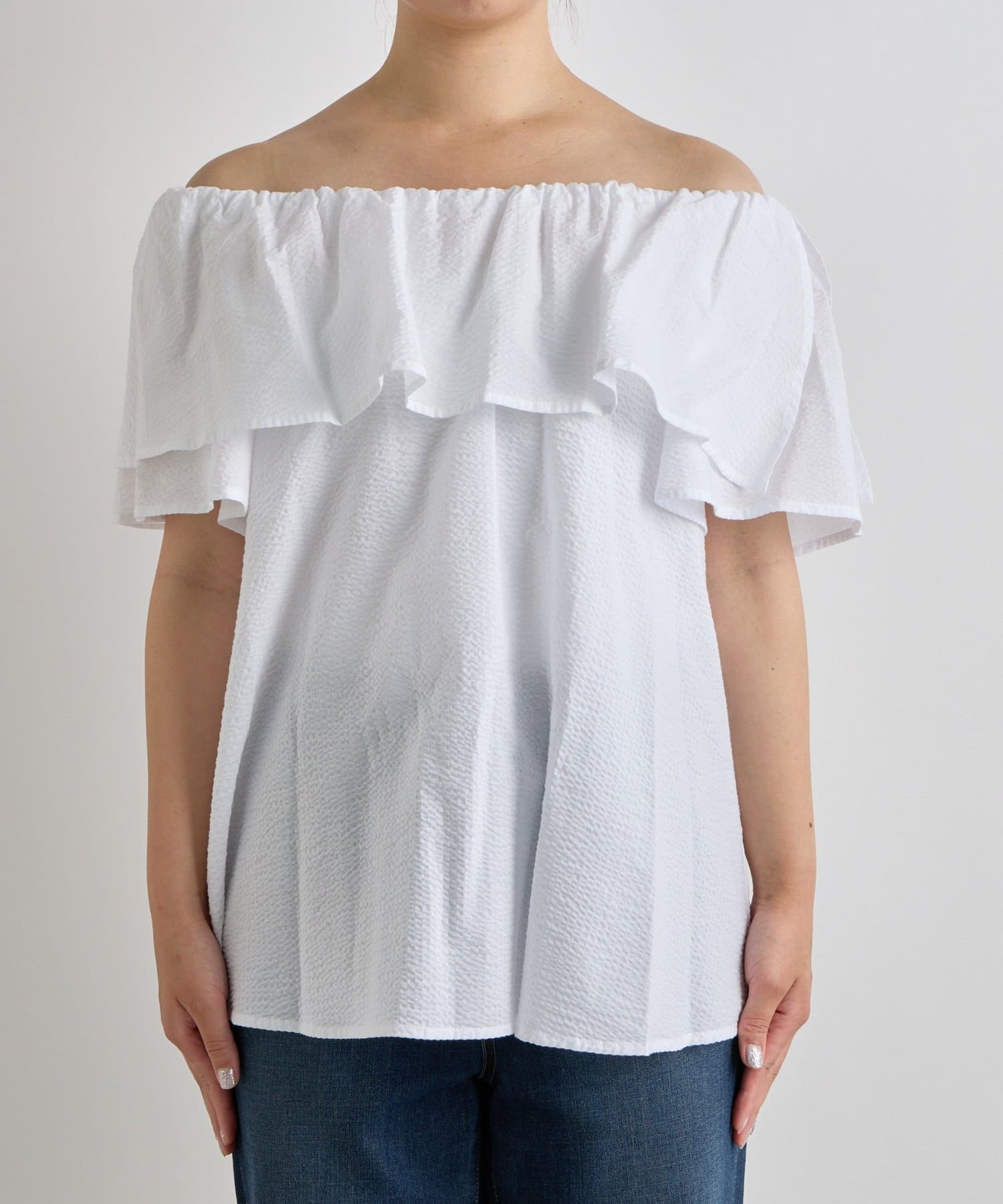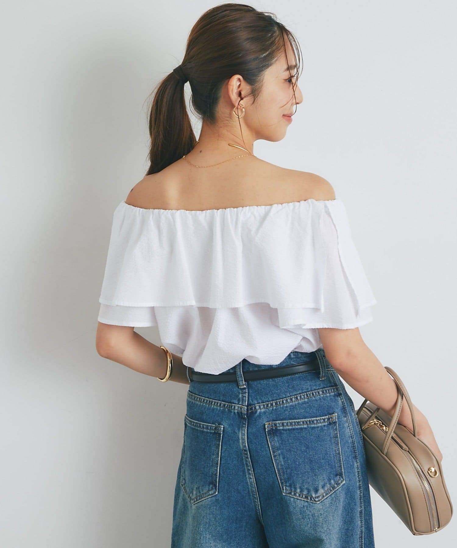 《綿100%・上品な肌見せ◎》オフショルフリルブラウス