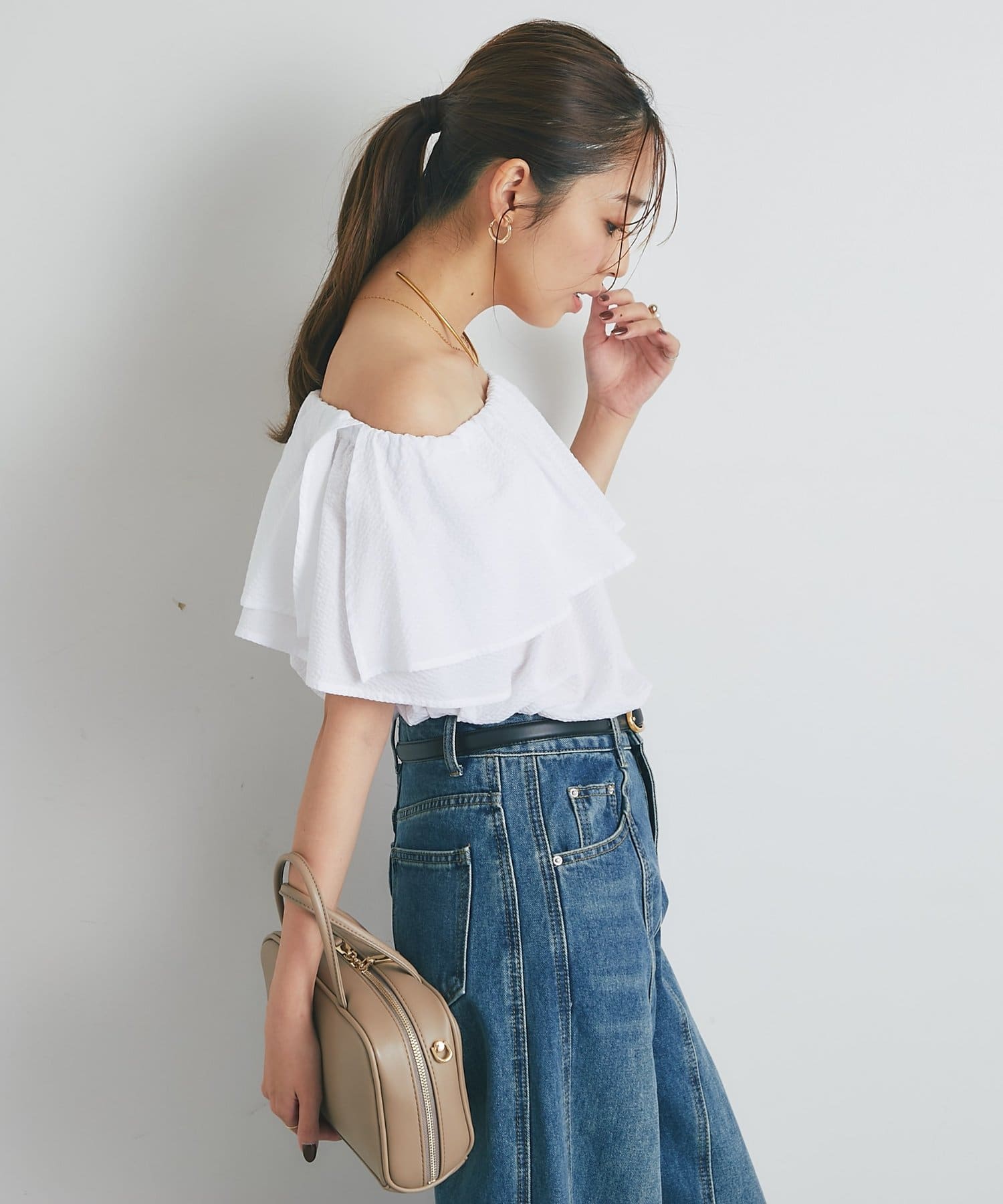 オフショルダーとして着用すれば、デコルテを美しく魅せ、より甘さのある雰囲気に。