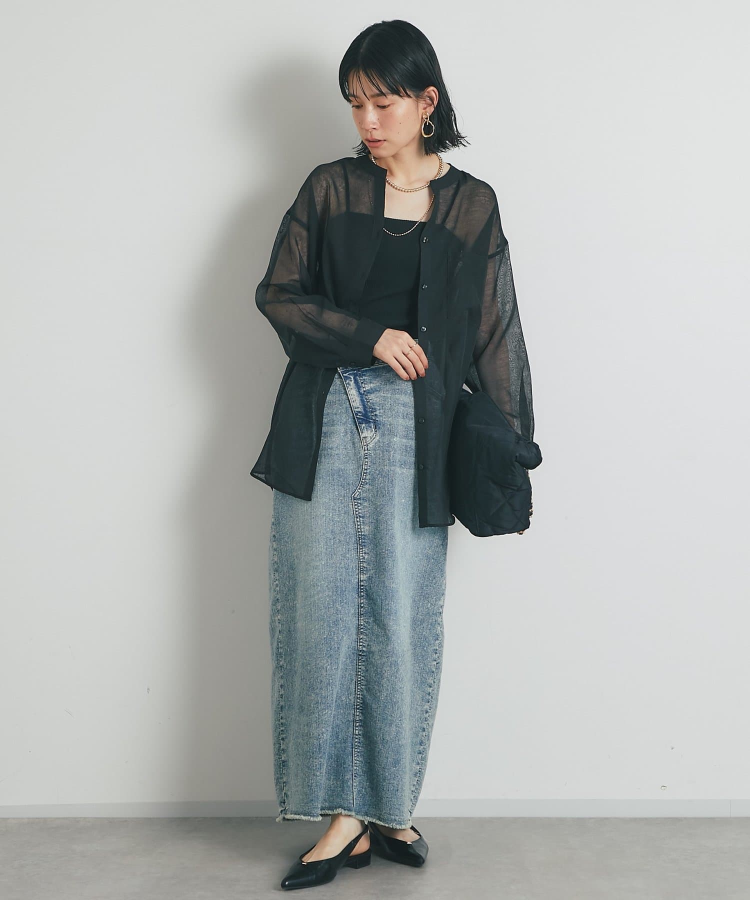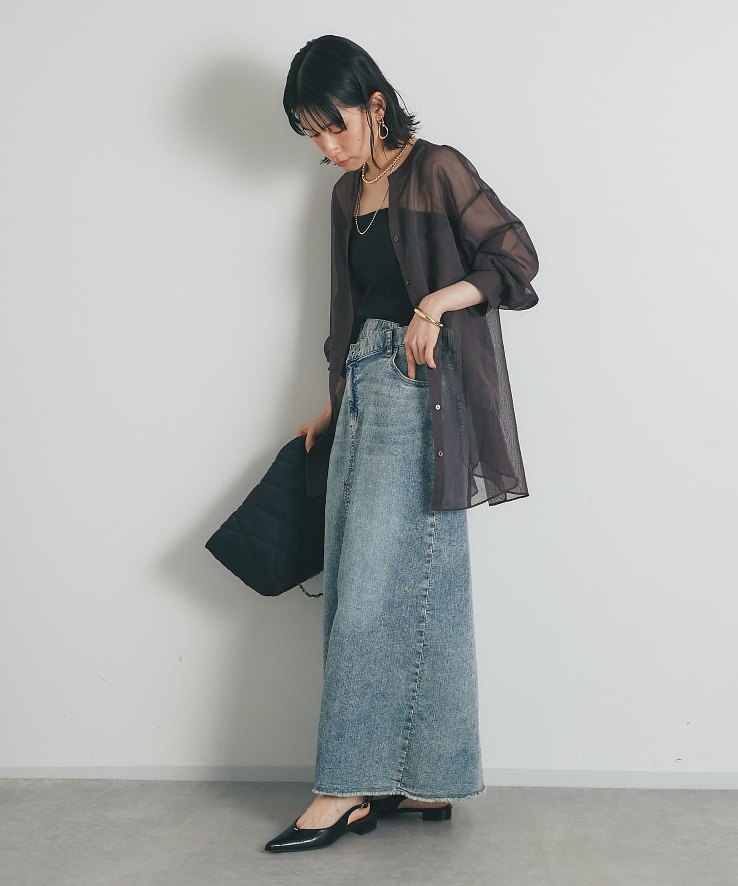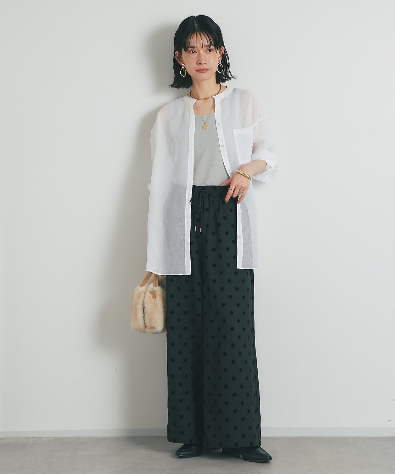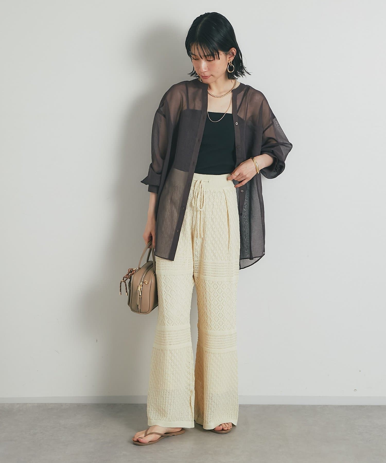 透け感のある素材なので、ノースリーブのカットソーやシンプルなキャミソールと合わせるのがおすすめです◎