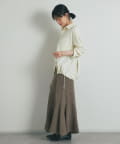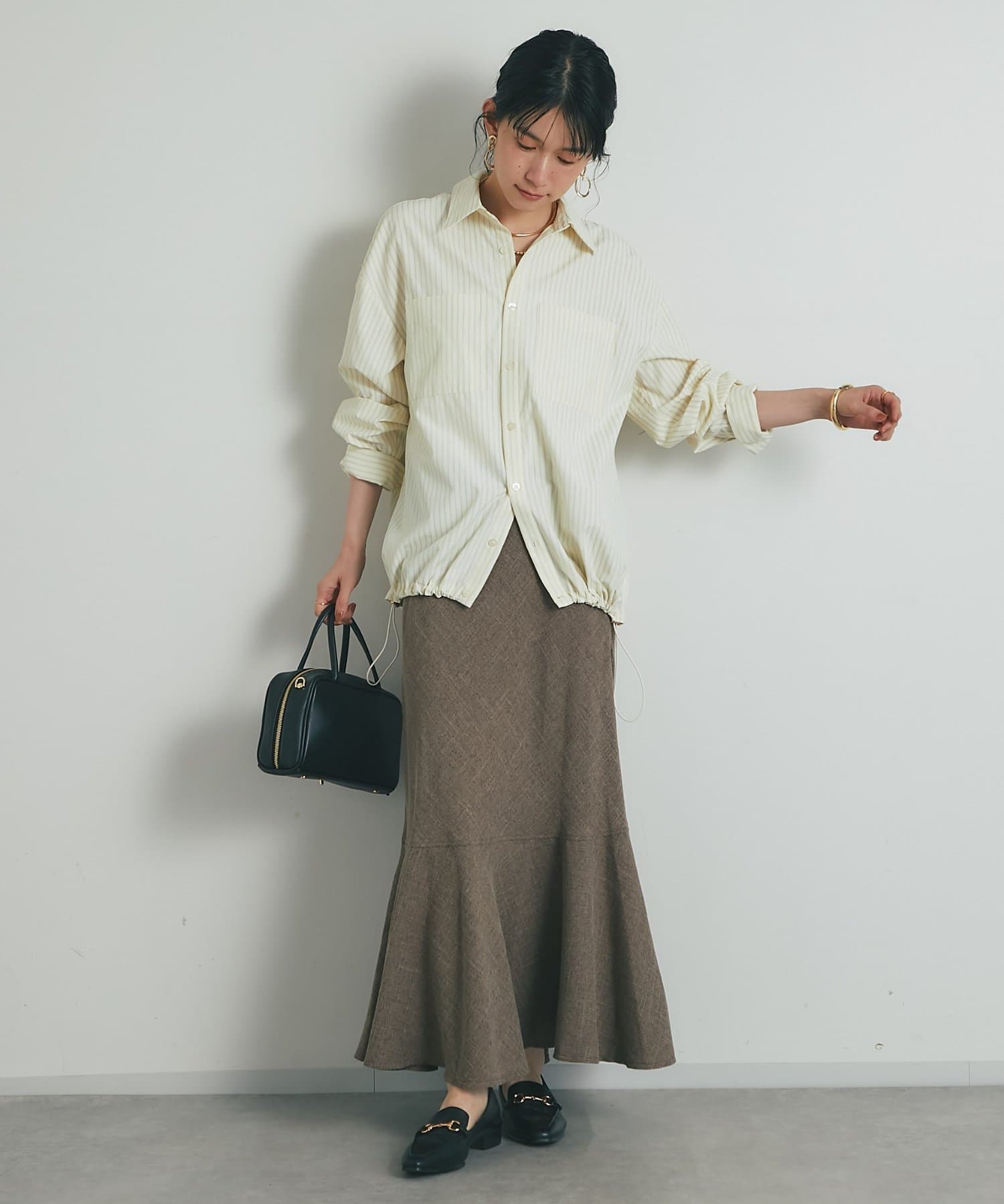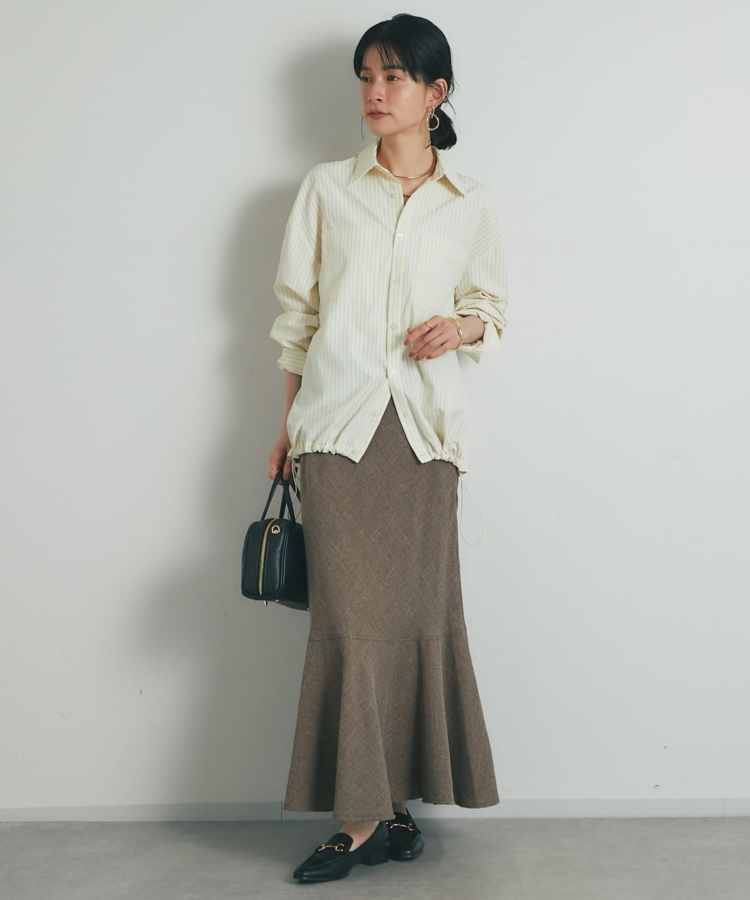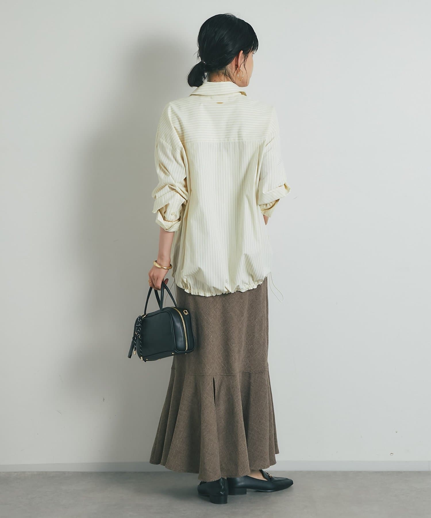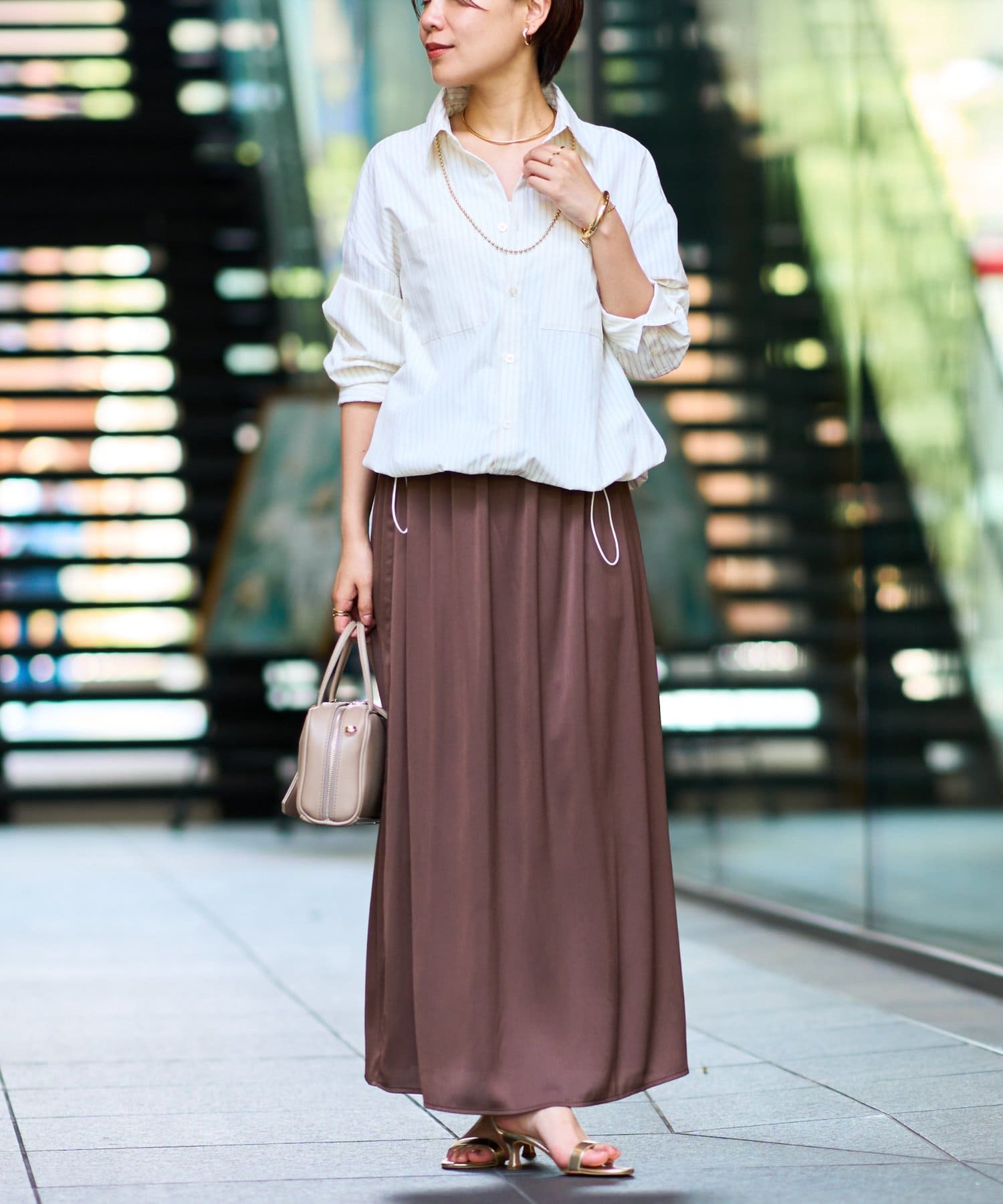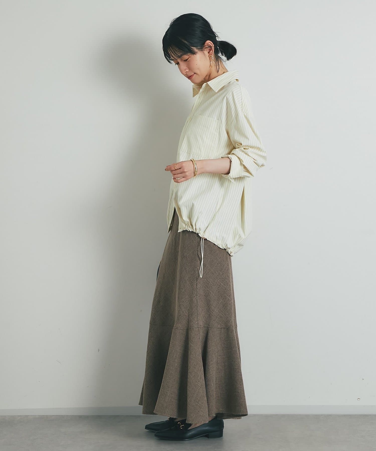 裾ドロストを少し絞ってフレアスカートに合わせれば女性らしい甘さのある雰囲気になり、お出かけシーンにぴったりなコーデに。