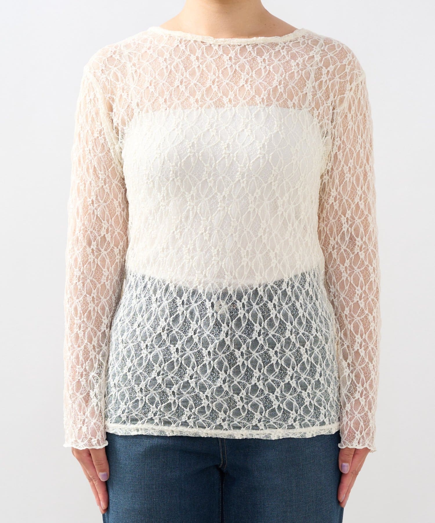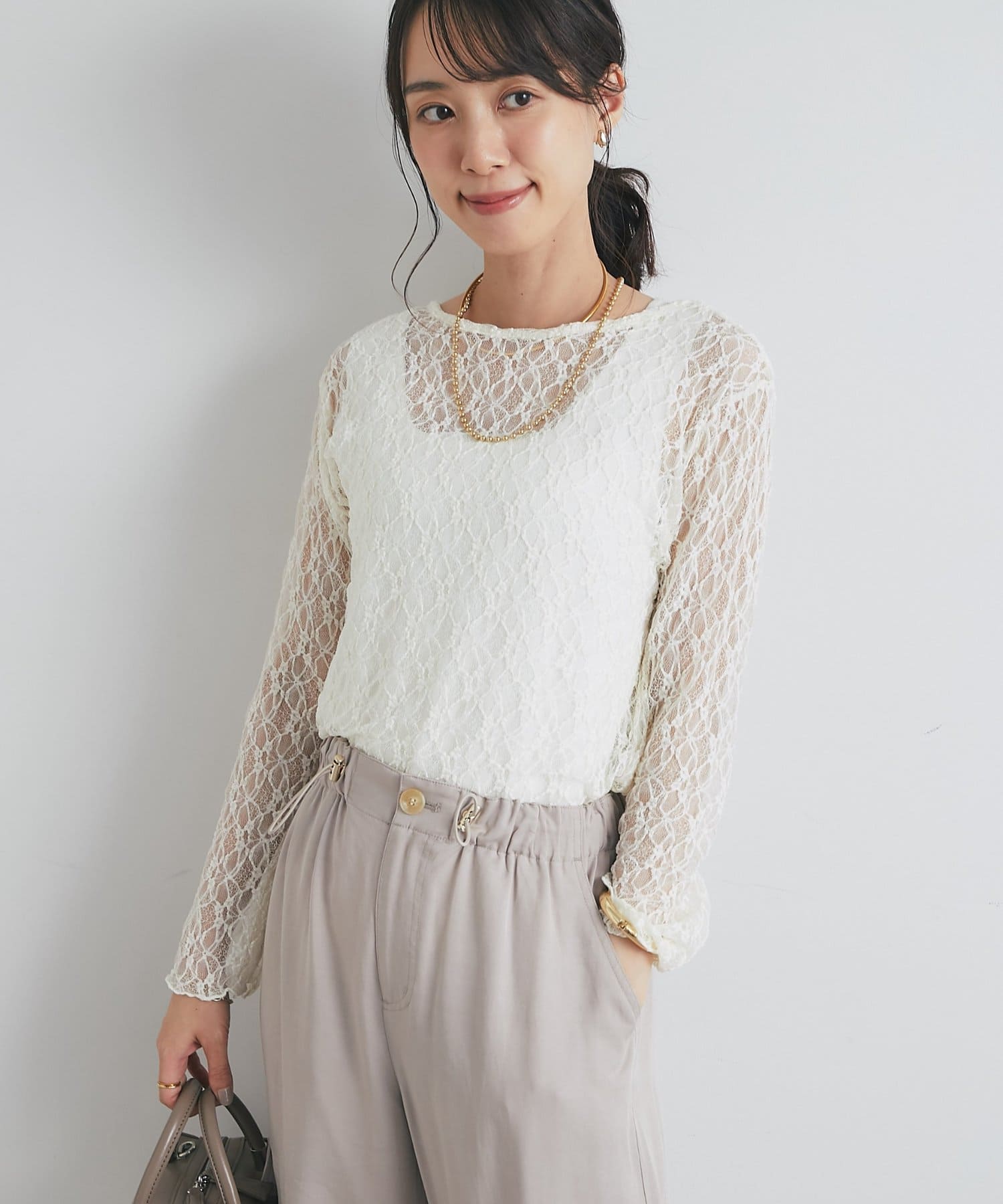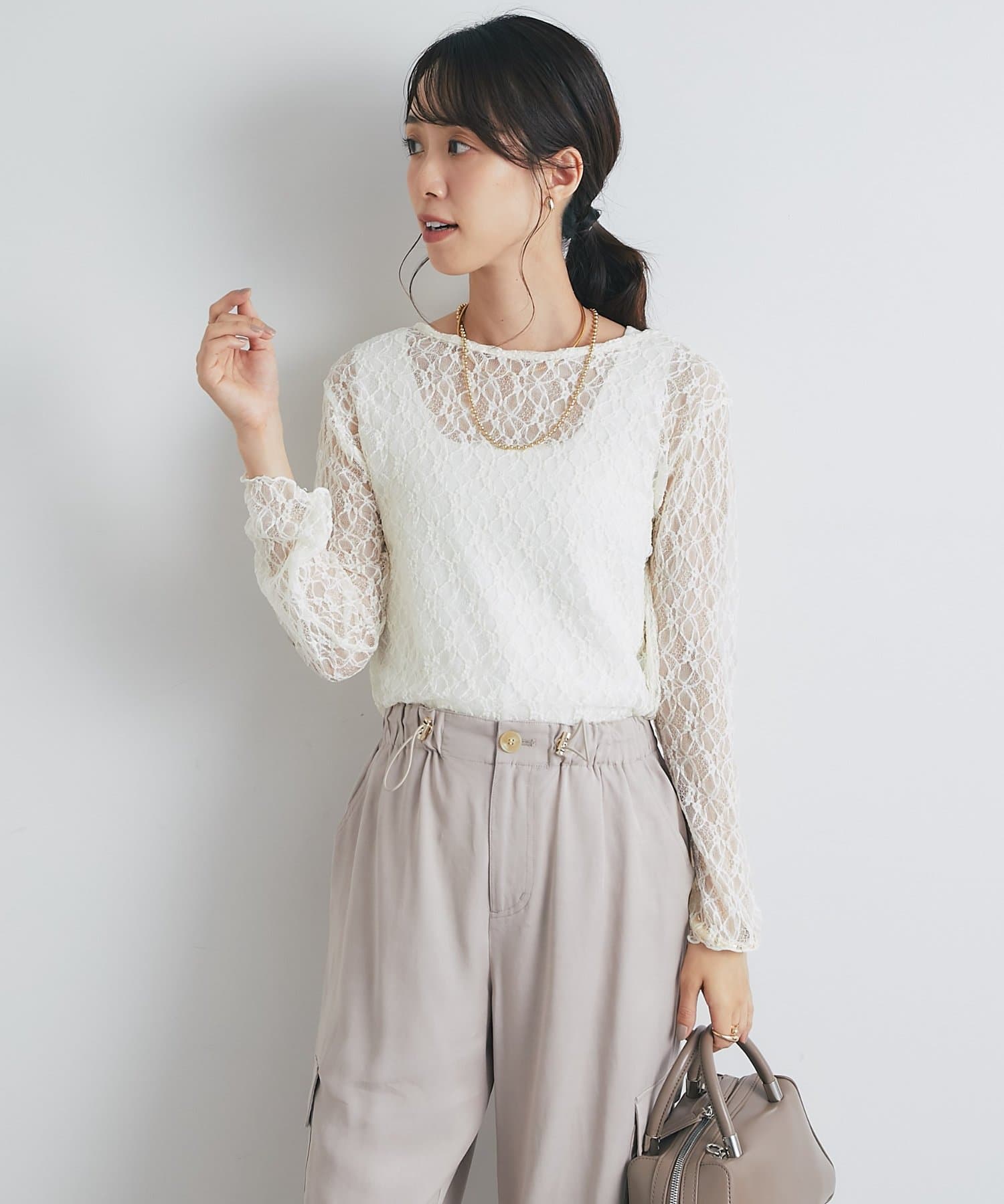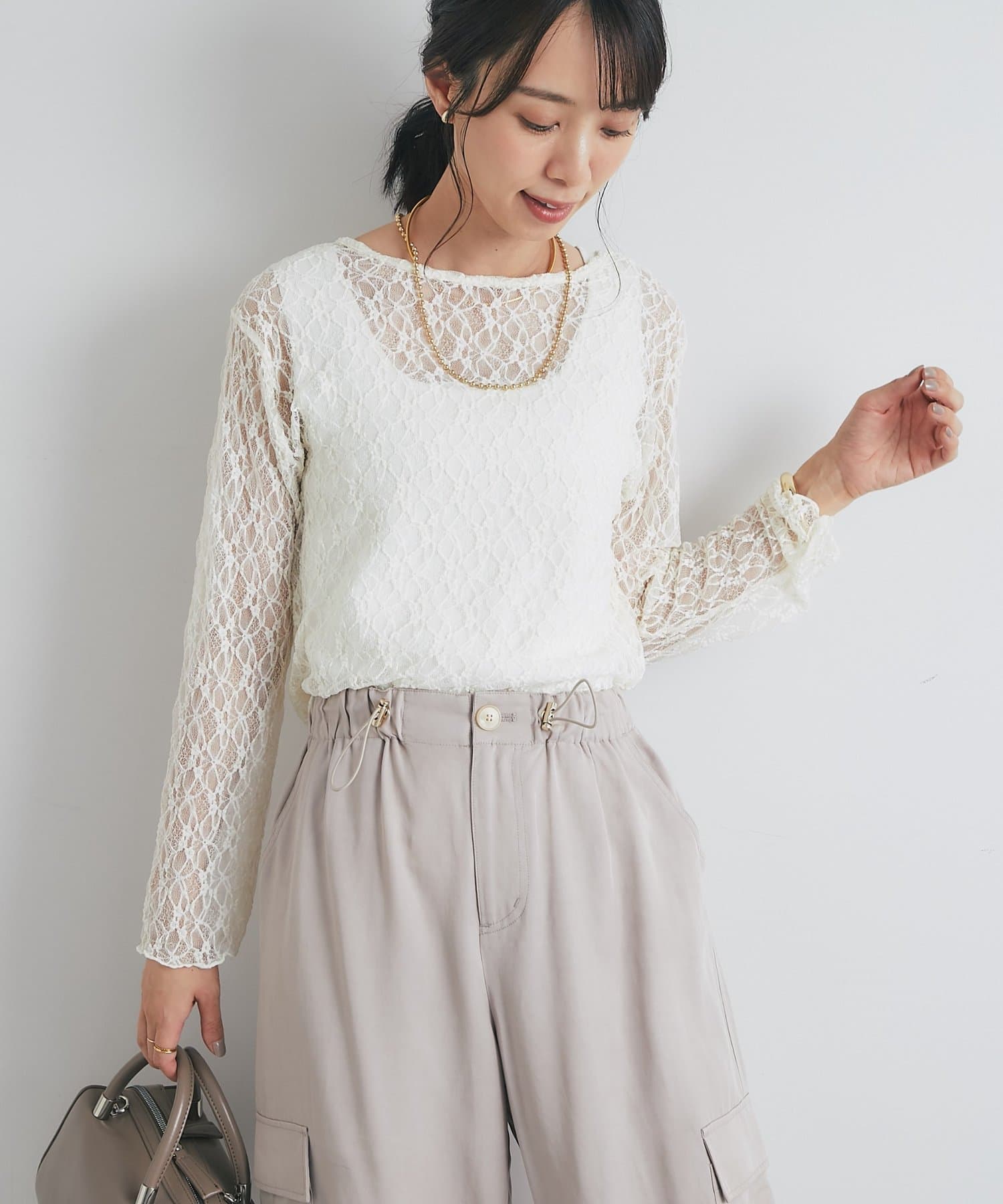 インナーにキャミソールやタンクトップを合わせて、レースの透け感を楽しむレイヤードスタイルがおすすめです。