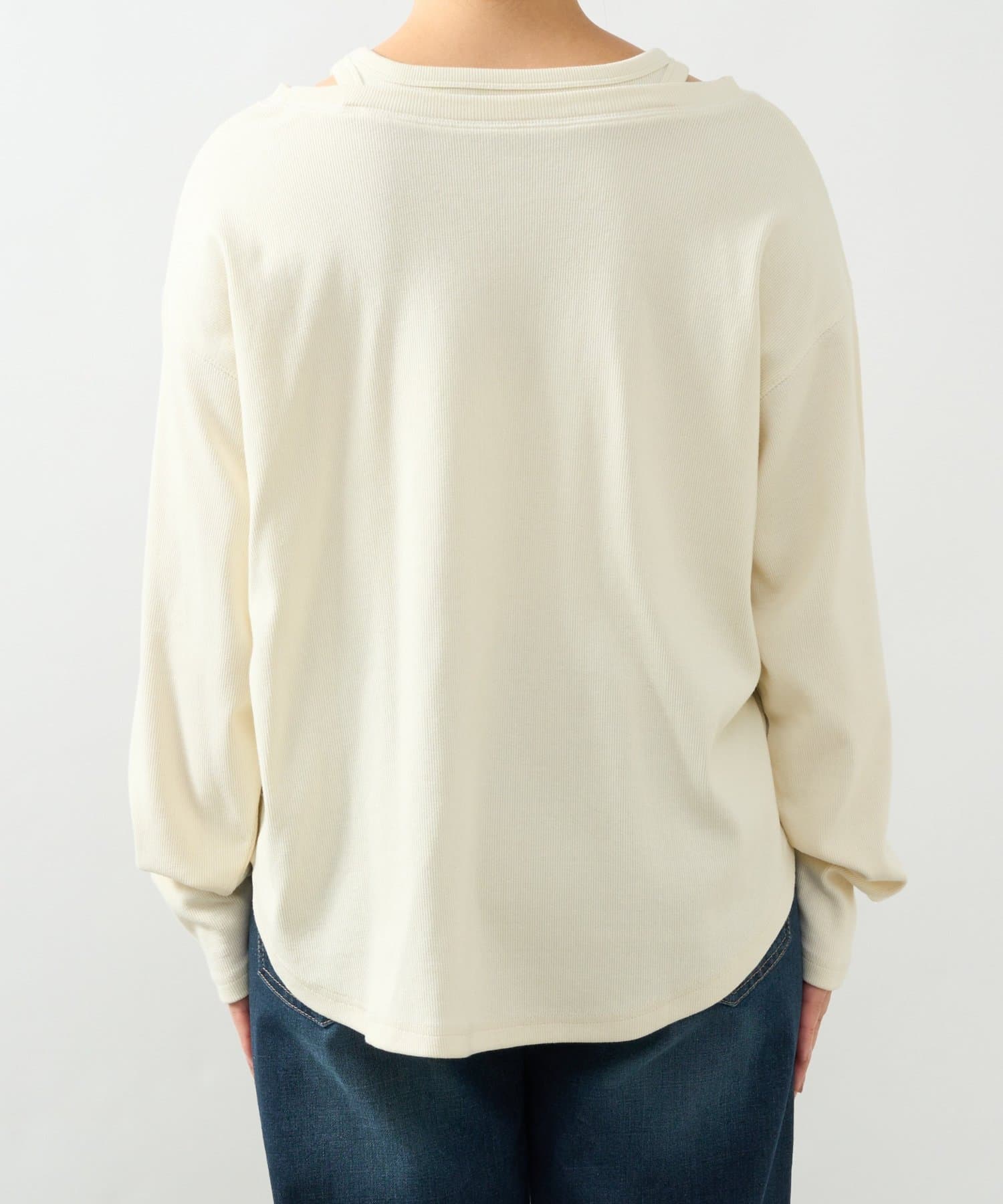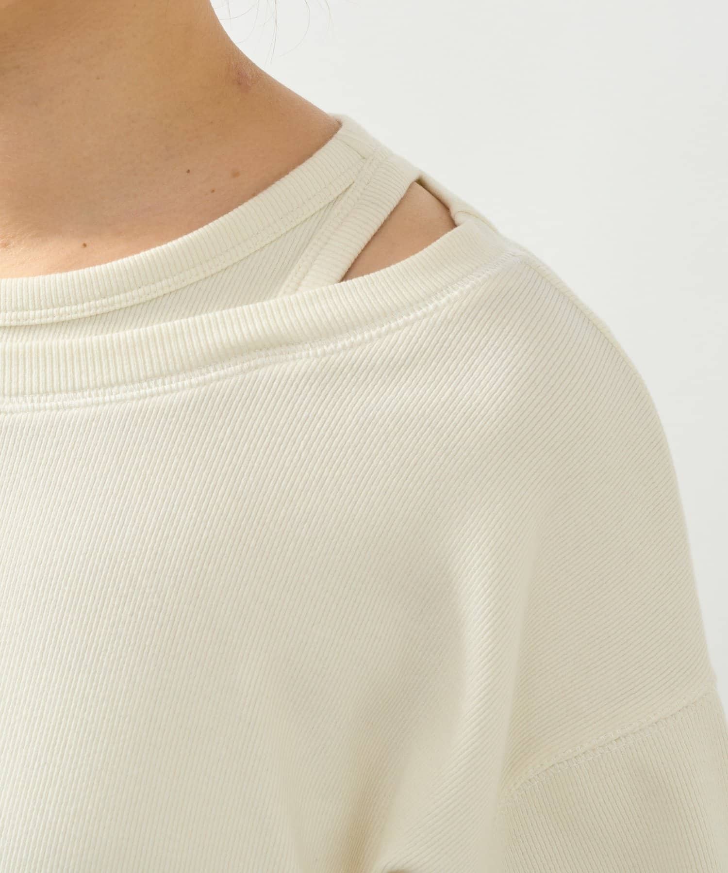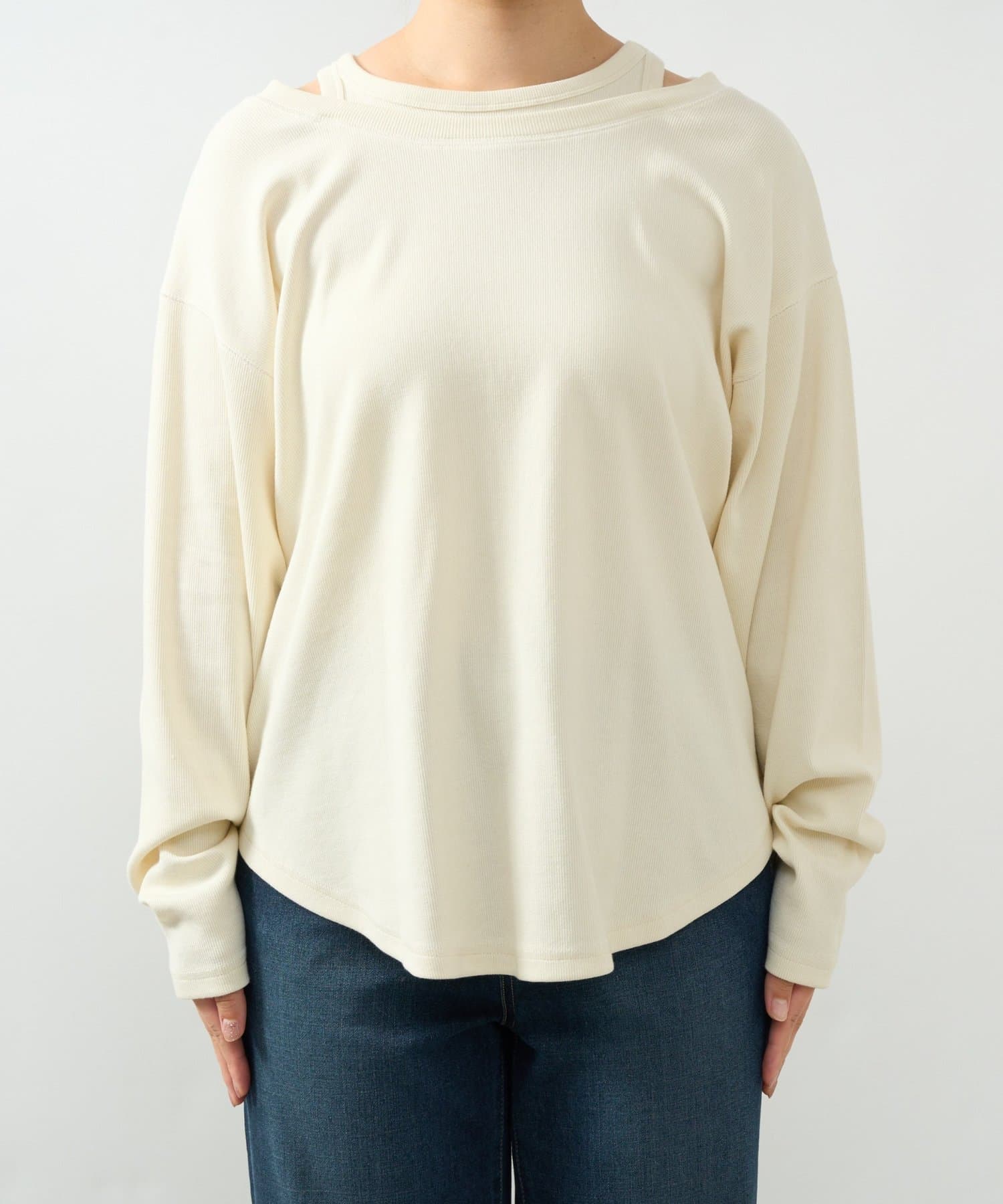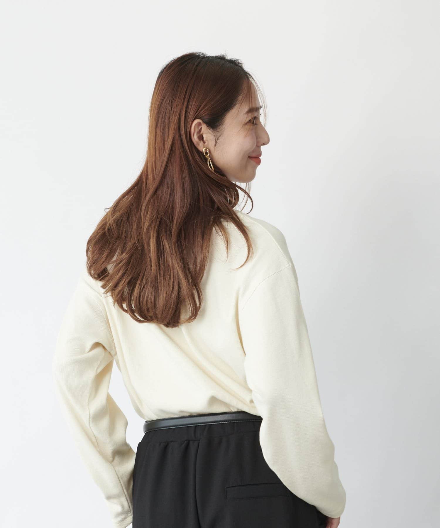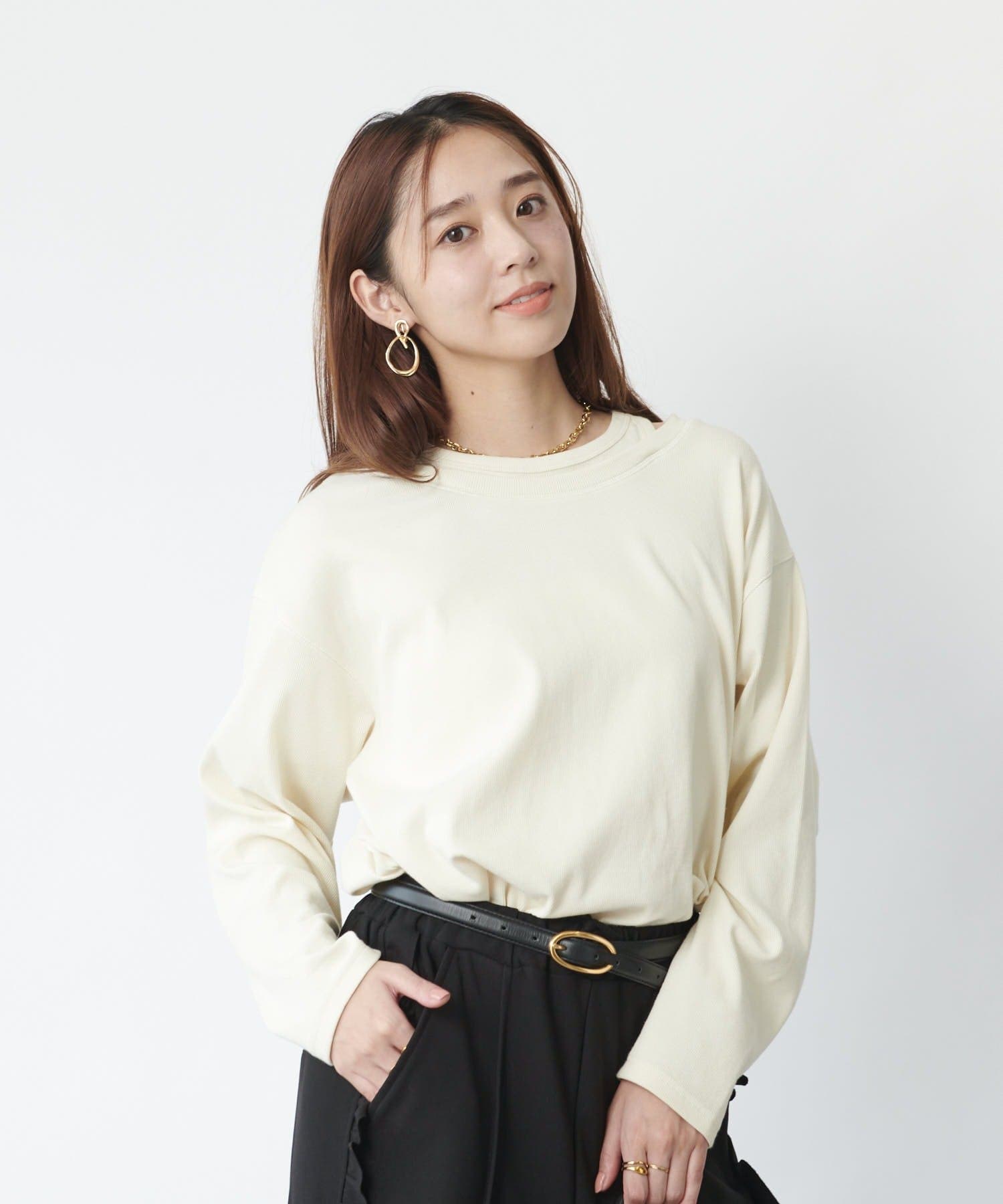 ・鎖骨を綺麗に見せるオフショルダー風デザインに仕上げられ、抜け感のあるスタイリングにまとめてくれます。