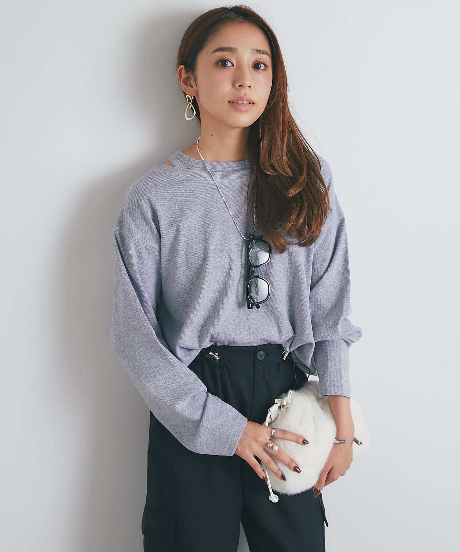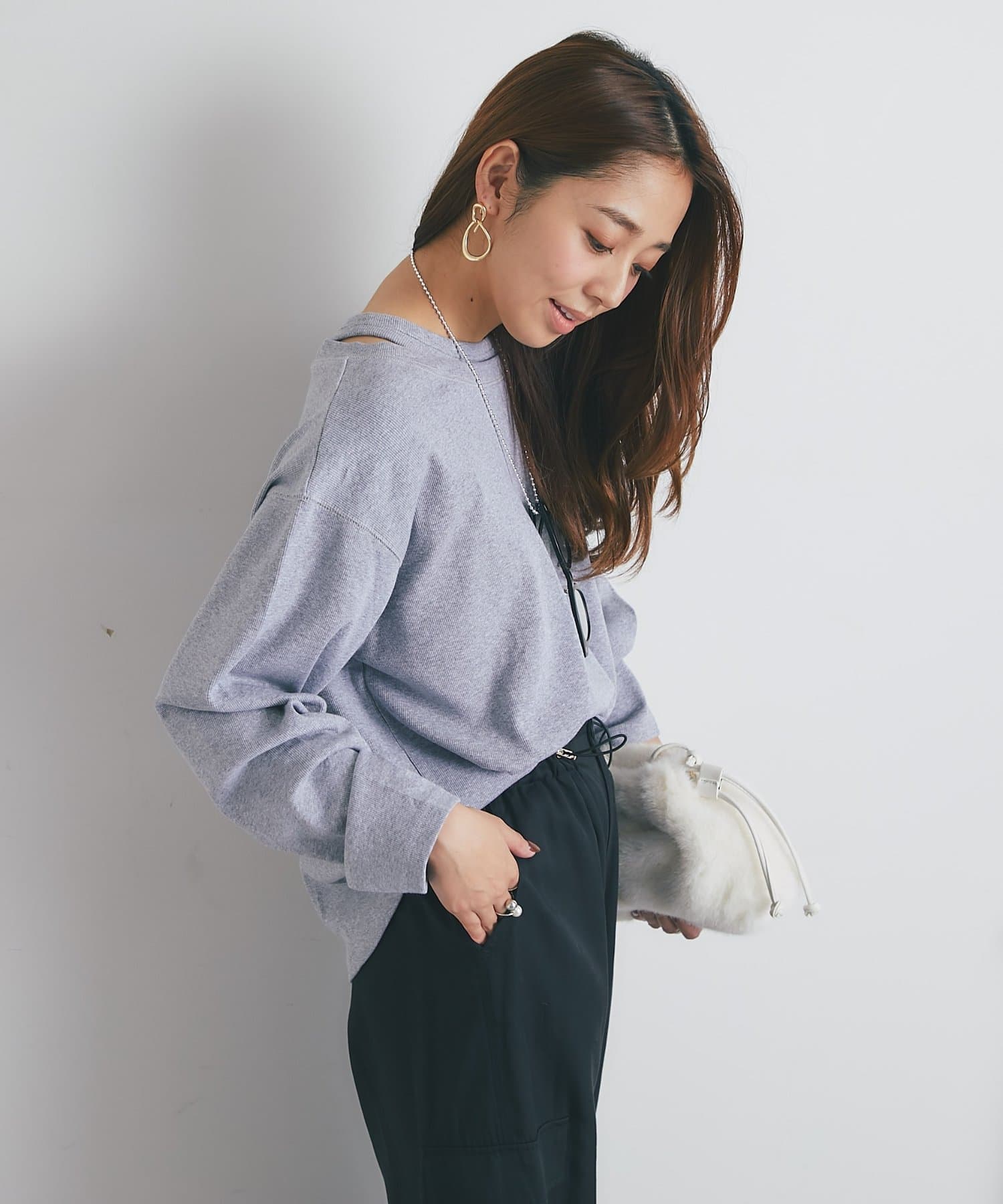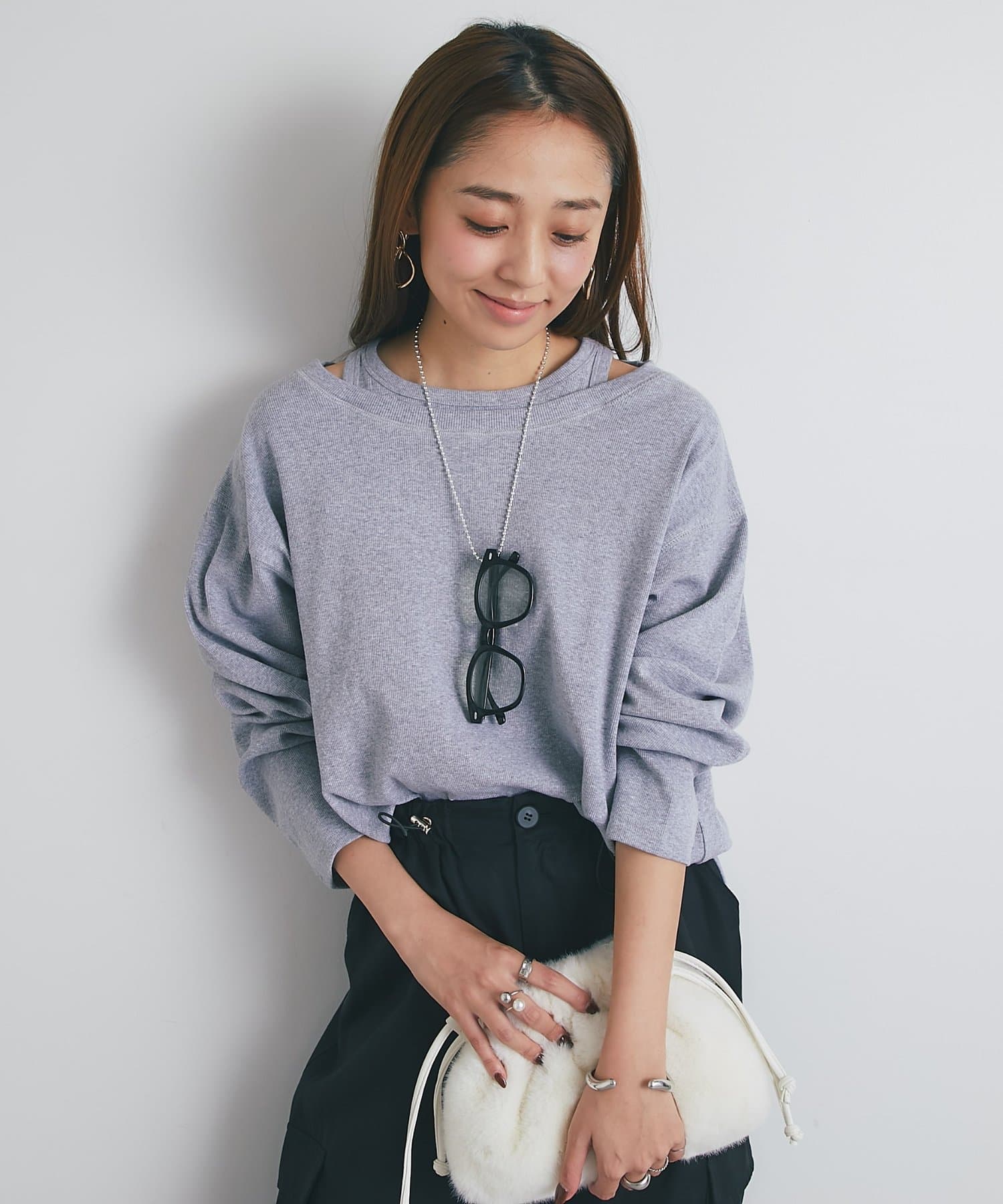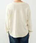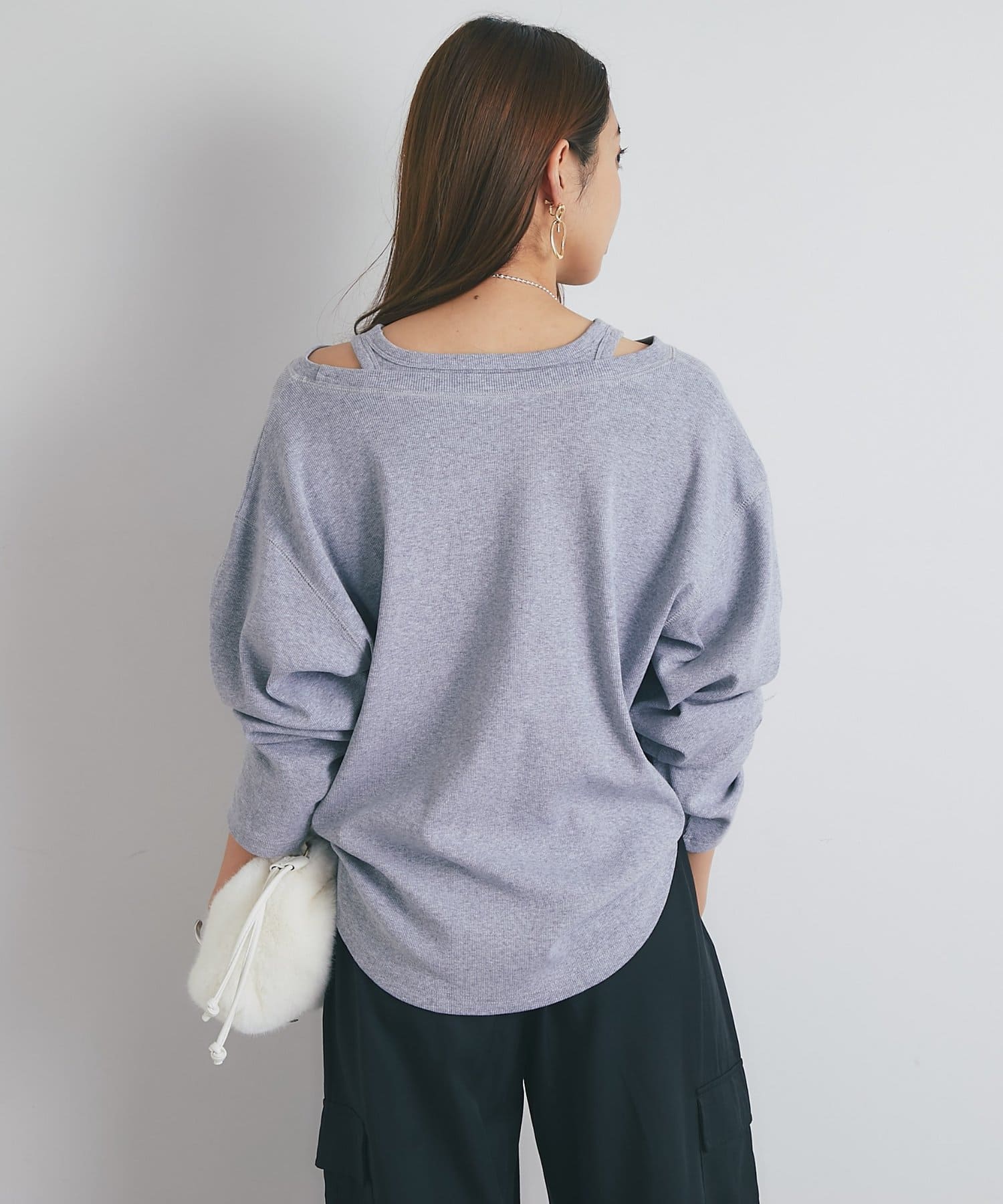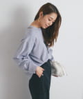 ・鎖骨を綺麗に見せるオフショルダー風デザインに仕上げられ、抜け感のあるスタイリングにまとめてくれます。