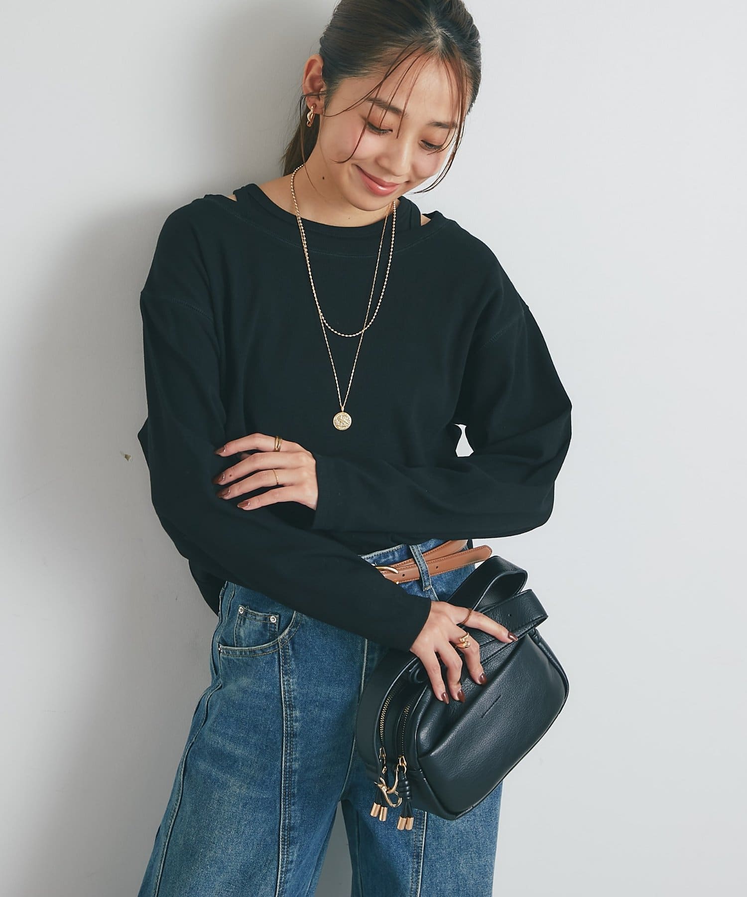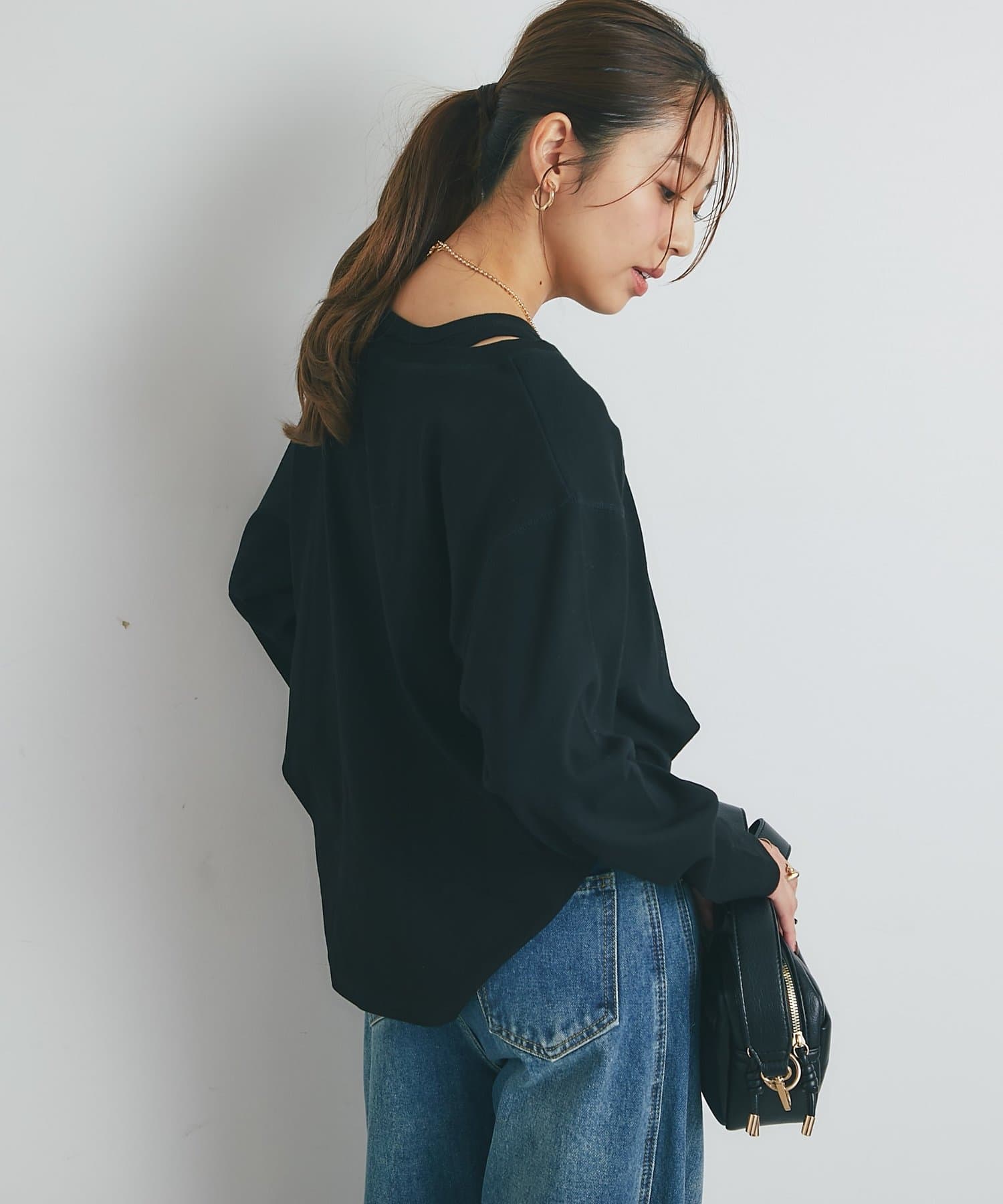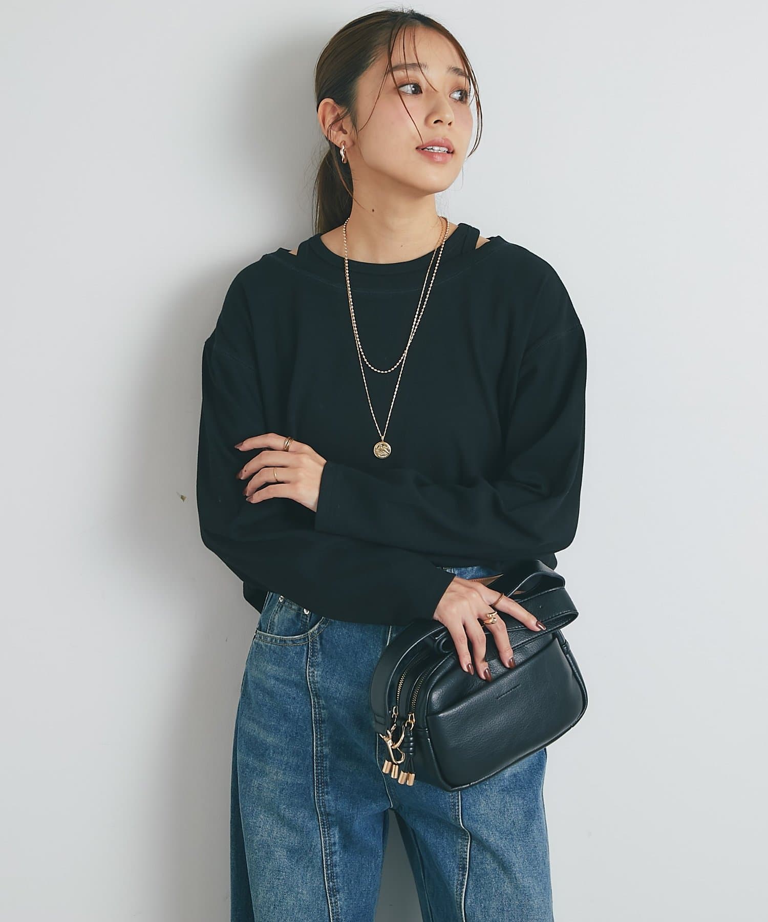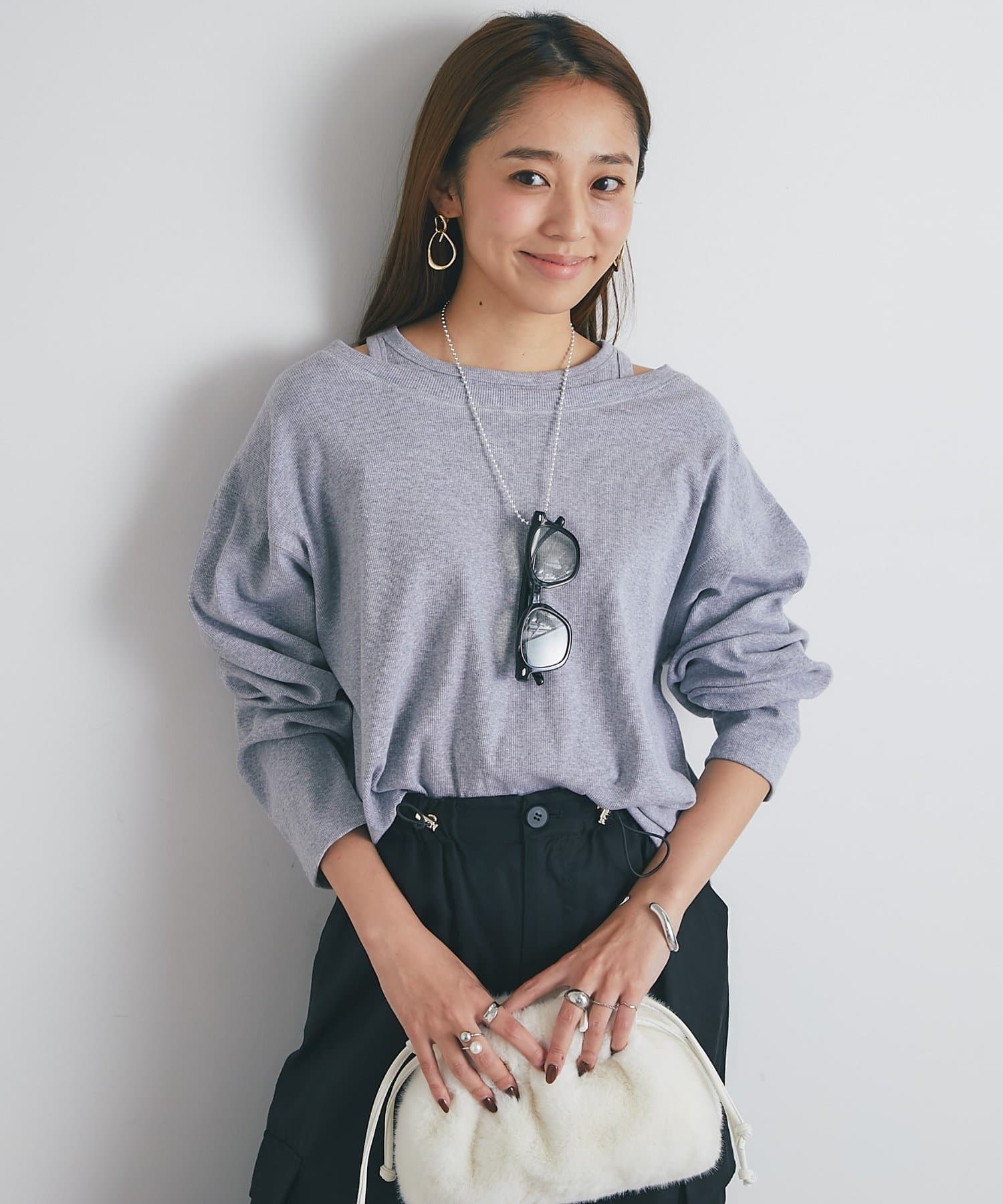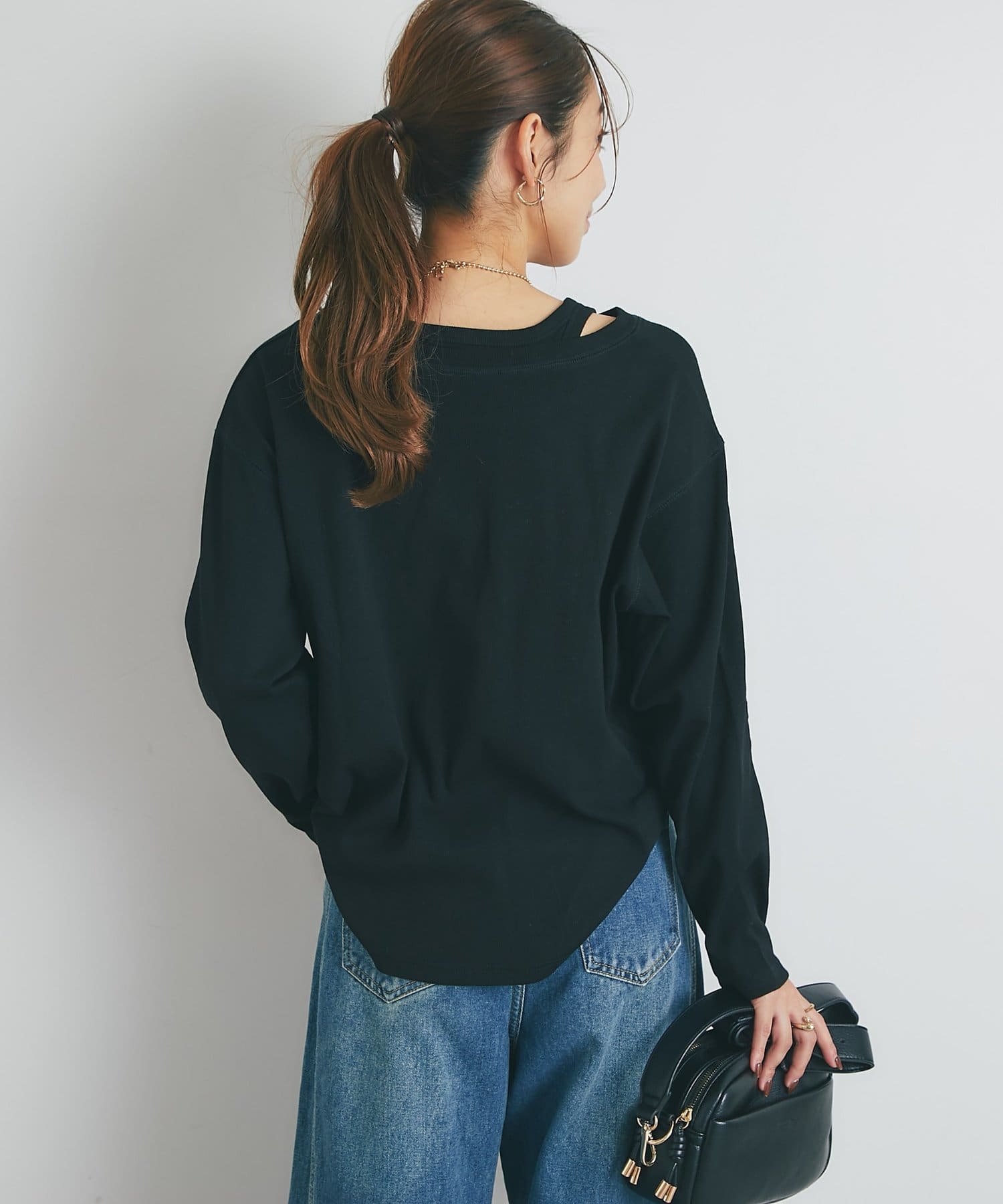 ・鎖骨を綺麗に見せるオフショルダー風デザインに仕上げられ、抜け感のあるスタイリングにまとめてくれます。