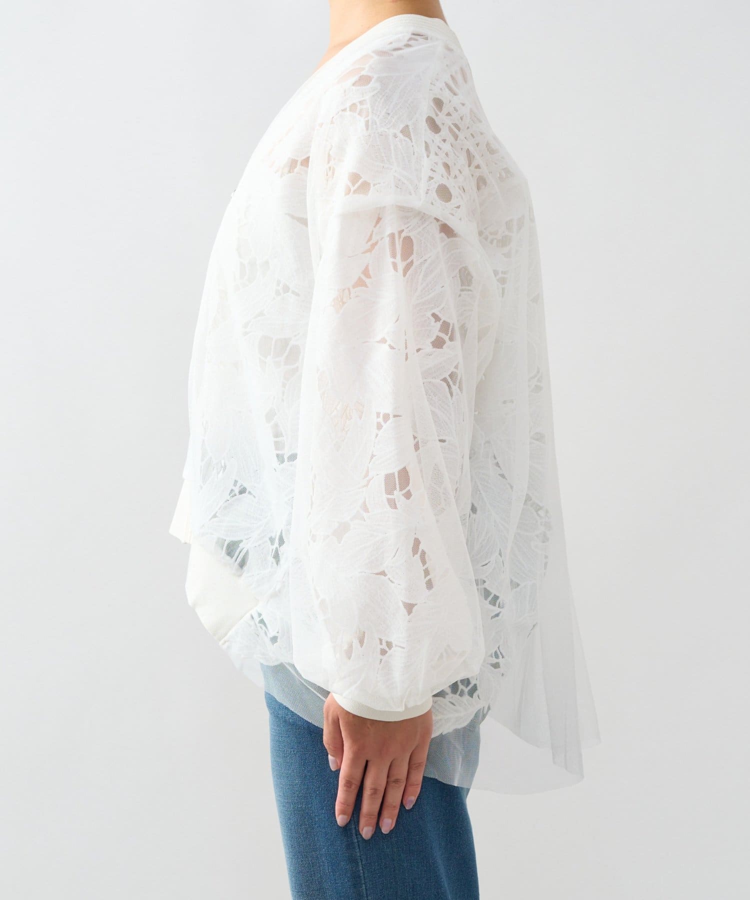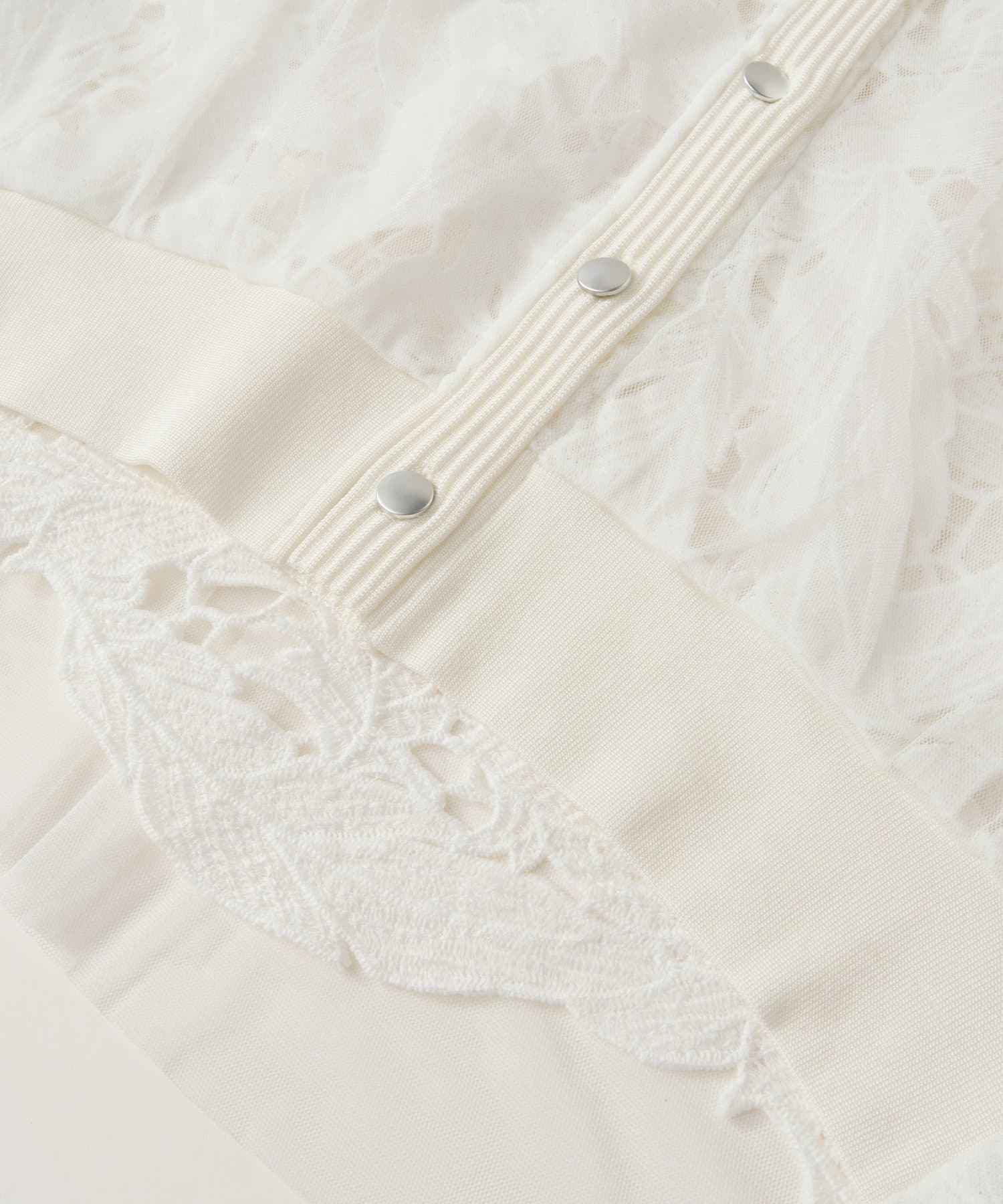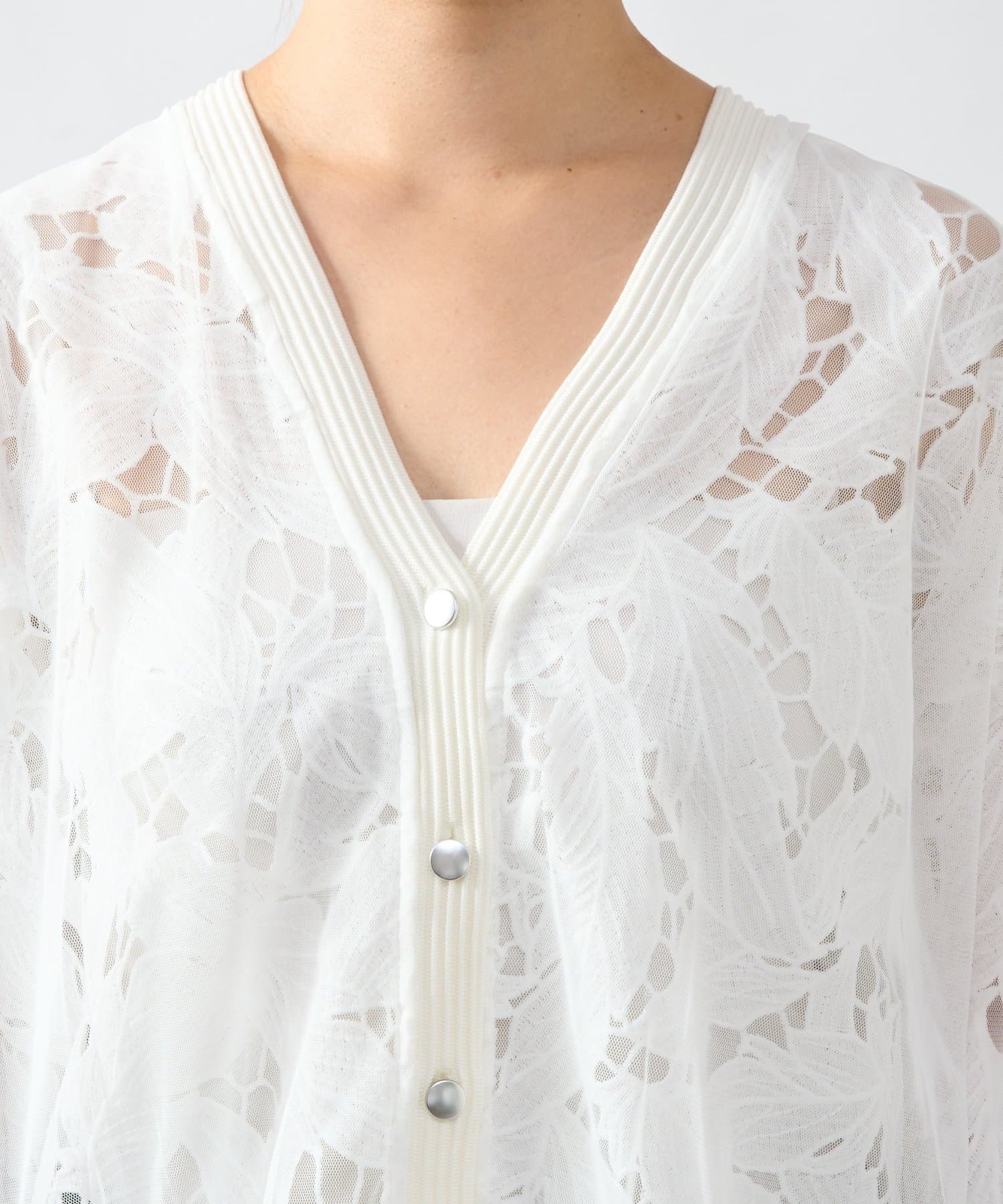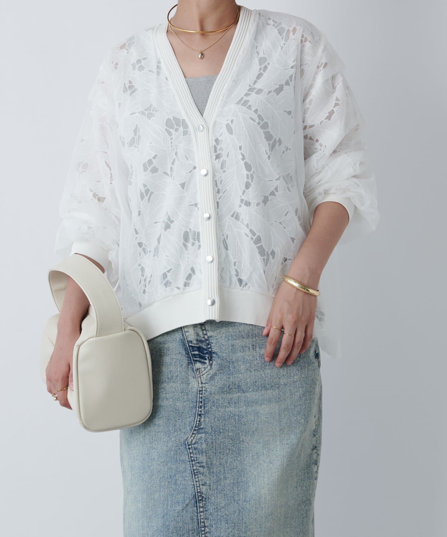 レースとチュールを重ねた大人フェミニンなカーデ