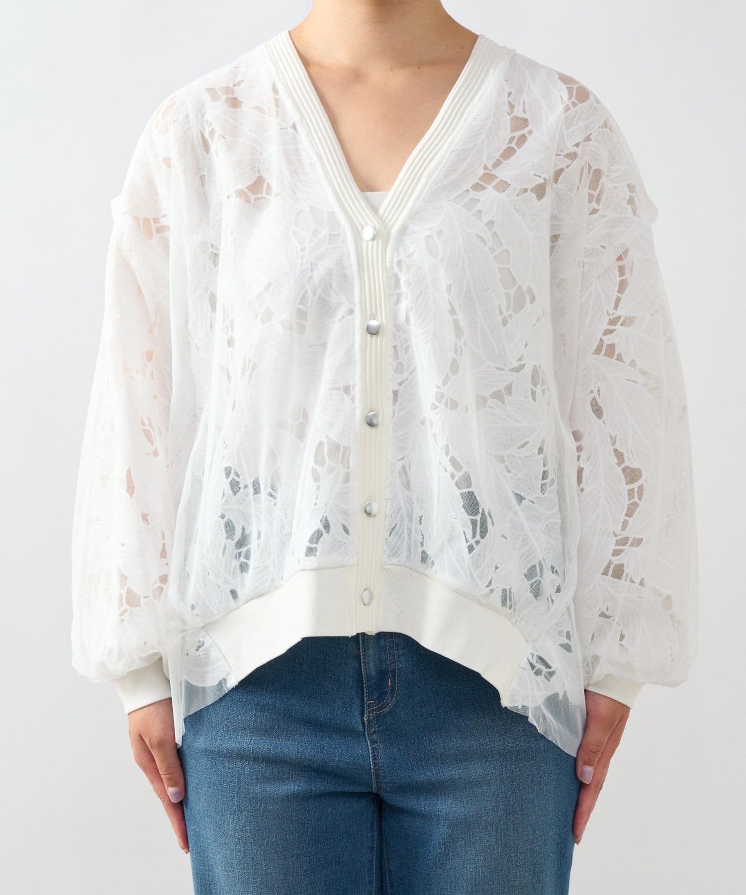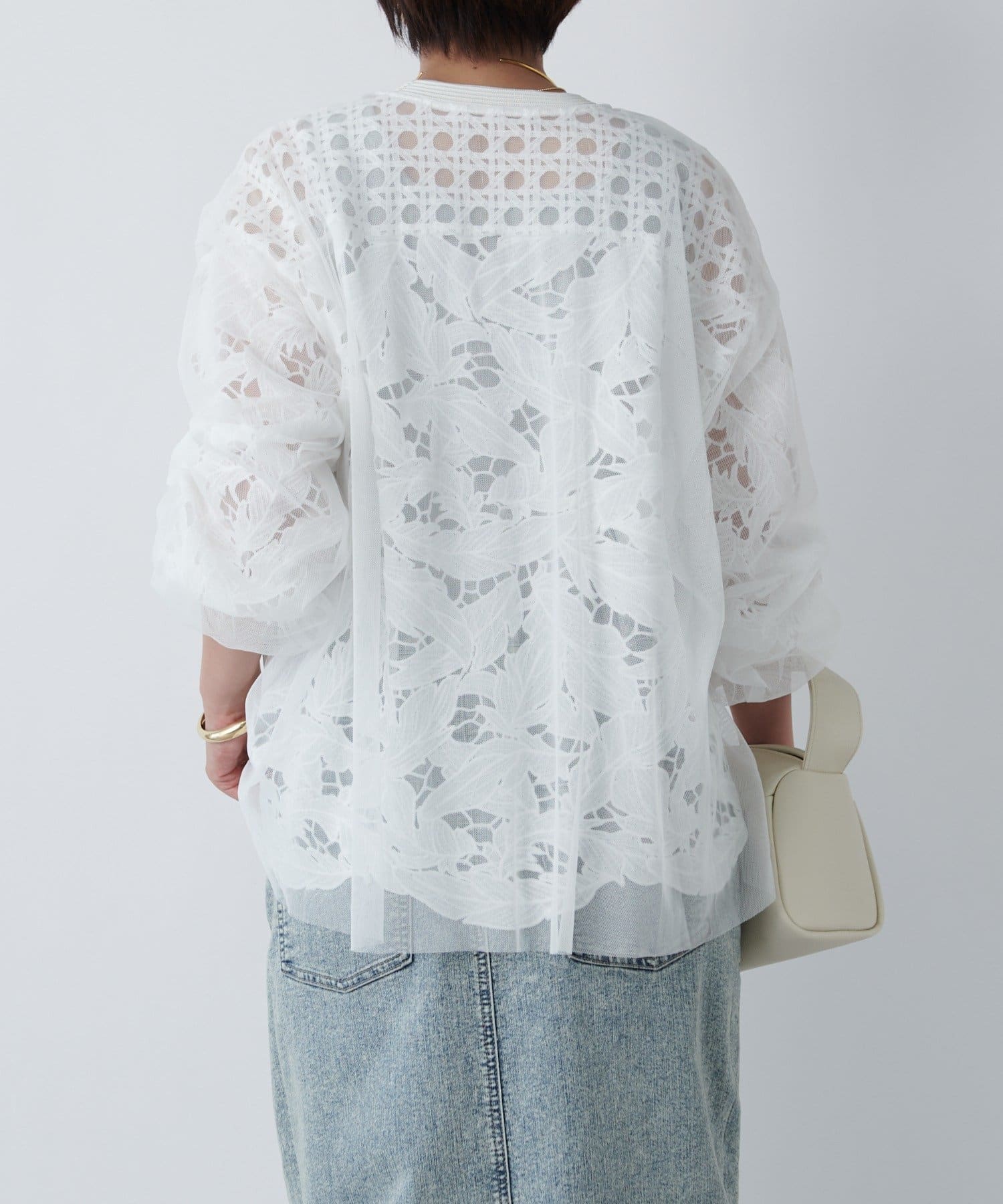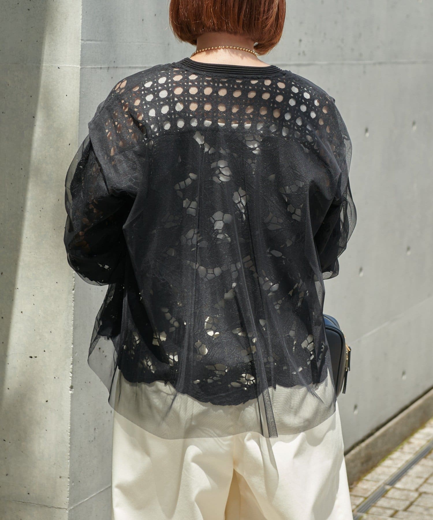 レースとチュールを重ねた大人フェミニンなカーデ