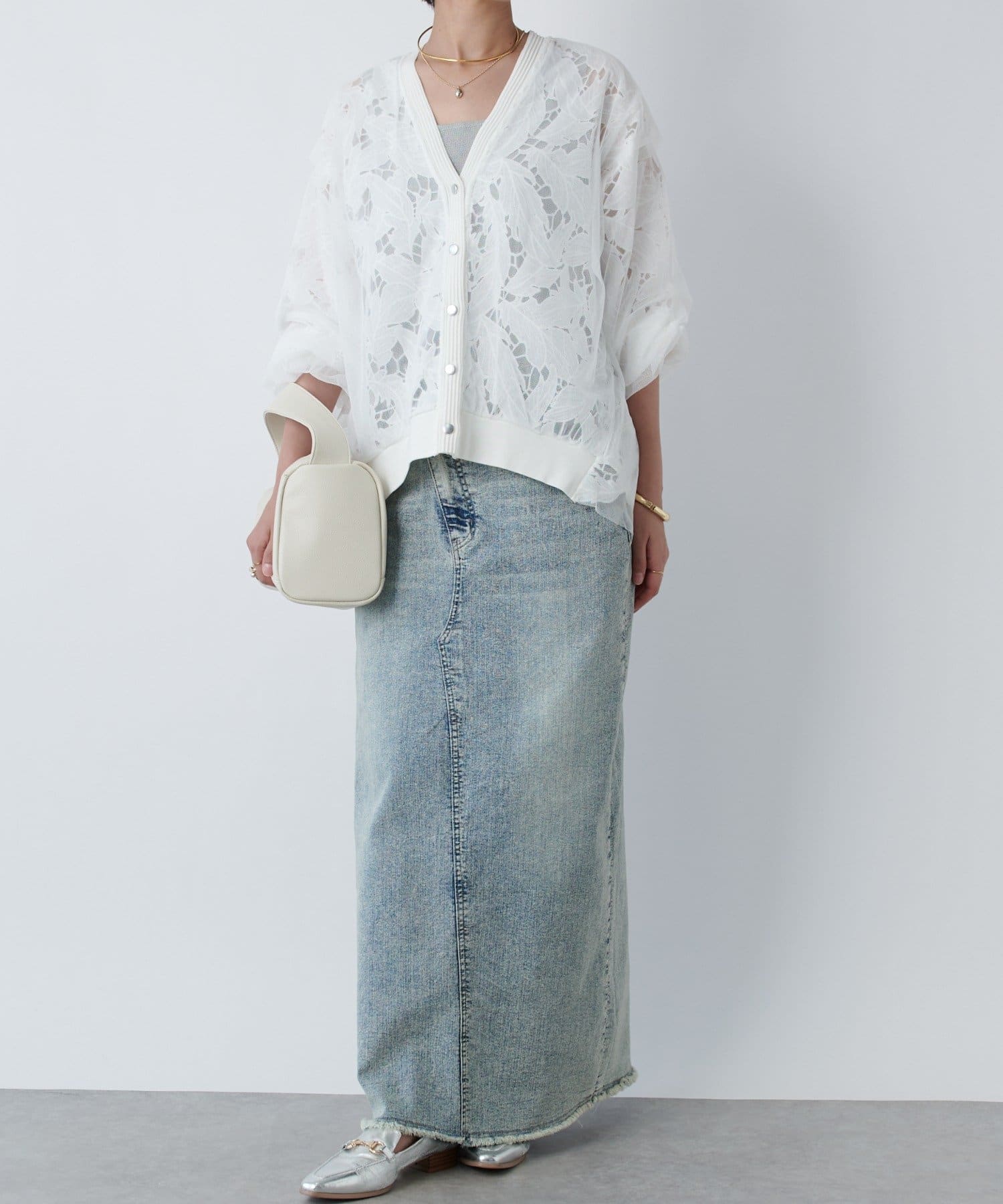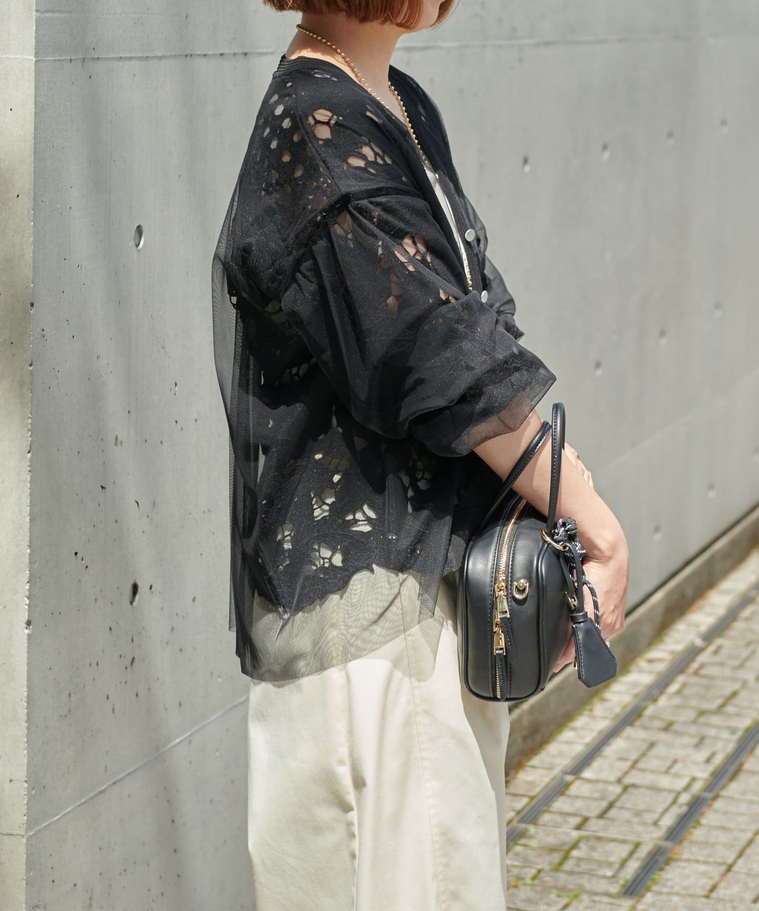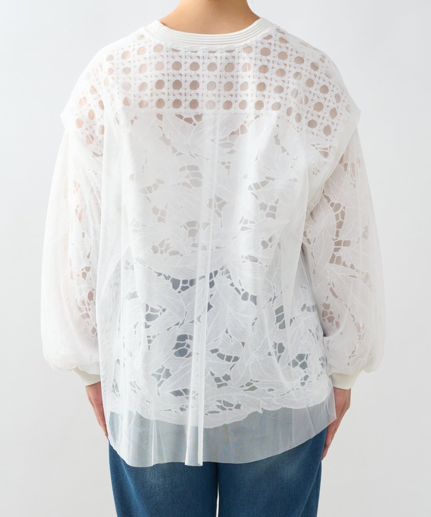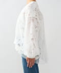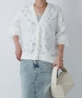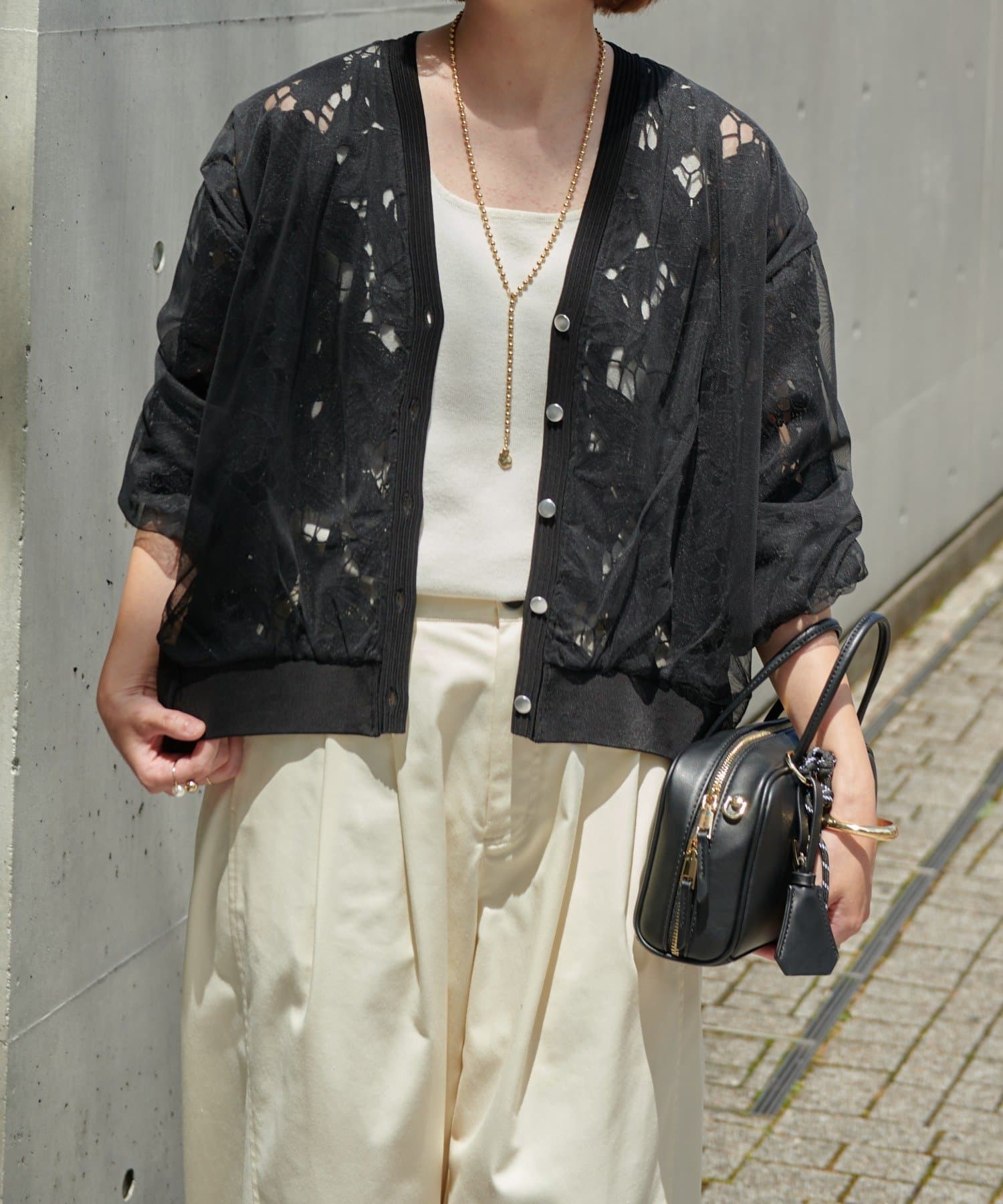 レースとチュールを重ねた大人フェミニンなカーデ