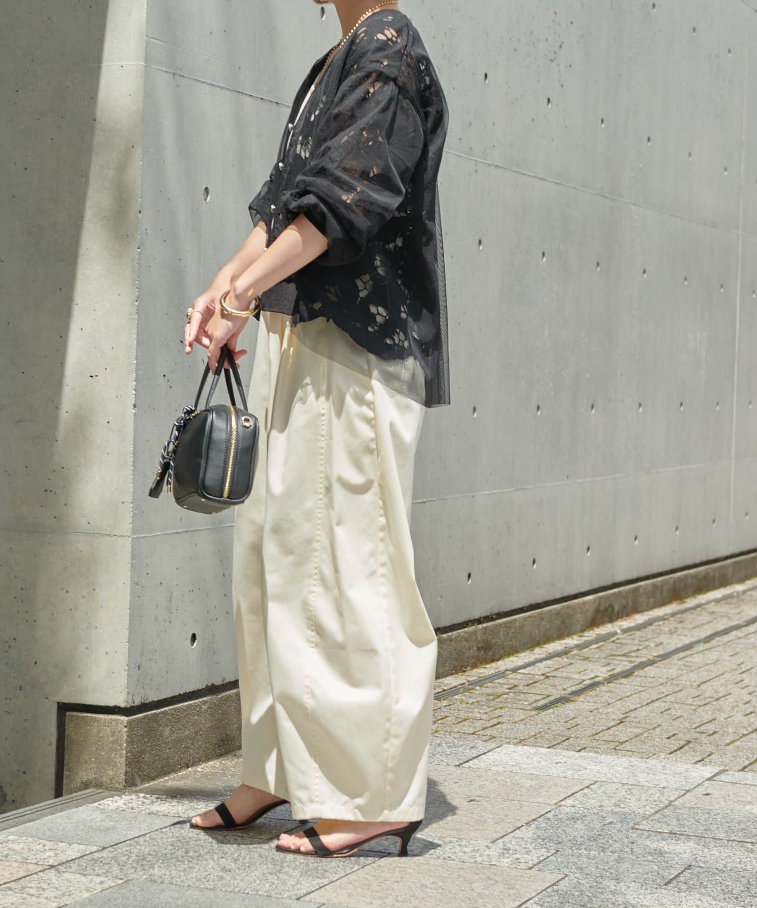ワイドなシルエットなのですっきりとしたシルエット・Iラインシルエットのボトムスと