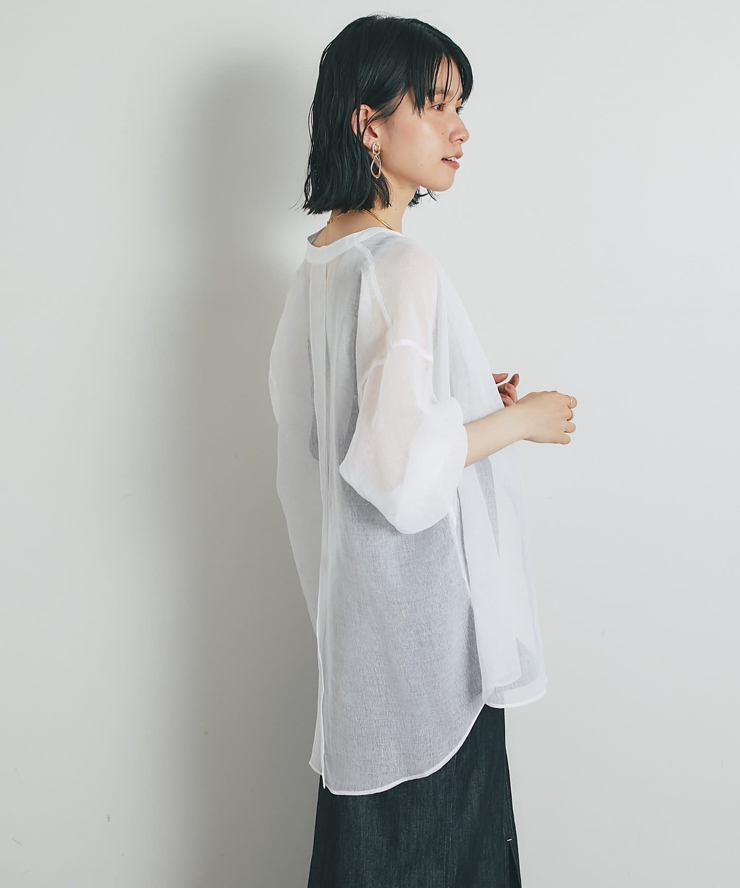 《さりげない透け感・着回し万能》シアーベロア5分袖プルオーバー