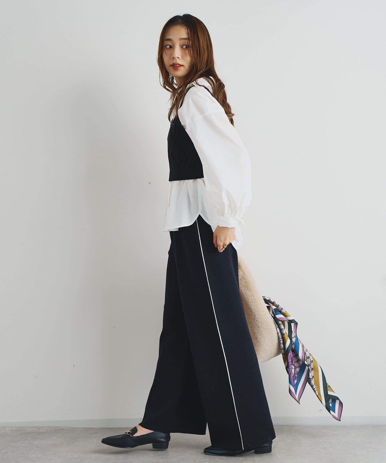 綺麗めのタックパンツなどを合わせれば、オフィスシーンでも使えるきちんとコーデに。