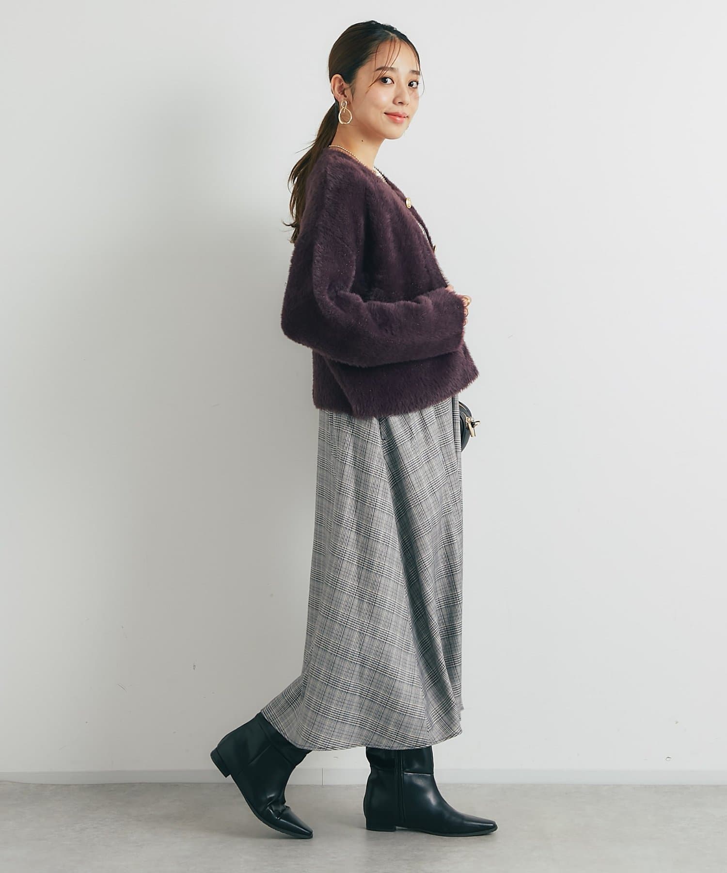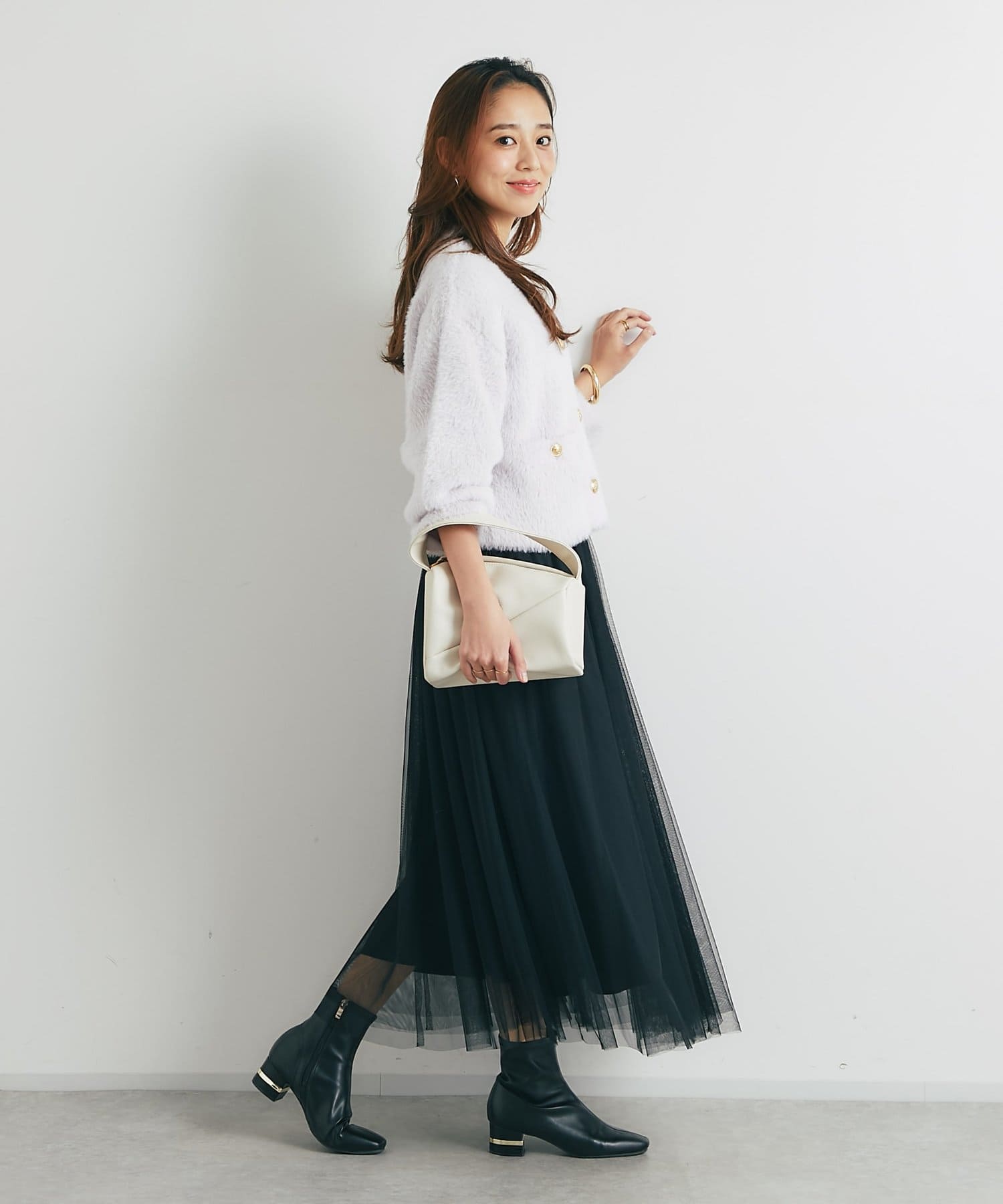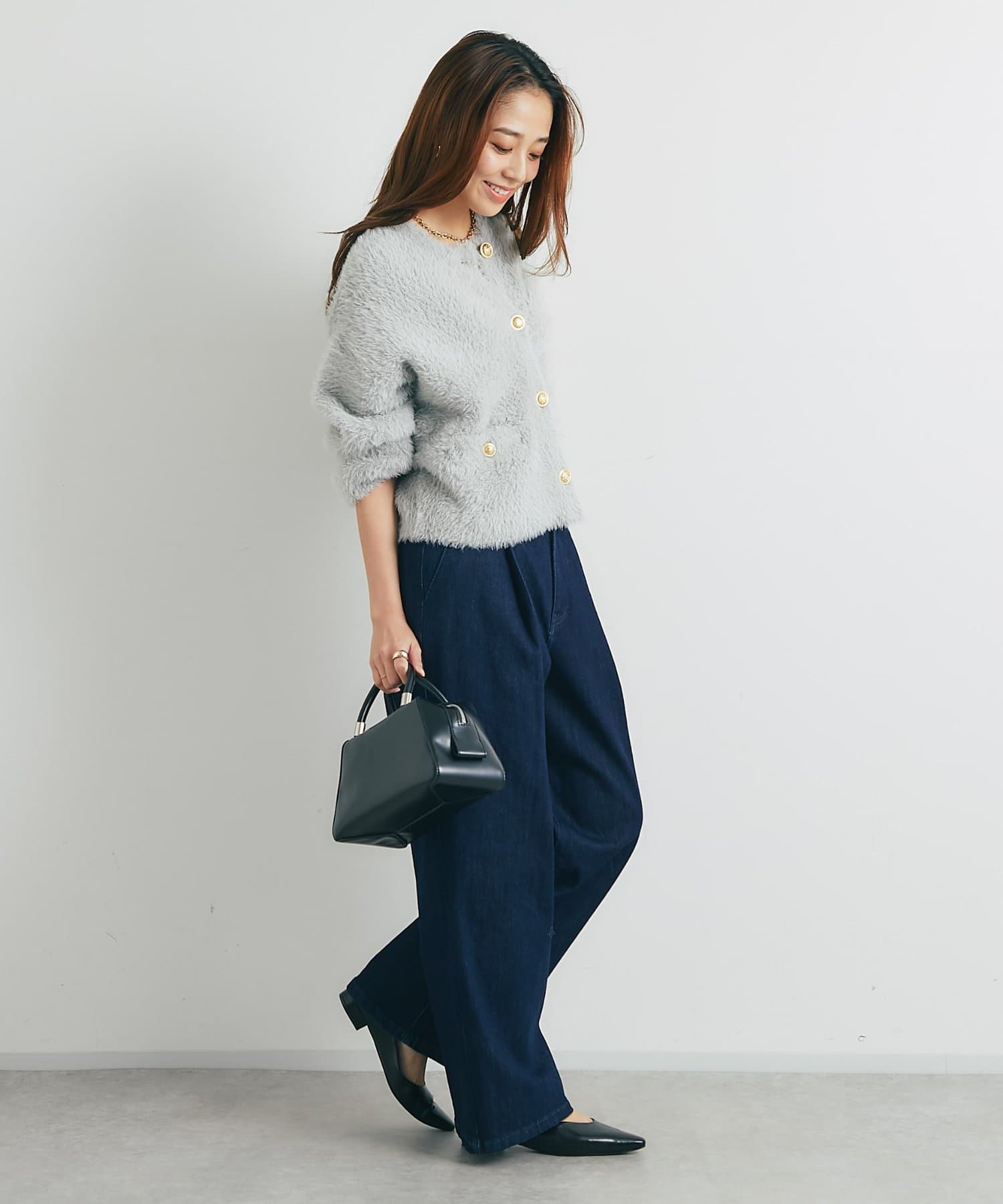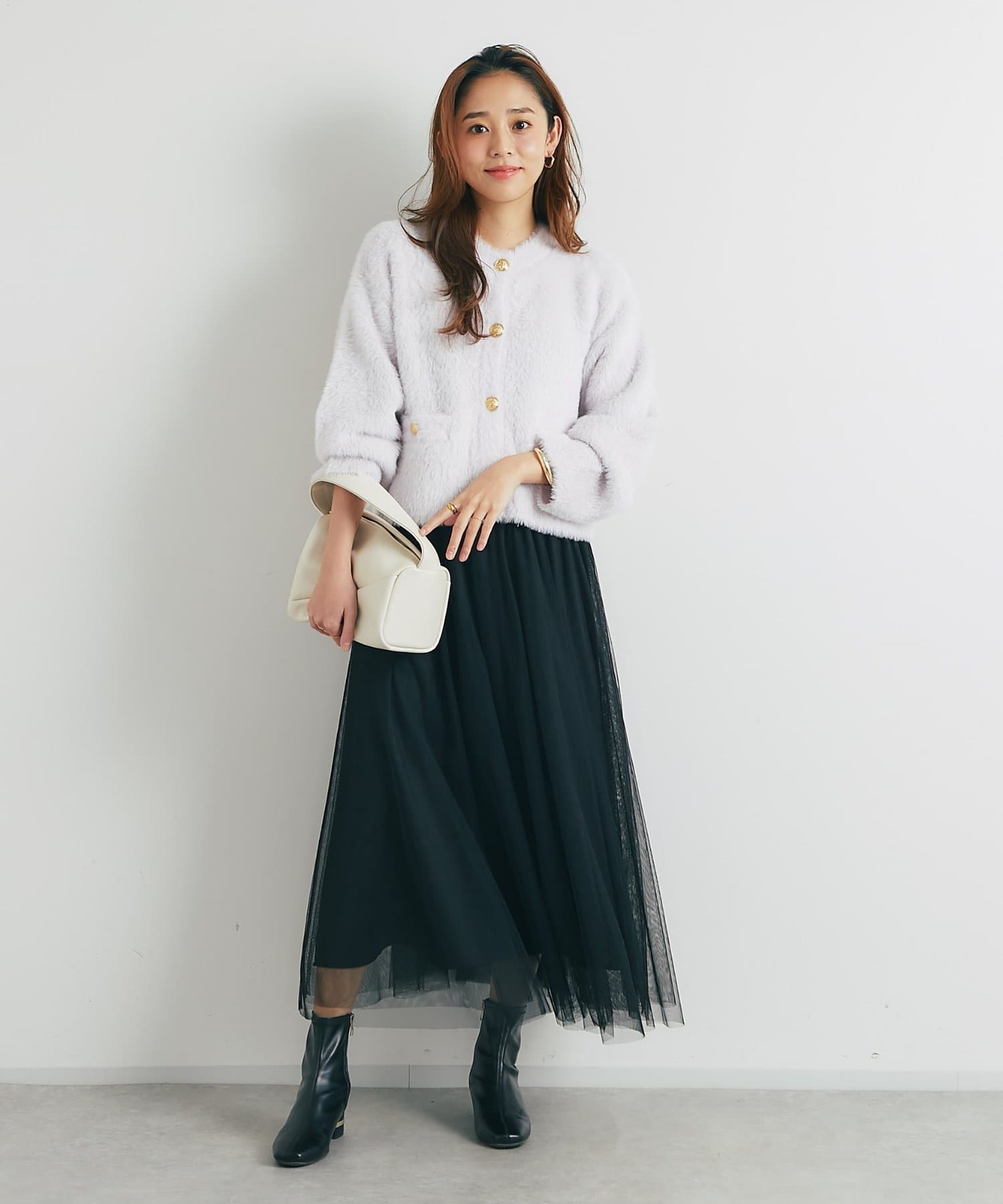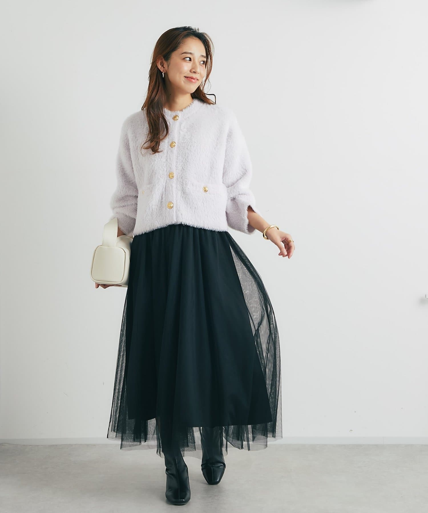 程よくボリューミーなカーデなので定番のデニム合わせはもちろん、マーメイドスカートでレディライクに合わせても◎