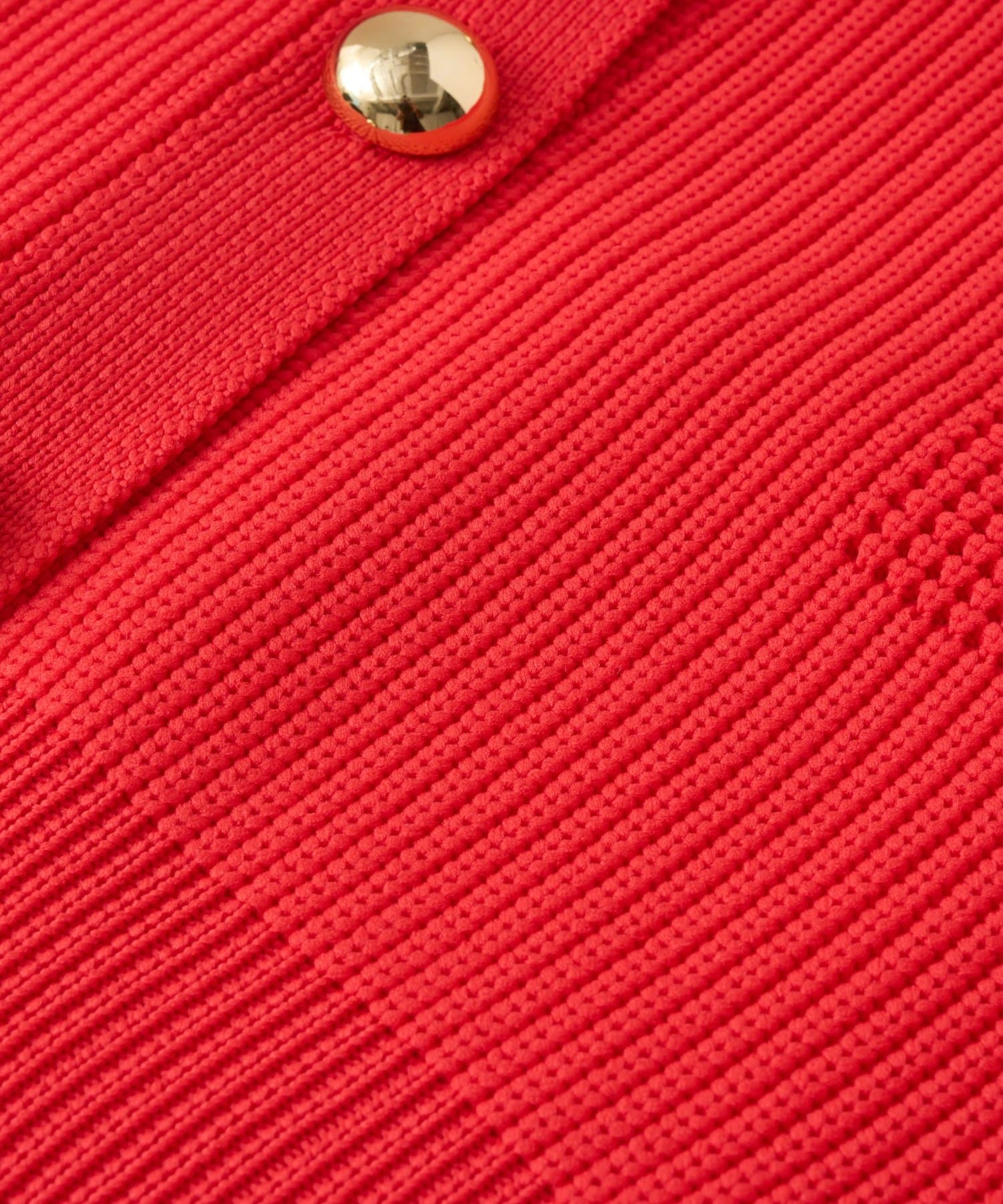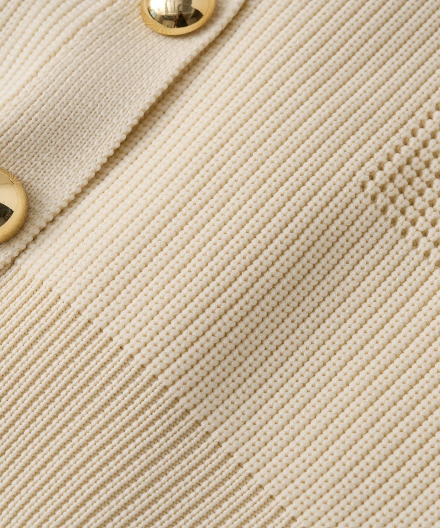 ・程よい厚みがありながら肌当たりさらっとしたニット素材で心地よく、フロントにほどこされた大きめの金釦がお洒落なアクセントに◎