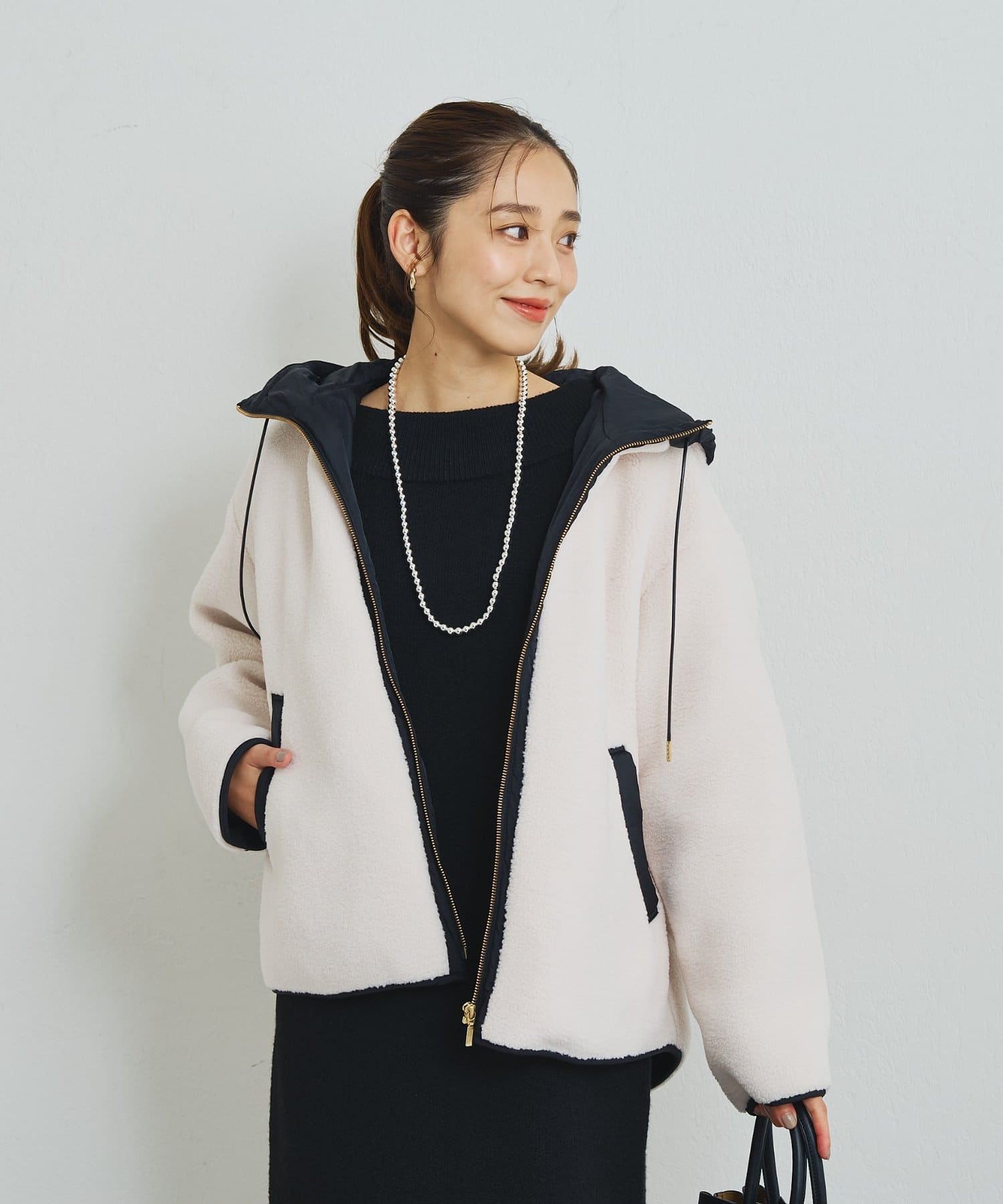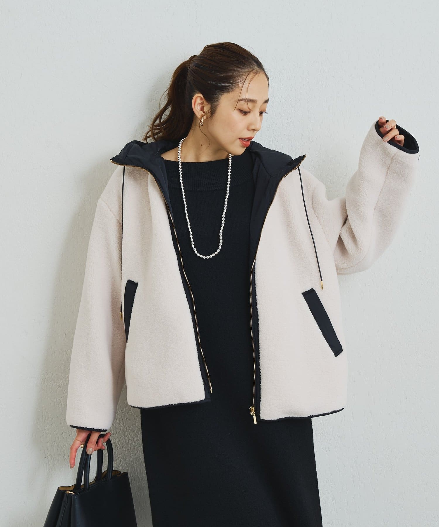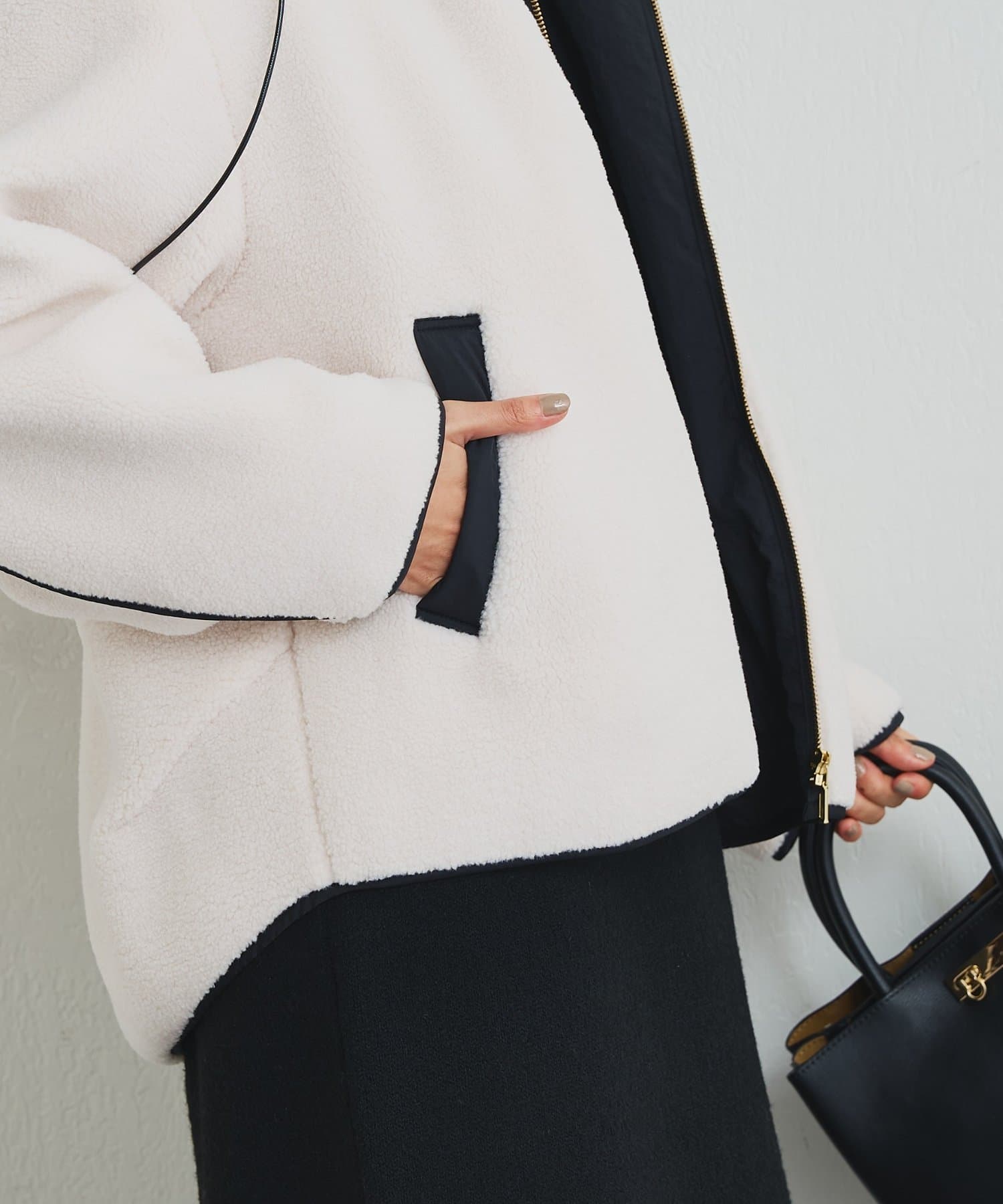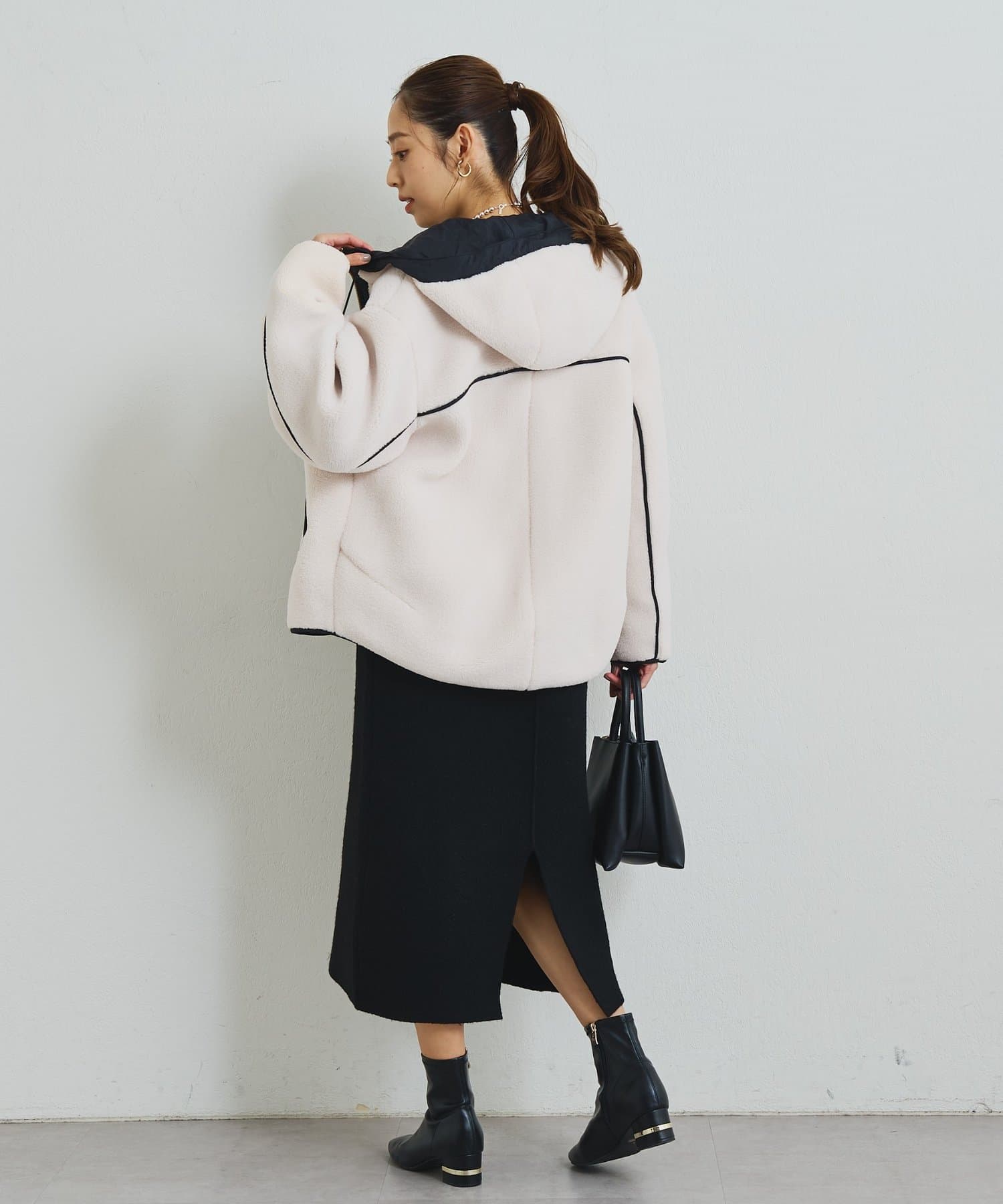 ・あたたかみのあるボア素材で仕立てられた、配色デザインがお洒落なコート♪