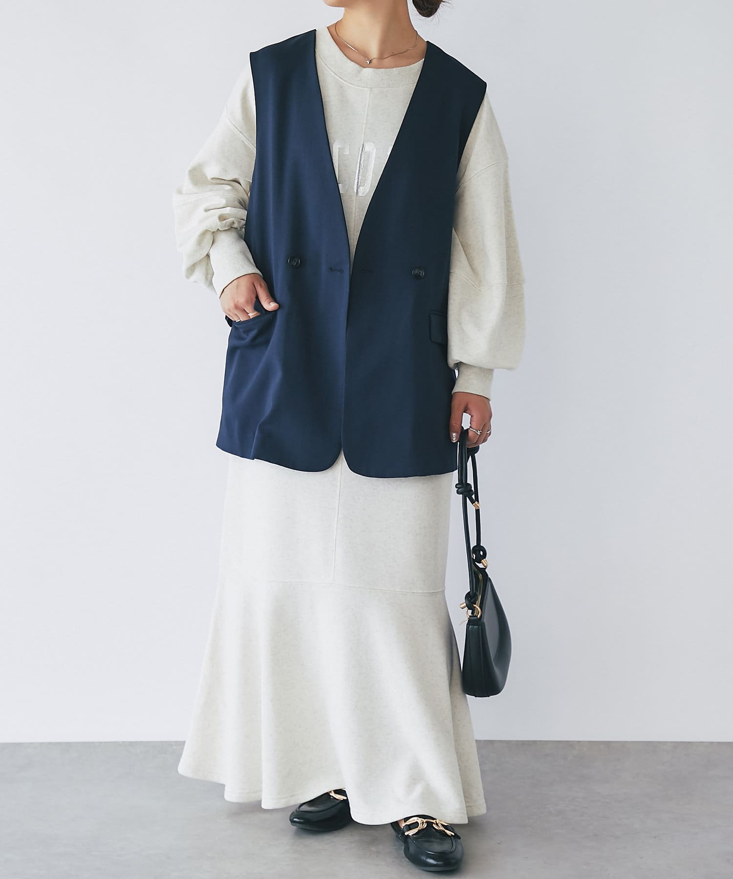 さらりと軽やかなスーツ地で、きれいめな印象に
