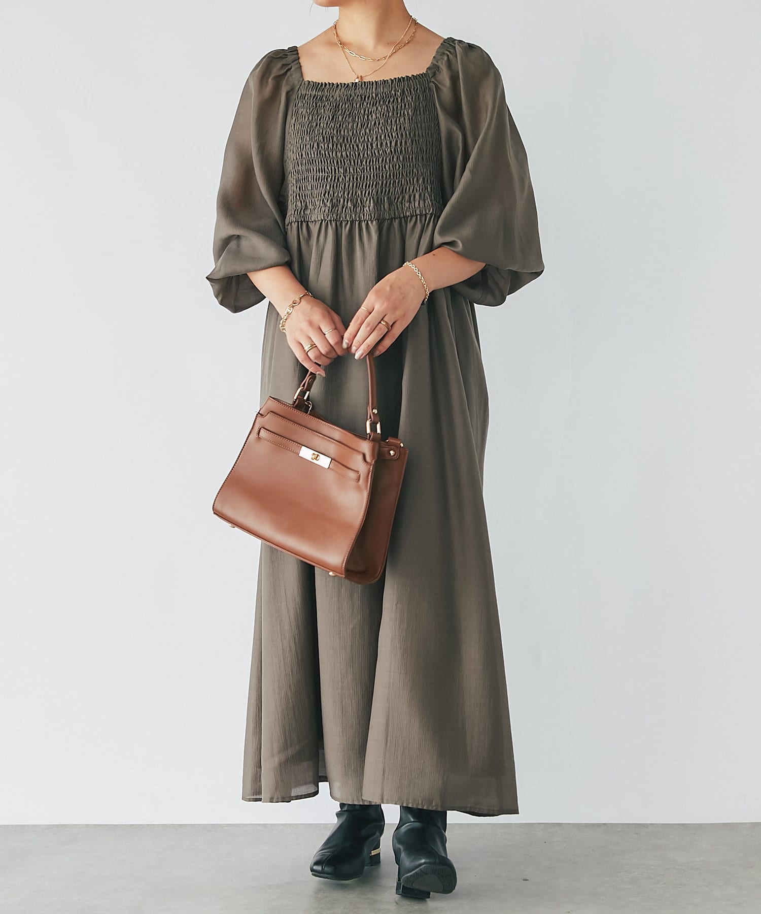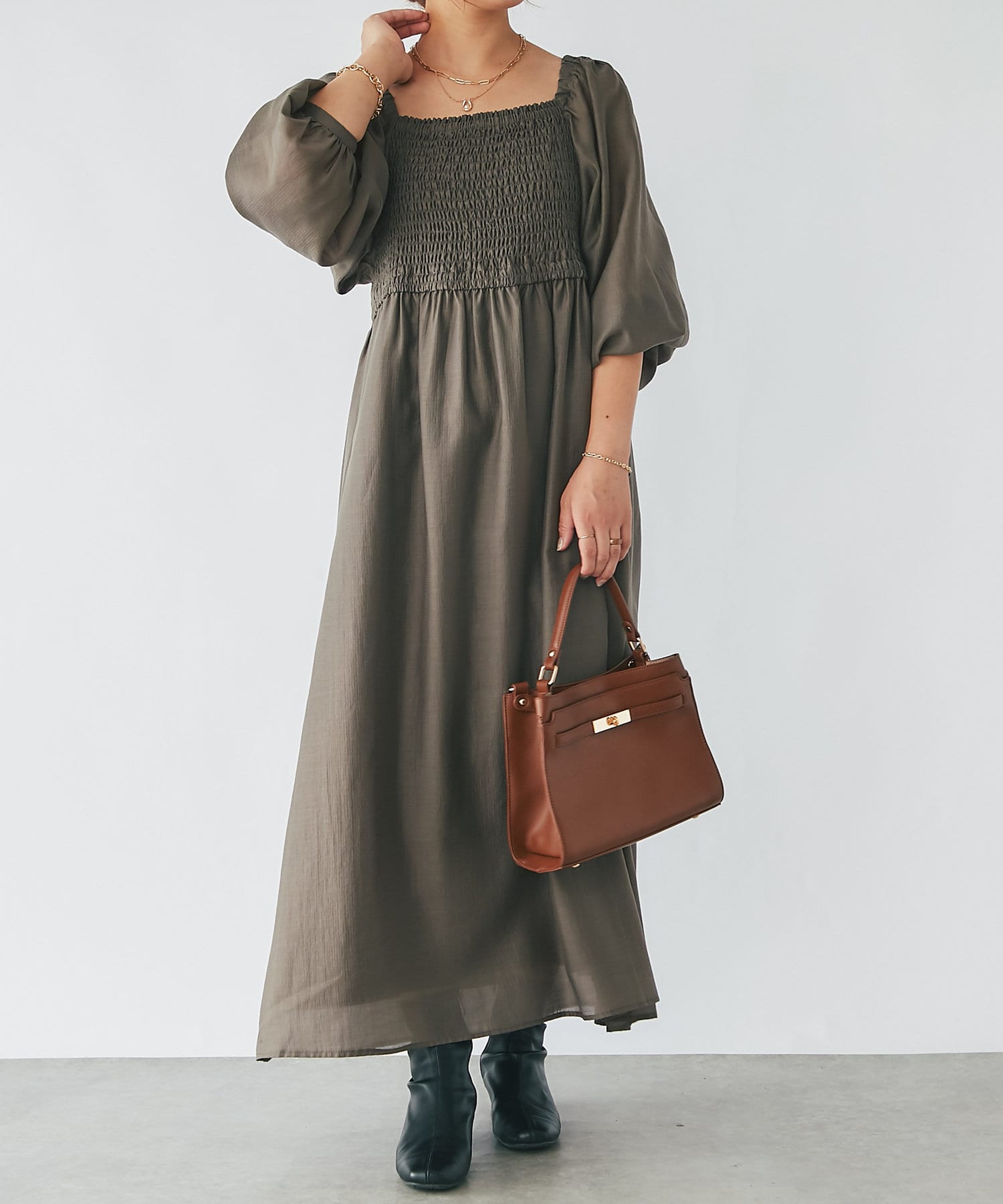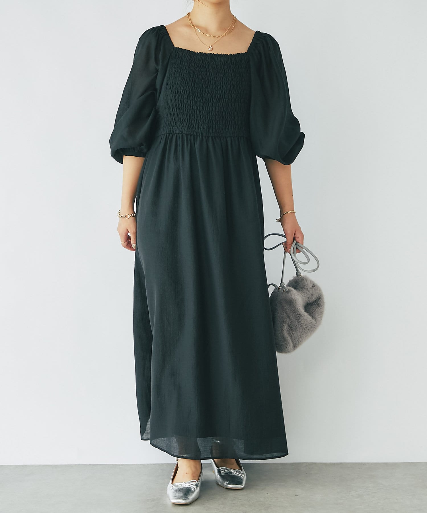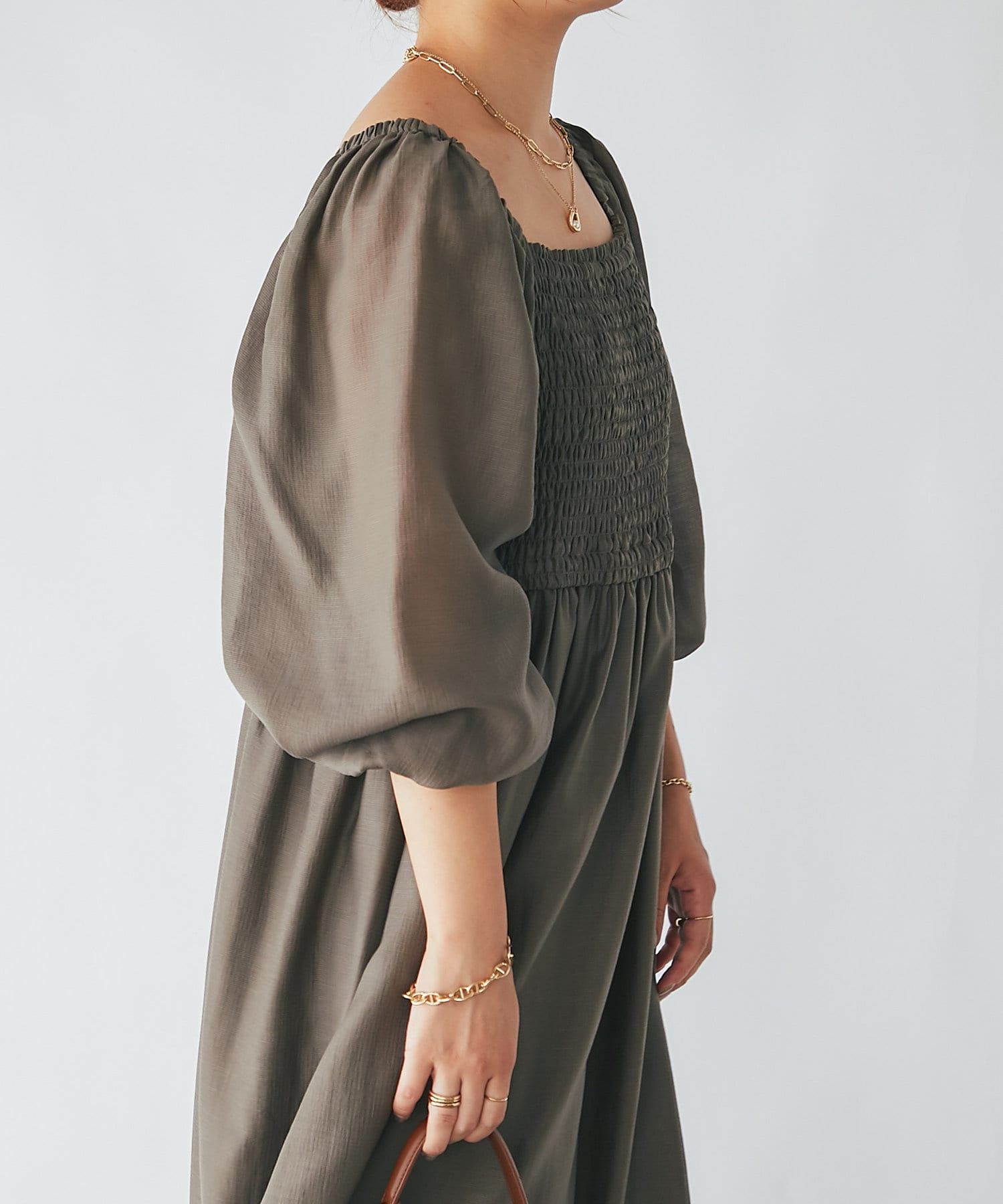 【un dix cors】シャーリングスクエアネックワンピース