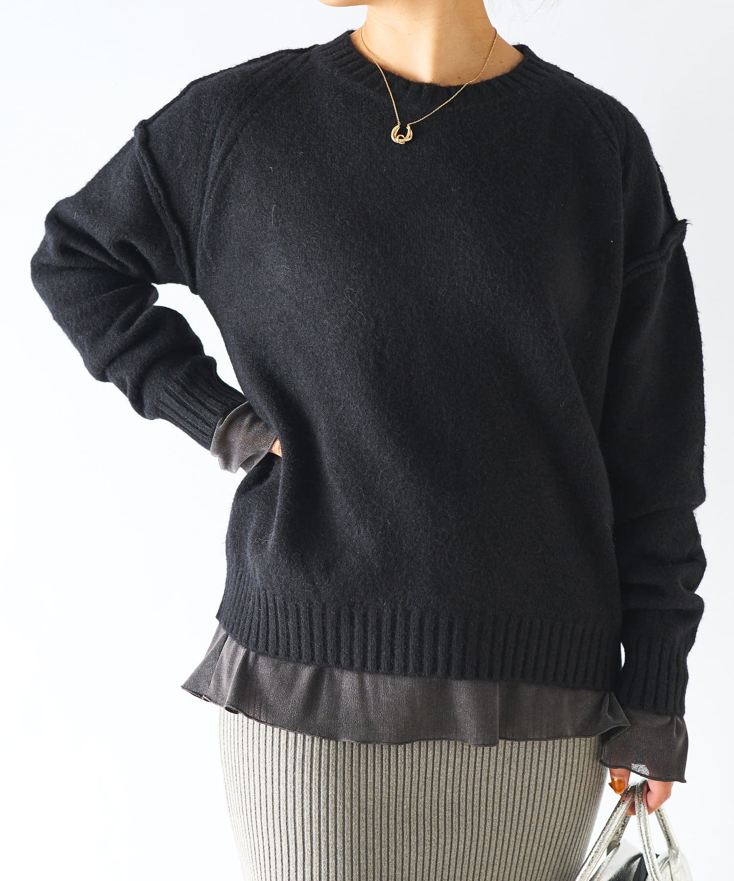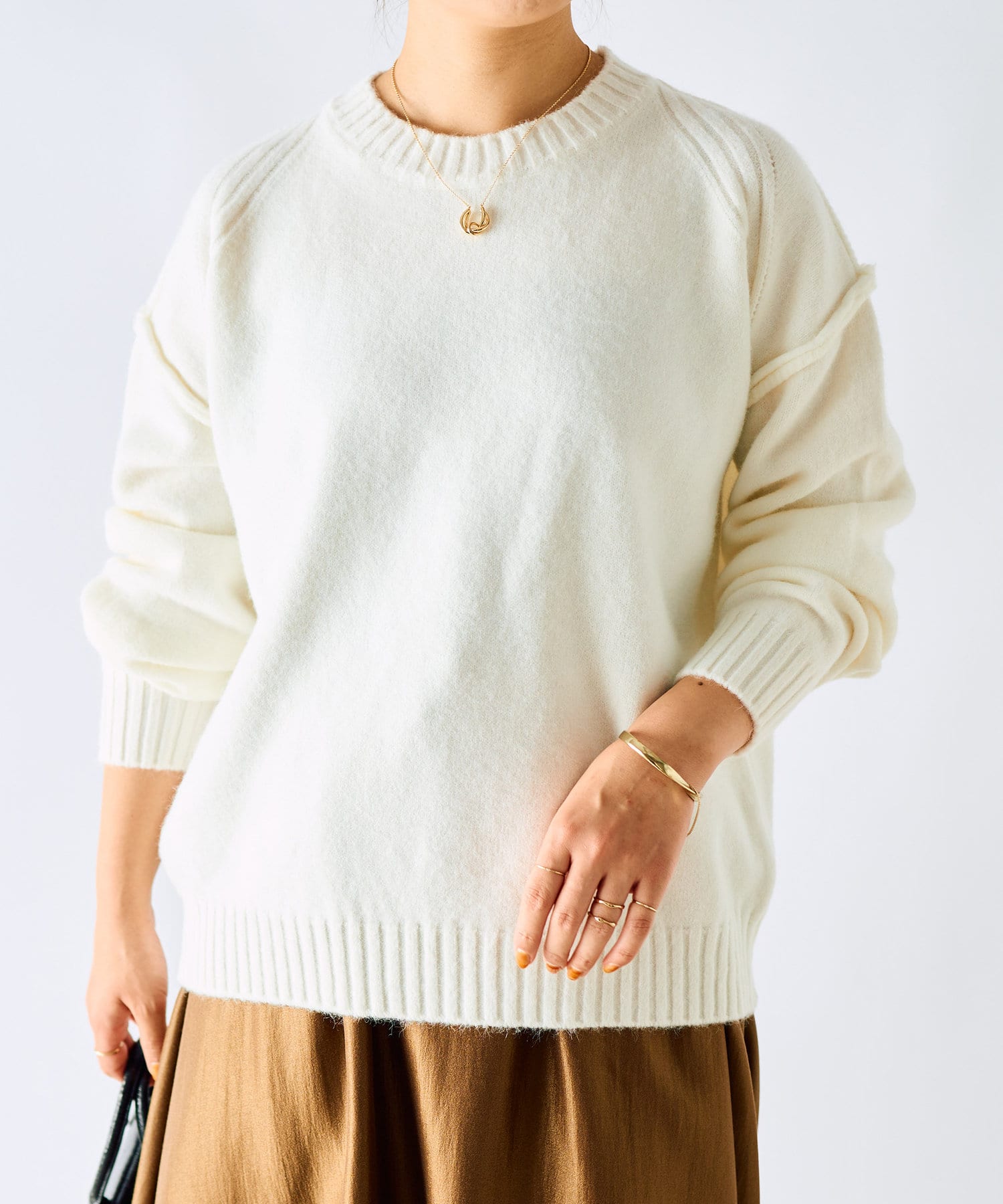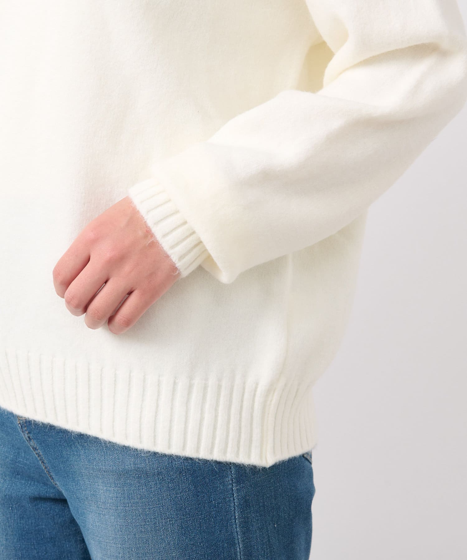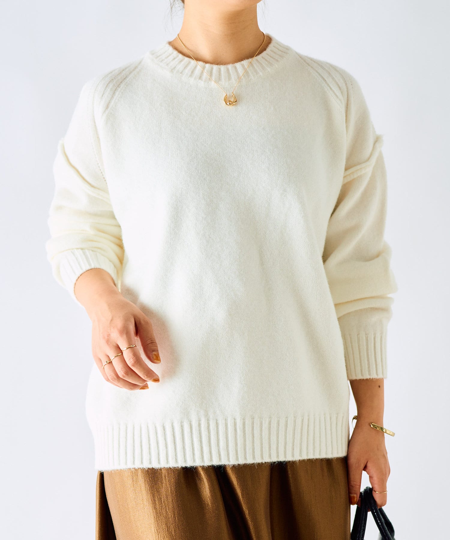 ・ゆったりめの身幅と着丈で幅広いスタイリングに着用できるもっちりニット