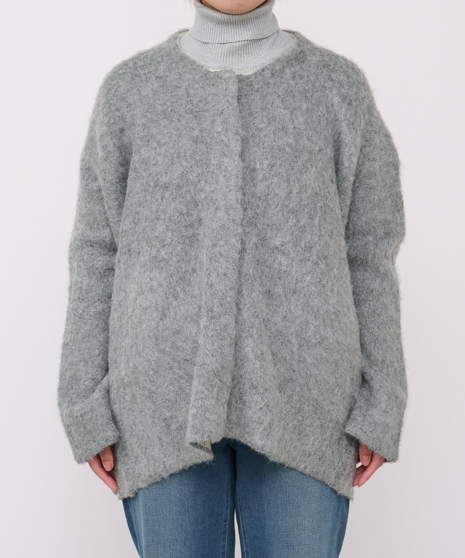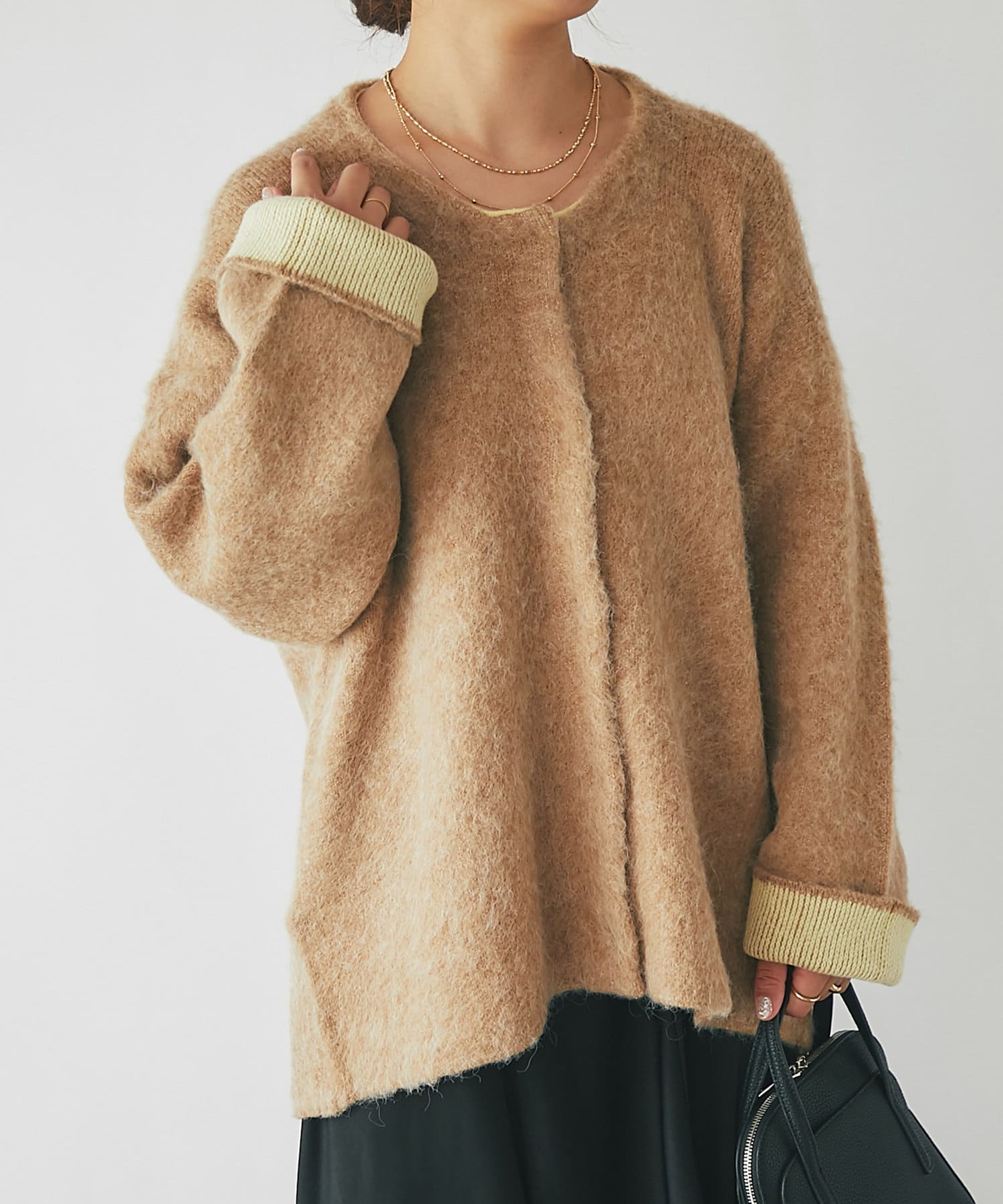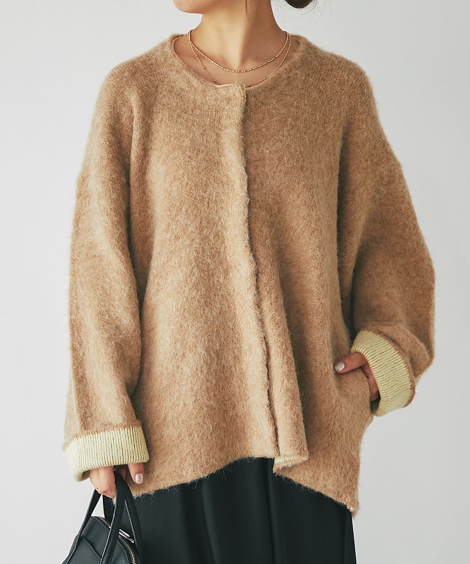 ふんわり素材で軽くて暖かいニットカーデ。