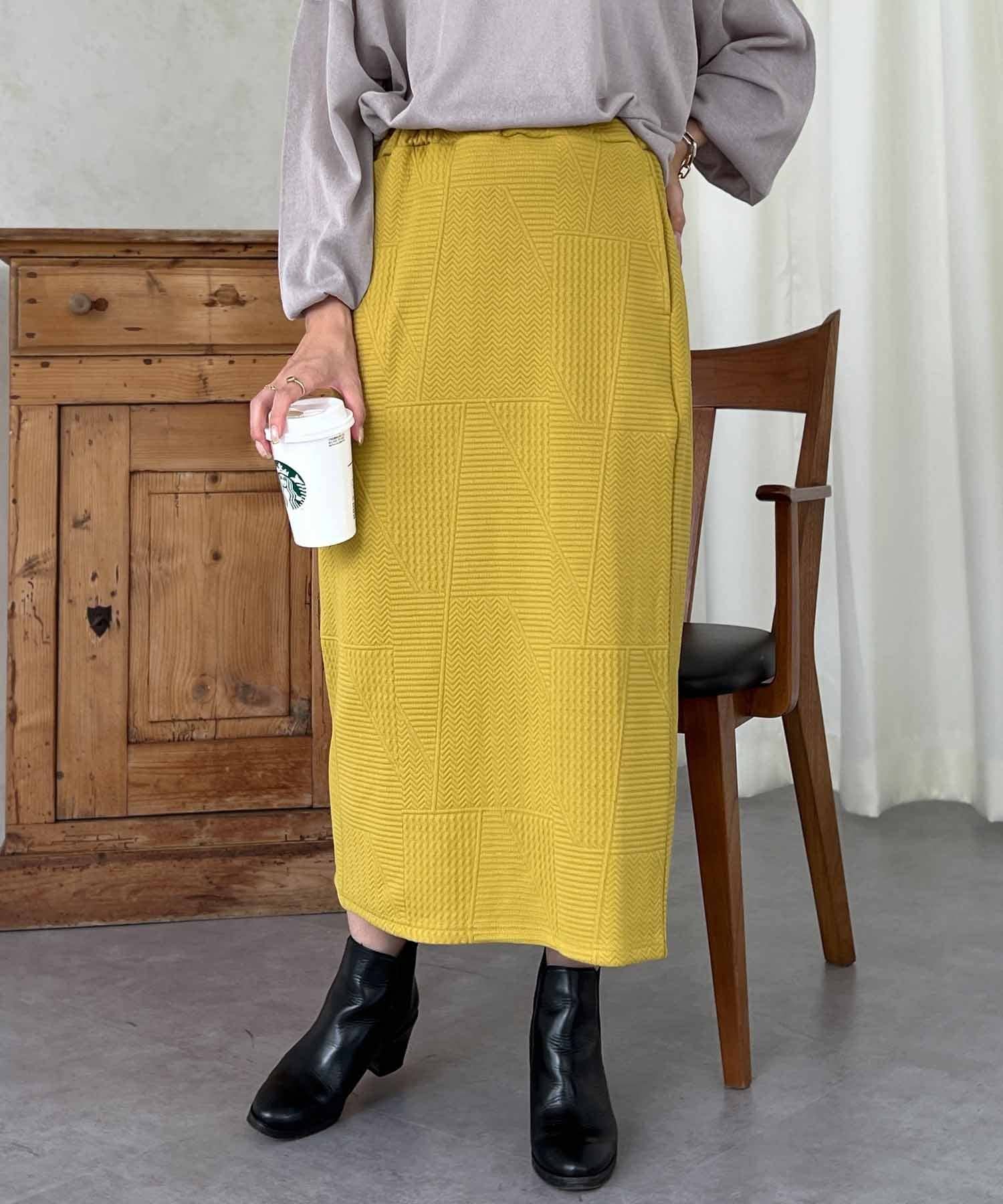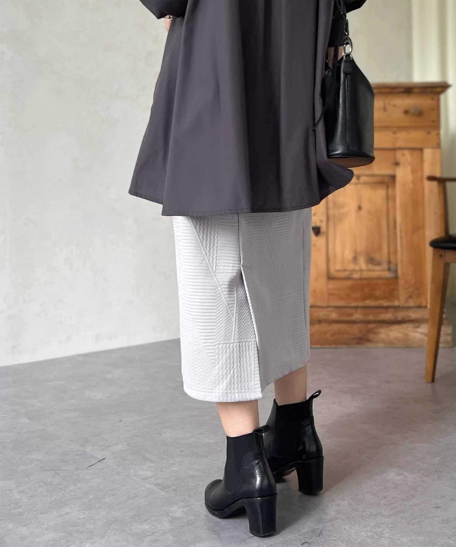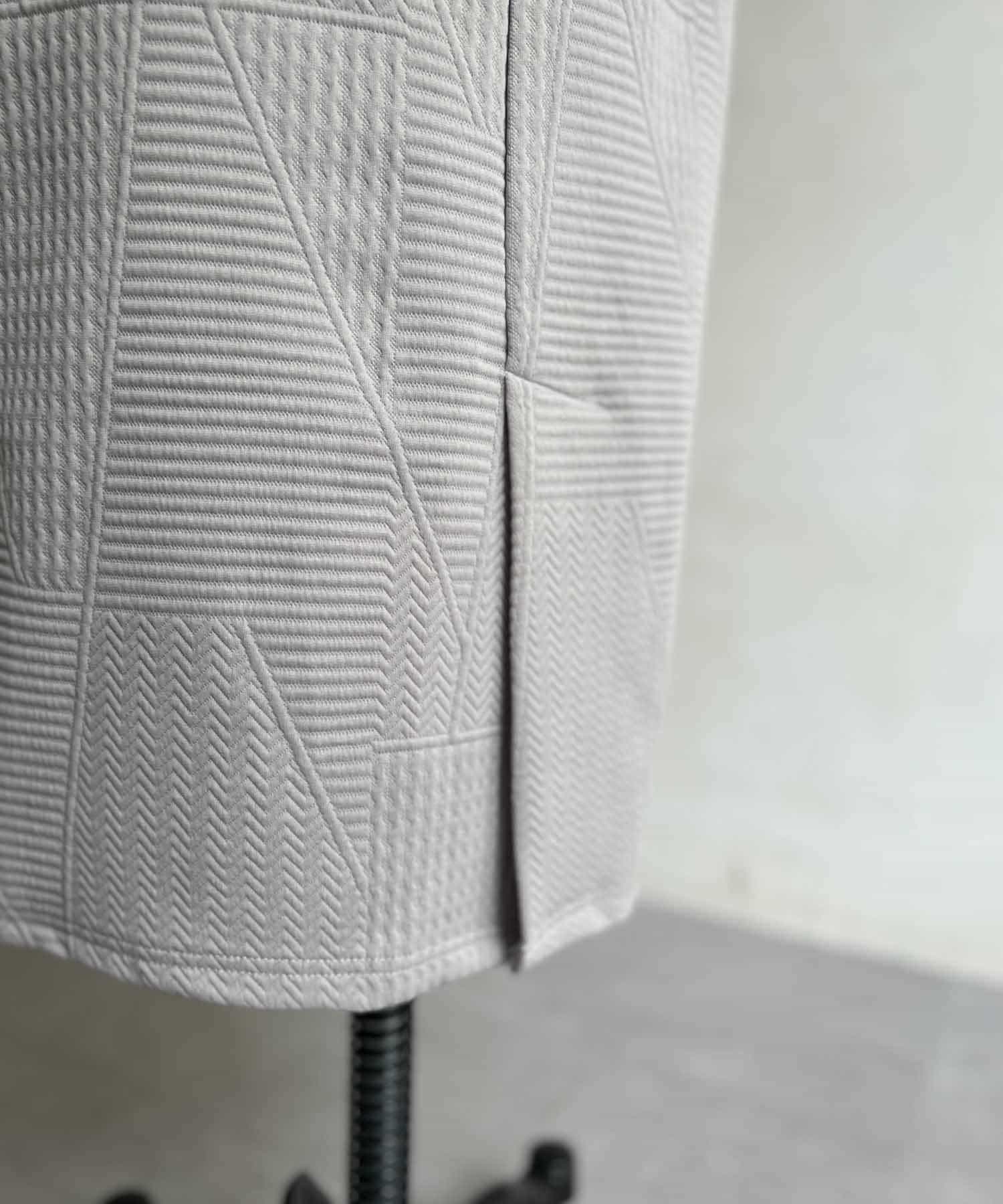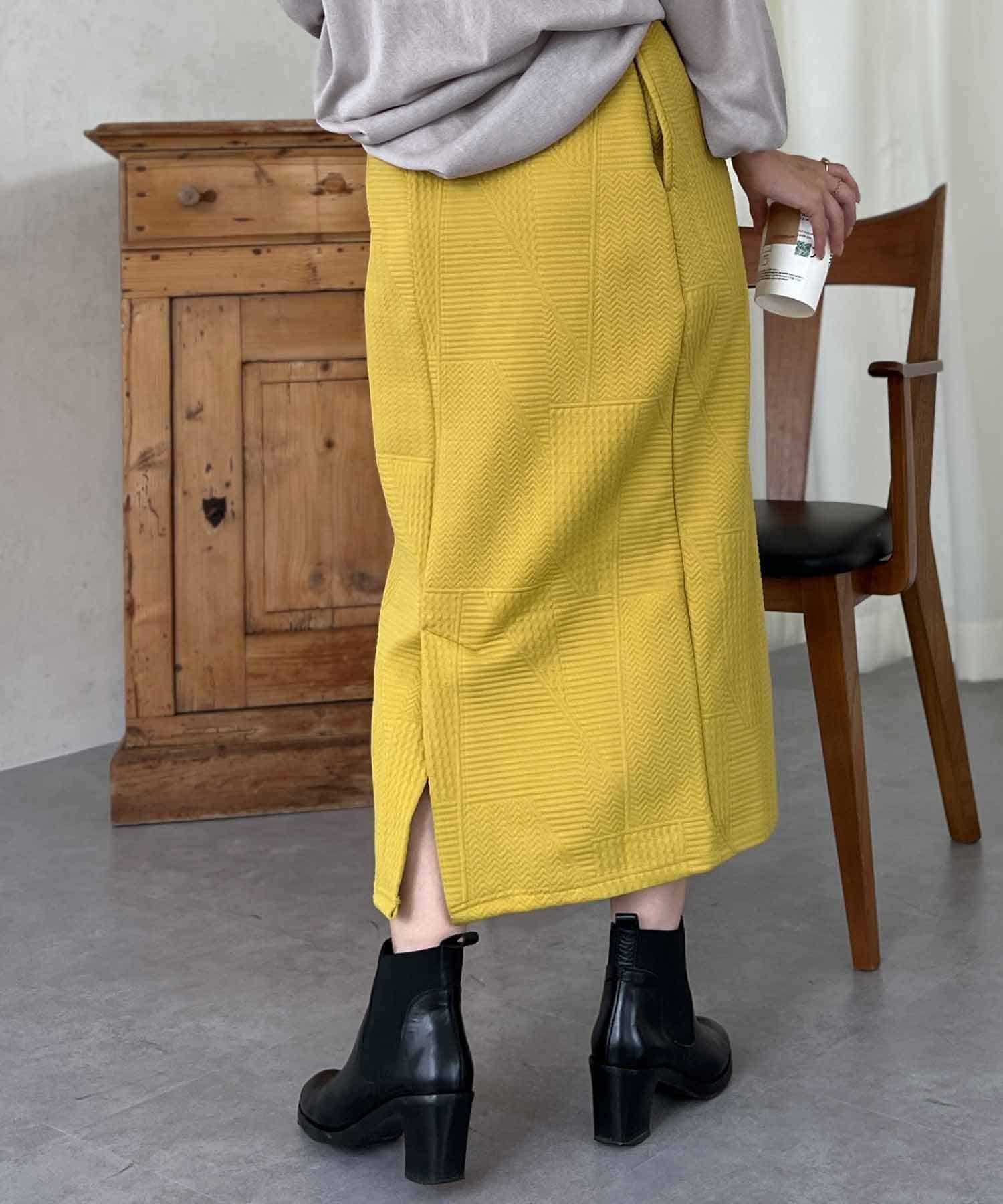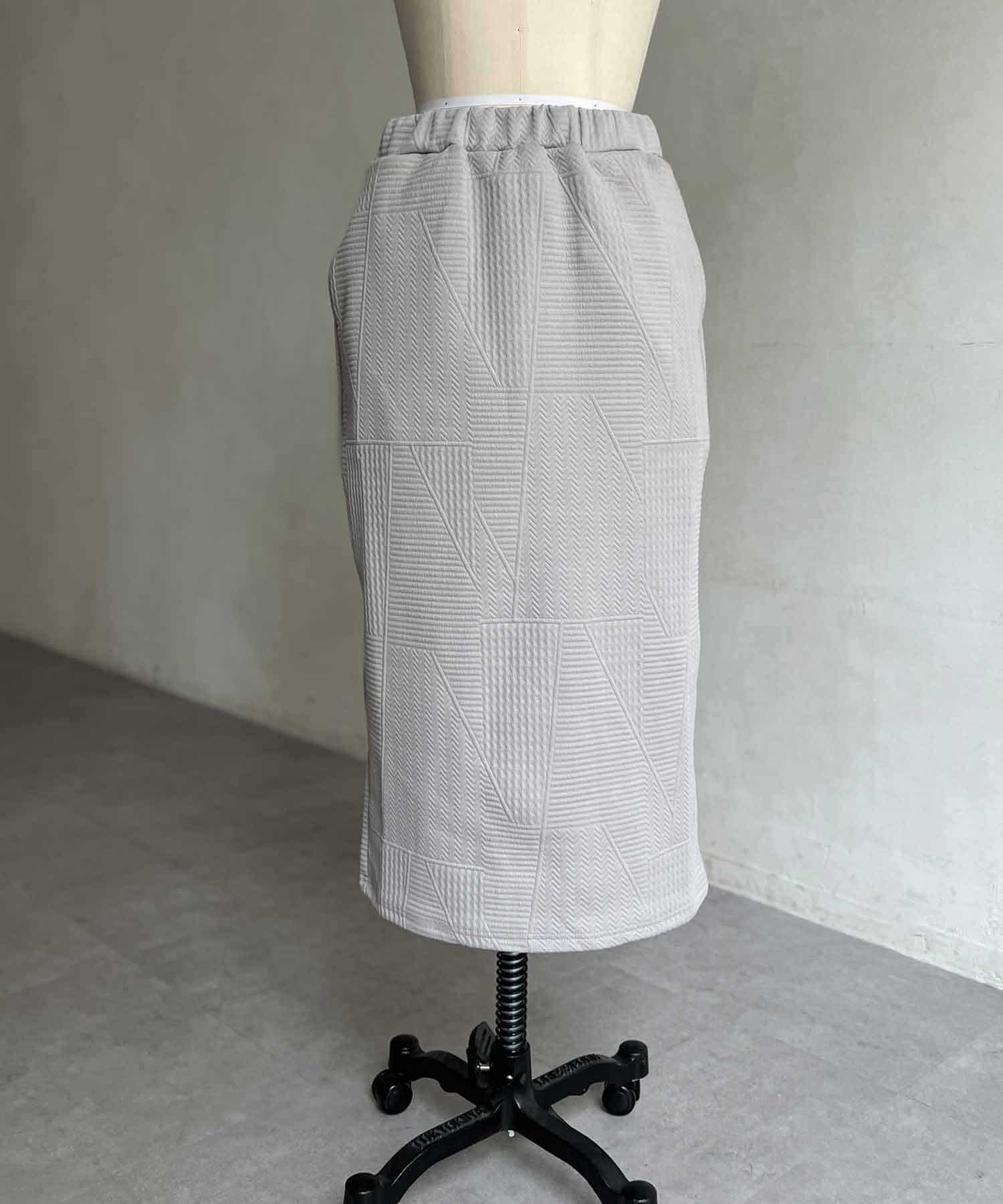 キルティング風の幾何学柄が特徴的な生地のタイトスカートです。