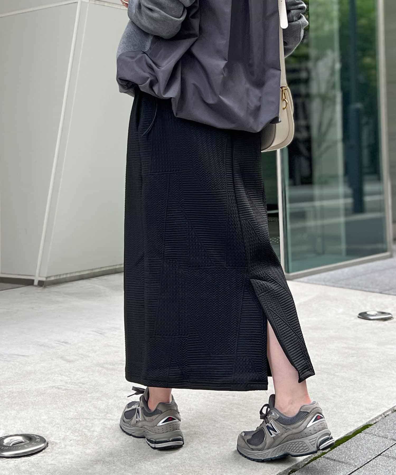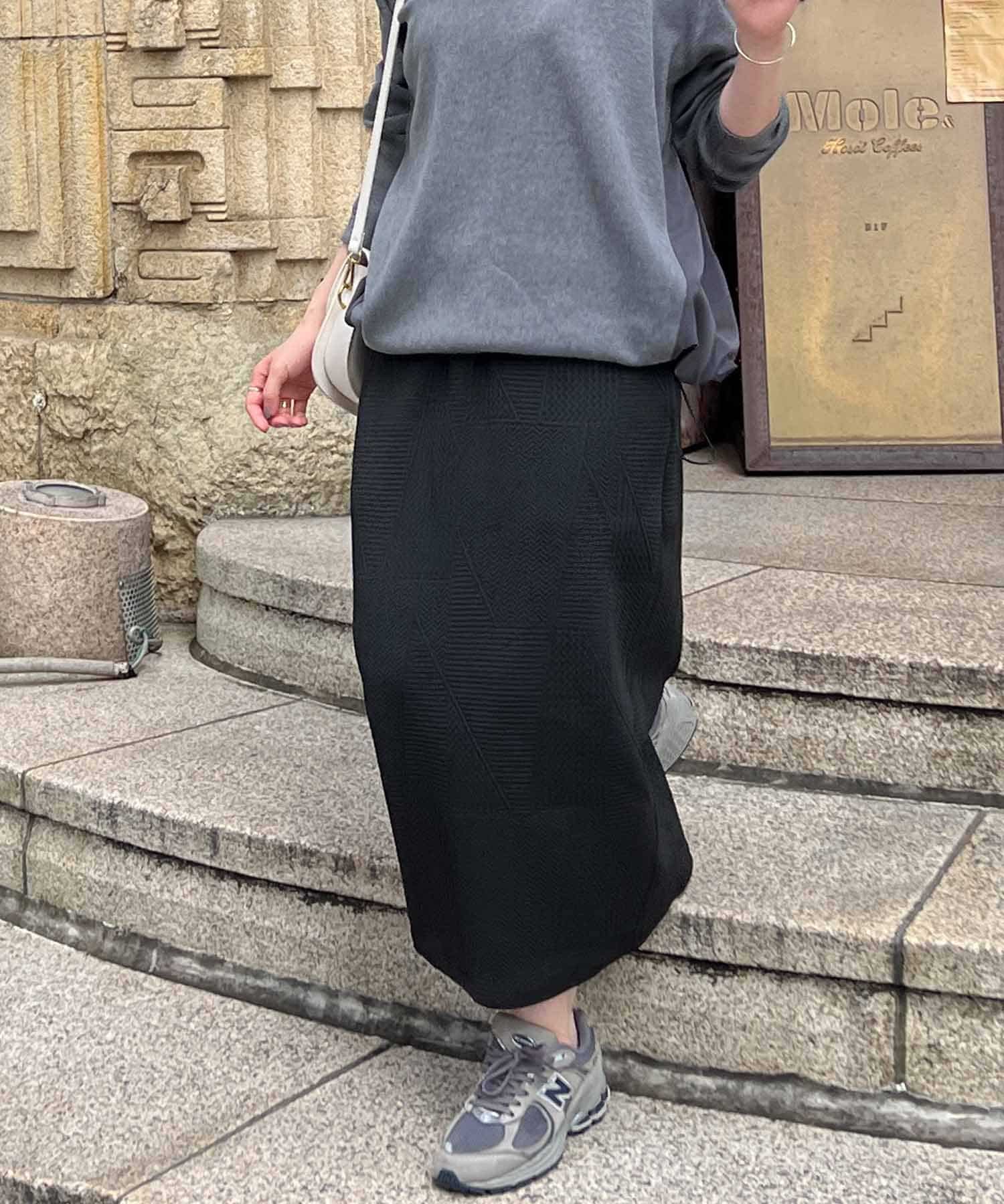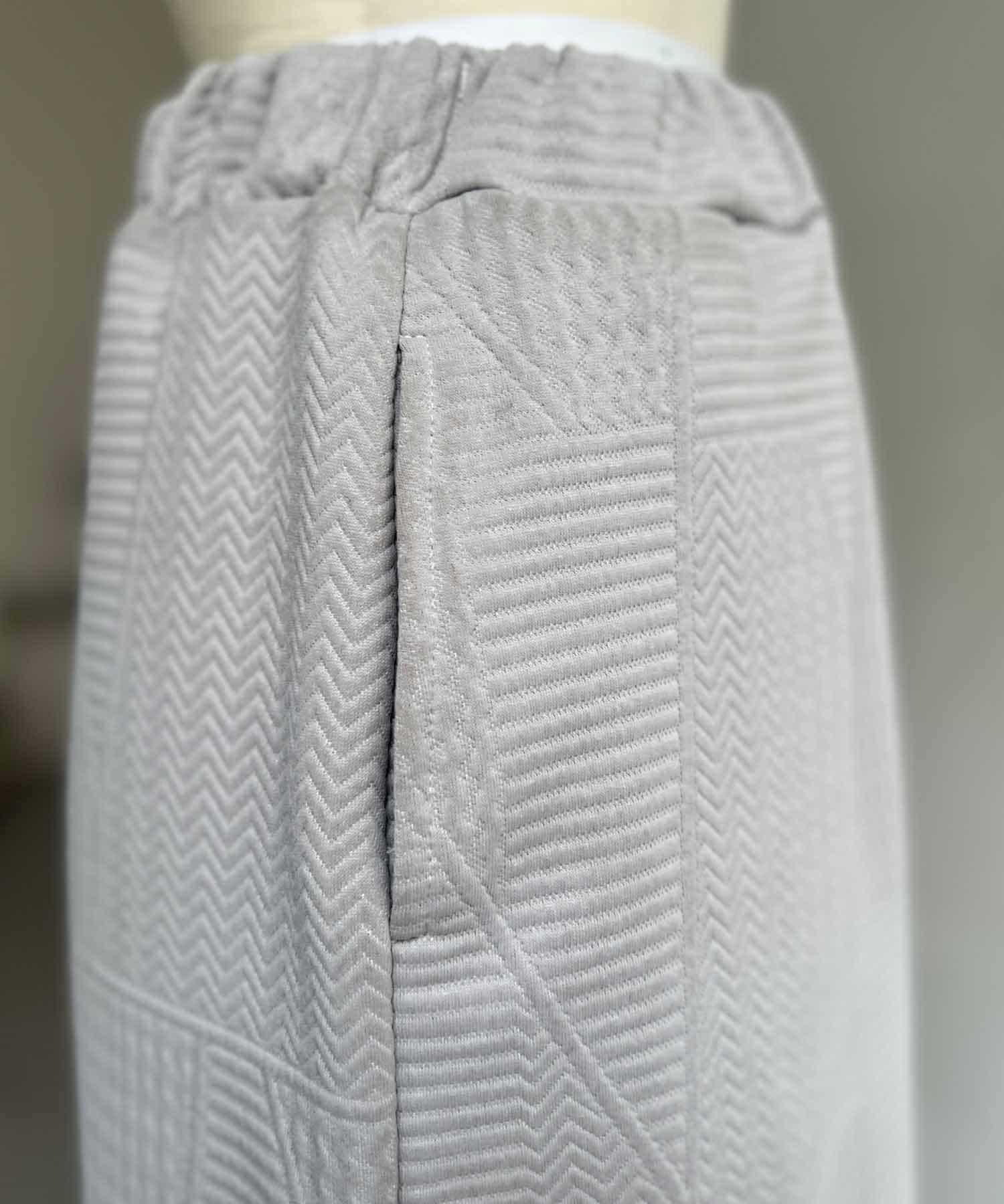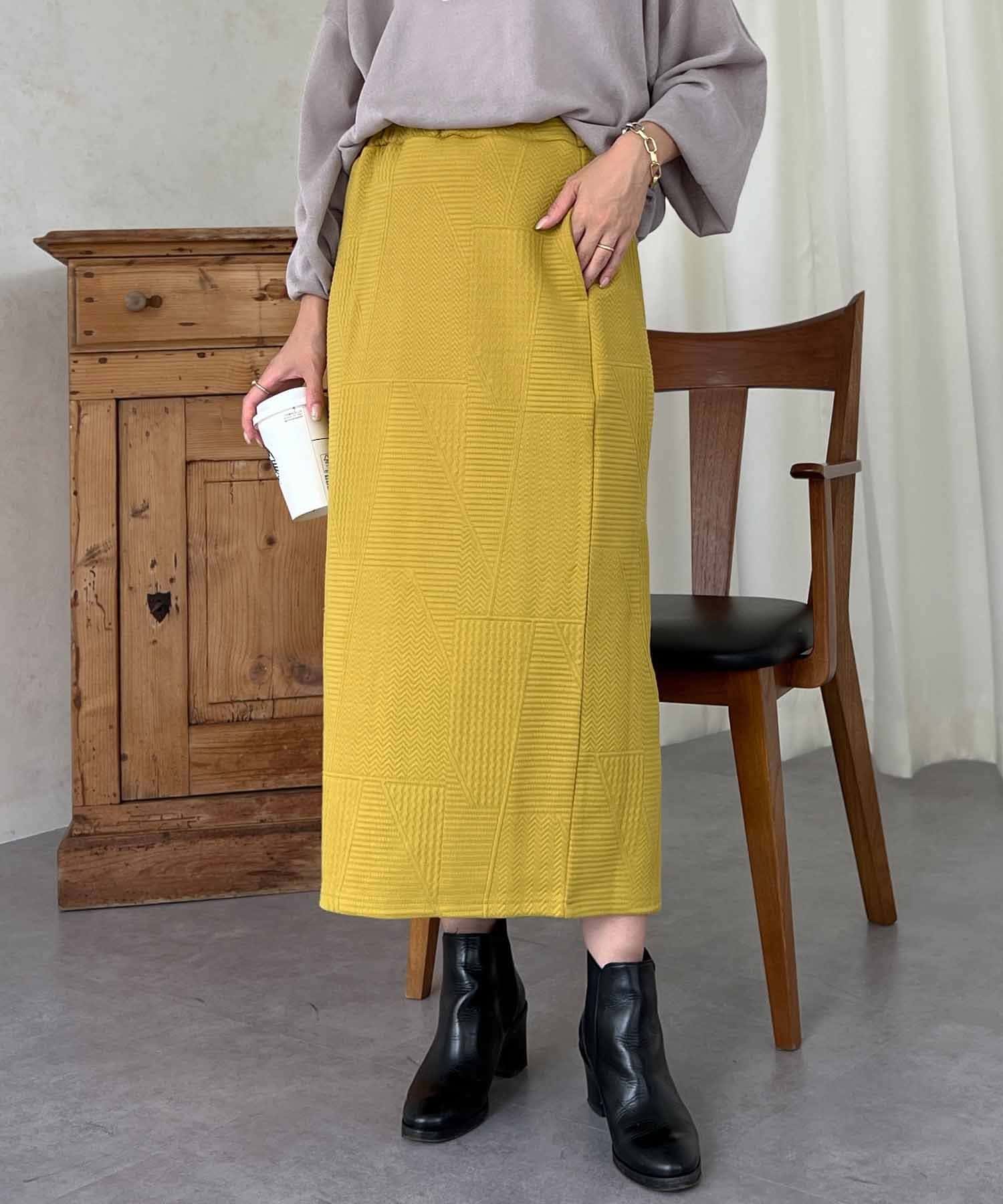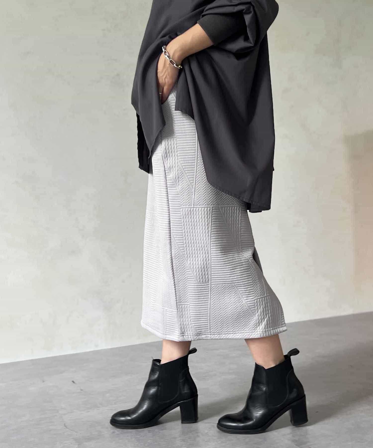 キルティング風の幾何学柄が特徴的な生地のタイトスカートです。