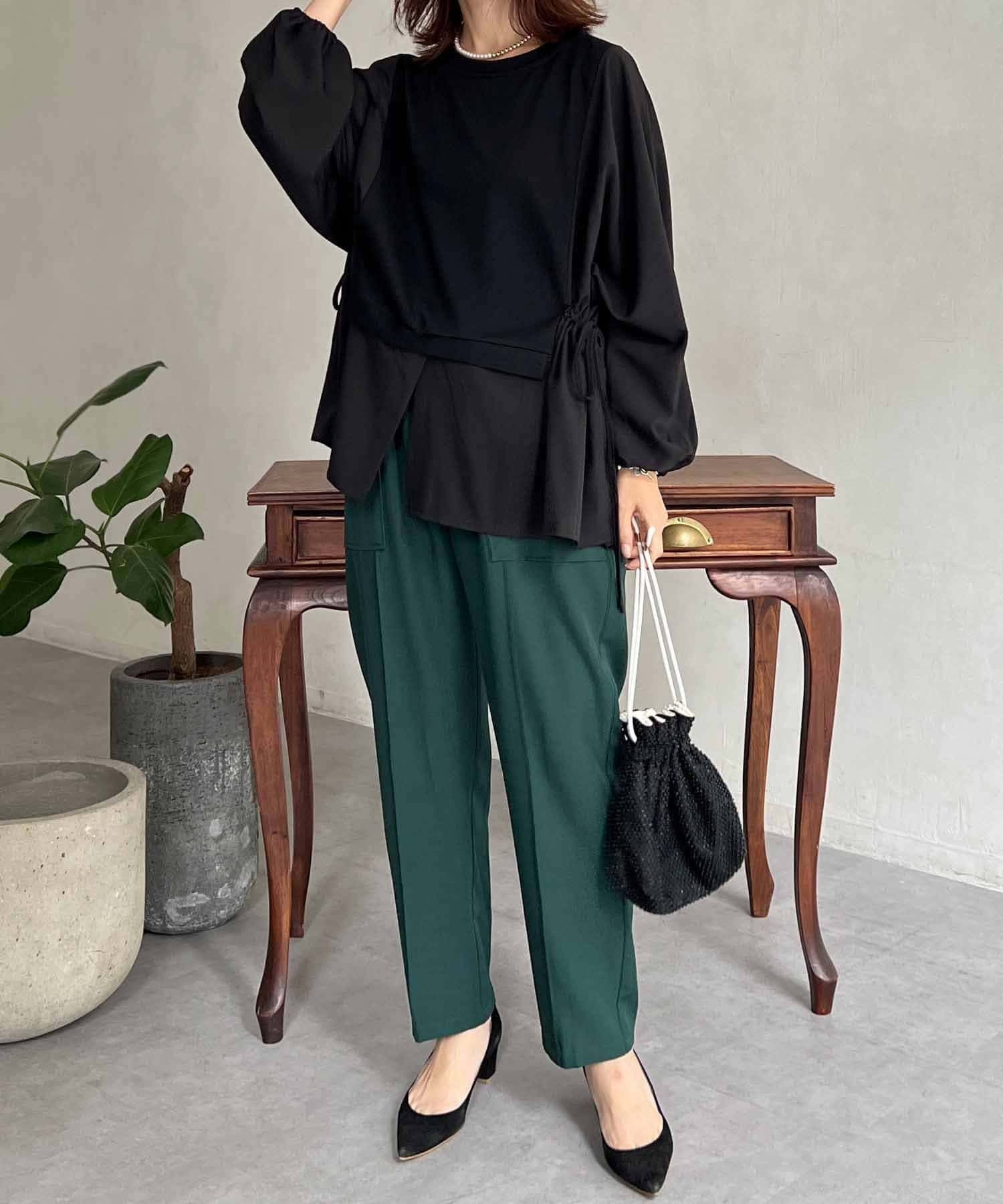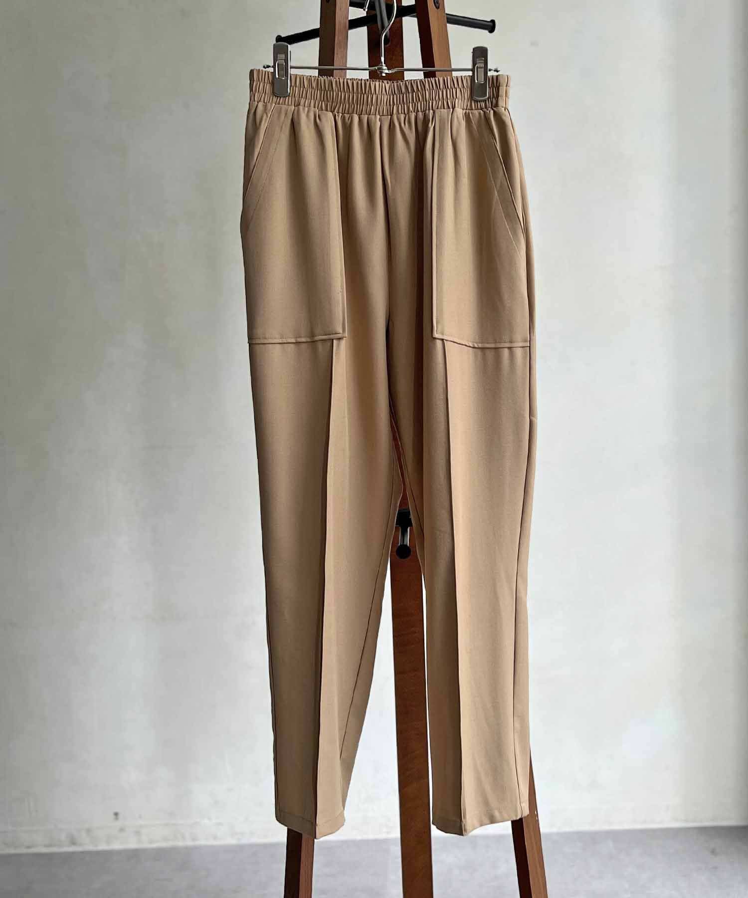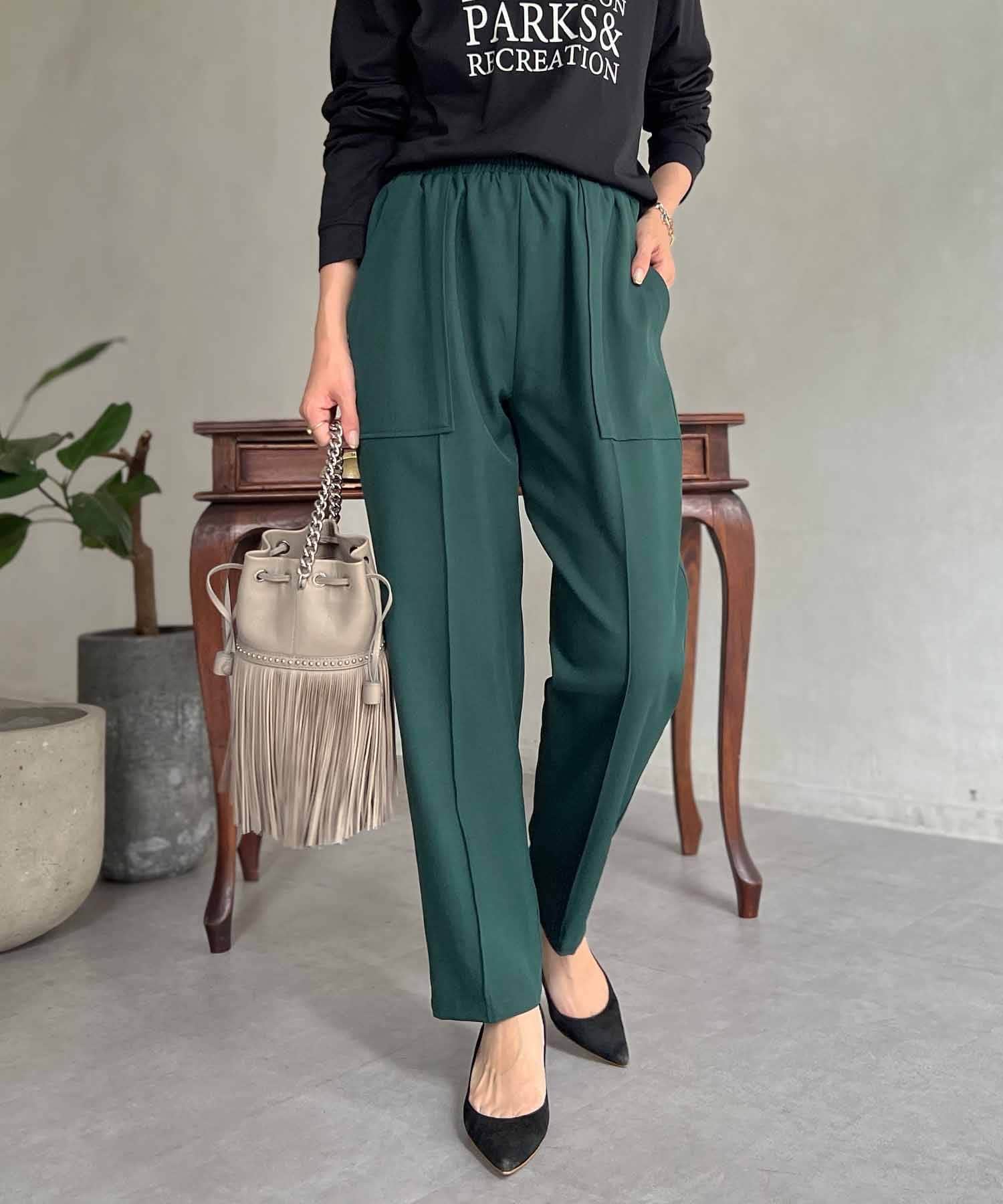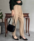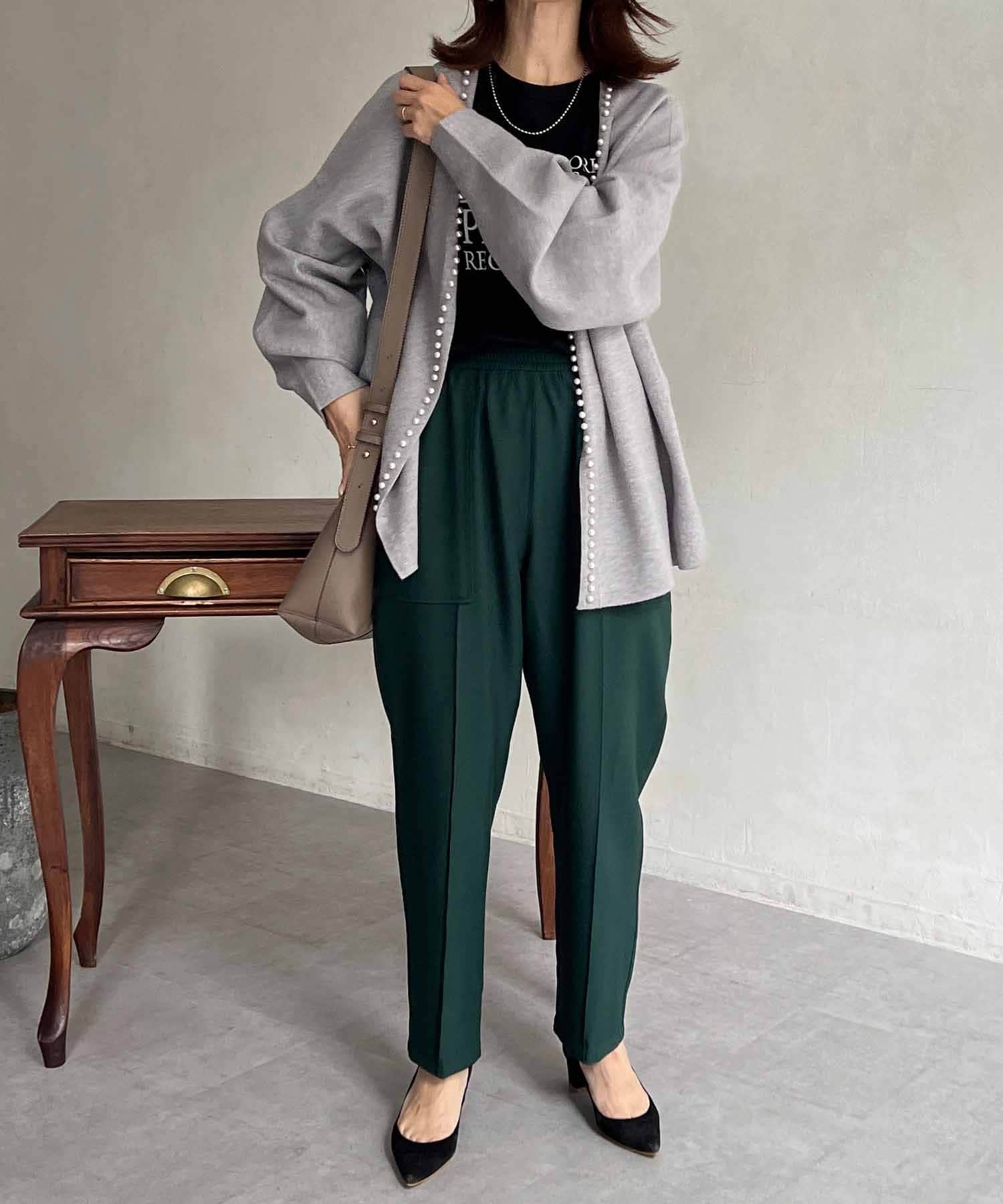 カジュアルになりがちなストレートパンツを光沢感とストレッチ性のある素材を使用し、上品な雰囲気に仕上げました。