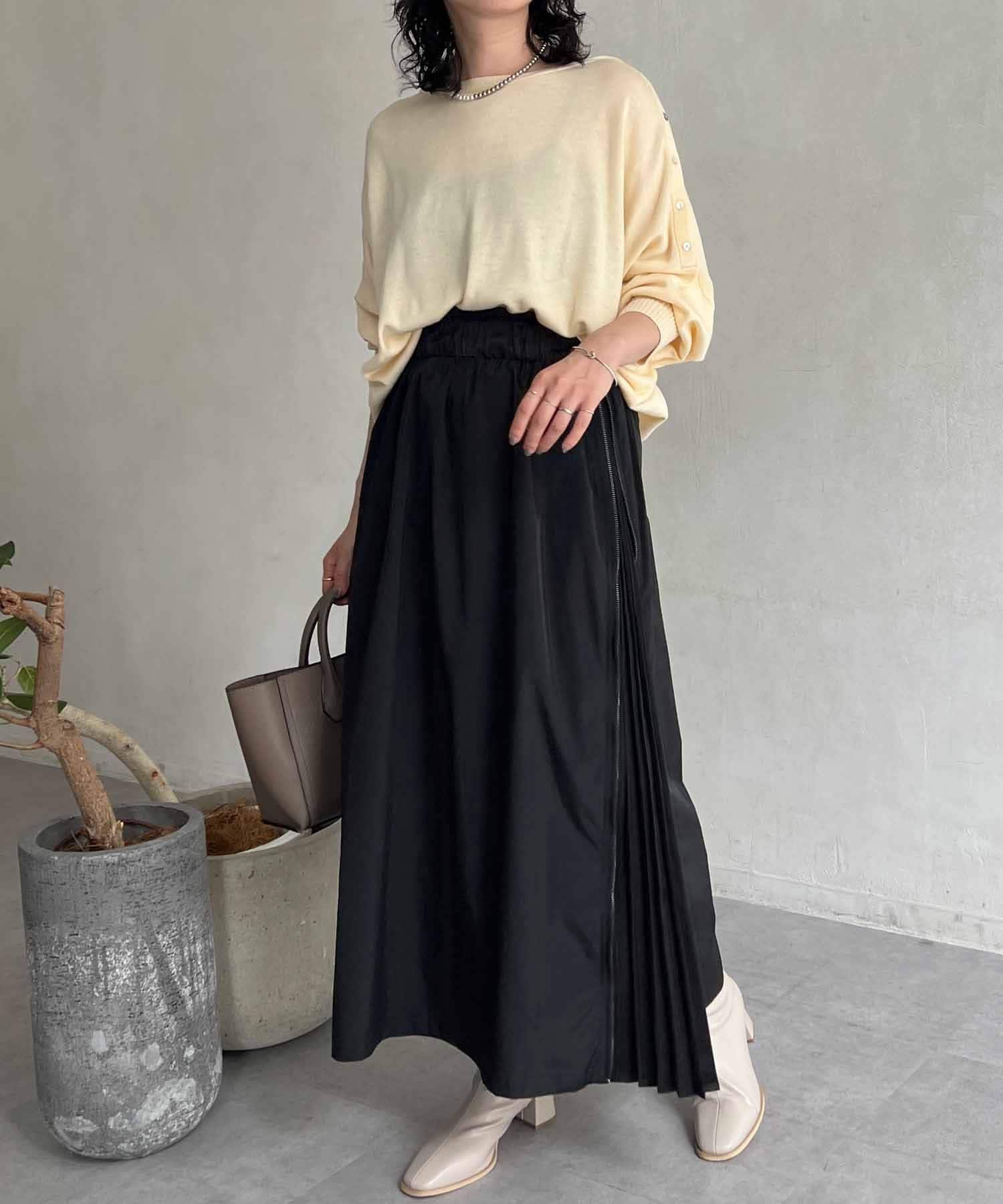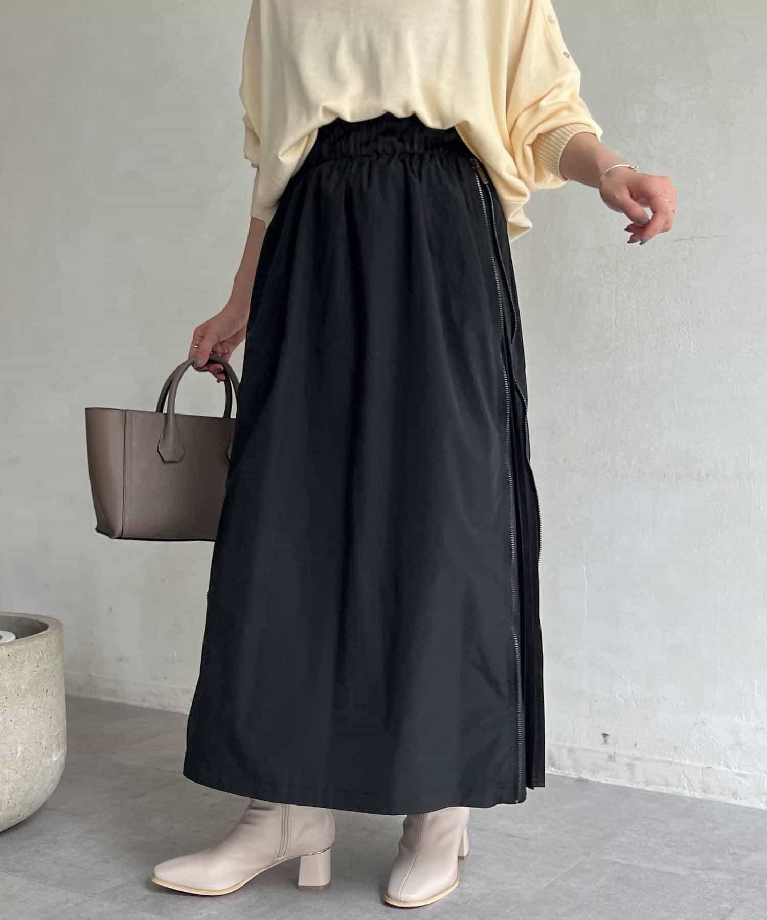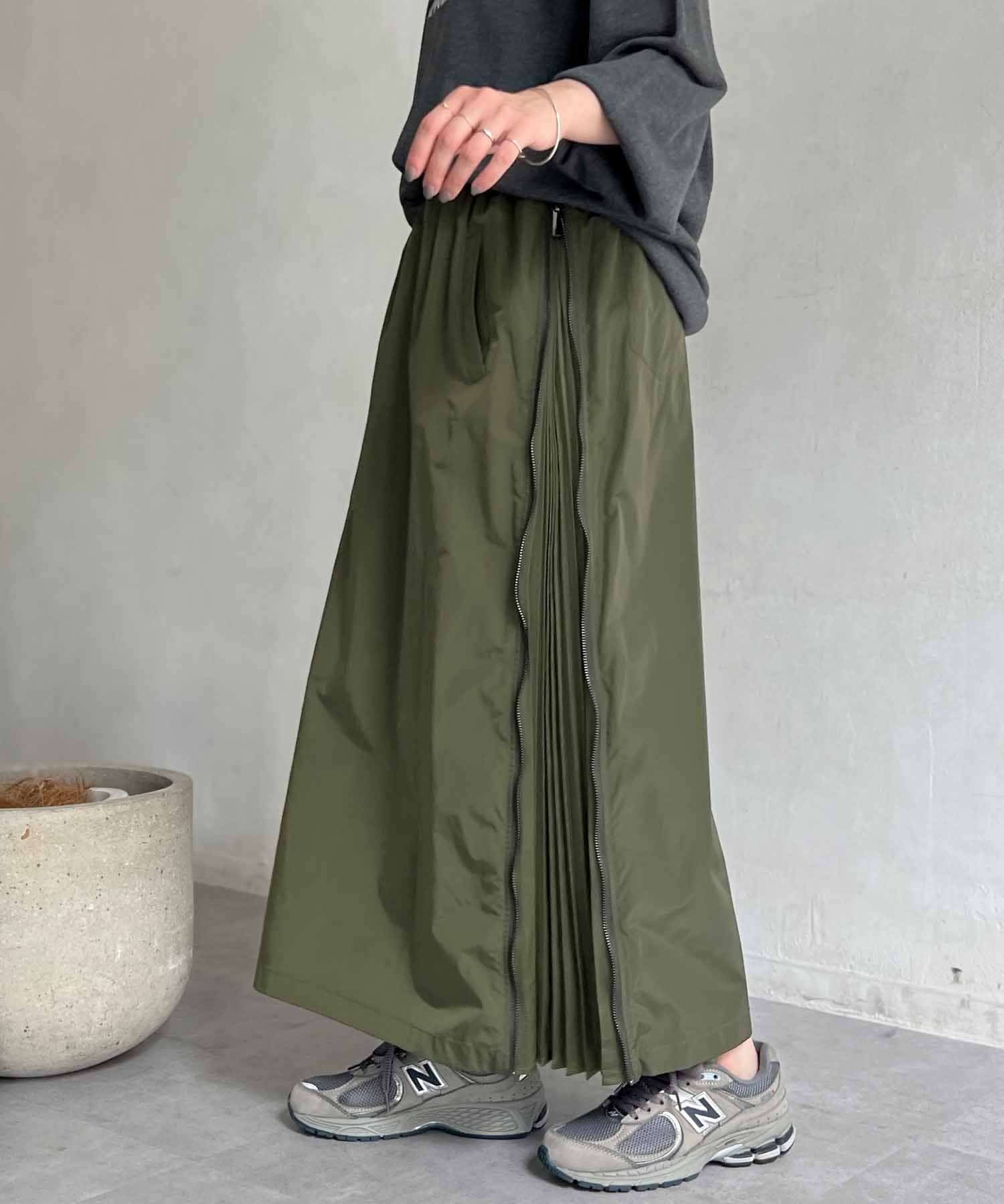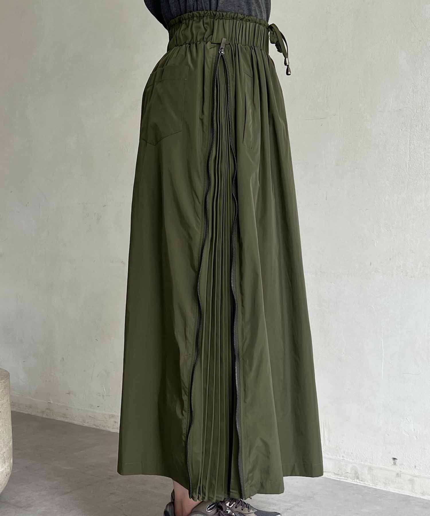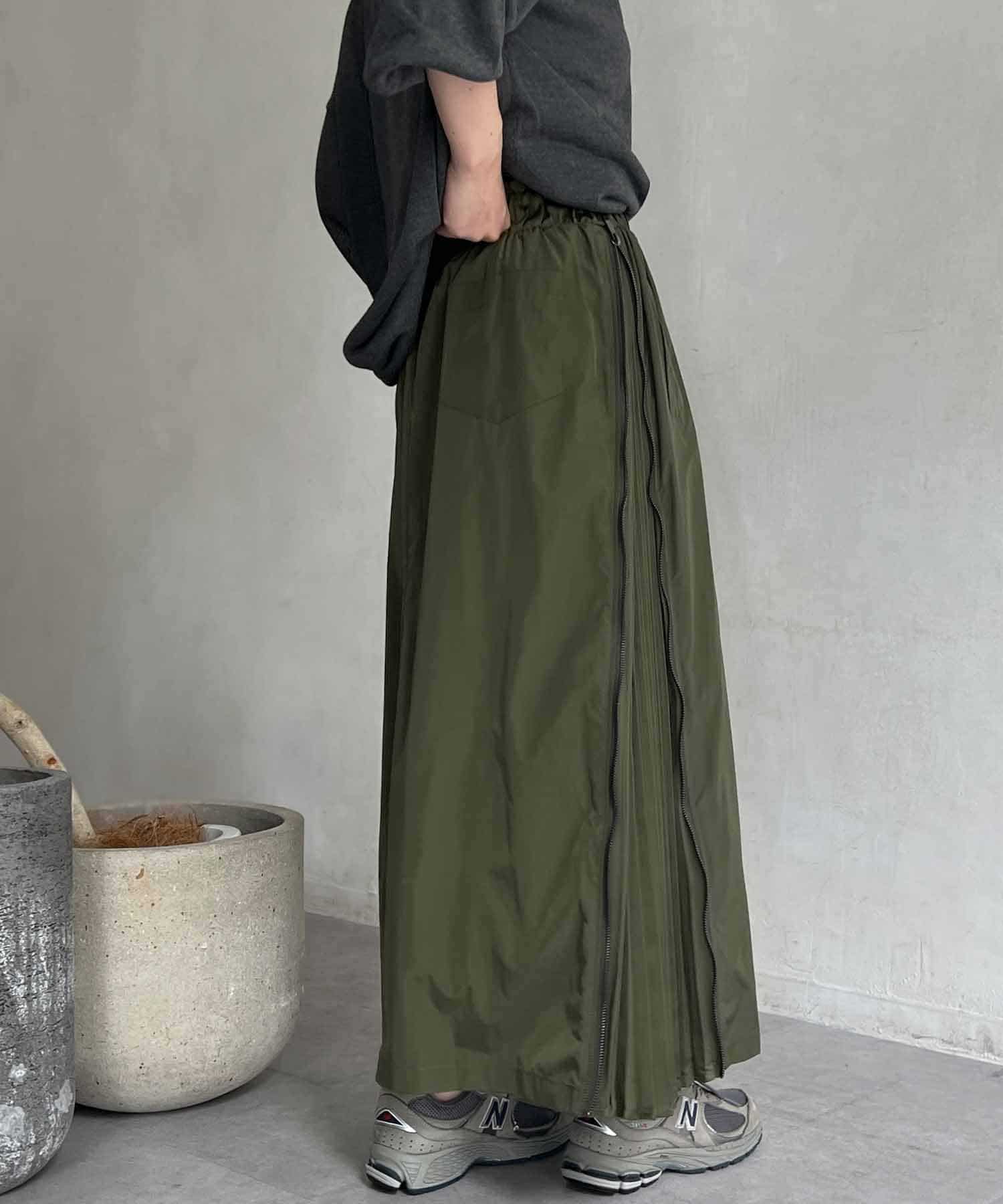ジップを開けるとプリーツが施されており、デザイン性のあるスカートとしてお楽しみいただけます。