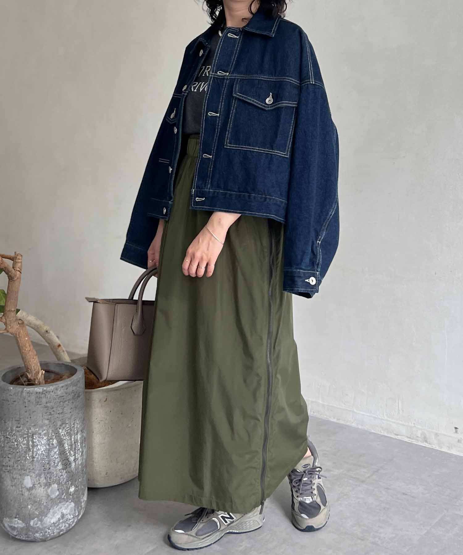 ジップを開けるとプリーツが出てフレアシルエットに。コンパクトなトップスできれいめに合わせるのがおすすめです。