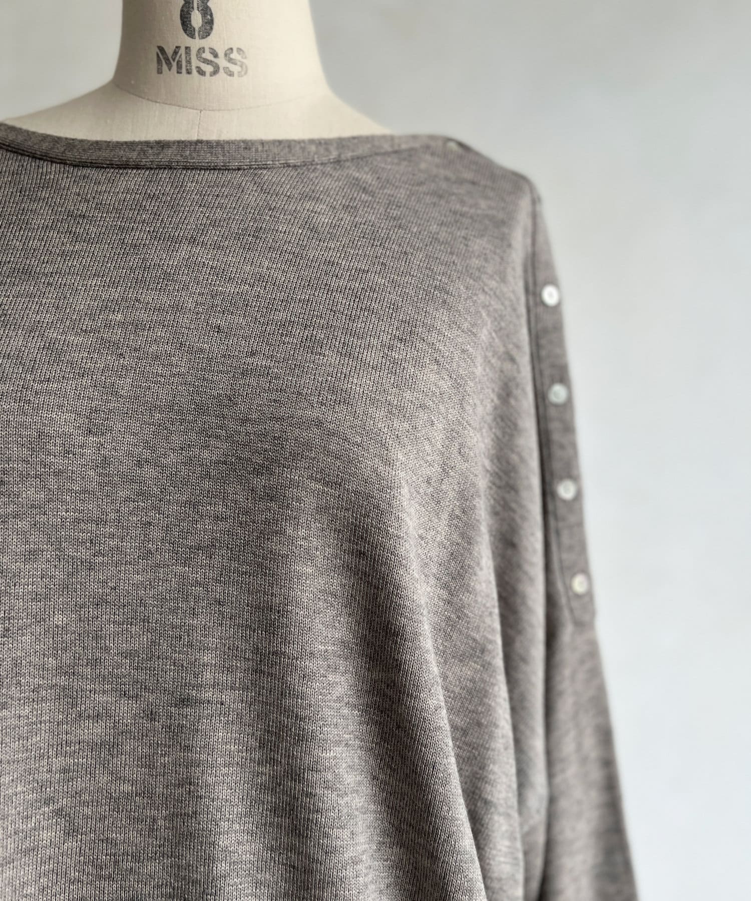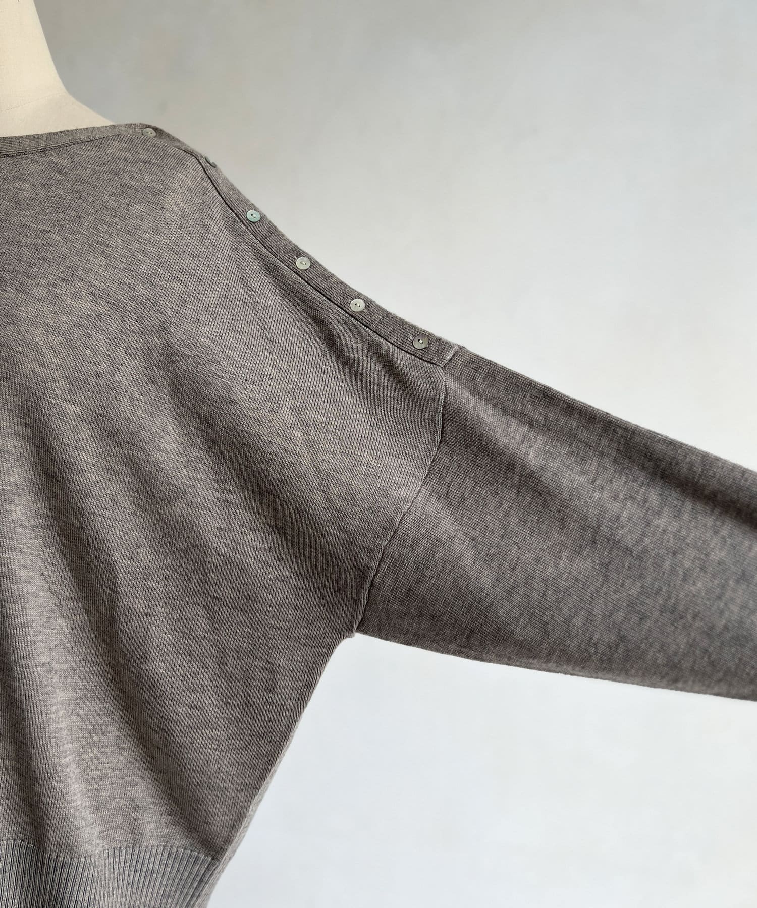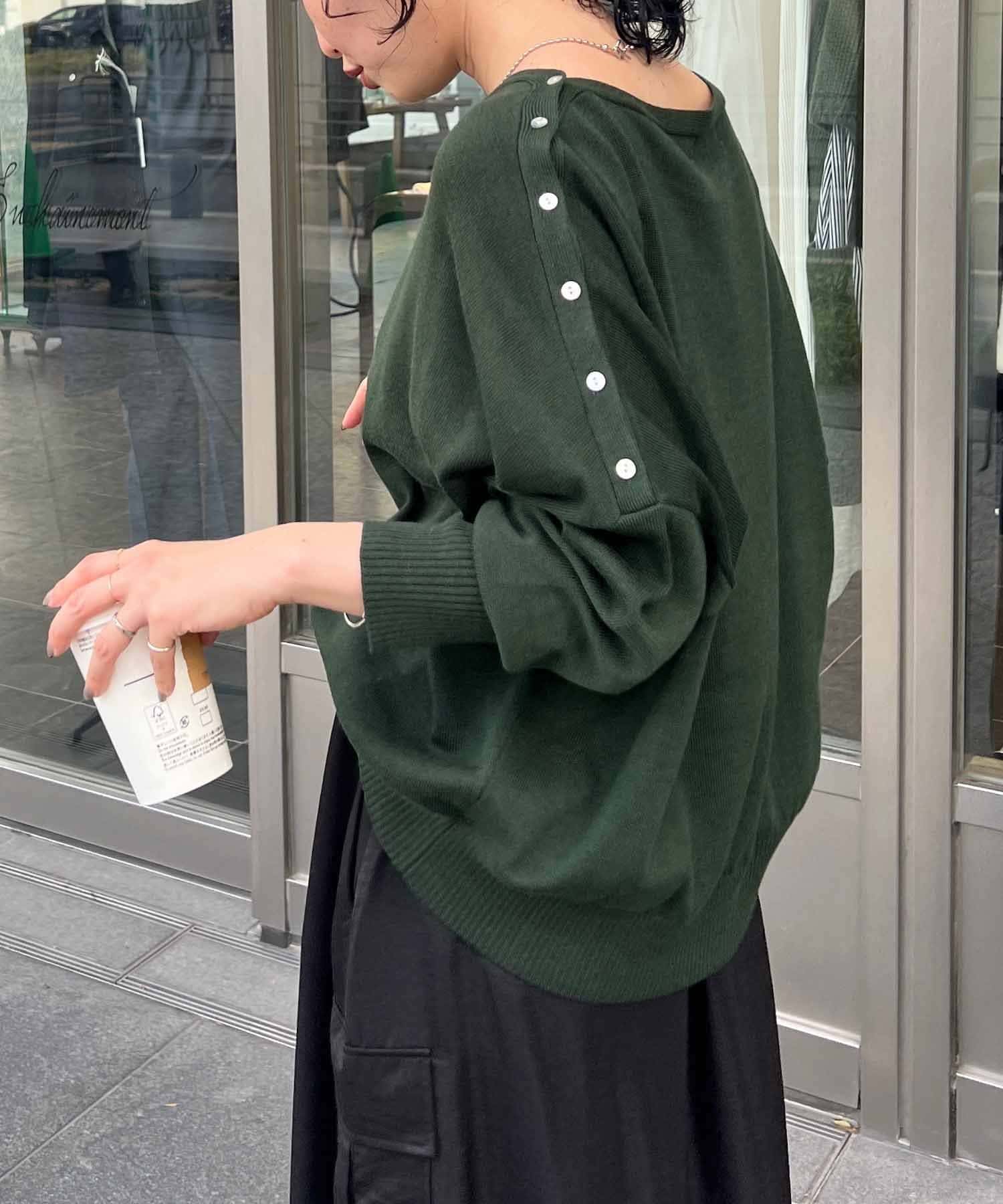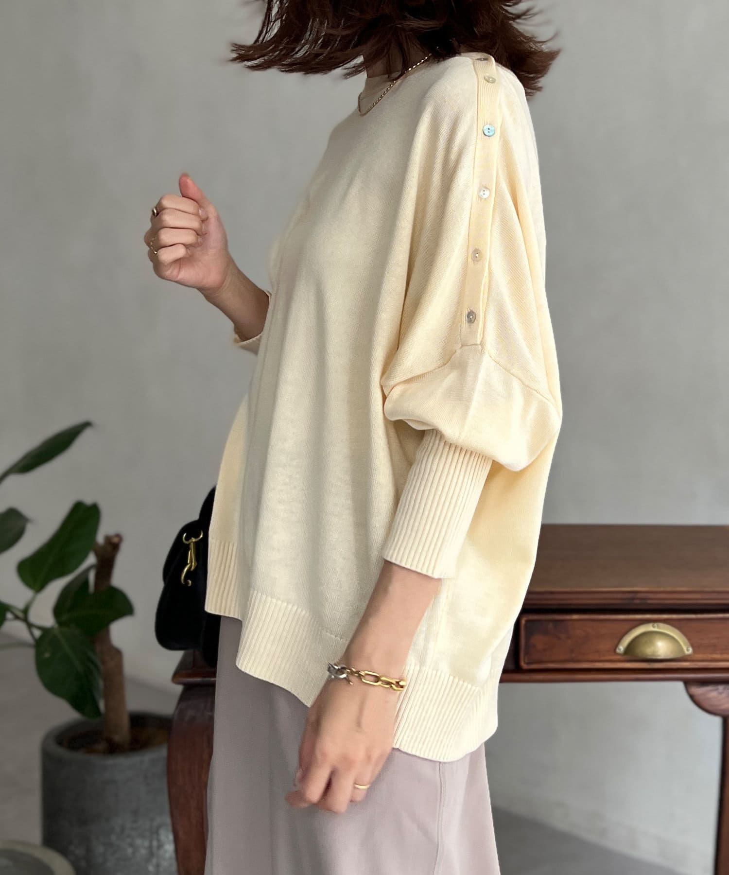 左肩にさり気なく並んだシェルボタンがポイント。上品な印象で合わせていただけます。